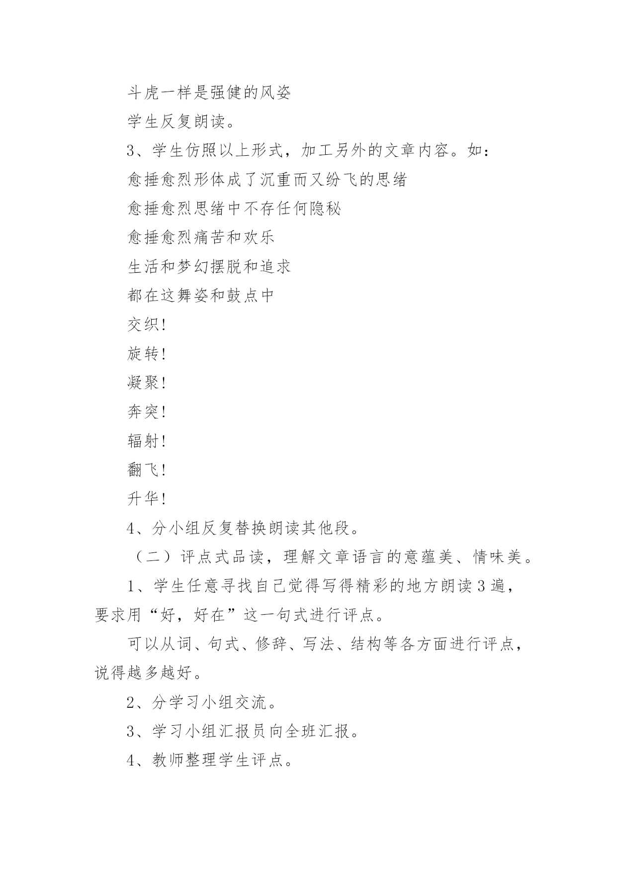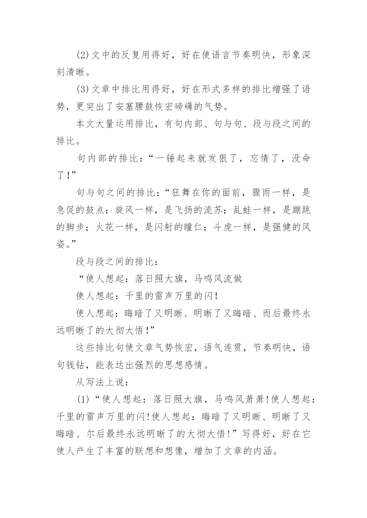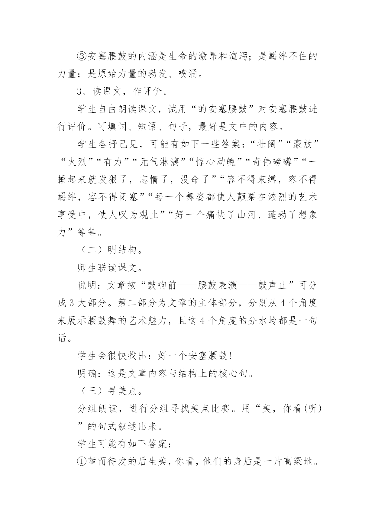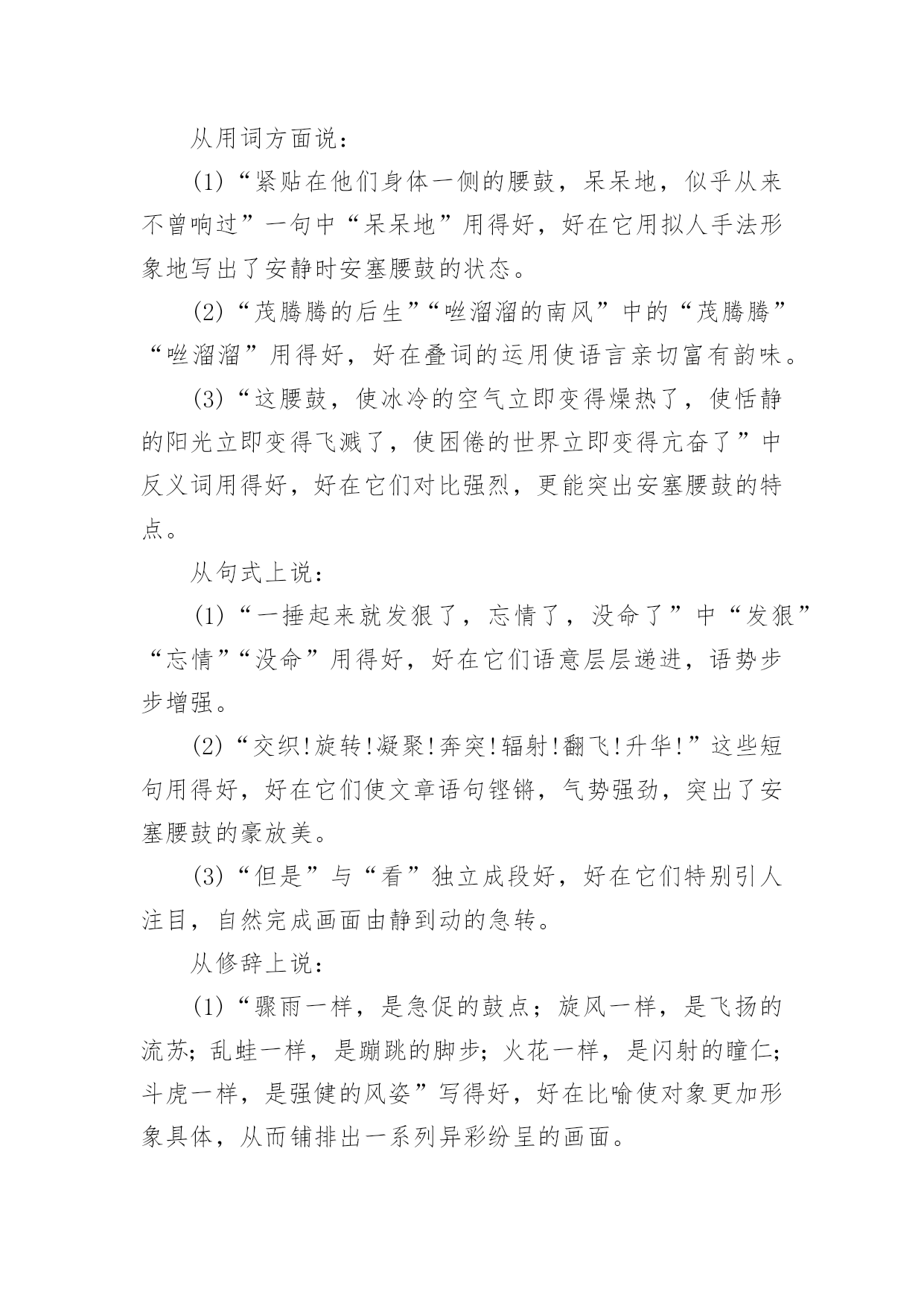 《安塞腰鼓》的教学设计作为一名优秀的教育工作者,可能需要进行教学设计编写工作,教学设计是把教学原理转化为教学材料和教学活动的计划。怎样写教学设计才更能起到其作用呢?以下是小编帮大家整理的《安塞腰鼓》的教学设计,希望对大家有所帮助。一、教学目的1、学习朗读课文,感受安塞腰鼓的磅礴气势。2、理解排比的修辞手法及其在本文中的作用。二、课型设计:品读课三、预习要求1、落实字词,会读会写。2、上网了解作者和安塞腰鼓的情况。四、教学设想1、安塞腰鼓是产生于北方黄土高原上的—种民间艺术,充满原始的意味和浓郁的乡土气息,对于生活在成都的现代青少年,大都对其缺乏形象的直接的感受。因此,采用多媒体教学,效果会好些。教这样的文章,尤其要注意调动学生的情绪,调动学生的想象力,一旦学生进入角色,教起来就轻松多了。2、这是一篇诗化的散文,有着雄浑伟奇的画面,更有着与画面风格一致的气势磅礴的语言,所以教学分为两个板块:感知气势;品味语言。整个过程又以“朗读”一线贯穿读、说、析、品、评,不知不觉让学生受到熏陶,完成教学。3、在语文学习活动中凸现学生主体精神,力避教师烦琐讲解,突出新课程理念。五、教学过程第一板块:朗读、感知(一)知内容。1、放录像。安塞腰鼓曾在我国多种大型活动中演出,可把其制成多媒体教学录像。在正式讲解课文时,放出来,给学生以形象的感受,并调动学生的情绪。学生边看录像边品味文章的语言,体会其内容和形式的高度统一。2、谈观感。在学生谈观感时,教师可从以下几个方面适当引导:①安塞腰鼓是黄土高原的“绝活儿”,它的粗犷、雄浑、动力十足的风格与当地自然环境、地理风貌、民风民情等浑然一体,不可分离。②它是人、鼓合一的,没有一种乐器能够像它这样要求人和乐器的高度合谐。人的表演和乐器的“表演’’完整地糅合在一起,二者相辅相成,相得益彰。所以成功的表演是人借鼓势,鼓借人威,酣畅淋漓,精、气、神无阻无碍一脉贯通。③安塞腰鼓的内涵是生命的激昂和渲泻;是羁绊不住的力量;是原始力量的勃发、喷涌。3、读课文,作评价。学生自由朗读课文,试用“的安塞腰鼓”对安塞腰鼓进行评价。可填词、短语、句子,最好是文中的内容。学生各抒己见,可能有如下一些答案:“壮阔”“豪放”“火烈”“有力”“元气淋漓”“惊心动魄”“奇伟磅礴”“一捶起来就发狠了,忘情了,没命了”“容不得束缚,容不得羁绊,容不得闭塞”“每一个舞姿都使人颤栗在浓烈的艺术享受中,使人叹为观止”“好一个痛快了山河、蓬勃了想象力”等等。(二)明结构。师生联读课文。说明:文章按“鼓响前——腰鼓表演——鼓声止”可分成3大部分。第二部分为文章的主体部分,分别从4个角度来展示腰鼓舞的艺术魅力,且这4个角度的分水岭都是一句话。学生会很快找出:好一个安塞腰鼓!明确:这是文章内容与结构上的核心句。(三)寻美点。分组朗读,进行分组寻找美点比赛。用“美,你看(听)”的句式叙述出来。学生可能有如下答案:①蓄而待发的后生美,你看,他们的身后是一片高梁地。他们朴实得就像那片高梁。咝溜溜的南风吹动了高梁叶子,也吹动了他们的衣衫。他们的神情沉稳而安静。②火烈的舞蹈场面美,你看,百十个斜背响鼓的后生,如百十块被强震不断击起的石头,狂舞在你的面前。骤雨一样,是急促的鼓点;旋风一样,是飞扬的流苏;乱蛙一样,是蹦跳的脚步;火花一样,是闪射的瞳仁;斗虎一样,是强健的风姿。③激越的鼓声美,你听,百十个腰鼓发出的沉重响声,碰撞在遗落了一切冗杂的观众的心上。观众的心也蓦然变成牛皮鼓面了,也是隆隆,隆隆,隆隆。④击鼓的后生美,你看,后生们的胳膊、腿、全身,有力地搏击着,疾速地搏击着,大起大落地搏击着……⑤变幻的舞姿美,你看,每一个舞姿都充满了力量,每一个舞姿都呼呼作响,每一个舞姿都是光和影的匆匆变幻。……第二板块:朗读、品味(一)替换式品读,感受语言的节奏美、诗意美。1、学生齐诵第6段。2、教师示范。教师将大家刚才读的内容改成了另一种文学样式——诗,(幻灯出示所改之诗)教师范读。骤雨一样是急促的鼓点旋风一样是飞扬的流苏乱蛙一样是蹦跳的脚步火花一样是闪射的瞳仁斗虎一样是强健的风姿学生反复朗读。3、学生仿照以上形式,加工另外的文章内容。如:愈捶愈烈形体成了沉重而又纷飞的思绪愈捶愈烈思绪中不存任何隐秘愈捶愈烈痛苦和欢乐生活和梦幻摆脱和追求都在这舞姿和鼓点中交织!旋转!凝聚!奔突!辐射!翻飞!升华!4、分小组反复替换朗读其他段。(二)评点式品读,理解文章语言的意蕴美、情味美。1、学生任意寻找自己觉得写得精彩的地方朗读3遍,要求用“好,好在”这一句式进行评点。可以从词、句式、修辞、写法、结构等各方面进行评点,说得越多越好。2、分学习小组交流。3、学习小组汇报员向全班汇报。4、教师整理学生评点。从用词方面说:(1)“紧贴在他们身体一侧的腰鼓,呆呆地,似乎从来不曾响过”一句中“呆呆地”