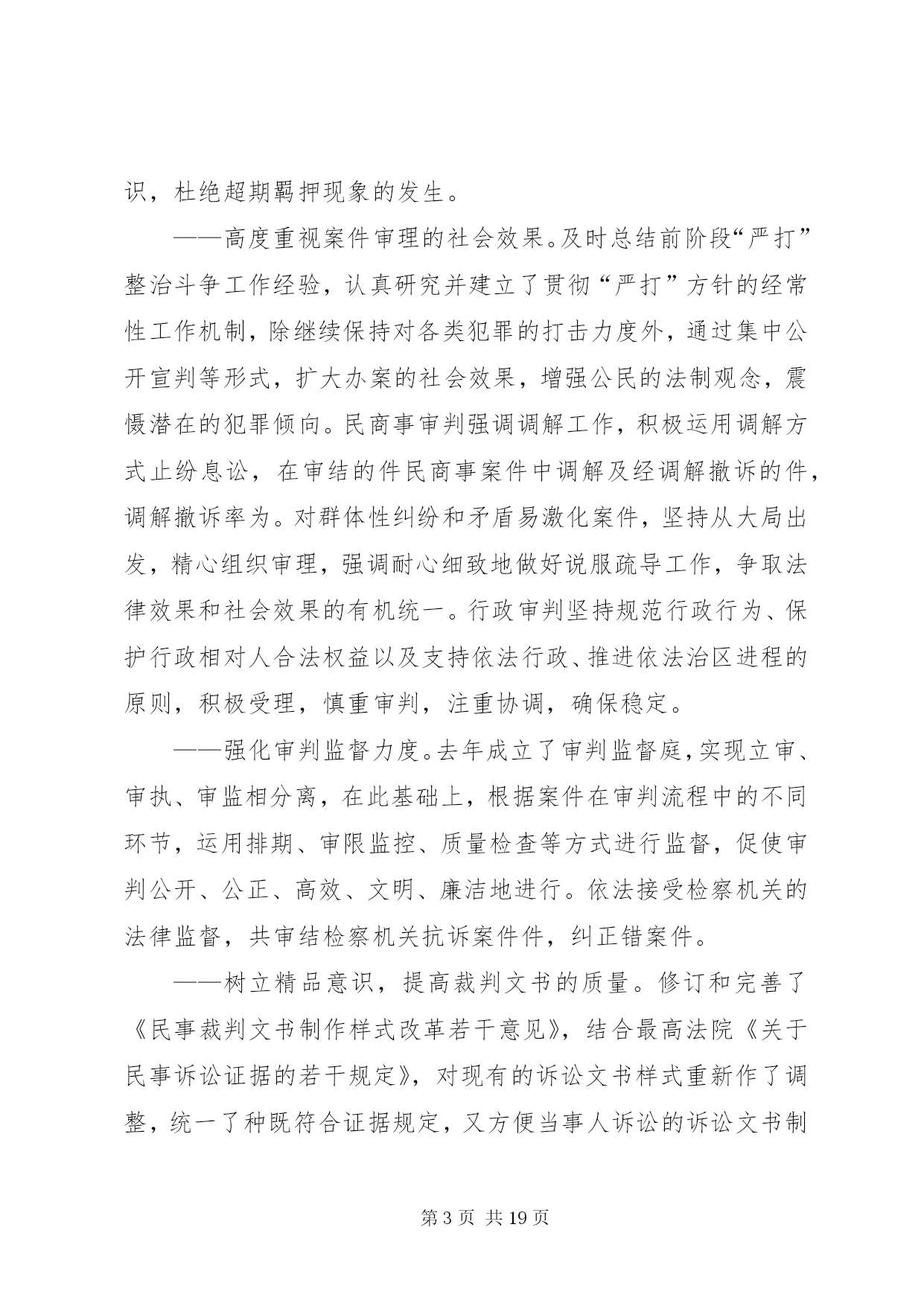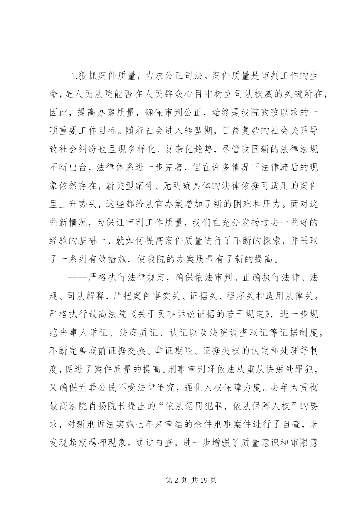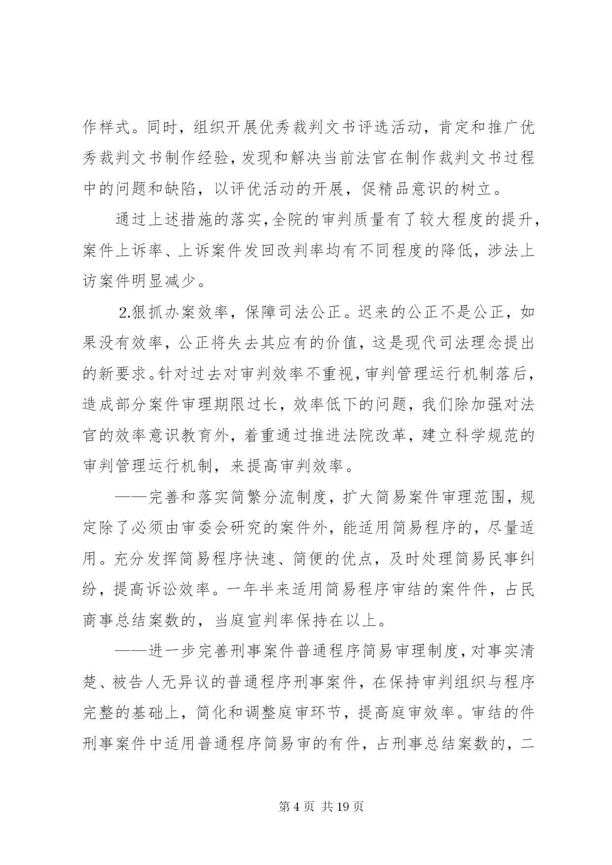第PAGE\*Arabic\*MERGEFORMAT19页共NUMPAGES\*MERGEFORMAT19页人民法院司法自查报告各位代表:根据区人大常委会关于开展“两项评议”工作的通知精神,我们对区十四届人大一次会议以来司法工作开展情况进行了认真的回顾总结,并深入开展了自查自纠。现将主要情况汇报如下,请予评议。一、区十四届人大一次会议以来区法院司法工作回顾区十四届人大一次会议以来,我院在区委的领导、区人大及其常委会的监督以及上级法院的指导下,坚持以邓小平理论和“三个代表”重要思想为指导,认真贯彻区人大关于法院工作报告的决议,紧紧围绕全区工作大局,忠实履行宪法和法律赋予的职责,以“公正与效率”为主题,以司法为民为宗旨,重点抓好审判、改革、队伍建设三件大事。通过努力,各项工作有了较为明显的改观,审判质量和效率有了新的提高,法院改革稳妥推进,队伍形象逐步改善,较好地完成了维护稳定、保障改革、促进发展的司法工作任务。(一)审判工作基本情况××年以来至今年月底,全院共新收各类诉讼案件件,办结件(包括上一年的未结案),正在办理件。其中审结各类刑事案件件,一审判处犯罪分子人,共有人被判处了有期徒刑;一审审结民商事案件件,行政案件件;办结各类申诉和申请再审案件件。⒈狠抓案件质量,力求公正司法。案件质量是审判工作的生命,是人民法院能否在人民群众心目中树立司法权威的关键所在,因此,提高办案质量,确保审判公正,始终是我院孜孜以求的一项重要工作目标。随着社会进入转型期,日益复杂的社会关系导致社会纠纷也呈现多样化、复杂化趋势,尽管我国新的法律法规不断出台,法律体系进一步完善,但在许多情况下法律滞后的现象依然存在,新类型案件、无明确具体的法律依据可适用的案件呈上升势头,这些都给法官办案增加了新的困难和压力。面对这些新情况,为保证审判工作质量,我们在充分发扬过去一些好的经验的基础上,就如何提高案件质量进行了不断的探索,并采取了一系列有效措施,使我院的办案质量有了新的提高。——严格执行法律规定,确保依法审判。正确执行法律、法规、司法解释,严把案件事实关、证据关、程序关和适用法律关。严格执行最高法院《关于民事诉讼证据的若干规定》,进一步规范当事人举证、法庭质证、认证以及法院调查取证等证据制度,不断完善庭前证据交换、举证期限、证据失权的认定和处理等制度,促进了案件质量的提高。刑事审判既依法从重从快惩处罪犯,又确保无罪公民不受法律追究,强化人权保障力度。去年为贯彻最高法院肖扬院长提出的“依法惩罚犯罪,依法保障人权”的要求,对新刑诉法实施七年来审结的余件刑事案件进行了自查,未发现超期羁押现象。通过自查,进一步增强了质量意识和审限意识,杜绝超期羁押现象的发生。——高度重视案件审理的社会效果。及时总结前阶段“严打”整治斗争工作经验,认真研究并建立了贯彻“严打”方针的经常性工作机制,除继续保持对各类犯罪的打击力度外,通过集中公开宣判等形式,扩大办案的社会效果,增强公民的法制观念,震慑潜在的犯罪倾向。民商事审判强调调解工作,积极运用调解方式止纷息讼,在审结的件民商事案件中调解及经调解撤诉的件,调解撤诉率为。对群体性纠纷和矛盾易激化案件,坚持从大局出发,精心组织审理,强调耐心细致地做好说服疏导工作,争取法律效果和社会效果的有机统一。行政审判坚持规范行政行为、保护行政相对人合法权益以及支持依法行政、推进依法治区进程的原则,积极受理,慎重审判,注重协调,确保稳定。——强化审判监督力度。去年成立了审判监督庭,实现立审、审执、审监相分离,在此基础上,根据案件在审判流程中的不同环节,运用排期、审限监控、质量检查等方式进行监督,促使审判公开、公正、高效、文明、廉洁地进行。依法接受检察机关的法律监督,共审结检察机关抗诉案件件,纠正错案件。——树立精品意识,提高裁判文书的质量。修订和完善了《民事裁判文书制作样式改革若干意见》,结合最高法院《关于民事诉讼证据的若干规定》,对现有的诉讼文书样式重新作了调整,统一了种既符合证据规定,又方便当事人诉讼的诉讼文书制作样式。同时,组织开展优秀裁判文书评选活动,肯定和推广优秀裁判文书制作经验,发现和解决当前法官在制作裁判文书过程中的问题和缺陷,以评优活动的开展,促精品意识的树立。通过上述措施的落实,全院的审判质量有了较大程度的提升,案件上诉率、上诉案件发回改判率均有不同程度的降低,涉法上访案件明显减少。⒉狠抓办案效率,保障司法公正。迟来的公正不是公正,如果没有效率,公正将失去其应有的价值,这是现代司法理念提出的新要求。针对过去对审判效率不重视,审判管理运行机制落后,造成部分案件审理期限过长,效率低下的问题,我们除加强对法官的效率意识教育外,着重通过推进法院改革,建立科学规范的审判管理运行机制,来提高审判效率。——完善和落实简繁分流