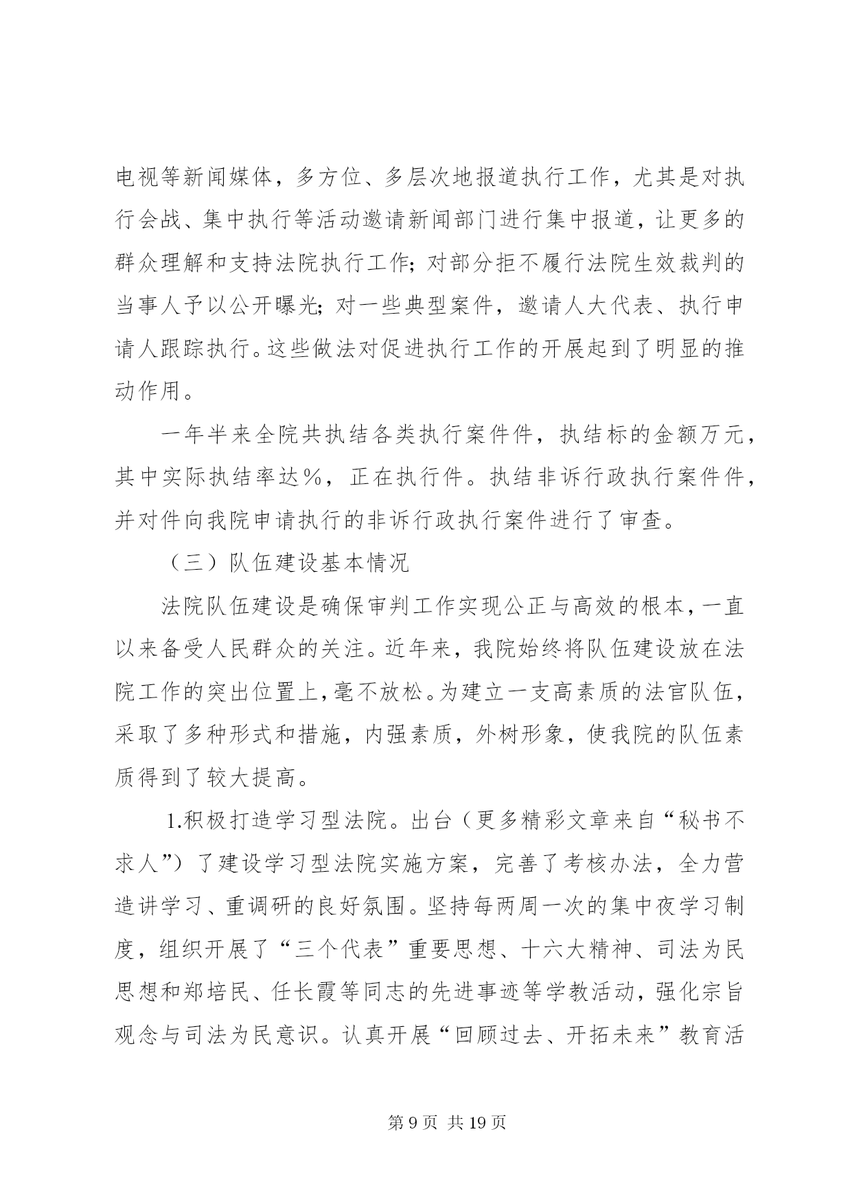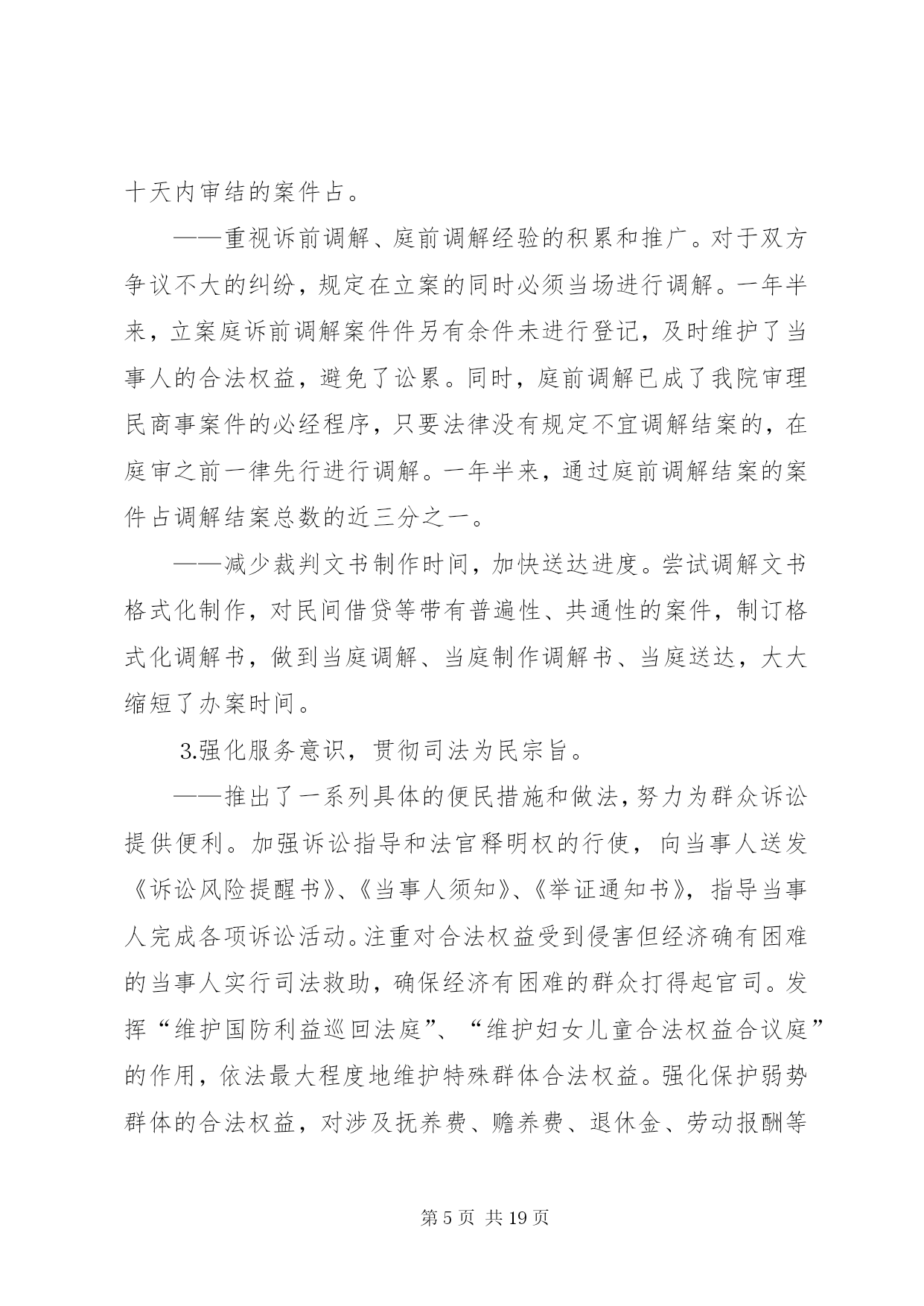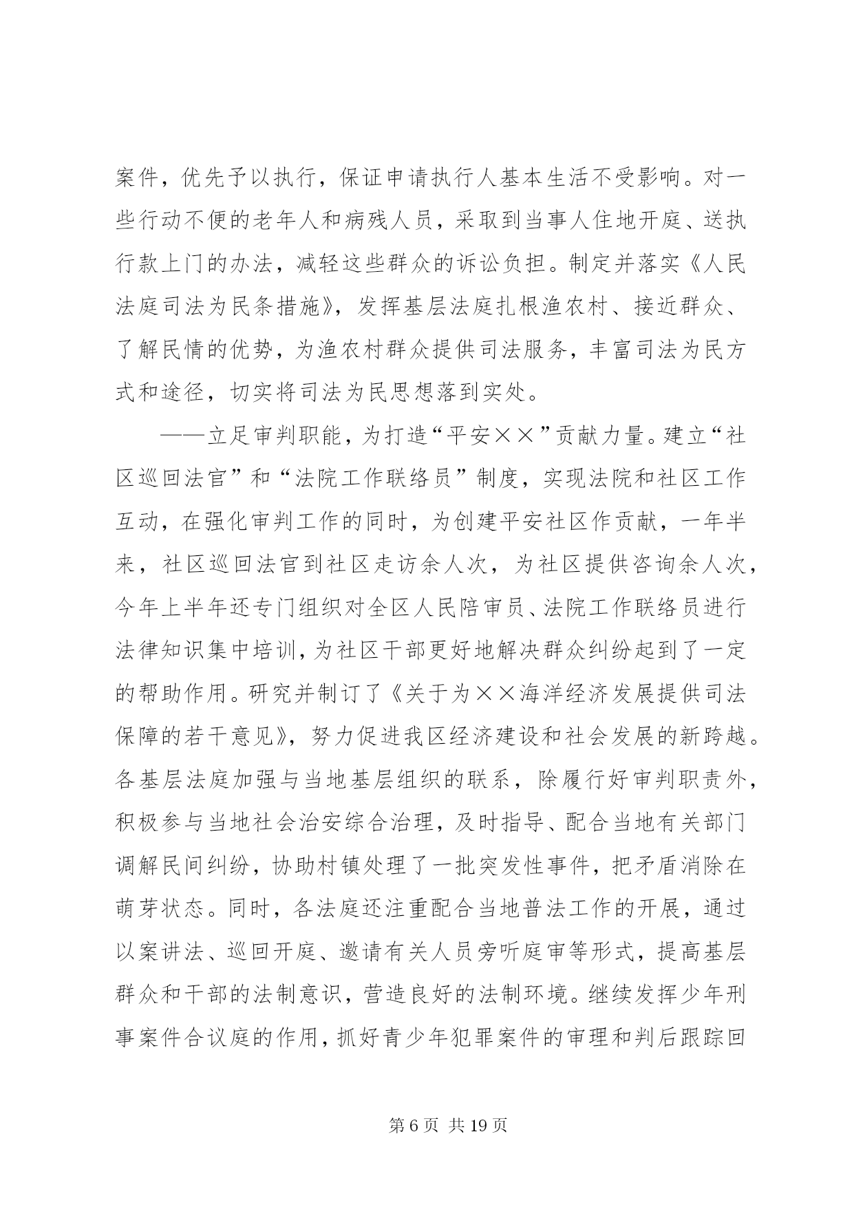 第PAGE\*Arabic\*MERGEFORMAT19页共NUMPAGES\*MERGEFORMAT19页人民法院司法自查报告各位代表:根据区人大常委会关于开展“两项评议”工作的通知精神,我们对区十四届人大一次会议以来司法工作开展情况进行了认真的回顾总结,并深入开展了自查自纠。现将主要情况汇报如下,请予评议。一、区十四届人大一次会议以来区法院司法工作回顾区十四届人大一次会议以来,我院在区委的领导、区人大及其常委会的监督以及上级法院的指导下,坚持以邓小平理论和“三个代表”重要思想为指导,认真贯彻区人大关于法院工作报告的决议,紧紧围绕全区工作大局,忠实履行宪法和法律赋予的职责,以“公正与效率”为主题,以司法为民为宗旨,重点抓好审判、改革、队伍建设三件大事。通过努力,各项工作有了较为明显的改观,审判质量和效率有了新的提高,法院改革稳妥推进,队伍形象逐步改善,较好地完成了维护稳定、保障改革、促进发展的司法工作任务。(一)审判工作基本情况××年以来至今年月底,全院共新收各类诉讼案件件,办结件(包括上一年的未结案),正在办理件。其中审结各类刑事案件件,一审判处犯罪分子人,共有人被判处了有期徒刑;一审审结民商事案件件,行政案件件;办结各类申诉和申请再审案件件。⒈狠抓案件质量,力求公正司法。案件质量是审判工作的生命,是人民法院能否在人民群众心目中树立司法权威的关键所在,因此,提高办案质量,确保审判公正,始终是我院孜孜以求的一项重要工作目标。随着社会进入转型期,日益复杂的社会关系导致社会纠纷也呈现多样化、复杂化趋势,尽管我国新的法律法规不断出台,法律体系进一步完善,但在许多情况下法律滞后的现象依然存在,新类型案件、无明确具体的法律依据可适用的案件呈上升势头,这些都给法官办案增加了新的困难和压力。面对这些新情况,为保证审判工作质量,我们在充分发扬过去一些好的经验的基础上,就如何提高案件质量进行了不断的探索,并采取了一系列有效措施,使我院的办案质量有了新的提高。——严格执行法律规定,确保依法审判。正确执行法律、法规、司法解释,严把案件事实关、证据关、程序关和适用法律关。严格执行最高法院《关于民事诉讼证据的若干规定》,进一步规范当事人举证、法庭质证、认证以及法院调查取证等证据制度,不断完善庭前证据交换、举证期限、证据失权的认定和处理等制度,促进了案件质量的提高。刑事审判既依法从重从快惩处罪犯,又确保无罪公民不受法律追究,强化人权保障力度。去年为贯彻最高法院肖扬院长提出的“依法惩罚犯罪,依法保障人权”的要求,对新刑诉法实施七年来审结的余件刑事案件进行了自查,未发现超期羁押现象。通过自查,进一步增强了质量意识和审限意识,杜绝超期羁押现象的发生。——高度重视案件审理的社会效果。及时总结前阶段“严打”整治斗争工作经验,认真研究并建立了贯彻“严打”方针的经常性工作机制,除继续保持对各类犯罪的打击力度外,通过集中公开宣判等形式,扩大办案的社会效果,增强公民的法制观念,震慑潜在的犯罪倾向。民商事审判强调调解工作,积极运用调解方式止纷息讼,在审结的件民商事案件中调解及经调解撤诉的件,调解撤诉率为。对群体性纠纷和矛盾易激化案件,坚持从大局出发,精心组织审理,强调耐心细致地做好说服疏导工作,争取法律效果和社会效果的有机统一。行政审判坚持规范行政行为、保护行政相对人合法权益以及支持依法行政、推进依法治区进程的原则,积极受理,慎重审判,注重协调,确保稳定。——强化审判监督力度。去年成立了审判监督庭,实现立审、审执、审监相分离,在此基础上,根据案件在审判流程中的不同环节,运用排期、审限监控、质量检查等方式进行监督,促使审判公开、公正、高效、文明、廉洁地进行。依法接受检察机关的法律监督,共审结检察机关抗诉案件件,纠正错案件。——树立精品意识,提高裁判文书的质量。修订和完善了《民事裁判文书制作样式改革若干意见》,结合最高法院《关于民事诉讼证据的若干规定》,对现有的诉讼文书样式重新作了调整,统一了种既符合证据规定,又方便当事人诉讼的诉讼文书制作样式。同时,组织开展优秀裁判文书评选活动,肯定和推广优秀裁判文书制作经验,发现和解决当前法官在制作裁判文书过程中的问题和缺陷,以评优活动的开展,促精品意识的树立。通过上述措施的落实,全院的审判质量有了较大程度的提升,案件上诉率、上诉案件发回改判率均有不同程度的降低,涉法上访案件明显减少。⒉狠抓办案效率,保障司法公正。迟来的公正不是公正,如果没有效率,公正将失去其应有的价值,这是现代司法理念提出的新要求。针对过去对审判效率不重视,审判管理运行机制落后,造成部分案件审理期限过长,效率低下的问题,我们除加强对法官的效率意识教育外,着重通过推进法院改革,建立科学规范的审判管理运行机制,来提高审判效率。——完善和落实简繁分流