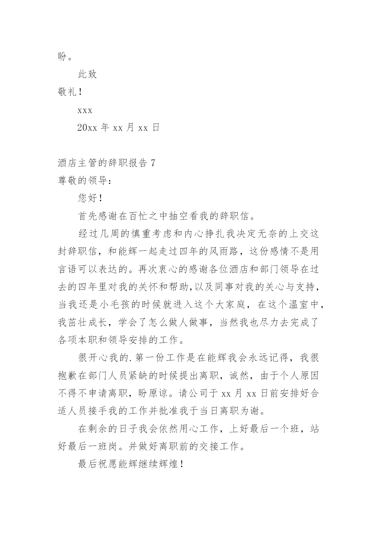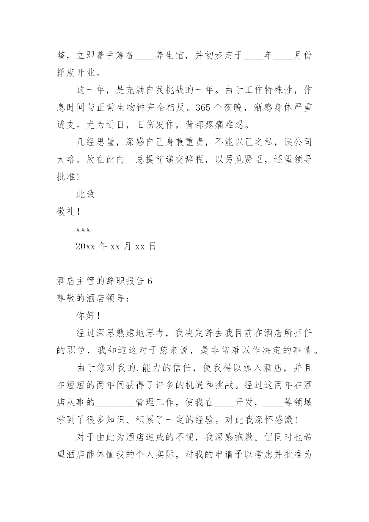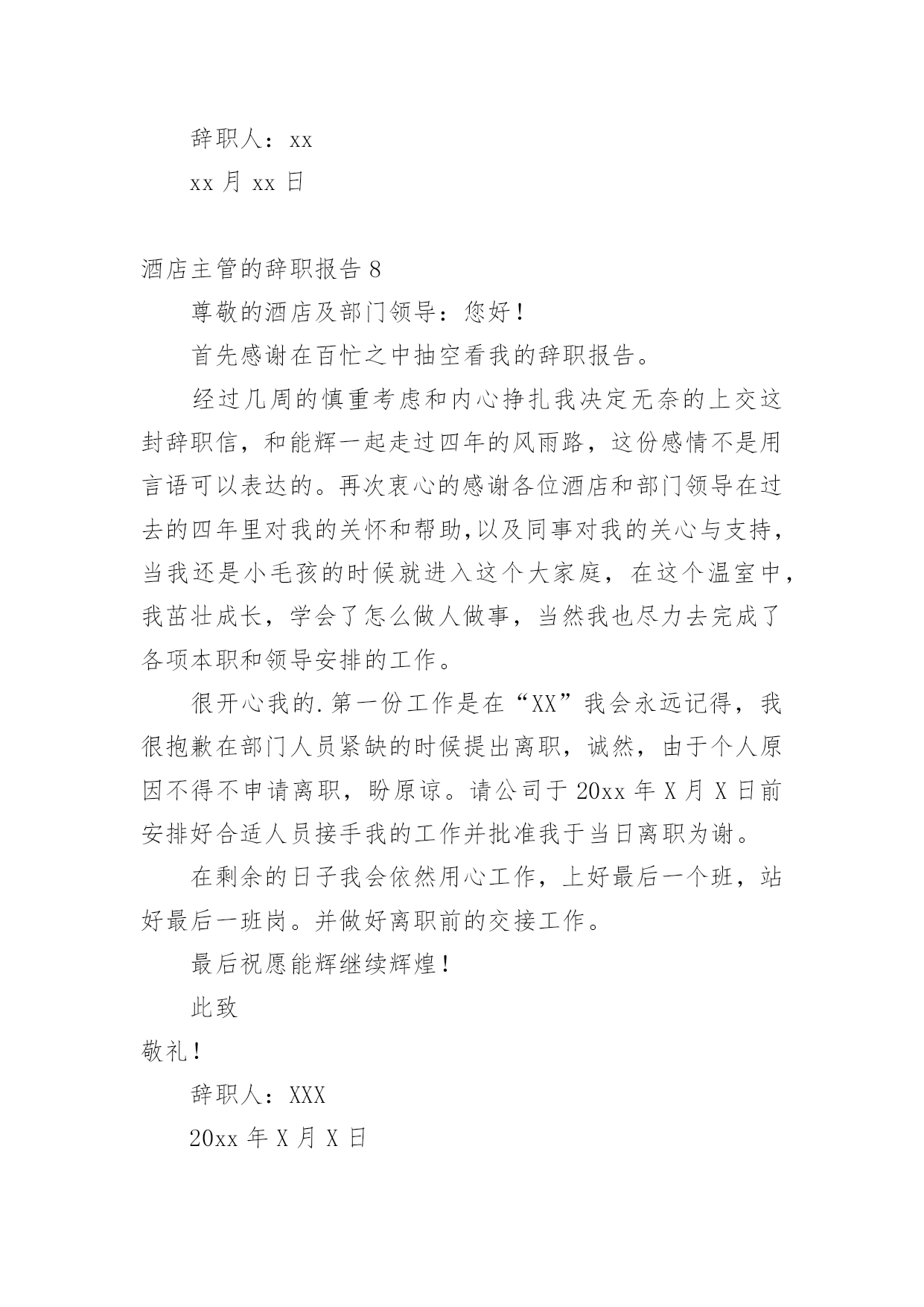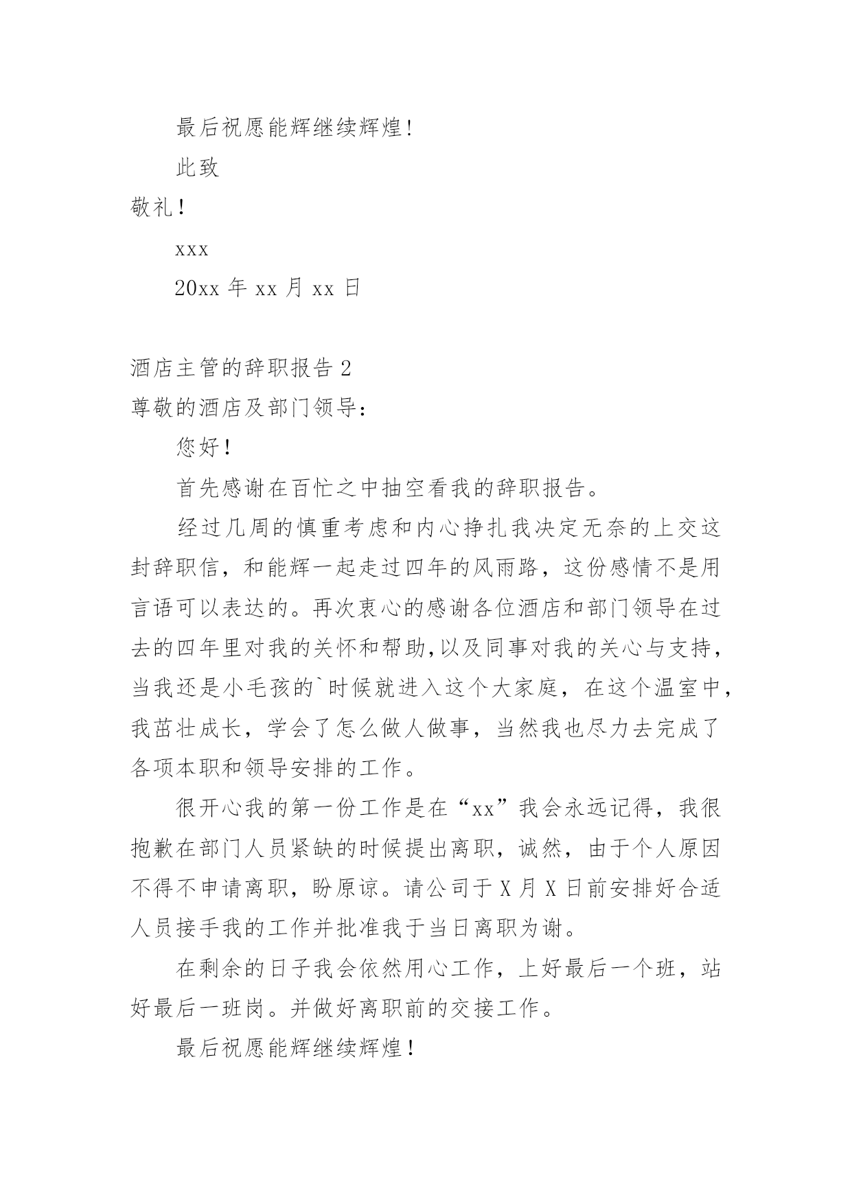 酒店主管的辞职报告在日常生活和工作中,报告使用的频率越来越高,报告中涉及到专业性术语要解释清楚。那么报告应该怎么写才合适呢?下面是小编精心整理的酒店主管的辞职报告,仅供参考,希望能够帮助到大家。酒店主管的辞职报告1尊敬的酒店及部门领导:您好!首先感谢在百忙之中抽空看我的辞职报告。经过几周的慎重考虑和内心挣扎我决定无奈的上交这封辞职信,和能辉一起走过四年的风雨路,这份感情不是用言语可以表达的'。再次衷心的感谢各位酒店和部门领导在过去的四年里对我的关怀和帮助,以及同事对我的关心与支持,当我还是小毛孩的时候就进入这个大家庭,在这个温室中,我茁壮成长,学会了怎么做人做事,当然我也尽力去完成了各项本职和领导安排的工作。很开心我的第一份工作是在“____”我会永远记得,我很抱歉在部门人员紧缺的时候提出离职,诚然,由于个人原因不得不申请离职,盼原谅。请公司于20____年__月__日前安排好合适人员接手我的工作并批准我于当日离职为谢。在剩余的日子我会依然用心工作,上好最后一个班,站好最后一班岗。并做好离职前的交接工作。最后祝愿能辉继续辉煌!此致敬礼!xxx20xx年xx月xx日酒店主管的辞职报告2尊敬的酒店及部门领导:您好!首先感谢在百忙之中抽空看我的辞职报告。经过几周的慎重考虑和内心挣扎我决定无奈的上交这封辞职信,和能辉一起走过四年的风雨路,这份感情不是用言语可以表达的。再次衷心的感谢各位酒店和部门领导在过去的四年里对我的关怀和帮助,以及同事对我的关心与支持,当我还是小毛孩的`时候就进入这个大家庭,在这个温室中,我茁壮成长,学会了怎么做人做事,当然我也尽力去完成了各项本职和领导安排的工作。很开心我的第一份工作是在“xx”我会永远记得,我很抱歉在部门人员紧缺的时候提出离职,诚然,由于个人原因不得不申请离职,盼原谅。请公司于X月X日前安排好合适人员接手我的工作并批准我于当日离职为谢。在剩余的日子我会依然用心工作,上好最后一个班,站好最后一班岗。并做好离职前的交接工作。最后祝愿能辉继续辉煌!此致敬礼!辞职人:xxXX月X日酒店主管的辞职报告3尊敬的领导:您好!因为我身体的原因,调养快一个月,医院仍然觉得我目前还要休息,不能承受压力并要保持愉悦的生活氛围,暂时不能去公司工作,为了不耽误公司的工作,我很遗憾自己在这个时候向公司正式提出辞职。我会在近期身体稍微舒适一点的时候去公司办理工作交接手续。来到xx酒店也快两年了,有过欢笑,有过收获,也有过泪水和痛苦。公司平等的人际关系和开明的.工作作风,一度让我有着找到了依靠的感觉,在这里我能开心的工工作,开心的学习。最后祝公司在今年蓬勃发展,取得更加优异的成绩;祝愿公司上下所有领导和员工身体健康,万事如意!我为能在xx工作过感到无比的荣幸和自豪,我会怀念在这里的每时每刻,感谢公司给了我这么一个机会。在公司这一年多里,公司领导和周围同事给了我无比的照顾和关怀,让我深切的感受到了公司倡导的人情化管理给我们带来的亲切和温馨。我深信,公司将沿着通往胜利彼岸的高速轨道飞速前进,将一如既往的在酒店服务领域领航!我真诚的恳请公司领导批准我的辞职申请,在这里我表示衷心的感谢,同时祝愿公司不断壮大发展!此致敬礼!辞职人:xxxxx月xx日酒店主管的辞职报告4尊敬的领导:您好!首先感谢您在百忙之中抽出时间阅读我的辞职信。我是怀着十分复杂的心情写这封辞职信的。自我进入酒店之后,我学习到了很多的知识,同事对我也十分热情,我对酒店也有了深厚的感情,但是由于家庭原因,我不得不离开我喜爱的岗位,辞去目前酒店主管的.工作。我知道这个过程会给酒店带来一定程度上的不便,对此我深表歉意。我会尽快完成工作交接,以减少因我的离职而给酒店带来的不便。为了尽量减少对现有工作造成的影响,我请求在酒店的员工通讯录上保留我的手机号码一段时间,在此期间,如果有同事对我以前的工作有任何疑问,我将及时做出答复。非常感谢酒店对我的培养和照顾在xx酒店的这段经历于我而言非常珍贵。将来无论什么时候,我都会为自己曾经是xx酒店的一员感到荣幸。我确信这段工作经历将是我整个职业生涯发展中相当重要的一部分。祝酒店领导和所有同事身体健康、工作顺利!再次对我的离职给酒店带来的不便表示歉意,同时我也希望酒店能够理解我的实际情况,对我的申请予以考虑并批准。辞职人:xx20××年xx月xx日酒店主管的辞职报告5尊敬的__总:您好!转瞬间来____酒店工作已经一年有余。首先感谢公司这一年对我的栽培,感谢各位领导在工作中给予的'支持和帮助。感谢您不吝赐教,让我在这一年职业生涯中受益匪浅。早有耳闻,____酒店是____最大的民营酒店集团之一。里面饱学人士,数不胜数。很容幸,当时能够得到领导赏识,顺利聘任康体部经理一职。为此,我非常珍惜。论语有言:“学而不思则罔,思而不学则殆”。进入酒店大