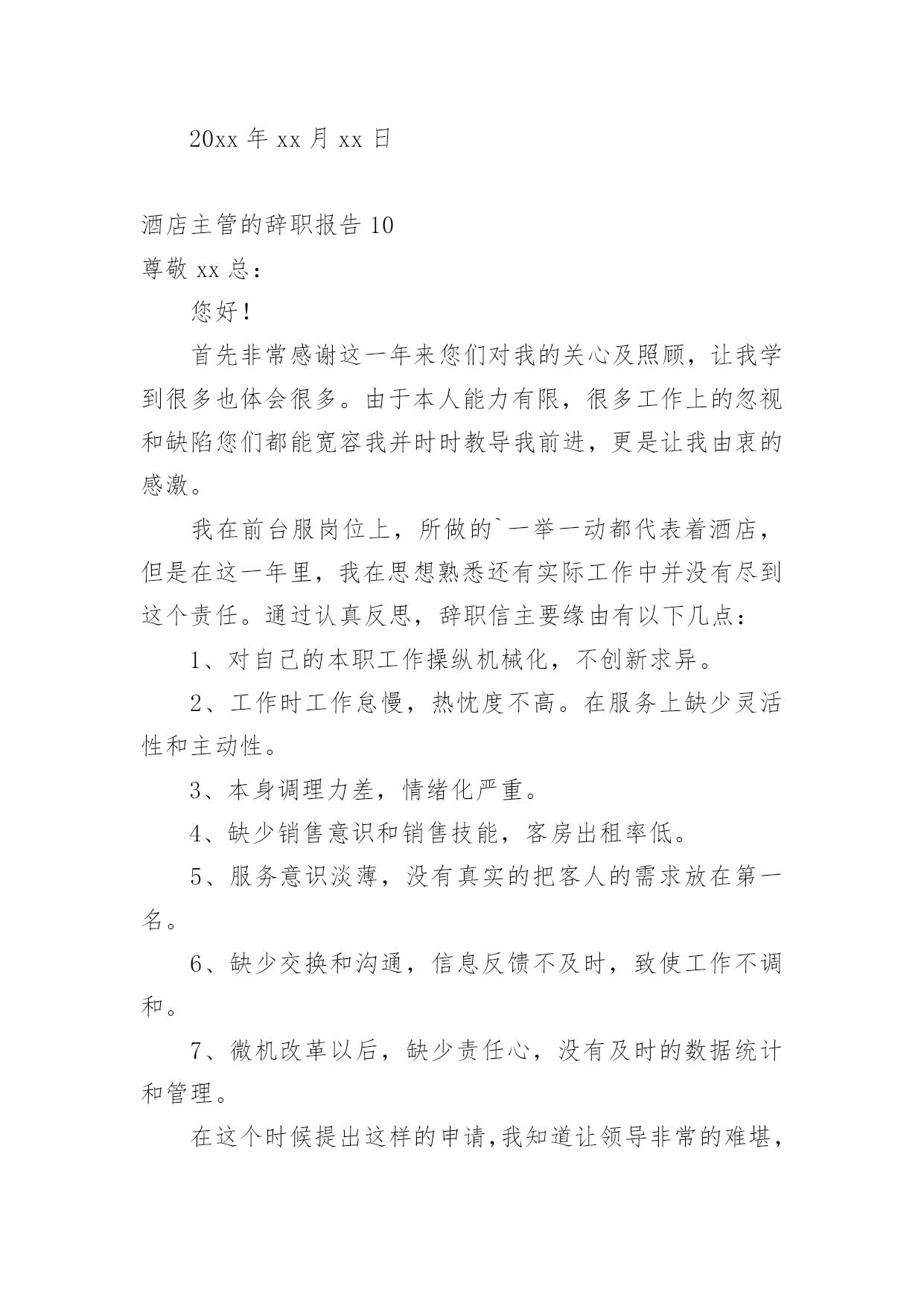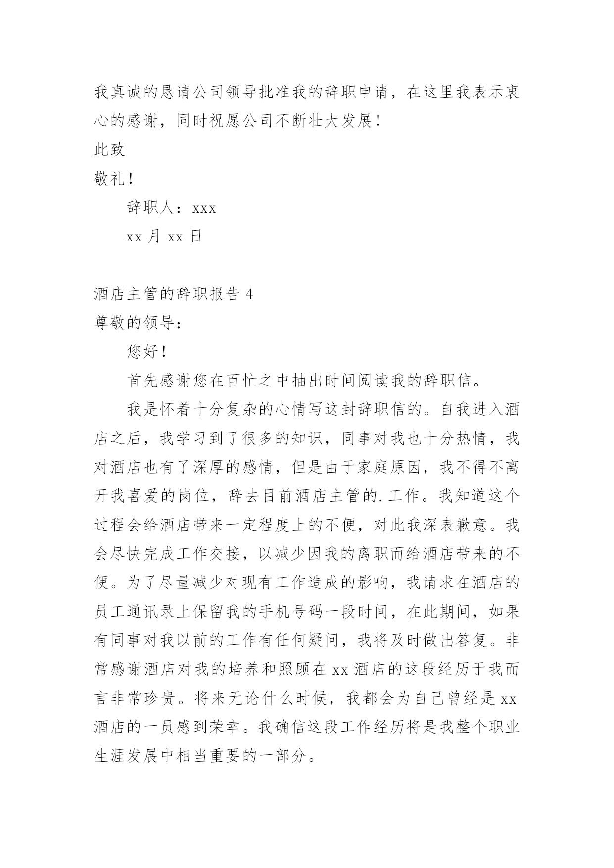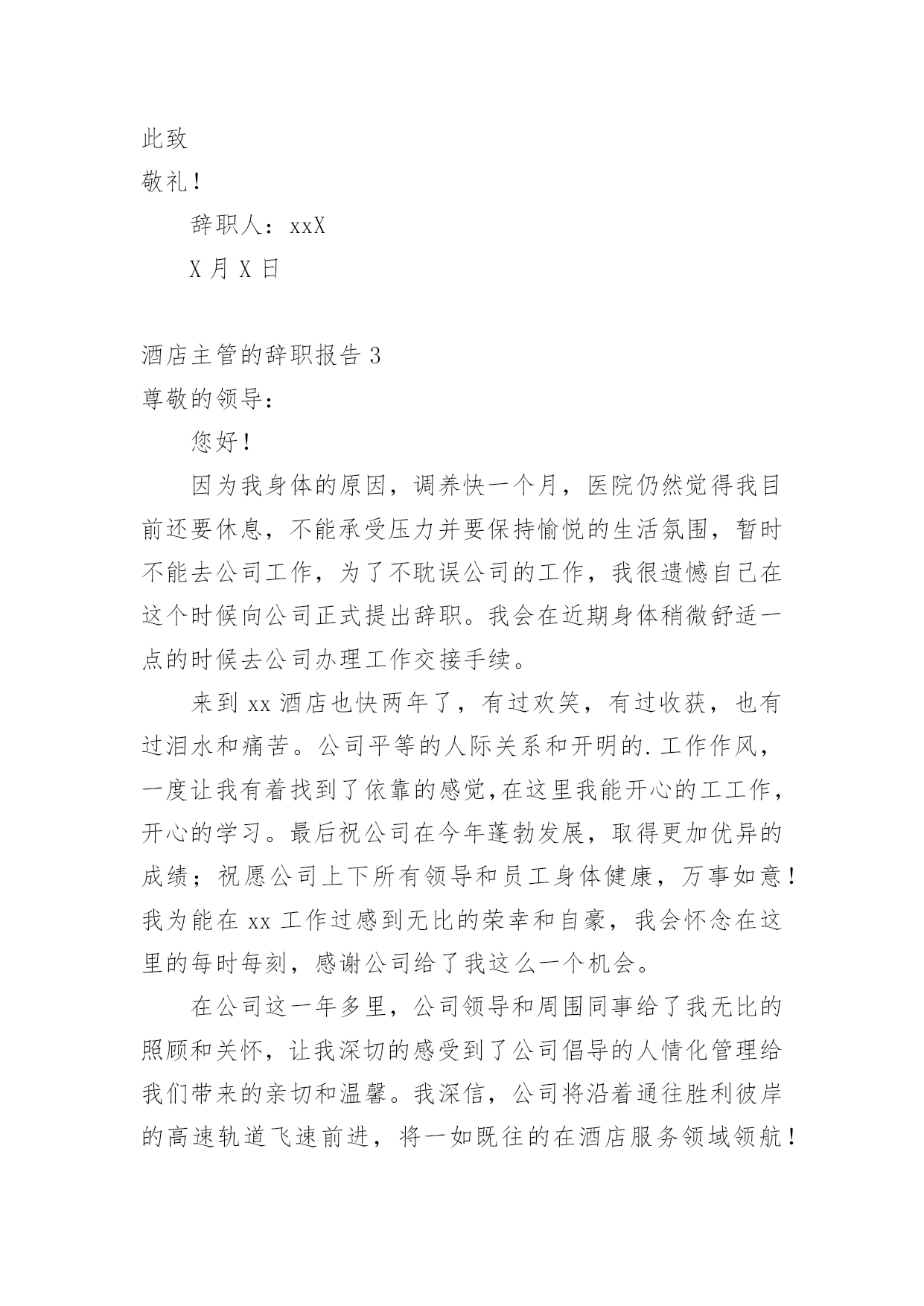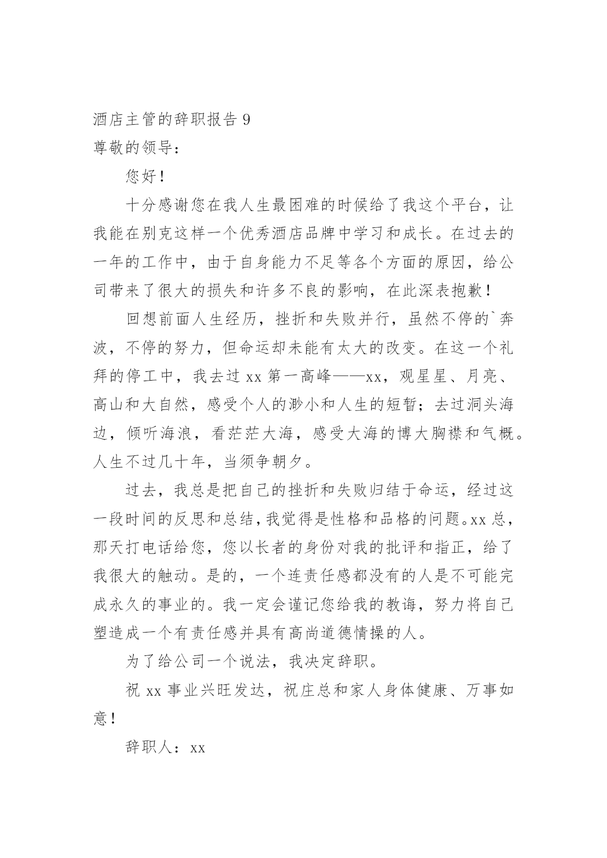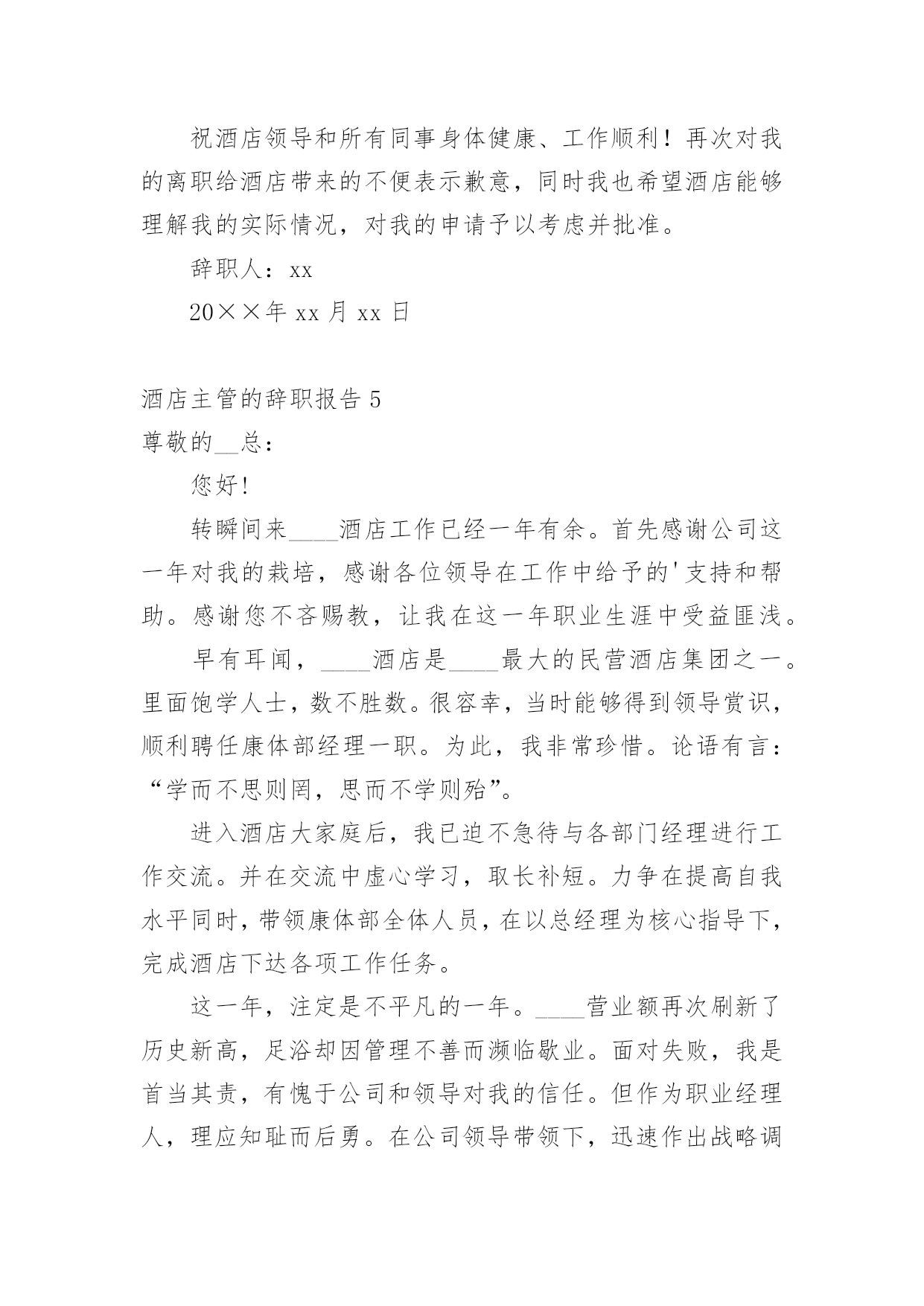 酒店主管的辞职报告在日常生活和工作中,报告使用的频率越来越高,报告中涉及到专业性术语要解释清楚。那么报告应该怎么写才合适呢?下面是小编精心整理的酒店主管的辞职报告,仅供参考,希望能够帮助到大家。酒店主管的辞职报告1尊敬的酒店及部门领导:您好!首先感谢在百忙之中抽空看我的辞职报告。经过几周的慎重考虑和内心挣扎我决定无奈的上交这封辞职信,和能辉一起走过四年的风雨路,这份感情不是用言语可以表达的'。再次衷心的感谢各位酒店和部门领导在过去的四年里对我的关怀和帮助,以及同事对我的关心与支持,当我还是小毛孩的时候就进入这个大家庭,在这个温室中,我茁壮成长,学会了怎么做人做事,当然我也尽力去完成了各项本职和领导安排的工作。很开心我的第一份工作是在“____”我会永远记得,我很抱歉在部门人员紧缺的时候提出离职,诚然,由于个人原因不得不申请离职,盼原谅。请公司于20____年__月__日前安排好合适人员接手我的工作并批准我于当日离职为谢。在剩余的日子我会依然用心工作,上好最后一个班,站好最后一班岗。并做好离职前的交接工作。最后祝愿能辉继续辉煌!此致敬礼!xxx20xx年xx月xx日酒店主管的辞职报告2尊敬的酒店及部门领导:您好!首先感谢在百忙之中抽空看我的辞职报告。经过几周的慎重考虑和内心挣扎我决定无奈的上交这封辞职信,和能辉一起走过四年的风雨路,这份感情不是用言语可以表达的。再次衷心的感谢各位酒店和部门领导在过去的四年里对我的关怀和帮助,以及同事对我的关心与支持,当我还是小毛孩的`时候就进入这个大家庭,在这个温室中,我茁壮成长,学会了怎么做人做事,当然我也尽力去完成了各项本职和领导安排的工作。很开心我的第一份工作是在“xx”我会永远记得,我很抱歉在部门人员紧缺的时候提出离职,诚然,由于个人原因不得不申请离职,盼原谅。请公司于X月X日前安排好合适人员接手我的工作并批准我于当日离职为谢。在剩余的日子我会依然用心工作,上好最后一个班,站好最后一班岗。并做好离职前的交接工作。最后祝愿能辉继续辉煌!此致敬礼!辞职人:xxXX月X日酒店主管的辞职报告3尊敬的领导:您好!因为我身体的原因,调养快一个月,医院仍然觉得我目前还要休息,不能承受压力并要保持愉悦的生活氛围,暂时不能去公司工作,为了不耽误公司的工作,我很遗憾自己在这个时候向公司正式提出辞职。我会在近期身体稍微舒适一点的时候去公司办理工作交接手续。来到xx酒店也快两年了,有过欢笑,有过收获,也有过泪水和痛苦。公司平等的人际关系和开明的.工作作风,一度让我有着找到了依靠的感觉,在这里我能开心的工工作,开心的学习。最后祝公司在今年蓬勃发展,取得更加优异的成绩;祝愿公司上下所有领导和员工身体健康,万事如意!我为能在xx工作过感到无比的荣幸和自豪,我会怀念在这里的每时每刻,感谢公司给了我这么一个机会。在公司这一年多里,公司领导和周围同事给了我无比的照顾和关怀,让我深切的感受到了公司倡导的人情化管理给我们带来的亲切和温馨。我深信,公司将沿着通往胜利彼岸的高速轨道飞速前进,将一如既往的在酒店服务领域领航!我真诚的恳请公司领导批准我的辞职申请,在这里我表示衷心的感谢,同时祝愿公司不断壮大发展!此致敬礼!辞职人:xxxxx月xx日酒店主管的辞职报告4尊敬的领导:您好!首先感谢您在百忙之中抽出时间阅读我的辞职信。我是怀着十分复杂的心情写这封辞职信的。自我进入酒店之后,我学习到了很多的知识,同事对我也十分热情,我对酒店也有了深厚的感情,但是由于家庭原因,我不得不离开我喜爱的岗位,辞去目前酒店主管的.工作。我知道这个过程会给酒店带来一定程度上的不便,对此我深表歉意。我会尽快完成工作交接,以减少因我的离职而给酒店带来的不便。为了尽量减少对现有工作造成的影响,我请求在酒店的员工通讯录上保留我的手机号码一段时间,在此期间,如果有同事对我以前的工作有任何疑问,我将及时做出答复。非常感谢酒店对我的培养和照顾在xx酒店的这段经历于我而言非常珍贵。将来无论什么时候,我都会为自己曾经是xx酒店的一员感到荣幸。我确信这段工作经历将是我整个职业生涯发展中相当重要的一部分。祝酒店领导和所有同事身体健康、工作顺利!再次对我的离职给酒店带来的不便表示歉意,同时我也希望酒店能够理解我的实际情况,对我的申请予以考虑并批准。辞职人:xx20××年xx月xx日酒店主管的辞职报告5尊敬的__总:您好!转瞬间来____酒店工作已经一年有余。首先感谢公司这一年对我的栽培,感谢各位领导在工作中给予的'支持和帮助。感谢您不吝赐教,让我在这一年职业生涯中受益匪浅。早有耳闻,____酒店是____最大的民营酒店集团之一。里面饱学人士,数不胜数。很容幸,当时能够得到领导赏识,顺利聘任康体部经理一职。为此,我非常珍惜。论语有言:“学而不思则罔,思而不学则殆”。进入酒店大