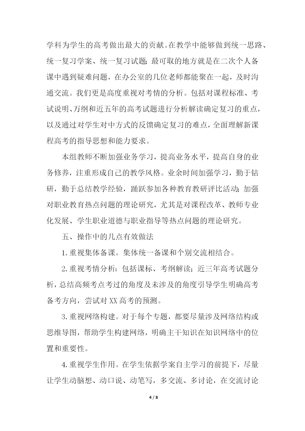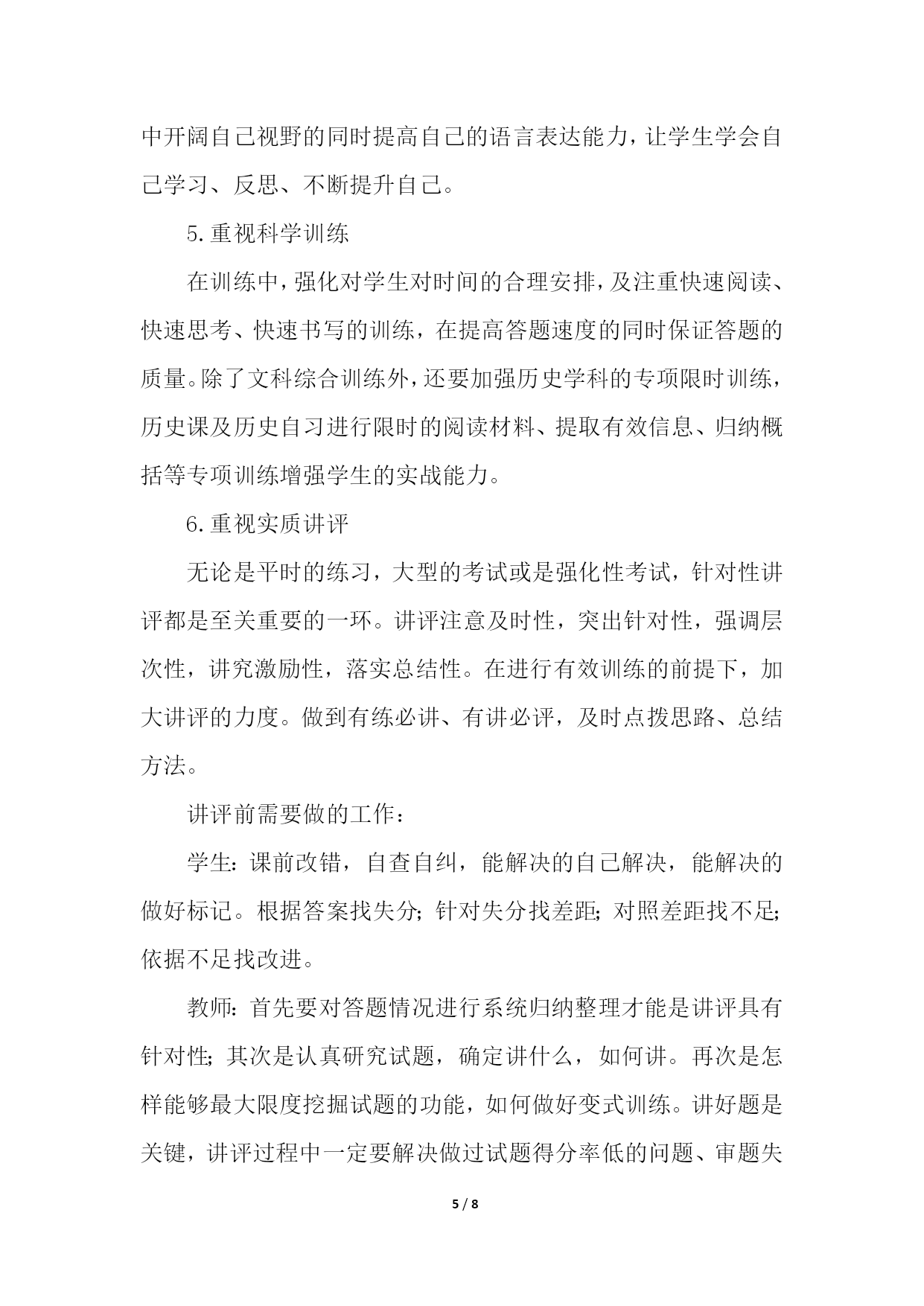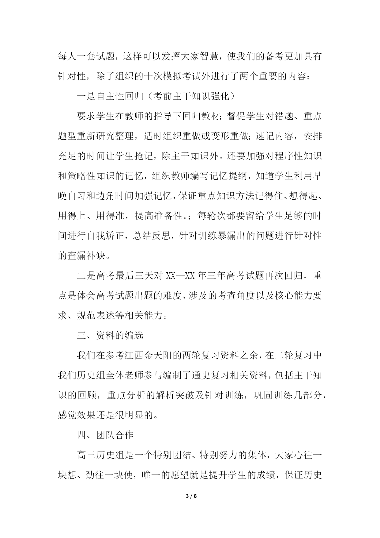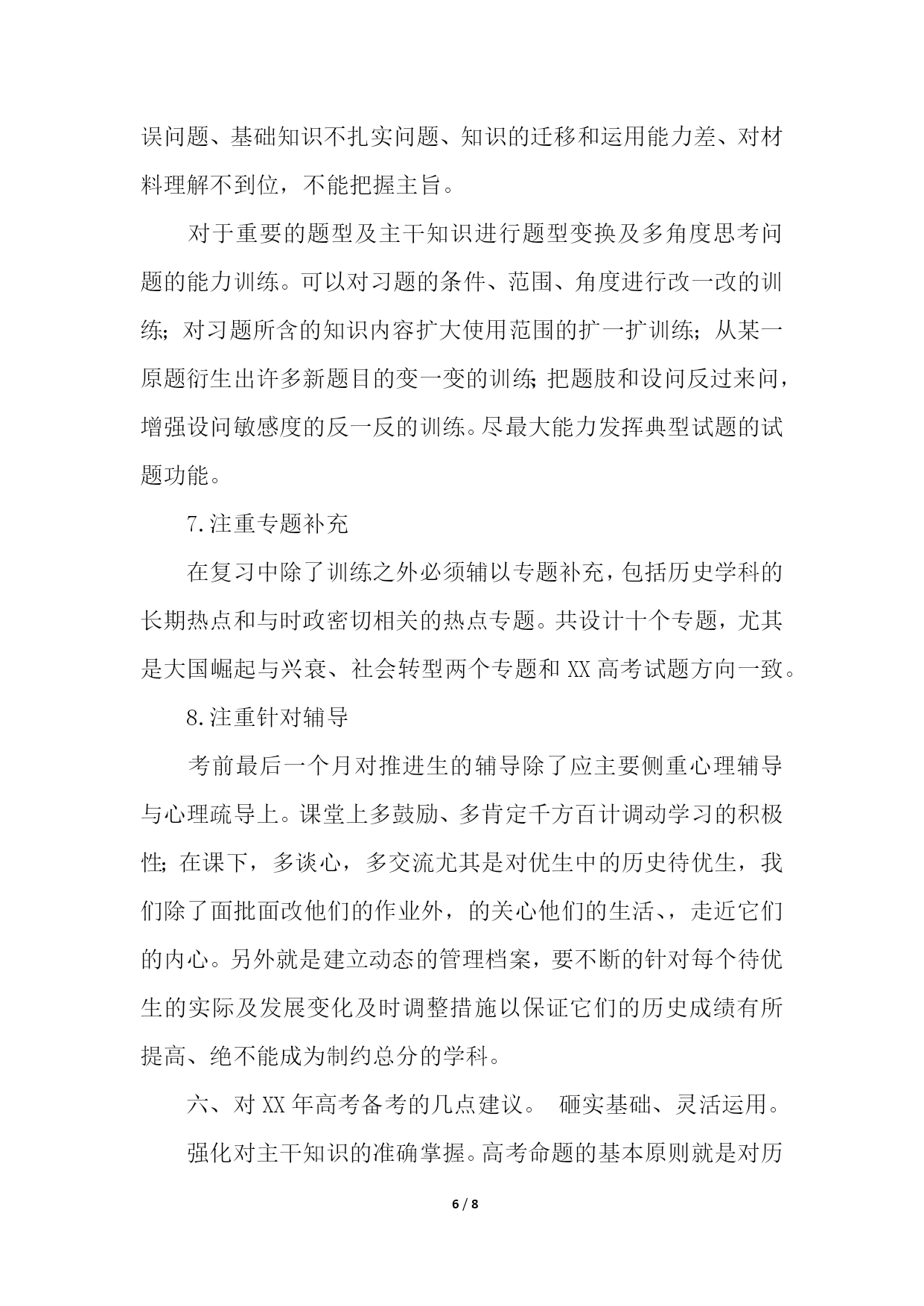 PAGE8/NUMPAGES8高考备考的工作总结一、备考方向及备考思路总结:通过对XX年各地区15套高考试题的分析得出我们历史组的三轮备考工作的方向性非常正确,复习也非常具有针对性,尤其是我们在二轮复习中在通史复习的基本前提下,穿插了老教材的相关内容,2104高考无论是新课标一新课标二还是其它地区的高考试题基本侧重了这样一种脉络,例如:两套新课标的41题,题目设计新颖,是对不同时期版本的的教材目录进行删减、整合,这就涉及到我们老教材的内容;又如:我们在二轮复习采取了通史阶段特征的复习方法,浙江卷的38、明清时期的政治、经济、对外恰恰是考察了阶段特征;我们在复习中侧重了世界市场的全球化以及马歇尔计划的复习。在XX高考中有三个省区的主观题都有涉及世界市场的全球化;两个省区涉及马歇尔计划;在热点复习中,我们认为XX年是中法建交50周年,重点强调中法关系的发展,浙江卷的39题考察就是中法关系的发展演变;拿破仑的评价;总之我们XX年高考备考的思路是非常适应高考要求的。二、各阶段的安排我们的备考复习安排为三个轮次一个冲刺四个阶段。一轮复习基本按照教材顺序进行基础主干知识的复习,通过“低起点、小梯度、高密度,构建科学有效的学科体系。”帮助学生从高考的角度来认识和掌握历史知识,并进行归类、整理、加工,使之规律化、网络化。通过对知识点、考点、热点进行思考、讨论、总结,完成了知识目标的'掌握。通过学科基础教学,使学生熟练掌握考纲上所要求的各种能力:获取和解读信息能力、调动和运用知识能力、描述和阐释事物能力、论证和探究问题能力;基本养成正确审题、答题的良好习惯和能力,减少非智力因素失分,完成了能力目标的培养。2、二轮复习采取通史复习的方式,让学生对中国古代、近代、现代;世界古代、近代、现代几段历史进行宏观、系统的把握,按照“源于教材,高于教材”的原则整合教学资源,概括、拓展、升华教材集中力量准确理解重要的历史概念,理清历史发展线索,明确历史发展各阶段的特征,掌握各个单元及各专题的知识结构,在这过程中,穿插补充了一些人民版教材没有设计的内容,丰富学生的知识,开阔学生的视野。培养学生构建主干知识的能力,教会学生认识、理解和评析材料,注意会用历史的语言叙述历史规律和历史过程,同时注意解题的规范性。促使学生自己形成把握历史问题的能力。3、注重三轮复习和冲刺阶段的辅导在三轮复习中除了按照年级的安排进行九轮正式考试再加上考前的保温训练,总计10套模拟试题。学校就、会提供4套试题,我们自己需要根据学生实际和历史专题组织56套试题,但因学校安排的试题也可能有不适合之处,需要历史组的老师们每人一套试题,这样可以发挥大家智慧,使我们的备考更加具有针对性,除了组织的十次模拟考试外进行了两个重要的内容:一是自主性回归(考前主干知识强化)要求学生在教师的指导下回归教材;督促学生对错题、重点题型重新研究整理,适时组织重做或变形重做;速记内容,安排充足的时间让学生抢记,除主干知识外。还要加强对程序性知识和策略性知识的记忆,组织教师编写记忆提纲,知道学生利用早晚自习和边角时间加强记忆,保证重点知识方法记得住、想得起、用得上、用得准,提高准备性。;每轮次都要留给学生足够的时间进行自我矫正,总结反思,针对训练暴漏出的问题进行针对性的查漏补缺。二是高考最后三天对XX—XX年三年高考试题再次回归,重点是体会高考试题出题的难度、涉及的考查角度以及核心能力要求、规范表述等相关能力。三、资料的编选我们在参考江西金天阳的两轮复习资料之余,在二轮复习中我们历史组全体老师参与编制了通史复习相关资料,包括主干知识的回顾,重点分析的解析突破及针对训练,巩固训练几部分,感觉效果还是很明显的。四、团队合作高三历史组是一个特别团结、特别努力的集体,大家心往一块想、劲往一块使,唯一的愿望就是提升学生的成绩,保证历史学科为学生的高考做出最大的贡献。在教学中能够做到统一思路、统一复习学案、统一复习试题;最可取的地方就是在二次个人备课中遇到疑难问题,在办公室的几位老师都能聚在一起,及时沟通交流。我们更是高度重视对考情的分析。包括对课程标准、考试说明、万纲和近五年的高考试题进行分析解读确定复习的重点,以及通过对学生对中方式的反馈确定复习的难点,全面理解新课程高考的指导思想和能力要求。本组教师不断加强业务学习,提高业务水平,提高自身的业务修养,注重形成自己的教学风格。业余时间加强学习,勤于钻研,勤于总结教学经验,踊跃参加各种教育教研评比活动;加强对职业教育热点问题的理论研究,尤其是对课程改革、教师专业化发展、学生职业道德与职业指导等热点问题的理论研究。五、操作中的几点有效做法1.重视集体备课。集体统一备课和个别交流相结合。2.重视考情分析:包括课标、考纲解读;近三年高考试题分析,总结高频考点考过的角度