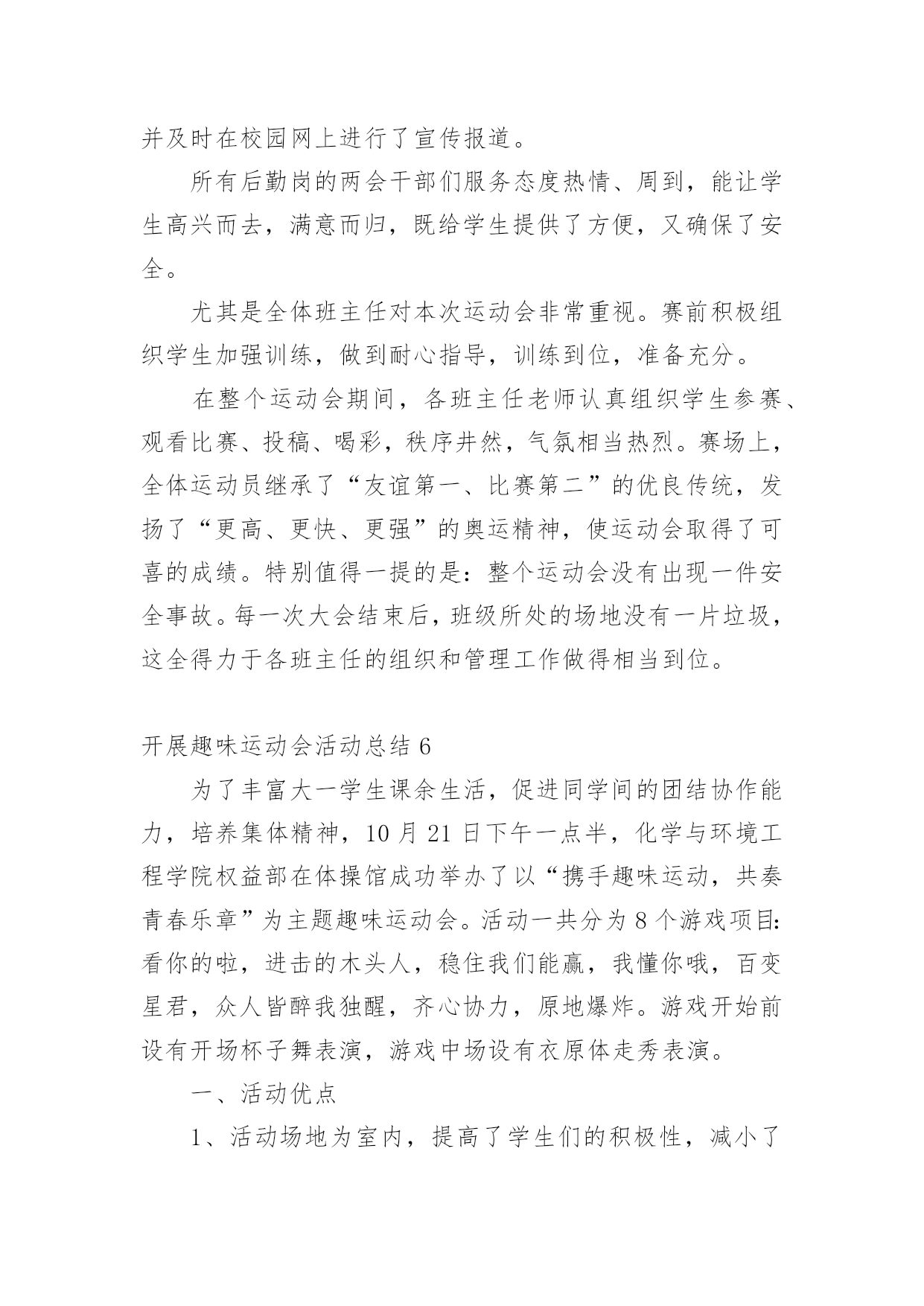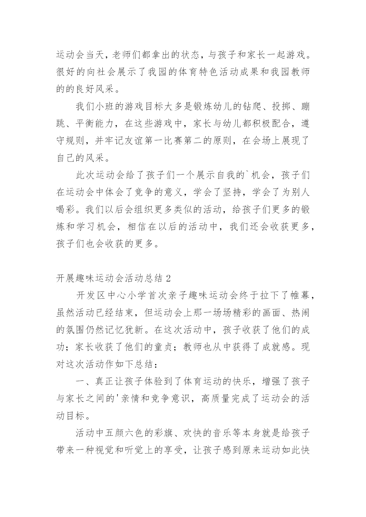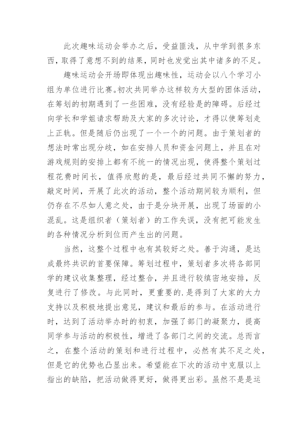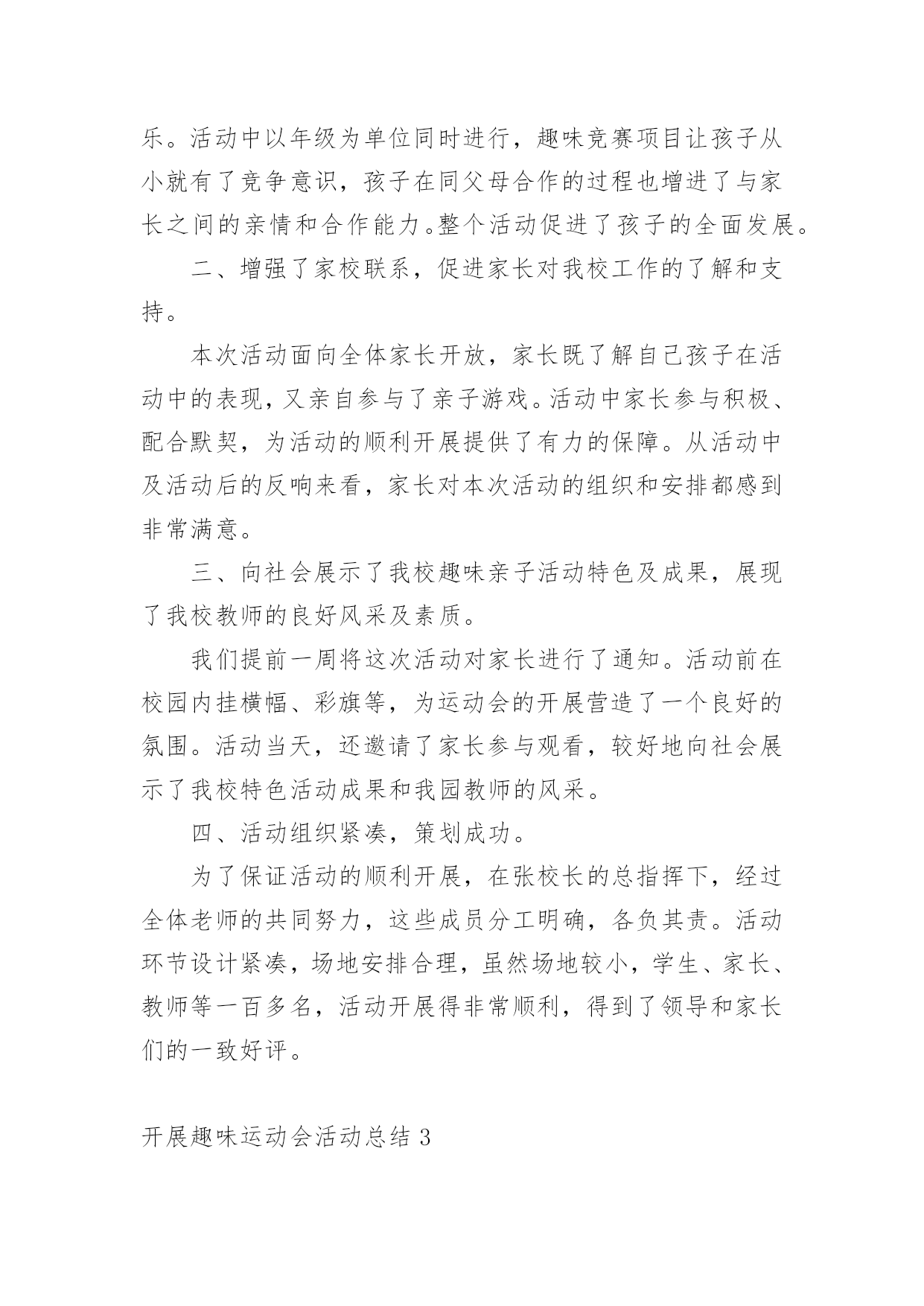 开展趣味运动会活动总结总结是对取得的成绩、存在的问题及得到的经验和教训等方面情况进行评价与描述的一种书面材料,它有助于我们寻找工作和事物发展的规律,从而掌握并运用这些规律,不妨让我们认真地完成总结吧。总结怎么写才不会千篇一律呢?以下是小编精心整理的开展趣味运动会活动总结,欢迎阅读与收藏。开展趣味运动会活动总结1筹备了近一个月的"亲子趣味运动会"在上周五终于成功拉下帷幕,本次运动会的口号是:我运动,我快乐,我锻炼,我提高,我最棒!我们本次运动会的目标是激发幼儿与家长对体育运动的热爱之情,增强体质,培养幼儿勇敢坚强的意志品质;其次,通过玩游戏增进幼儿与家长之间的情感交流。在本次运动会中,幼儿收获了快乐与成功,家长们收获了童贞,老师们也从中获得了成就感。本次活动是以孩子和家长为主体,主要体现了"运动快乐"这个主题,所以我们年级组在体育游戏设计上,都符合各班年龄层次及幼儿生理和心理特点,非常有趣味性。活动当天,幼儿与家长们都玩的很开心,让幼儿感觉到原来运动是如此的快乐。为了筹备这次运动会,老师们和孩子都十分辛苦。所以每天都努力练习,只为把孩子们和自已的一面展现给家长们。运动会当天,老师们都拿出的状态,与孩子和家长一起游戏。很好的向社会展示了我园的体育特色活动成果和我园教师的的良好风采。我们小班的游戏目标大多是锻炼幼儿的钻爬、投掷、蹦跳、平衡能力,在这些游戏中,家长与幼儿都积极配合,遵守规则,并牢记友谊第一比赛第二的原则,在会场上展现了自己的风采。此次运动会给了孩子们一个展示自我的`机会,孩子们在运动会中体会了竞争的意义,学会了坚持,学会了为别人喝彩。我们以后会组织更多类似的活动,给孩子们更多的锻炼和学习机会,相信在以后的活动中,我们还会收获更多,孩子们也会收获的更多。开展趣味运动会活动总结2开发区中心小学首次亲子趣味运动会终于拉下了帷幕,虽然活动已经结束,但运动会上那一场场精彩的画面、热闹的氛围仍然记忆犹新。在这次活动中,孩子收获了他们的成功;家长收获了他们的童贞;教师也从中获得了成就感。现对这次活动作如下总结:一、真正让孩子体验到了体育运动的快乐,增强了孩子与家长之间的'亲情和竞争意识,高质量完成了运动会的活动目标。活动中五颜六色的彩旗、欢快的音乐等本身就是给孩子带来一种视觉和听觉上的享受,让孩子感到原来运动如此快乐。活动中以年级为单位同时进行,趣味竞赛项目让孩子从小就有了竞争意识,孩子在同父母合作的过程也增进了与家长之间的亲情和合作能力。整个活动促进了孩子的全面发展。二、增强了家校联系,促进家长对我校工作的了解和支持。本次活动面向全体家长开放,家长既了解自己孩子在活动中的表现,又亲自参与了亲子游戏。活动中家长参与积极、配合默契,为活动的顺利开展提供了有力的保障。从活动中及活动后的反响来看,家长对本次活动的组织和安排都感到非常满意。三、向社会展示了我校趣味亲子活动特色及成果,展现了我校教师的良好风采及素质。我们提前一周将这次活动对家长进行了通知。活动前在校园内挂横幅、彩旗等,为运动会的开展营造了一个良好的氛围。活动当天,还邀请了家长参与观看,较好地向社会展示了我校特色活动成果和我园教师的风采。四、活动组织紧凑,策划成功。为了保证活动的顺利开展,在张校长的总指挥下,经过全体老师的共同努力,这些成员分工明确,各负其责。活动环节设计紧凑,场地安排合理,虽然场地较小,学生、家长、教师等一百多名,活动开展得非常顺利,得到了领导和家长们的一致好评。开展趣味运动会活动总结3此次趣味运动会举办之后,受益匪浅,从中学到很多东西,取得了意想不到的结果,同时也发觉出其中诸多的不足。趣味运动会开场即体现出趣味性,运动会以八个学习小组为单位进行比赛。初次共同举办这样较为大型的团体活动,在筹划的初期遇到了一些困难,没有经验是的障碍。后经过向学长和学姐请求帮助及大家的多次讨论,才得以使筹划走上正轨。但是随后仍出现了一个一个的问题。由于策划者的想法时常出现分歧,如在安排人员和资金问题上,并且在对游戏规则的安排上都有不统一的情况出现,使得整个策划过程花费时间长,值得欣慰的是,最后经过共同不懈的努力,敲定时间,开展了此次的活动,整个活动期间较为顺利,但仍存在不尽如人意之处,由于是分块开展,出现了场面的小混乱。这是组织者(策划者)的工作失误,没有把可能发生的各种情况分析到位而产生出的问题。当然,这整个过程中也有其较好之处。善于沟通,是达成最终共识的首要保障。筹划过程中,策划者多次将各部同学的建议收集整理,经过整合,并且进行较缜密地安排,反复进行了修改。与此同时,更重要的.是得到了大家的大力支持以及积极地提出意见,建议和最后的参与。在活动进行时,达到了活动举办时的初衷,加强了部门的凝聚力,提高同学参与活动的积极性,增进了各部门之间的交流。总而言之,在整个活动的策划和进