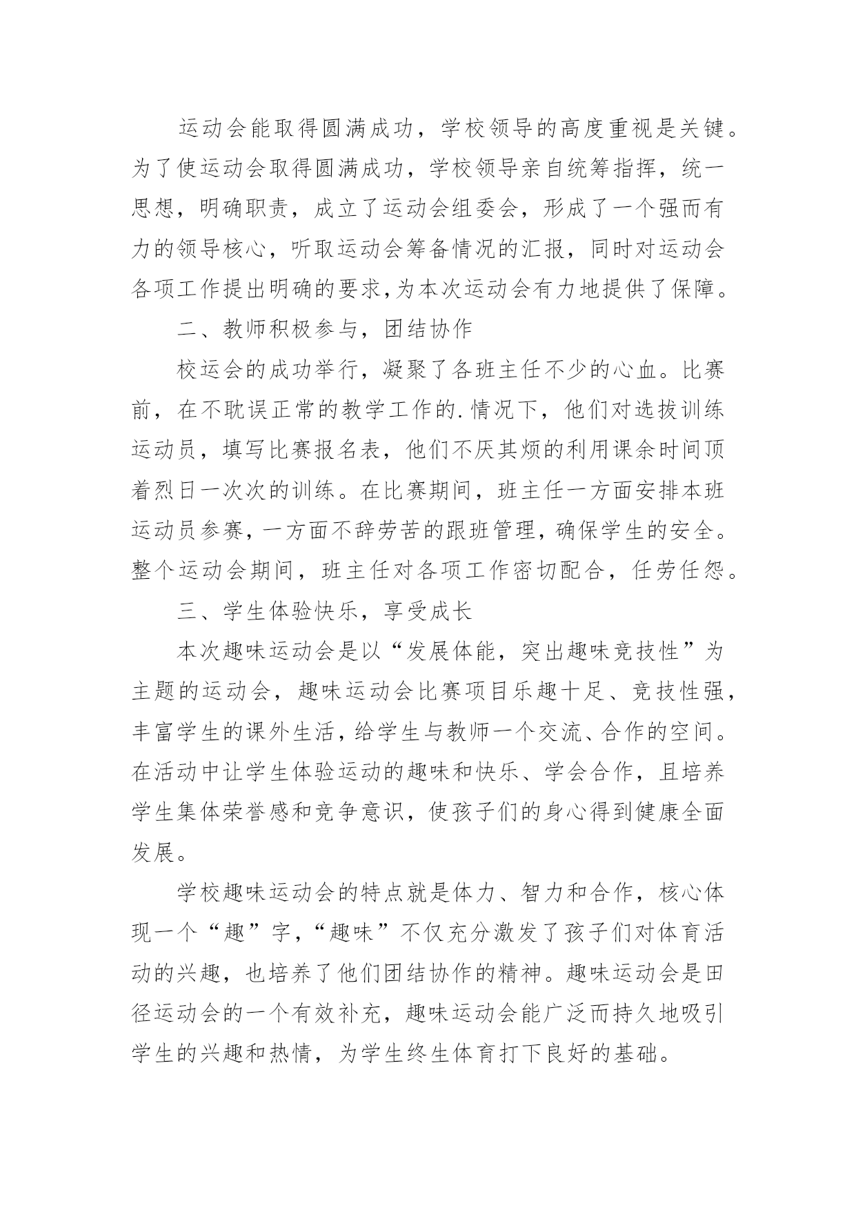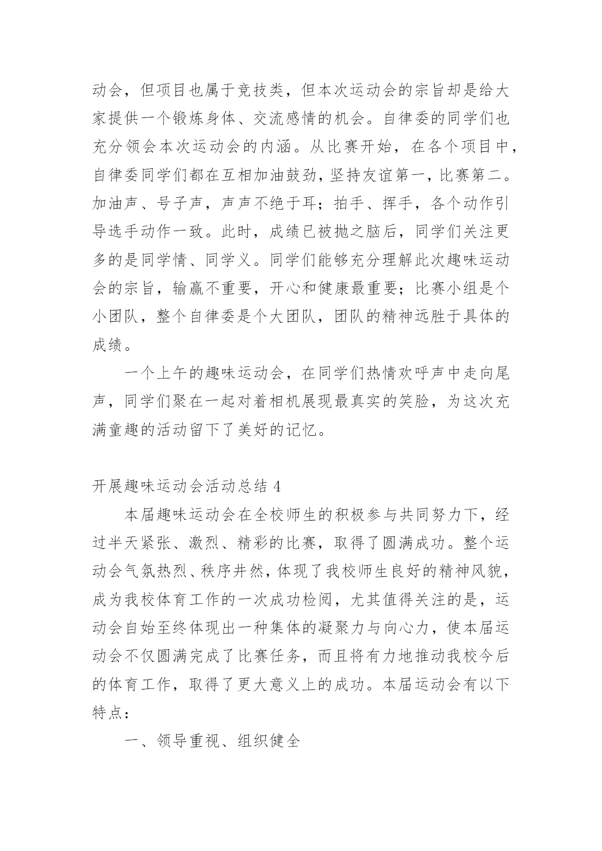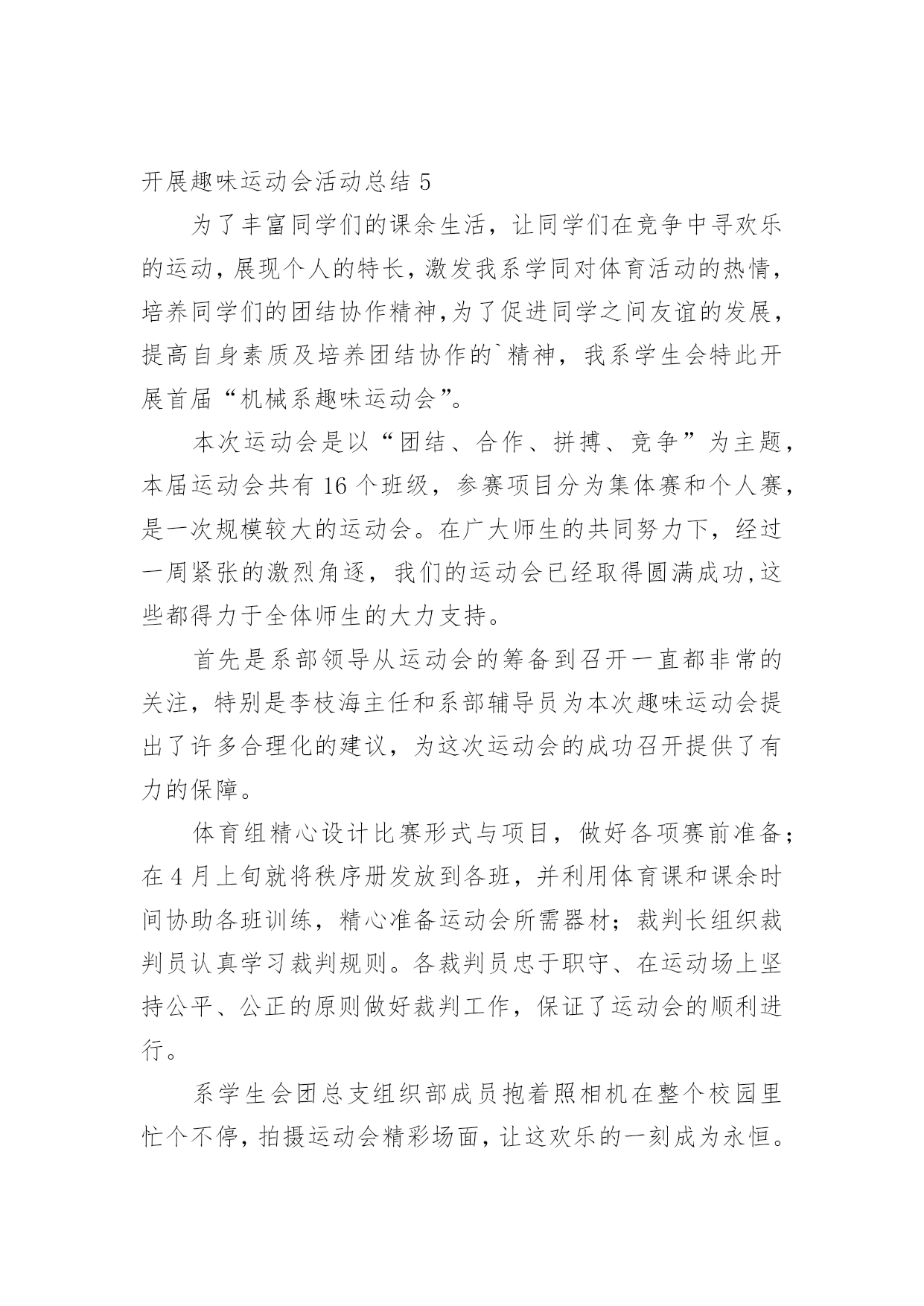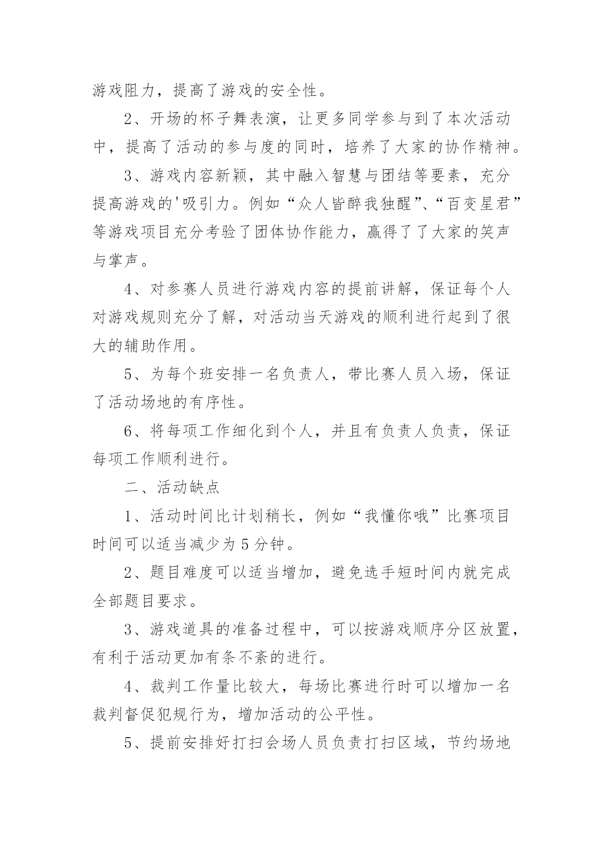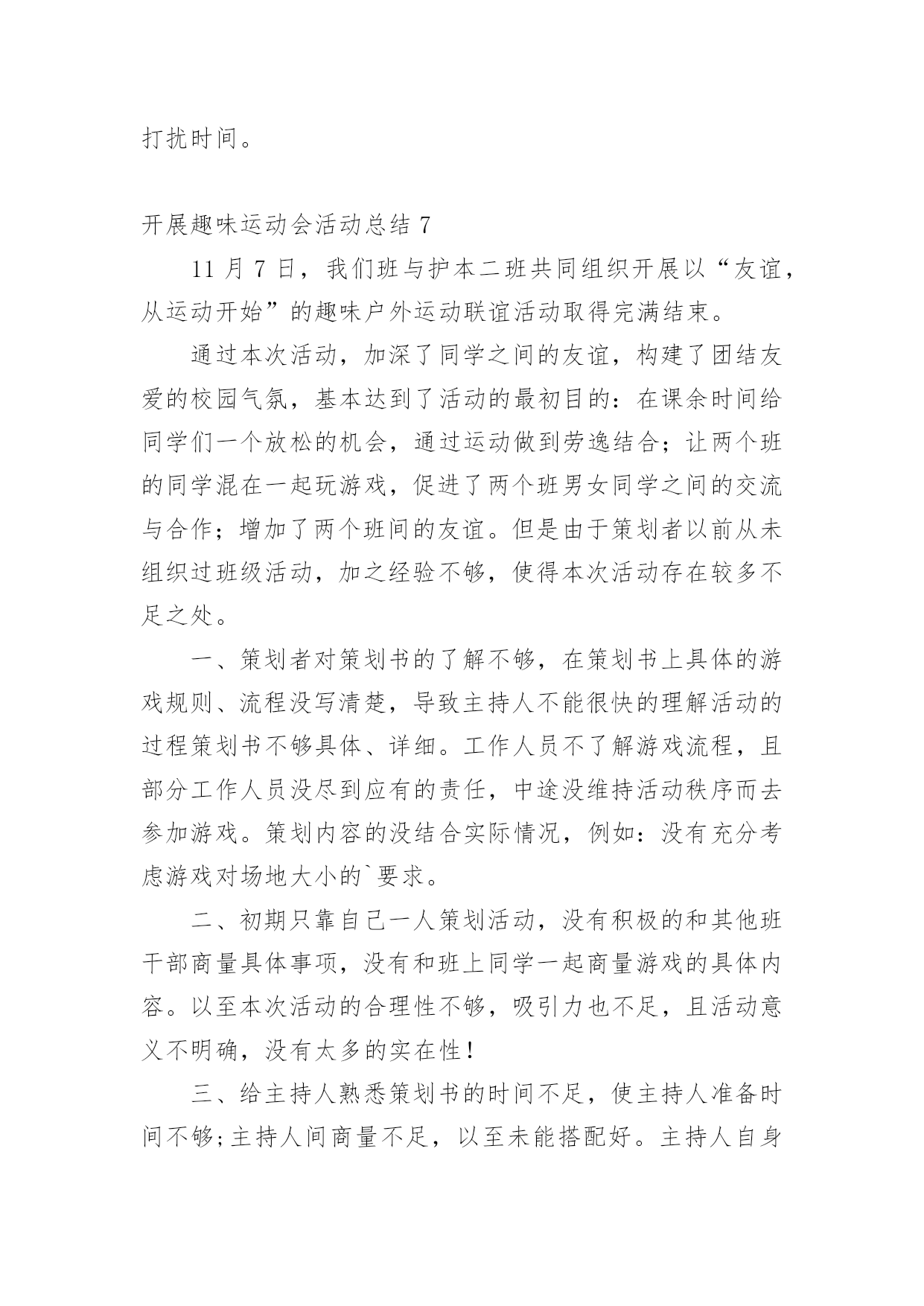 开展趣味运动会活动总结总结是对取得的成绩、存在的问题及得到的经验和教训等方面情况进行评价与描述的一种书面材料,它有助于我们寻找工作和事物发展的规律,从而掌握并运用这些规律,不妨让我们认真地完成总结吧。总结怎么写才不会千篇一律呢?以下是小编精心整理的开展趣味运动会活动总结,欢迎阅读与收藏。开展趣味运动会活动总结1筹备了近一个月的"亲子趣味运动会"在上周五终于成功拉下帷幕,本次运动会的口号是:我运动,我快乐,我锻炼,我提高,我最棒!我们本次运动会的目标是激发幼儿与家长对体育运动的热爱之情,增强体质,培养幼儿勇敢坚强的意志品质;其次,通过玩游戏增进幼儿与家长之间的情感交流。在本次运动会中,幼儿收获了快乐与成功,家长们收获了童贞,老师们也从中获得了成就感。本次活动是以孩子和家长为主体,主要体现了"运动快乐"这个主题,所以我们年级组在体育游戏设计上,都符合各班年龄层次及幼儿生理和心理特点,非常有趣味性。活动当天,幼儿与家长们都玩的很开心,让幼儿感觉到原来运动是如此的快乐。为了筹备这次运动会,老师们和孩子都十分辛苦。所以每天都努力练习,只为把孩子们和自已的一面展现给家长们。运动会当天,老师们都拿出的状态,与孩子和家长一起游戏。很好的向社会展示了我园的体育特色活动成果和我园教师的的良好风采。我们小班的游戏目标大多是锻炼幼儿的钻爬、投掷、蹦跳、平衡能力,在这些游戏中,家长与幼儿都积极配合,遵守规则,并牢记友谊第一比赛第二的原则,在会场上展现了自己的风采。此次运动会给了孩子们一个展示自我的`机会,孩子们在运动会中体会了竞争的意义,学会了坚持,学会了为别人喝彩。我们以后会组织更多类似的活动,给孩子们更多的锻炼和学习机会,相信在以后的活动中,我们还会收获更多,孩子们也会收获的更多。开展趣味运动会活动总结2开发区中心小学首次亲子趣味运动会终于拉下了帷幕,虽然活动已经结束,但运动会上那一场场精彩的画面、热闹的氛围仍然记忆犹新。在这次活动中,孩子收获了他们的成功;家长收获了他们的童贞;教师也从中获得了成就感。现对这次活动作如下总结:一、真正让孩子体验到了体育运动的快乐,增强了孩子与家长之间的'亲情和竞争意识,高质量完成了运动会的活动目标。活动中五颜六色的彩旗、欢快的音乐等本身就是给孩子带来一种视觉和听觉上的享受,让孩子感到原来运动如此快乐。活动中以年级为单位同时进行,趣味竞赛项目让孩子从小就有了竞争意识,孩子在同父母合作的过程也增进了与家长之间的亲情和合作能力。整个活动促进了孩子的全面发展。二、增强了家校联系,促进家长对我校工作的了解和支持。本次活动面向全体家长开放,家长既了解自己孩子在活动中的表现,又亲自参与了亲子游戏。活动中家长参与积极、配合默契,为活动的顺利开展提供了有力的保障。从活动中及活动后的反响来看,家长对本次活动的组织和安排都感到非常满意。三、向社会展示了我校趣味亲子活动特色及成果,展现了我校教师的良好风采及素质。我们提前一周将这次活动对家长进行了通知。活动前在校园内挂横幅、彩旗等,为运动会的开展营造了一个良好的氛围。活动当天,还邀请了家长参与观看,较好地向社会展示了我校特色活动成果和我园教师的风采。四、活动组织紧凑,策划成功。为了保证活动的顺利开展,在张校长的总指挥下,经过全体老师的共同努力,这些成员分工明确,各负其责。活动环节设计紧凑,场地安排合理,虽然场地较小,学生、家长、教师等一百多名,活动开展得非常顺利,得到了领导和家长们的一致好评。开展趣味运动会活动总结3此次趣味运动会举办之后,受益匪浅,从中学到很多东西,取得了意想不到的结果,同时也发觉出其中诸多的不足。趣味运动会开场即体现出趣味性,运动会以八个学习小组为单位进行比赛。初次共同举办这样较为大型的团体活动,在筹划的初期遇到了一些困难,没有经验是的障碍。后经过向学长和学姐请求帮助及大家的多次讨论,才得以使筹划走上正轨。但是随后仍出现了一个一个的问题。由于策划者的想法时常出现分歧,如在安排人员和资金问题上,并且在对游戏规则的安排上都有不统一的情况出现,使得整个策划过程花费时间长,值得欣慰的是,最后经过共同不懈的努力,敲定时间,开展了此次的活动,整个活动期间较为顺利,但仍存在不尽如人意之处,由于是分块开展,出现了场面的小混乱。这是组织者(策划者)的工作失误,没有把可能发生的各种情况分析到位而产生出的问题。当然,这整个过程中也有其较好之处。善于沟通,是达成最终共识的首要保障。筹划过程中,策划者多次将各部同学的建议收集整理,经过整合,并且进行较缜密地安排,反复进行了修改。与此同时,更重要的.是得到了大家的大力支持以及积极地提出意见,建议和最后的参与。在活动进行时,达到了活动举办时的初衷,加强了部门的凝聚力,提高同学参与活动的积极性,增进了各部门之间的交流。总而言之,在整个活动的策划和进