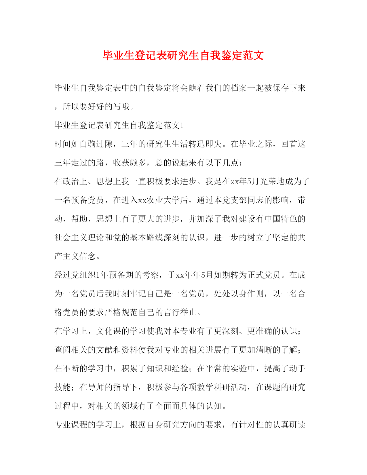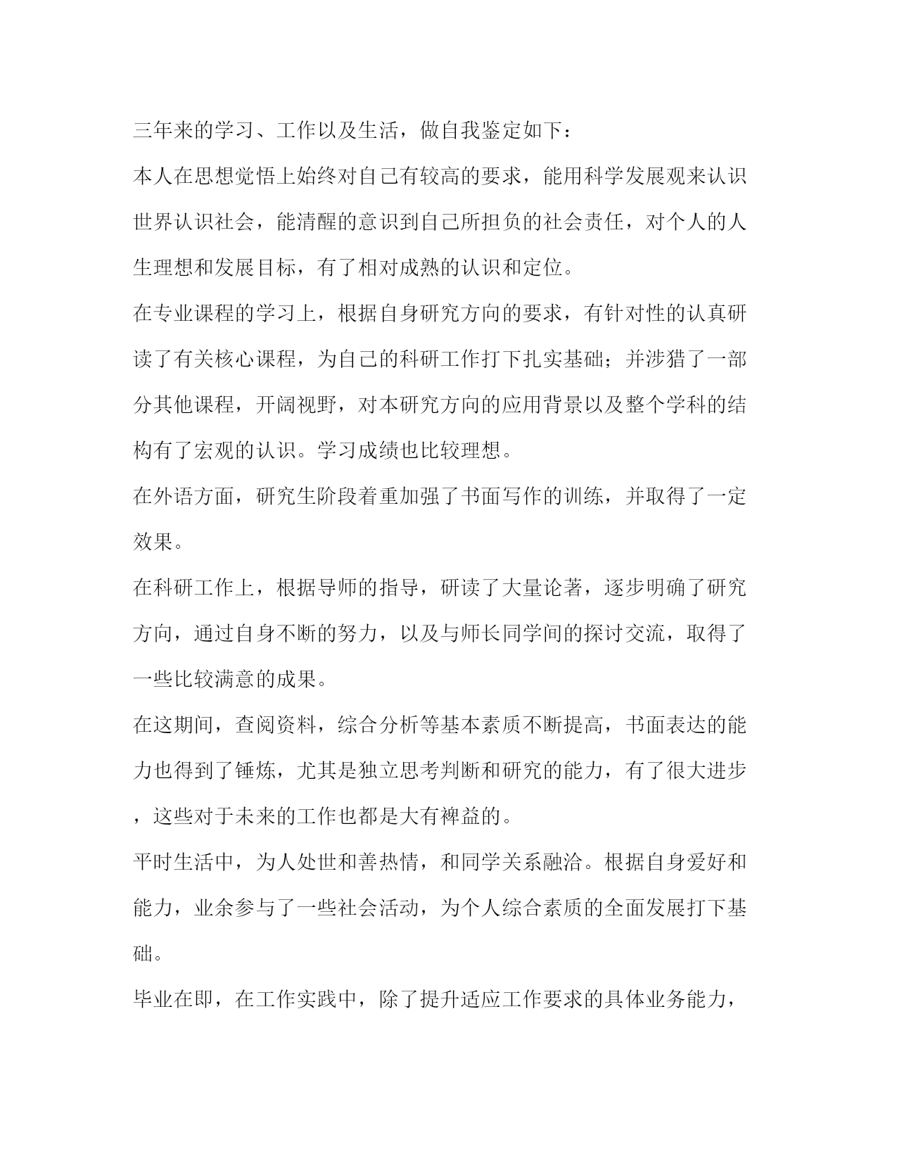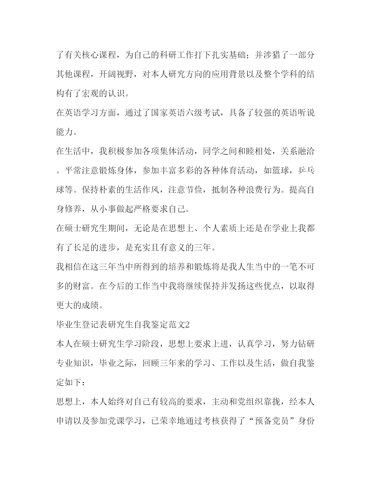 PAGE此资料由网络收集而来,如有侵权请告知上传者立即删除。资料共分享,我们负责传递知识。毕业生登记表研究生自我鉴定范文毕业生自我鉴定表中的自我鉴定将会随着我们的档案一起被保存下来,所以要好好的写哦。毕业生登记表研究生自我鉴定范文1时间如白驹过隙,三年的研究生生活转迅即失。在毕业之际,回首这三年走过的路,收获颇多,总的说起来有以下几点:在政治上、思想上我一直积极要求进步。我是在xx年5月光荣地成为了一名预备党员,在进入xx农业大学后,通过本党支部同志的影响,带动,帮助,思想上有了更大的进步,并加深了我对建设有中国特色的社会主义理论和党的基本路线深刻的认识,进一步的树立了坚定的共产主义信念。经过党组织1年预备期的考察,于xx年年5月如期转为正式党员。在成为一名党员后我时刻牢记自己是一名党员,处处以身作则,以一名合格党员的要求严格规范自己的言行举止。在学习上,文化课的学习使我对本专业有了更深刻、更准确的认识;查阅相关的文献和资料使我对专业的相关进展有了更加清晰的了解;在不断的学习中,积累了知识和经验;在平常的实验中,提高了动手技能;在导师的指导下,积极参与各项教学科研活动,在课题的研究过程中,对相关的领域有了全面而具体的认知。专业课程的学习上,根据自身研究方向的要求,有针对性的认真研读了有关核心课程,为自己的科研工作打下扎实基础;并涉猎了一部分其他课程,开阔视野,对本人研究方向的应用背景以及整个学科的结构有了宏观的认识。在英语学习方面,通过了国家英语六级考试,具备了较强的英语听说能力。在生活中,我积极参加各项集体活动,同学之间和睦相处,关系融洽。平常注意锻炼身体,参加丰富多彩的各种体育活动,如篮球,乒乓球等。保持朴素的生活作风,注意节俭,抵制各种浪费行为。提高自身修养,从小事做起严格要求自己。在硕士研究生期间,无论是在思想上、个人素质上还是在学业上我都有了长足的进步,是充实且有意义的三年。我相信在这三年当中所得到的培养和锻炼将是我人生当中的一笔不可多的财富。在今后的工作当中我将继续保持并发扬这些优点,以取得更大的成绩。毕业生登记表研究生自我鉴定范文2本人在硕士研究生学习阶段,思想上要求上进,认真学习,努力钻研专业知识,毕业之际,回顾三年来的学习、工作以及生活,做自我鉴定如下:思想上,本人始终对自己有较高的要求,主动和党组织靠拢,经本人申请以及参加党课学习,已荣幸地通过考核获得了“预备党员”身份资格,能用科学发展观来认识世界认识社会,能清醒的意识到自己所担负的社会责任,对个人的人生理想和发展目标,有了相对成熟的认识和定位。学习上,我是抱着谦虚谨慎、求真求实的态度去钻研课题的。在导师的指导下,参与了一个科研项目并发表了学术论文一篇,使自己的理论知识与实践水平得到了进一步的增强和提高。在此过程当中,渐渐发现自己还有许多东西需要去学、去领悟,其实这本身也是一个自我提升的过程。我的理论水平、动手实践能力都随着课题研究的不断深入而得到了提高,同时我也学会了如何去分析问题、怎样采取最佳的手段去解决问题。本人在研究生阶段所获颇丰,从学业、科研工作,到个人素质,都得到了充分的培养和锻炼,是充实且有意义的三年。相信这些经历和积累都将成为本人人生道路上的宝贵财富。在以后的工作和学习中,本人将继续保持并发扬严谨治学的作风,兢兢业业,争取取得更大的成绩。毕业生登记表研究生自我鉴定范文3自20xx年北上至此求学,三年的时光转瞬即逝。辗转反侧感受良多。思想上本人一如既往的维护国家领土和主权完整,积极拥护党的正确领导。刚入学的时候,我没能及时从大学毕业的盲从与忧伤中开解出来,思想上对自身把握出现了一定程度的懈怠,顿时错乱异常。后来,随着硕士课程的一步步完成,逐渐认识到自身存在的不足并即时做了改正,取得了阶段性进步。这对我今后的进一步自我完善点燃了原动力。学习上本人取得了较大的自我突破。入学的时候学习态度不够端正,求学目的转念迷茫起来。随后,在指导教师xx教授的殷切教诲和悉心指导下,我的求学之路逐渐转入正轨,不仅按时并较好的完成了专业课的学习,而且在顺利下室之后,对课题内容与实验进度等方面也开始更好的把握。课题伊始阶段,实验开展的很不顺利。测试方法迟迟不能落实让我倍感焦虑,几乎想要放弃自己。在最必要最及时的关头,xx教授一次次不厌其烦的用倾注大量心血的谆谆教诲将我点醒,使我不失方向乃至最后自我掌舵。在人生这艘航船上,老师诲人不倦的高尚师德令我深刻铭记受用终生。眼下即将毕业,可面对日益严峻的就业形势我仍去留未定。如你所知留京的困难程度已然空前,可在我看来,这里一直以来就是座可爱的城市。我要留下来,而且必须留下来。我有信心。最后,感谢在xx总院的这三年。深鞠躬,礼毕。转身离开。毕业生登记表研究生自我