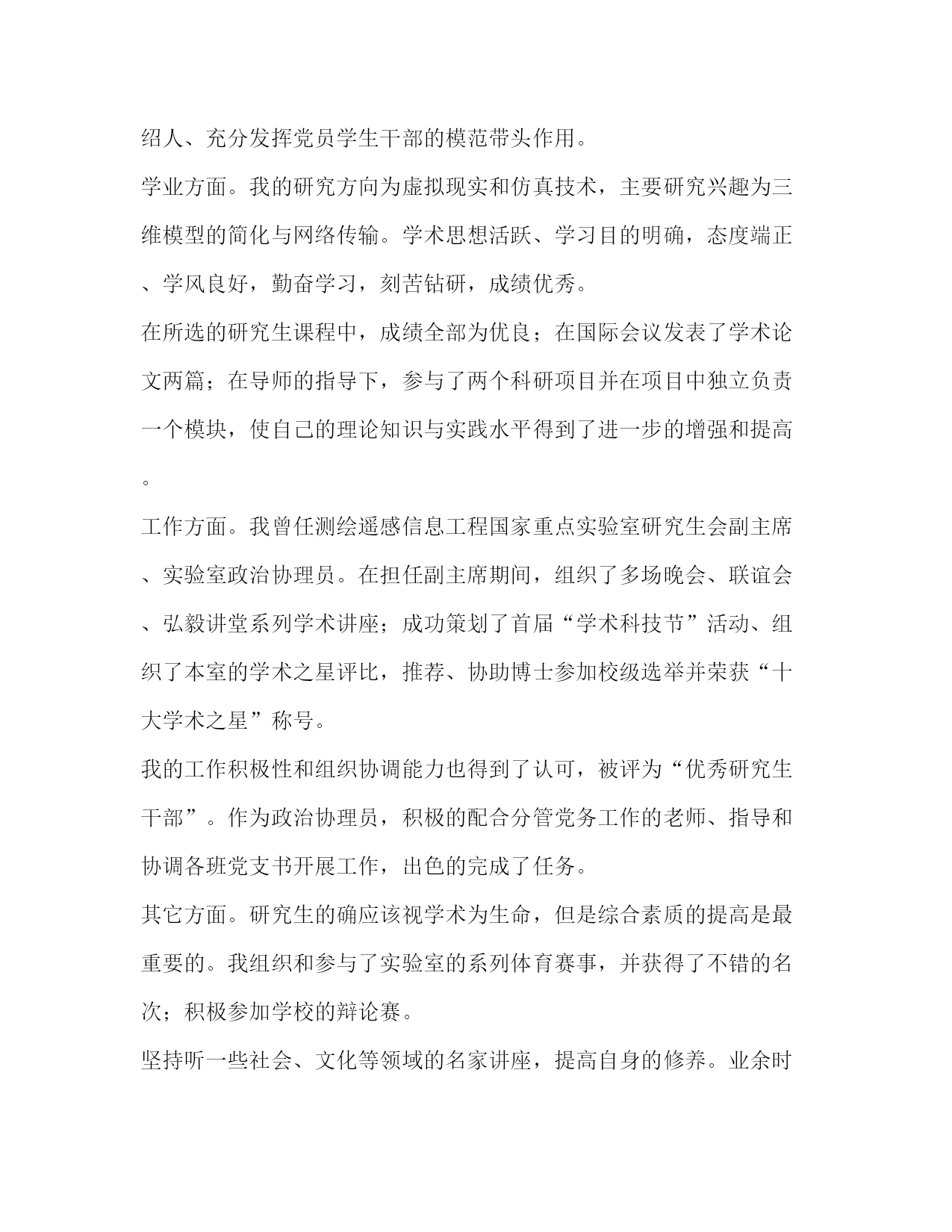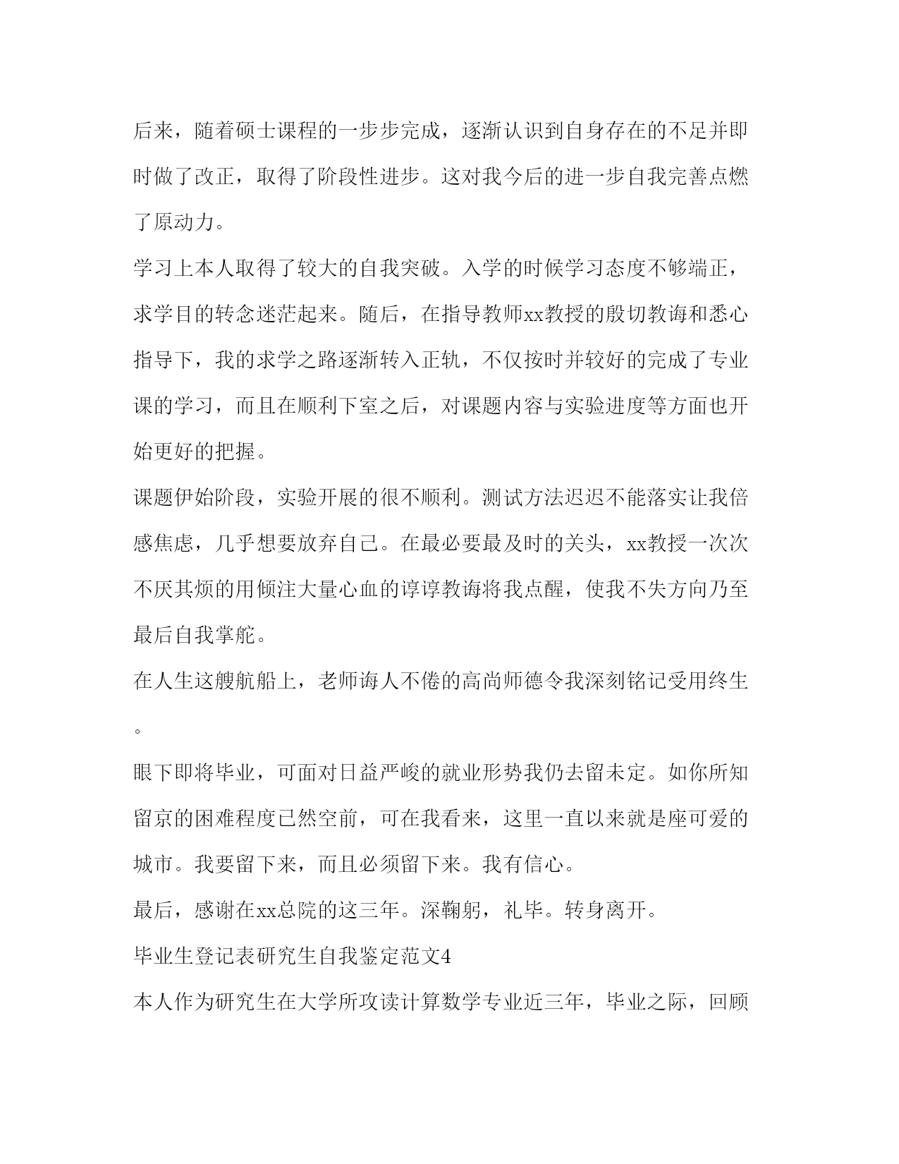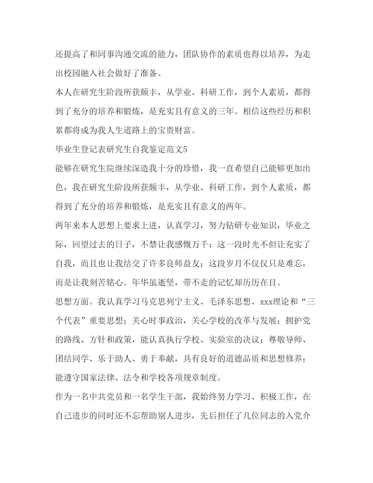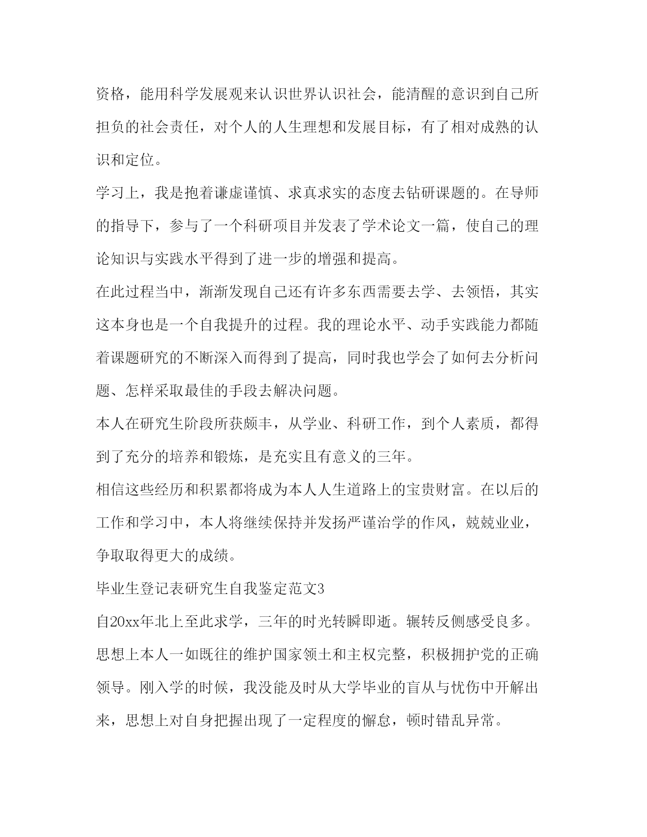 PAGE此资料由网络收集而来,如有侵权请告知上传者立即删除。资料共分享,我们负责传递知识。毕业生登记表研究生自我鉴定范文毕业生自我鉴定表中的自我鉴定将会随着我们的档案一起被保存下来,所以要好好的写哦。毕业生登记表研究生自我鉴定范文1时间如白驹过隙,三年的研究生生活转迅即失。在毕业之际,回首这三年走过的路,收获颇多,总的说起来有以下几点:在政治上、思想上我一直积极要求进步。我是在xx年5月光荣地成为了一名预备党员,在进入xx农业大学后,通过本党支部同志的影响,带动,帮助,思想上有了更大的进步,并加深了我对建设有中国特色的社会主义理论和党的基本路线深刻的认识,进一步的树立了坚定的共产主义信念。经过党组织1年预备期的考察,于xx年年5月如期转为正式党员。在成为一名党员后我时刻牢记自己是一名党员,处处以身作则,以一名合格党员的要求严格规范自己的言行举止。在学习上,文化课的学习使我对本专业有了更深刻、更准确的认识;查阅相关的文献和资料使我对专业的相关进展有了更加清晰的了解;在不断的学习中,积累了知识和经验;在平常的实验中,提高了动手技能;在导师的指导下,积极参与各项教学科研活动,在课题的研究过程中,对相关的领域有了全面而具体的认知。专业课程的学习上,根据自身研究方向的要求,有针对性的认真研读了有关核心课程,为自己的科研工作打下扎实基础;并涉猎了一部分其他课程,开阔视野,对本人研究方向的应用背景以及整个学科的结构有了宏观的认识。在英语学习方面,通过了国家英语六级考试,具备了较强的英语听说能力。在生活中,我积极参加各项集体活动,同学之间和睦相处,关系融洽。平常注意锻炼身体,参加丰富多彩的各种体育活动,如篮球,乒乓球等。保持朴素的生活作风,注意节俭,抵制各种浪费行为。提高自身修养,从小事做起严格要求自己。在硕士研究生期间,无论是在思想上、个人素质上还是在学业上我都有了长足的进步,是充实且有意义的三年。我相信在这三年当中所得到的培养和锻炼将是我人生当中的一笔不可多的财富。在今后的工作当中我将继续保持并发扬这些优点,以取得更大的成绩。毕业生登记表研究生自我鉴定范文2本人在硕士研究生学习阶段,思想上要求上进,认真学习,努力钻研专业知识,毕业之际,回顾三年来的学习、工作以及生活,做自我鉴定如下:思想上,本人始终对自己有较高的要求,主动和党组织靠拢,经本人申请以及参加党课学习,已荣幸地通过考核获得了“预备党员”身份资格,能用科学发展观来认识世界认识社会,能清醒的意识到自己所担负的社会责任,对个人的人生理想和发展目标,有了相对成熟的认识和定位。学习上,我是抱着谦虚谨慎、求真求实的态度去钻研课题的。在导师的指导下,参与了一个科研项目并发表了学术论文一篇,使自己的理论知识与实践水平得到了进一步的增强和提高。在此过程当中,渐渐发现自己还有许多东西需要去学、去领悟,其实这本身也是一个自我提升的过程。我的理论水平、动手实践能力都随着课题研究的不断深入而得到了提高,同时我也学会了如何去分析问题、怎样采取最佳的手段去解决问题。本人在研究生阶段所获颇丰,从学业、科研工作,到个人素质,都得到了充分的培养和锻炼,是充实且有意义的三年。相信这些经历和积累都将成为本人人生道路上的宝贵财富。在以后的工作和学习中,本人将继续保持并发扬严谨治学的作风,兢兢业业,争取取得更大的成绩。毕业生登记表研究生自我鉴定范文3自20xx年北上至此求学,三年的时光转瞬即逝。辗转反侧感受良多。思想上本人一如既往的维护国家领土和主权完整,积极拥护党的正确领导。刚入学的时候,我没能及时从大学毕业的盲从与忧伤中开解出来,思想上对自身把握出现了一定程度的懈怠,顿时错乱异常。后来,随着硕士课程的一步步完成,逐渐认识到自身存在的不足并即时做了改正,取得了阶段性进步。这对我今后的进一步自我完善点燃了原动力。学习上本人取得了较大的自我突破。入学的时候学习态度不够端正,求学目的转念迷茫起来。随后,在指导教师xx教授的殷切教诲和悉心指导下,我的求学之路逐渐转入正轨,不仅按时并较好的完成了专业课的学习,而且在顺利下室之后,对课题内容与实验进度等方面也开始更好的把握。课题伊始阶段,实验开展的很不顺利。测试方法迟迟不能落实让我倍感焦虑,几乎想要放弃自己。在最必要最及时的关头,xx教授一次次不厌其烦的用倾注大量心血的谆谆教诲将我点醒,使我不失方向乃至最后自我掌舵。在人生这艘航船上,老师诲人不倦的高尚师德令我深刻铭记受用终生。眼下即将毕业,可面对日益严峻的就业形势我仍去留未定。如你所知留京的困难程度已然空前,可在我看来,这里一直以来就是座可爱的城市。我要留下来,而且必须留下来。我有信心。最后,感谢在xx总院的这三年。深鞠躬,礼毕。转身离开。毕业生登记表研究生自我