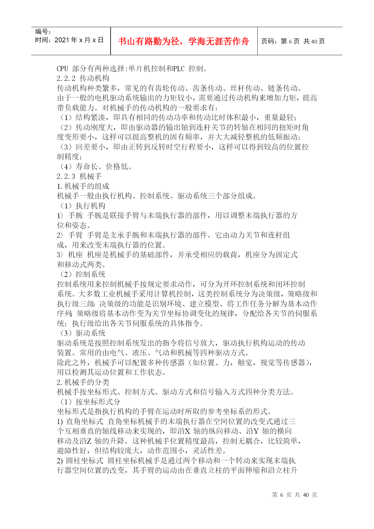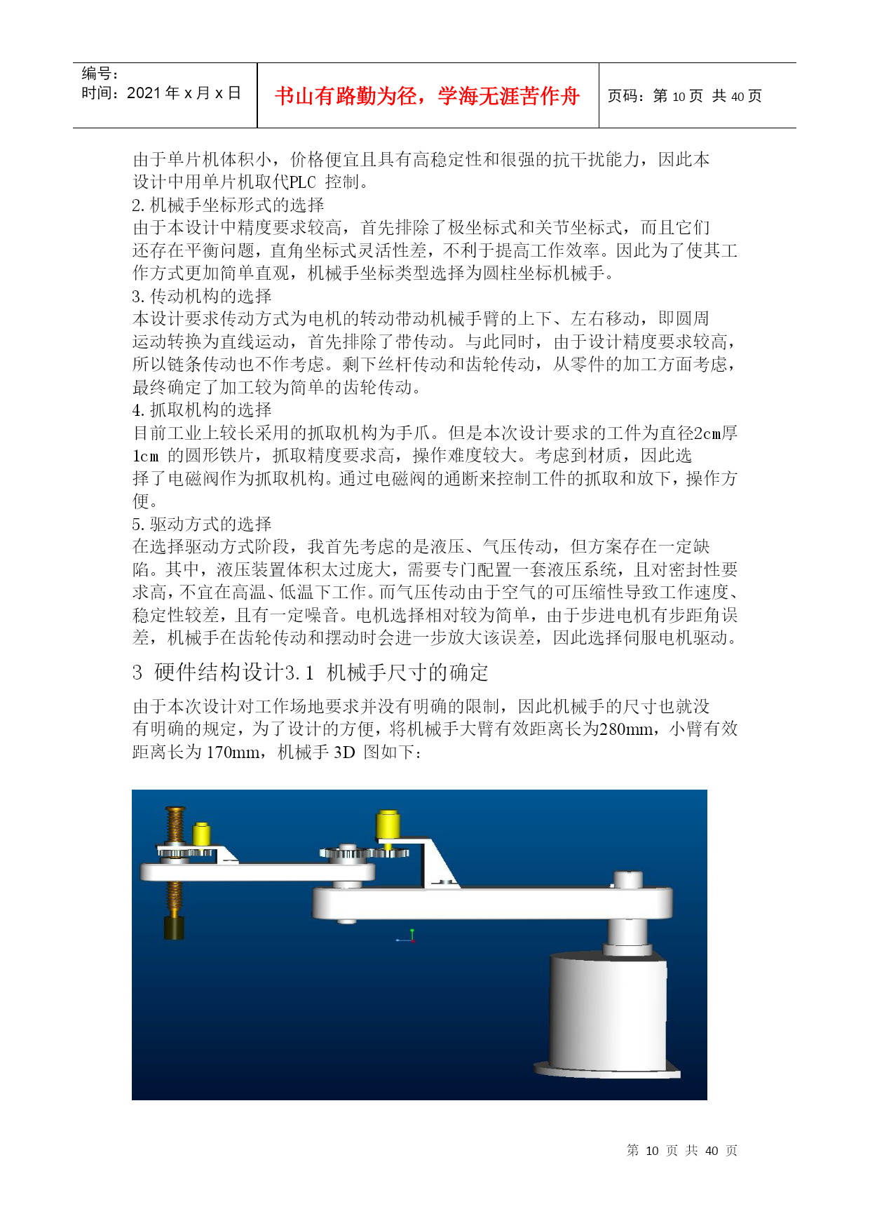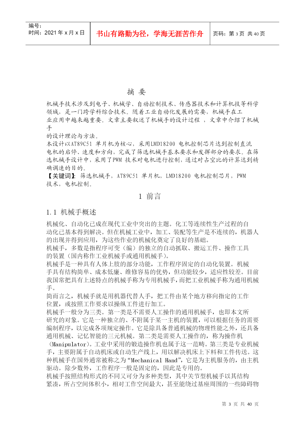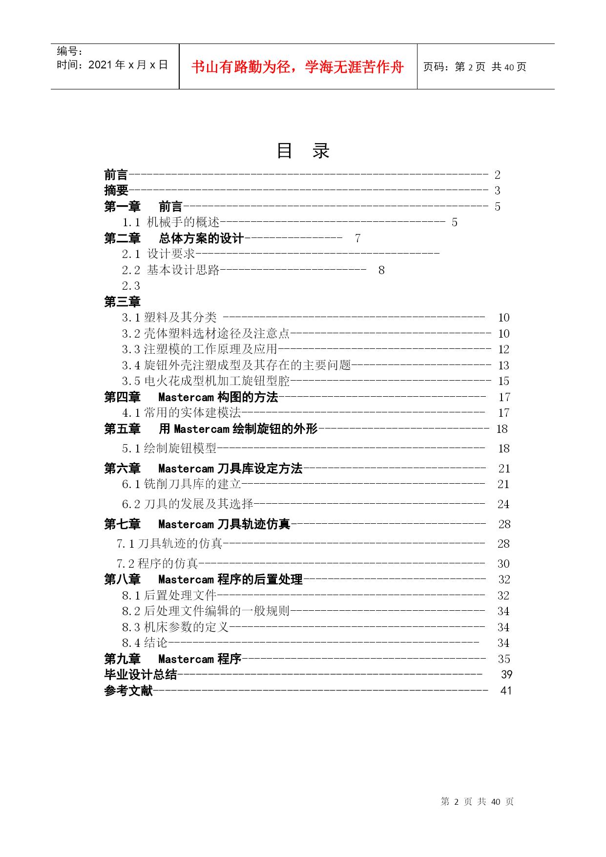 编号:时间:2021年x月x日书山有路勤为径,学海无涯苦作舟页码:第PAGE40页共NUMPAGES40页第PAGE\*MERGEFORMAT40页共NUMPAGES\*MERGEFORMAT40页江苏城市职业学院毕业论文课题名称姓名学号专业班级指导老师2011年月目录前言-----------------------------------------------------------2摘要-----------------------------------------------------------3前言--------------------------------------------------51.1机械手的概述-------------------------------------5第二章总体方案的设计----------------72.1设计要求----------------------------------------2.2基本设计思路------------------------82.3第三章3.1塑料及其分类-------------------------------------------103.2壳体塑料选材途径及注意点---------------------------------103.3注塑模的工作原理及应用-----------------------------------123.4旋钮外壳注塑成型及其存在的主要问题-----------------------133.5电火花成型机加工旋钮型腔---------------------------------15第四章Mastercam构图的方法----------------------------------174.1常用的实体建模法----------------------------------------17第五章用Mastercam绘制旋钮的外形----------------------------185.1绘制旋钮模型--------------------------------------------18第六章Mastercam刀具库设定方法------------------------------216.1铣削刀具库的建立----------------------------------------216.2刀具的发展及其选择--------------------------------------24第七章Mastercam刀具轨迹仿真--------------------------------287.1刀具轨迹的仿真-------------------------------------------287.2程序的仿真-----------------------------------------------30第八章Mastercam程序的后置处理------------------------------328.1后置处理文件--------------------------------------------328.2后处理文件编辑的一般规则--------------------------------348.3机床参数的定义------------------------------------------348.4结论---------------------------------------------------34第九章Mastercam程序----------------------------------------35毕业设计总结--------------------------------------------------39参考文献-------------------------------------------------------41摘要机械手技术涉及到电子、机械学、自动控制技术、传感器技术和计算机技等科学领域,是一门跨学科综合技术。随着工业自动化发展的需要,机械手在工业应用中越来越重要。文章主要叙述了机械手的设计过程,文章中介绍了机械手的设计理论与方法。本设计以AT89C51单片机为核心,采用LMD18200电机控制芯片达到控制直流电机的启停、速度和方向,完成了筛选机械手基本要求和发挥部分的要求。在筛选机械手设计中,采用了PWM技术对电机进行控制,通过对占空比的计算达到精