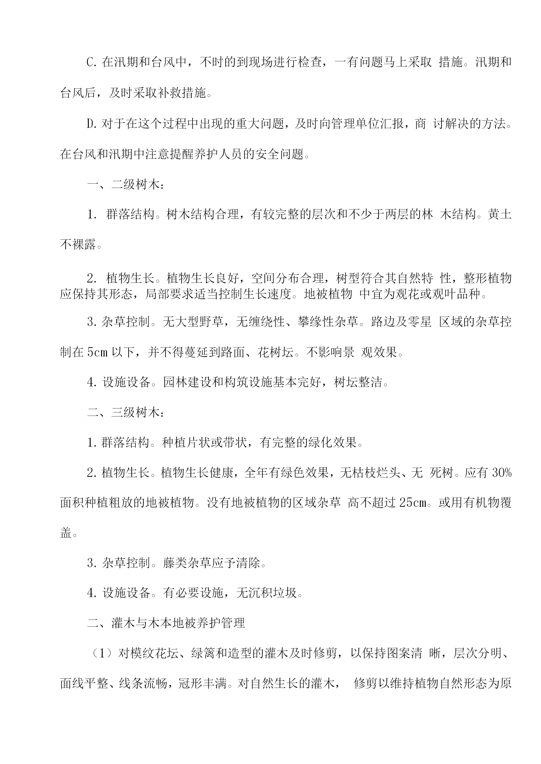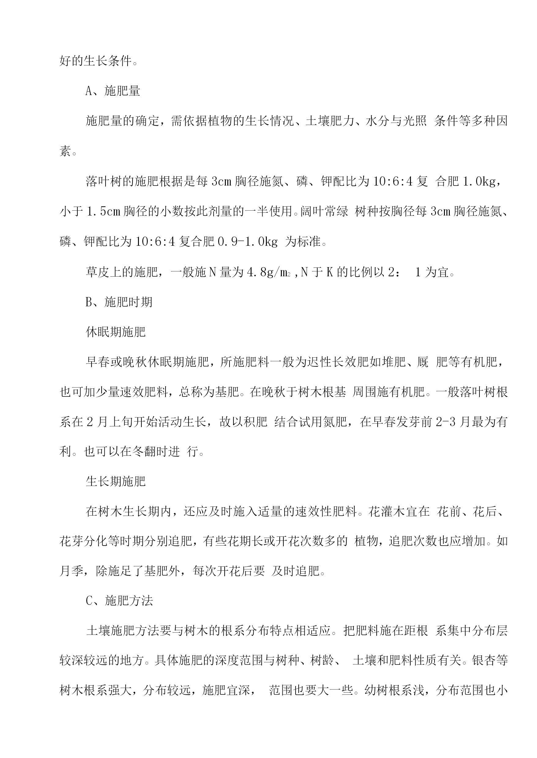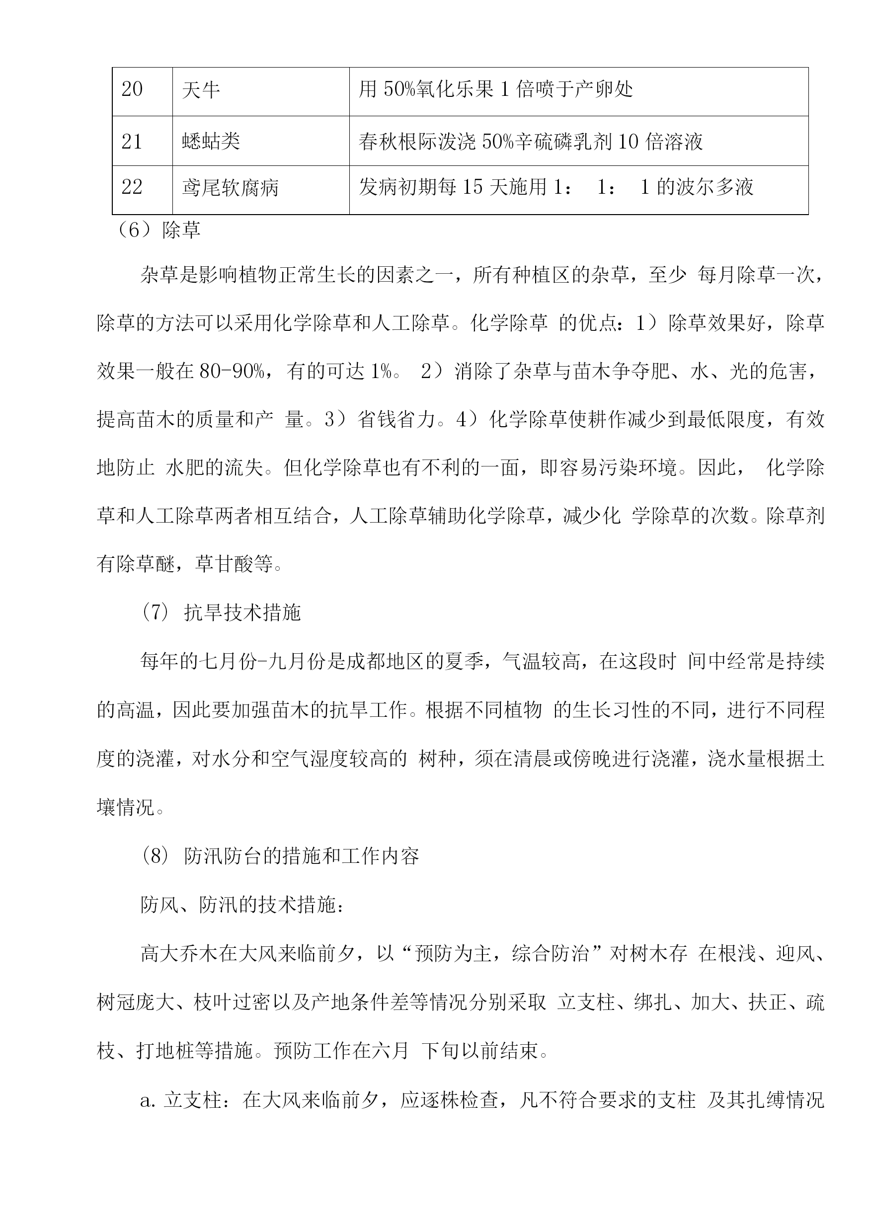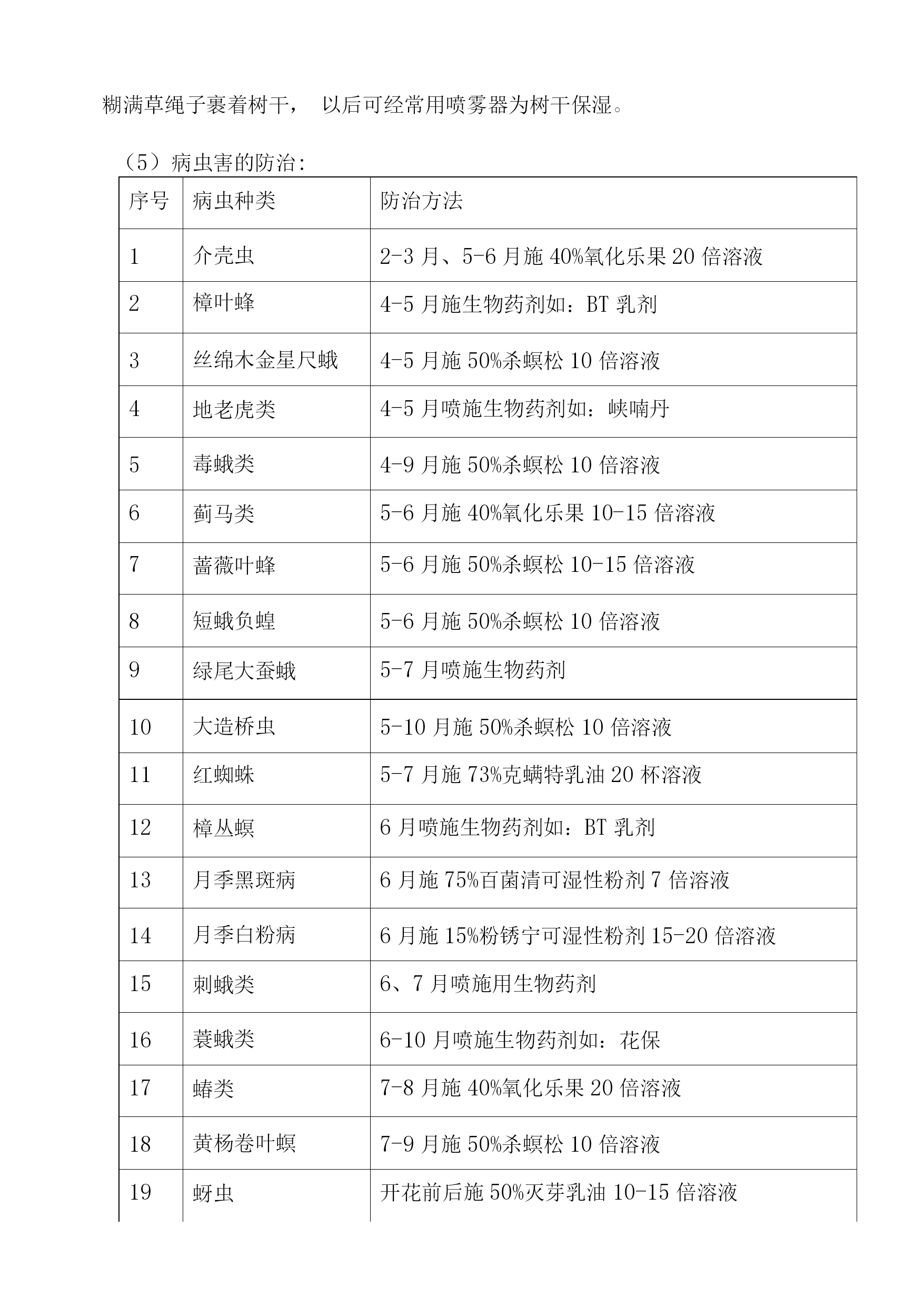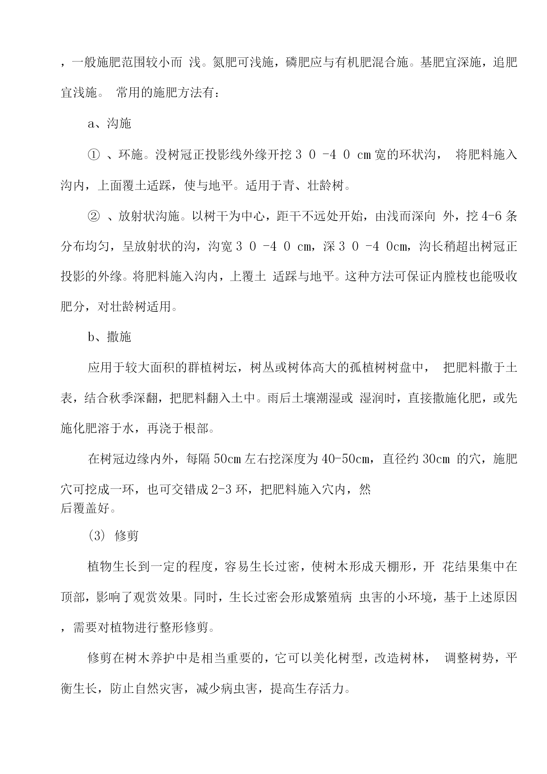 公园景区绿化养护方案一、树木养护管理土壤管理A、土壤改良土壤的改良方法有深耕熟化、客土改良、培土与掺沙、施有机肥等。a、深翻熟化翻土结合施肥,可改善土壤结构和理化性质,促使土壤团粒结构的形成,增加空隙度。深翻的时间一般以冬初为宜,这时伤易愈合,易发出新根,经过冬季有利于土壤风化、积雪保墒。早春土壤化冻后应及时进行深翻。翻土的深度:粘重土壤翻的较深沙质土壤适当浅耕,地下水位高时宜浅,深层为砾石,也应深翻,并捡出砾石并换好土。深度一般为5——10cm,最好距根系分布层较深,稍远些。深翻应结合施肥,灌溉同时进行。深翻后的土壤状况加以处理,通常维持原来的层次不变,就地耕松后掺合有机肥,再将新土放在下部,表土放在表层。B、土壤管理措施a、松土透气,控制杂草。时间在天气晴朗时,或初晴以后,要选土壤不过干或不过湿时进行。松土除草时不可碰伤树皮,每年松土除草2-3次,大苗松土深度为6-9cm,小苗松土深度为3cm。b、树木、灌木下若出现裸露的土壤,既会影响植物的生长又会破坪景观,可于春季利用已有生长繁茂的地被植物进行分株栽植。追肥施肥可供给植物生长发育所需营养素,并不断改善土壤理化性状,为植物创造良好的生长条件。A、施肥量施肥量的确定,需依据植物的生长情况、土壤肥力、水分与光照条件等多种因素。落叶树的施肥根据是每3cm胸径施氮、磷、钾配比为10:6:4复合肥1.0kg,小于1.5cm胸径的小数按此剂量的一半使用。阔叶常绿树种按胸径每3cm胸径施氮、磷、钾配比为10:6:4复合肥0.9-1.0kg为标准。草皮上的施肥,一般施N量为4.8g/m2,N于K的比例以2:1为宜。B、施肥时期休眠期施肥早春或晚秋休眠期施肥,所施肥料一般为迟性长效肥如堆肥、厩肥等有机肥,也可加少量速效肥料,总称为基肥。在晚秋于树木根基周围施有机肥。一般落叶树根系在2月上旬开始活动生长,故以积肥结合试用氮肥,在早春发芽前2-3月最为有利。也可以在冬翻时进行。生长期施肥在树木生长期内,还应及时施入适量的速效性肥料。花灌木宜在花前、花后、花芽分化等时期分别追肥,有些花期长或开花次数多的植物,追肥次数也应增加。如月季,除施足了基肥外,每次开花后要及时追肥。C、施肥方法土壤施肥方法要与树木的根系分布特点相适应。把肥料施在距根系集中分布层较深较远的地方。具体施肥的深度范围与树种、树龄、土壤和肥料性质有关。银杏等树木根系强大,分布较远,施肥宜深,范围也要大一些。幼树根系浅,分布范围也小,一般施肥范围较小而浅。氮肥可浅施,磷肥应与有机肥混合施。基肥宜深施,追肥宜浅施。常用的施肥方法有:a、沟施、环施。没树冠正投影线外缘开挖30-40cm宽的环状沟,将肥料施入沟内,上面覆土适踩,使与地平。适用于青、壮龄树。、放射状沟施。以树干为中心,距干不远处开始,由浅而深向外,挖4-6条分布均匀,呈放射状的沟,沟宽30-40cm,深30-40cm,沟长稍超出树冠正投影的外缘。将肥料施入沟内,上覆土适踩与地平。这种方法可保证内膛枝也能吸收肥分,对壮龄树适用。b、撒施应用于较大面积的群植树坛,树丛或树体高大的孤植树树盘中,把肥料撒于土表,结合秋季深翻,把肥料翻入土中。雨后土壤潮湿或湿润时,直接撒施化肥,或先施化肥溶于水,再浇于根部。在树冠边缘内外,每隔50cm左右挖深度为40-50cm,直径约30cm的穴,施肥穴可挖成一环,也可交错成2-3环,把肥料施入穴内,然后覆盖好。修剪植物生长到一定的程度,容易生长过密,使树木形成天棚形,开花结果集中在顶部,影响了观赏效果。同时,生长过密会形成繁殖病虫害的小环境,基于上述原因,需要对植物进行整形修剪。修剪在树木养护中是相当重要的,它可以美化树型,改造树林,调整树势,平衡生长,防止自然灾害,减少病虫害,提高生存活力。整形修剪的原则:根据树木在绿化中的不同用途。根据树龄成年树,修剪重;幼年树,修剪轻。根据生物的特性,要顺其自然。根据具体的工程环境进行修剪。修剪的时间可以有两种,一种是在落叶后期萌芽前,即休眠期修剪。另一种是萌芽后落叶前,即生长期间的修剪,树木进入休眠后至第二年萌芽前进形修剪,称为休眠期修剪。落叶树大多在冬季和早春进行修剪,常绿树宜在晚春进行修剪。生长期修剪是指树木萌芽后至新梢停止生长前这段时间进行的修剪,在这个时期对树木进行除芽、摘心、捻梢、摘叶、摘蕾等工作。同时修剪时应对所有种类植物全面进行,根据树木具体的应用情况进行合理的修剪。如对主要树种的修剪,除对落叶树进行美观性动机重修剪外,对常绿树进行疏枝叶即可,这样可以减少对景观的影响。大树养护:对于大树必须进行特别精心地养护工作,我方将采取下列措施:A、支撑树干:大树特别容易歪倒,要设立支架,把树牢固地支撑起来,确保大树不会歪斜