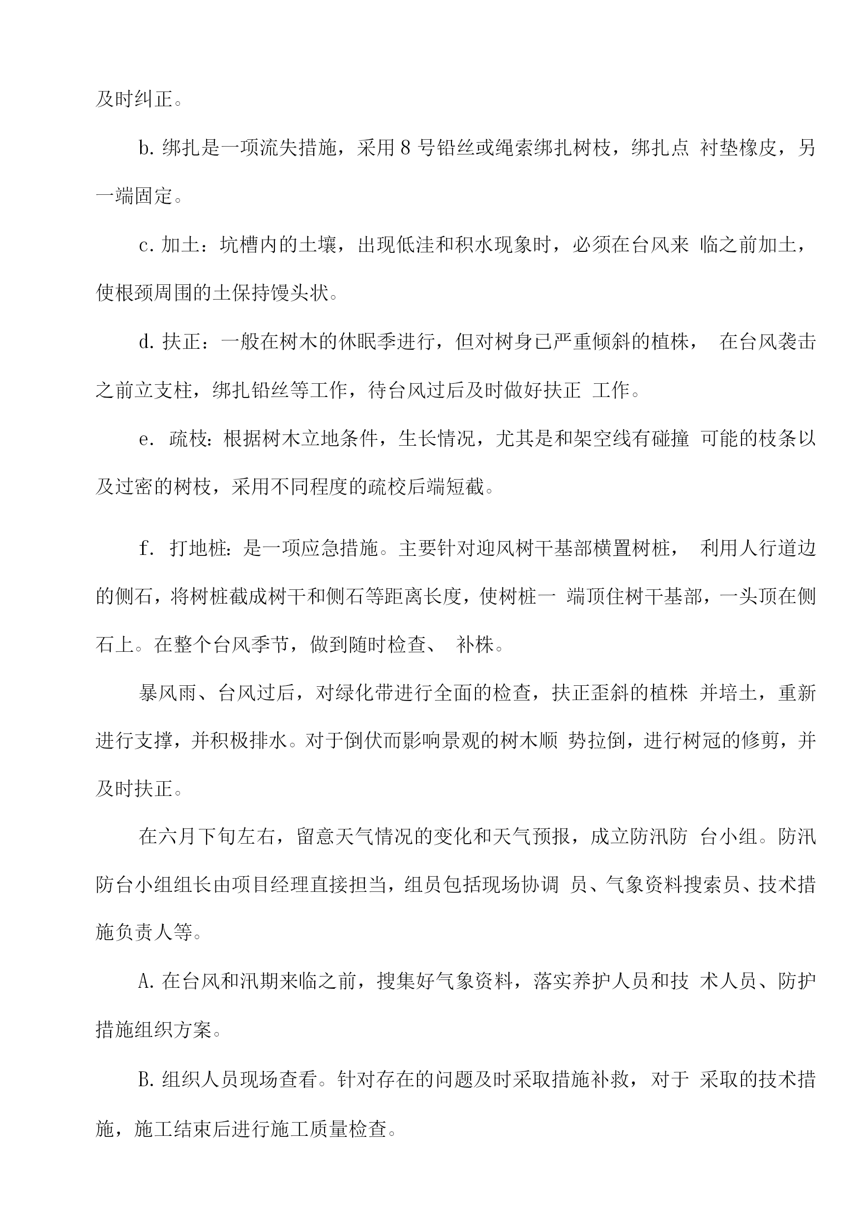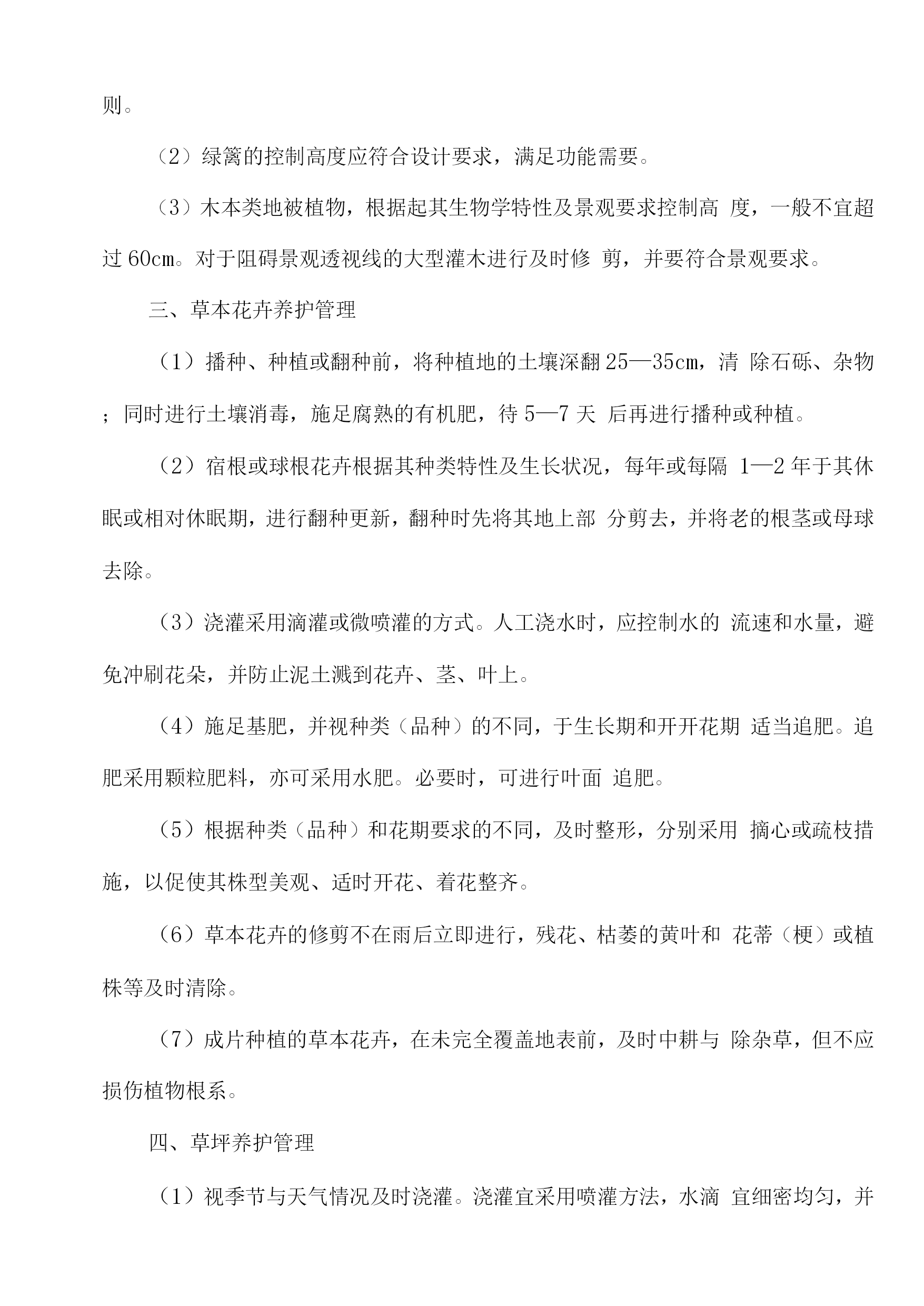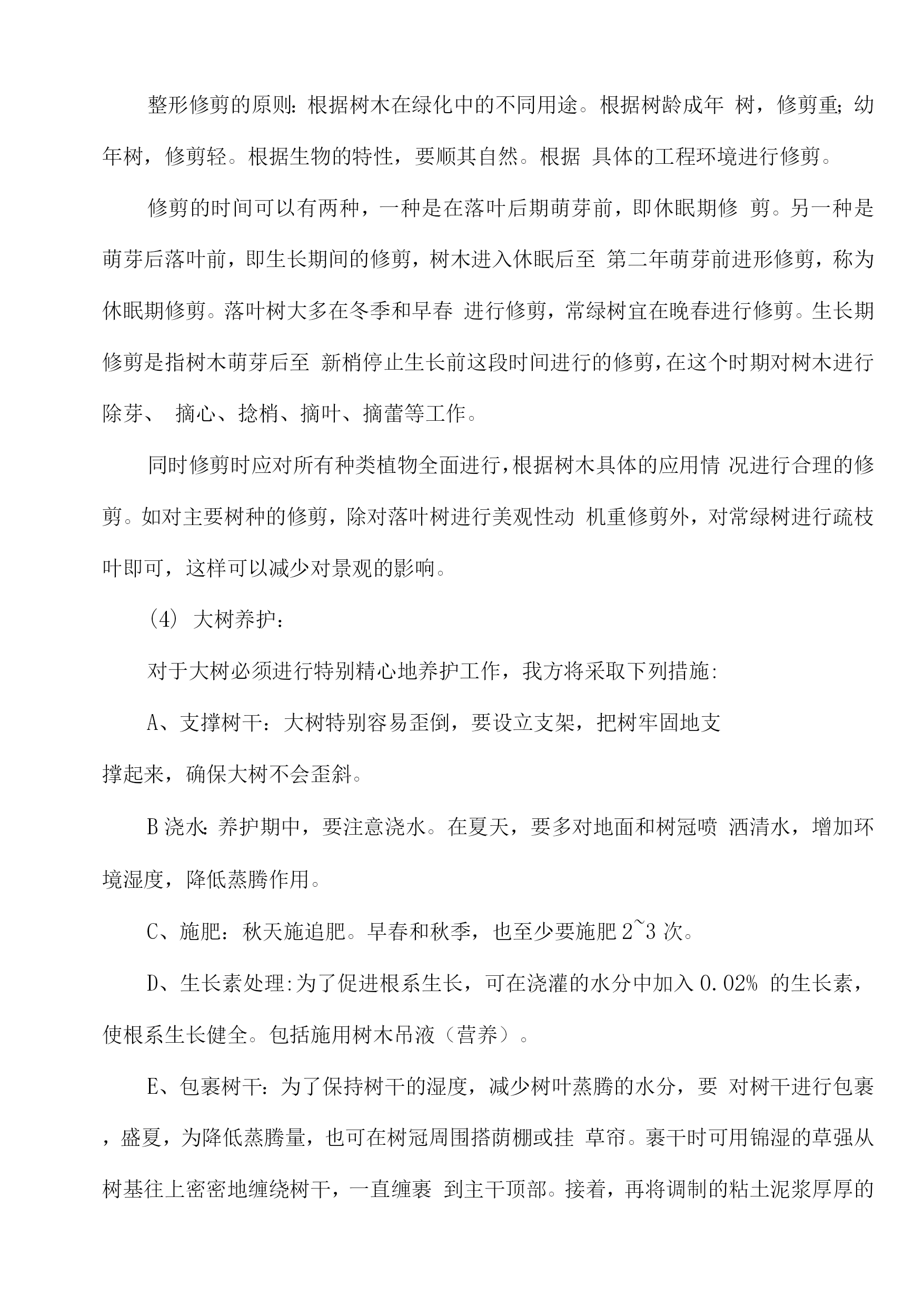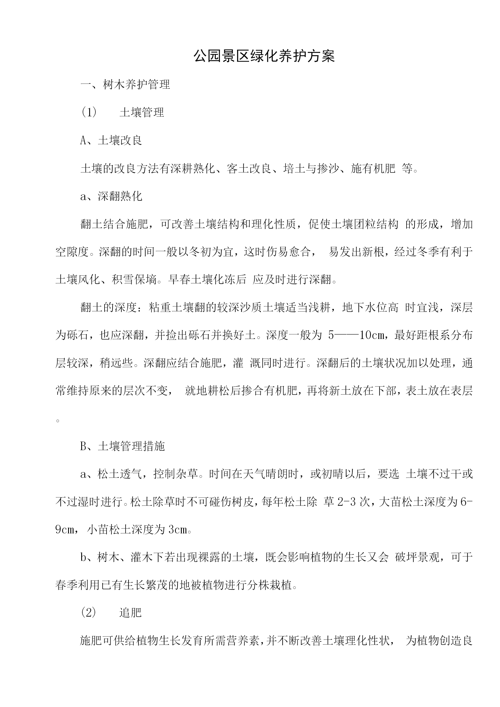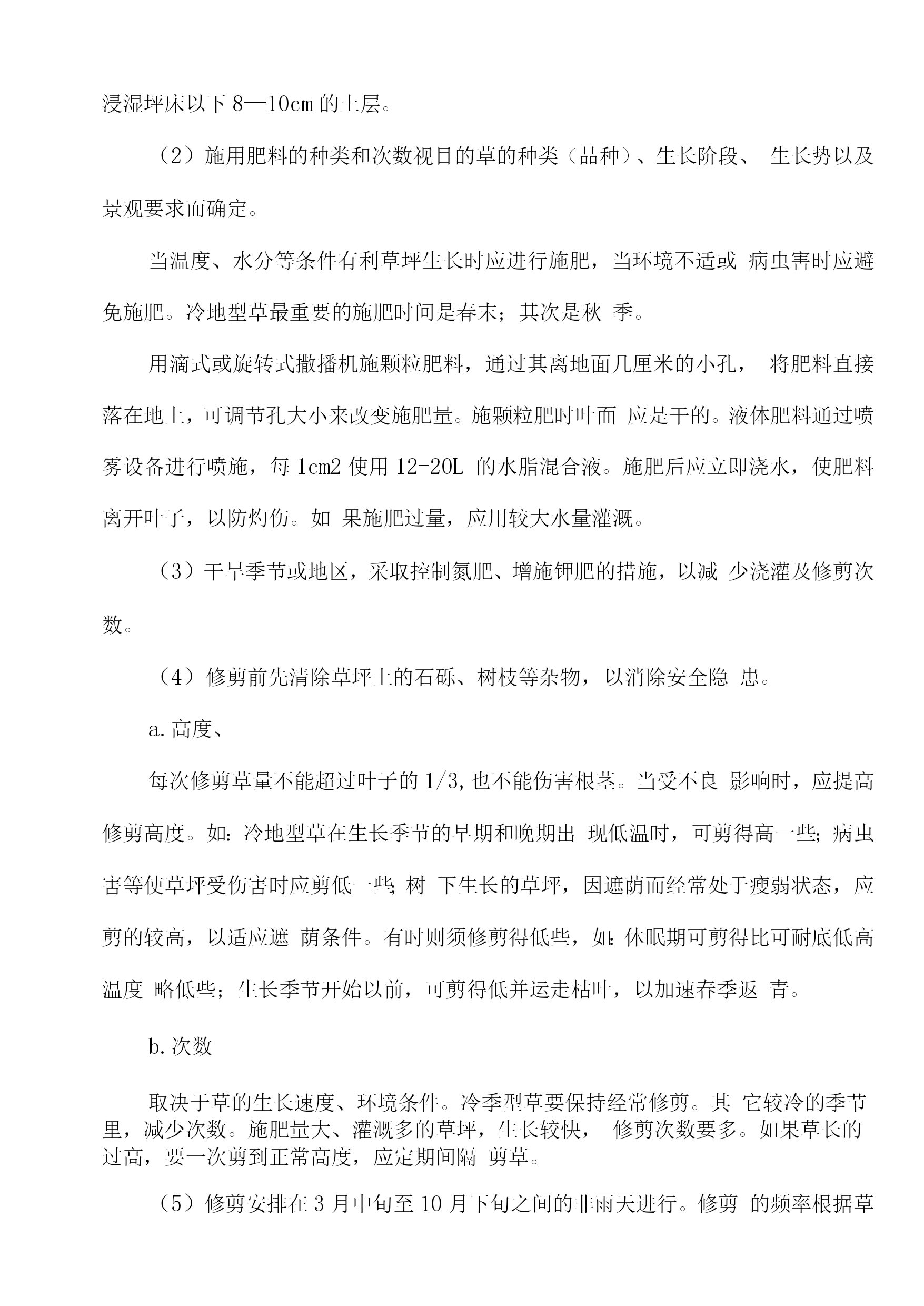 公园景区绿化养护方案一、树木养护管理土壤管理A、土壤改良土壤的改良方法有深耕熟化、客土改良、培土与掺沙、施有机肥等。a、深翻熟化翻土结合施肥,可改善土壤结构和理化性质,促使土壤团粒结构的形成,增加空隙度。深翻的时间一般以冬初为宜,这时伤易愈合,易发出新根,经过冬季有利于土壤风化、积雪保墒。早春土壤化冻后应及时进行深翻。翻土的深度:粘重土壤翻的较深沙质土壤适当浅耕,地下水位高时宜浅,深层为砾石,也应深翻,并捡出砾石并换好土。深度一般为5——10cm,最好距根系分布层较深,稍远些。深翻应结合施肥,灌溉同时进行。深翻后的土壤状况加以处理,通常维持原来的层次不变,就地耕松后掺合有机肥,再将新土放在下部,表土放在表层。B、土壤管理措施a、松土透气,控制杂草。时间在天气晴朗时,或初晴以后,要选土壤不过干或不过湿时进行。松土除草时不可碰伤树皮,每年松土除草2-3次,大苗松土深度为6-9cm,小苗松土深度为3cm。b、树木、灌木下若出现裸露的土壤,既会影响植物的生长又会破坪景观,可于春季利用已有生长繁茂的地被植物进行分株栽植。追肥施肥可供给植物生长发育所需营养素,并不断改善土壤理化性状,为植物创造良好的生长条件。A、施肥量施肥量的确定,需依据植物的生长情况、土壤肥力、水分与光照条件等多种因素。落叶树的施肥根据是每3cm胸径施氮、磷、钾配比为10:6:4复合肥1.0kg,小于1.5cm胸径的小数按此剂量的一半使用。阔叶常绿树种按胸径每3cm胸径施氮、磷、钾配比为10:6:4复合肥0.9-1.0kg为标准。草皮上的施肥,一般施N量为4.8g/m2,N于K的比例以2:1为宜。B、施肥时期休眠期施肥早春或晚秋休眠期施肥,所施肥料一般为迟性长效肥如堆肥、厩肥等有机肥,也可加少量速效肥料,总称为基肥。在晚秋于树木根基周围施有机肥。一般落叶树根系在2月上旬开始活动生长,故以积肥结合试用氮肥,在早春发芽前2-3月最为有利。也可以在冬翻时进行。生长期施肥在树木生长期内,还应及时施入适量的速效性肥料。花灌木宜在花前、花后、花芽分化等时期分别追肥,有些花期长或开花次数多的植物,追肥次数也应增加。如月季,除施足了基肥外,每次开花后要及时追肥。C、施肥方法土壤施肥方法要与树木的根系分布特点相适应。把肥料施在距根系集中分布层较深较远的地方。具体施肥的深度范围与树种、树龄、土壤和肥料性质有关。银杏等树木根系强大,分布较远,施肥宜深,范围也要大一些。幼树根系浅,分布范围也小,一般施肥范围较小而浅。氮肥可浅施,磷肥应与有机肥混合施。基肥宜深施,追肥宜浅施。常用的施肥方法有:a、沟施、环施。没树冠正投影线外缘开挖30-40cm宽的环状沟,将肥料施入沟内,上面覆土适踩,使与地平。适用于青、壮龄树。、放射状沟施。以树干为中心,距干不远处开始,由浅而深向外,挖4-6条分布均匀,呈放射状的沟,沟宽30-40cm,深30-40cm,沟长稍超出树冠正投影的外缘。将肥料施入沟内,上覆土适踩与地平。这种方法可保证内膛枝也能吸收肥分,对壮龄树适用。b、撒施应用于较大面积的群植树坛,树丛或树体高大的孤植树树盘中,把肥料撒于土表,结合秋季深翻,把肥料翻入土中。雨后土壤潮湿或湿润时,直接撒施化肥,或先施化肥溶于水,再浇于根部。在树冠边缘内外,每隔50cm左右挖深度为40-50cm,直径约30cm的穴,施肥穴可挖成一环,也可交错成2-3环,把肥料施入穴内,然后覆盖好。修剪植物生长到一定的程度,容易生长过密,使树木形成天棚形,开花结果集中在顶部,影响了观赏效果。同时,生长过密会形成繁殖病虫害的小环境,基于上述原因,需要对植物进行整形修剪。修剪在树木养护中是相当重要的,它可以美化树型,改造树林,调整树势,平衡生长,防止自然灾害,减少病虫害,提高生存活力。整形修剪的原则:根据树木在绿化中的不同用途。根据树龄成年树,修剪重;幼年树,修剪轻。根据生物的特性,要顺其自然。根据具体的工程环境进行修剪。修剪的时间可以有两种,一种是在落叶后期萌芽前,即休眠期修剪。另一种是萌芽后落叶前,即生长期间的修剪,树木进入休眠后至第二年萌芽前进形修剪,称为休眠期修剪。落叶树大多在冬季和早春进行修剪,常绿树宜在晚春进行修剪。生长期修剪是指树木萌芽后至新梢停止生长前这段时间进行的修剪,在这个时期对树木进行除芽、摘心、捻梢、摘叶、摘蕾等工作。同时修剪时应对所有种类植物全面进行,根据树木具体的应用情况进行合理的修剪。如对主要树种的修剪,除对落叶树进行美观性动机重修剪外,对常绿树进行疏枝叶即可,这样可以减少对景观的影响。大树养护:对于大树必须进行特别精心地养护工作,我方将采取下列措施:A、支撑树干:大树特别容易歪倒,要设立支架,把树牢固地支撑起来,确保大树不会歪斜