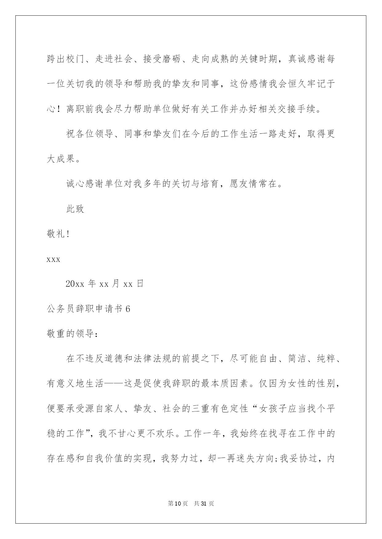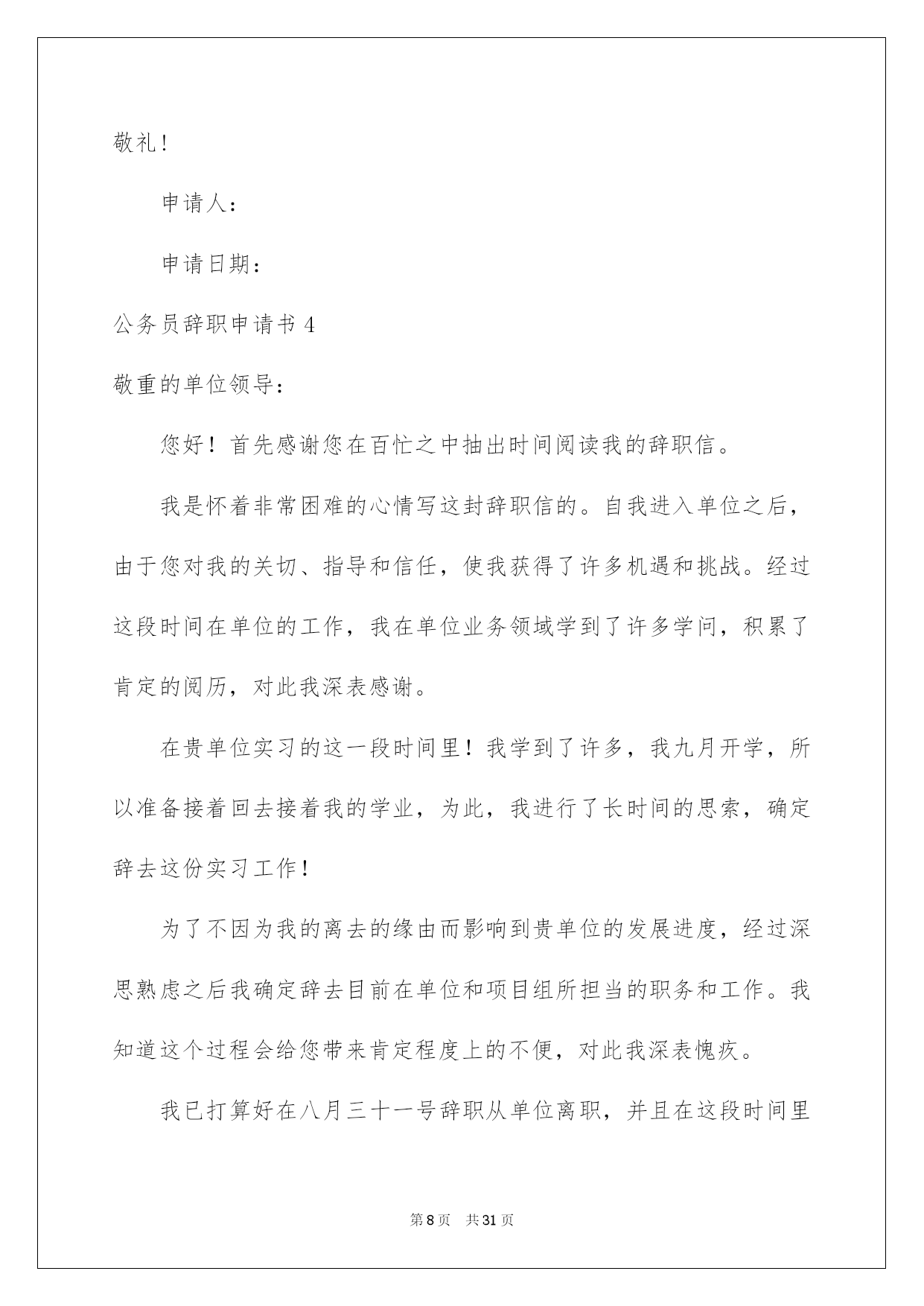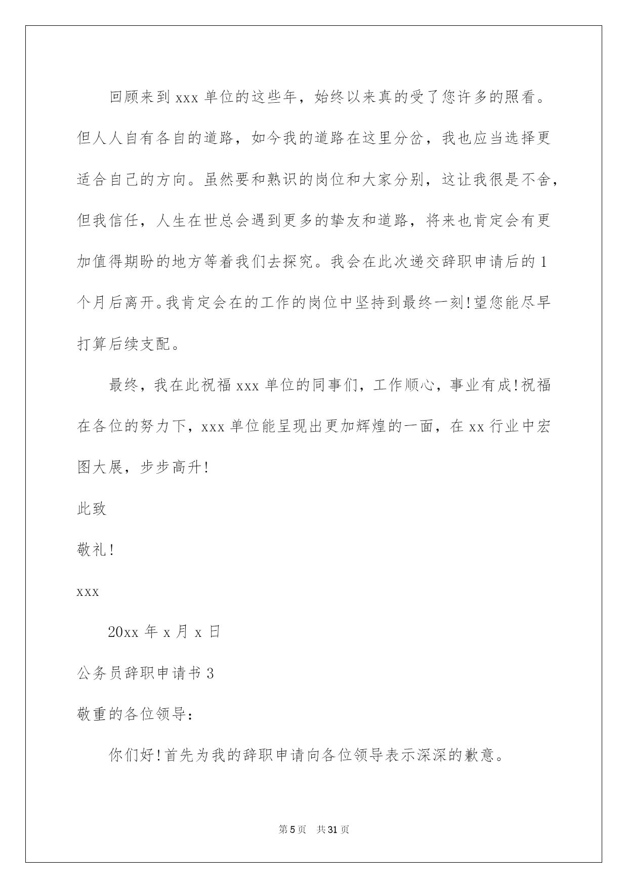 第PAGE\*Arabic\*MERGEFORMAT31页共NUMPAGES\*Arabic\*MERGEFORMAT31页第PAGE\*MERGEFORMAT31页共NUMPAGES\*MERGEFORMAT31页第PAGE\*MERGEFORMAT31页共NUMPAGES\*MERGEFORMAT31页第PAGE\*MERGEFORMAT31页共NUMPAGES\*MERGEFORMAT31页第PAGE\*MERGEFORMAT31页共NUMPAGES\*MERGEFORMAT31页第PAGE\*MERGEFORMAT31页共NUMPAGES\*MERGEFORMAT31页第PAGE\*MERGEFORMAT31页共NUMPAGES\*MERGEFORMAT31页第PAGE\*MERGEFORMAT31页共NUMPAGES\*MERGEFORMAT31页第PAGE\*MERGEFORMAT31页共NUMPAGES\*MERGEFORMAT31页第PAGE\*MERGEFORMAT31页共NUMPAGES\*MERGEFORMAT31页第PAGE\*MERGEFORMAT31页共NUMPAGES\*MERGEFORMAT31页2022公务员辞职申请书公务员辞职申请书(15篇)在这个高速发展的时代,申请书运用的次数愈发增长,我们在写申请书的时候须要留意问题。大家知道申请书的格式吗?下面是我细心整理的公务员辞职申请书,仅供参考,欢迎大家阅读。公务员辞职申请书1敬重的领导:您好!这一年立刻就要结束了,我们即将迎来一个充溢了期盼的新年,在此之际,我先祝单位在新的一年里能越来越红火,取得更好的业绩。我在今日给领导您写这么一封信,不仅仅只是来祝愿单位的,同时这也是我的告辞信,因为我在这个月结束之后,我就会正式离开单位,看到这里,领导您可能会觉得讶异,终归立刻就要过年了,找工作难不说,年终奖还没发呢,这么焦急离开为的是什么?接下来就让我来给领导您说明一下。我来到咱们单位当技术员已经有几年的时间了,在单位里我也算的上一名_员工了,工作这么几年以来,也算是为单位做出了一点成果,所以在单位里混得还算是不错。我的工作主要是负责设计一些单位所须要的产品,所以我每天得运用电脑工作,有时候我一坐就是一成天,期间很少会进行走动,一般也就上厕所,喝水,工作交接的时候会离开自己的位置,其余时间我都是全神贯注的顶着电脑屏幕设计产品。这几年的工作下来,让我的视力越来越差了,原本我的视力还挺不错的,但是现在却戴上了眼睛,同时我的头发也白了不少,之前还是满头黑发,现在却掺杂了不少白发,而且细致一看还能发觉我已经有点脱发了。虽然我的身体状态变差了不少,但我的薪资待遇也水涨船高了。在最近,我总是感觉到自己的颈项不舒适,让我忍不住的想去扭几下,扭得多了我都养成习惯了,没事就动几下,原本我还是不在意的,可时间一长后,我感觉自己的精神状态都受到了影响,于是我抽空便去医院检查了一下子,发觉身体果真出现了问题,还好检查的比较早,还能刚好的改正回来。出了这么一件事后,我的工作主动性都降低了不少,在和家人挚友闲聊时,我提到了这个问题,大家纷纷劝我回家调养一段时间,终归身体才是第一位,赚钱的机会以后有的是。我细致想了想,大家说的也是实话,要是身体垮了,那就算能挣再多的钱都没有意义了,所以趁着过年的这个时机,我确定辞去现在的工作,好好地在家里养息一段时间,顺便也促进一下和家人的关系,在平日里我和家里人虽然有联系,可还是太少了。希望领导您在看完我的简述后能理解我的心情,请您早日批复我的恳求,我会尽快尽好的把交接手续处理完毕的。此致敬礼!辞职人:__20__年_月_日公务员辞职申请书2敬重的领导:您好!时间荏苒,距离我加入单位已经过去了x年的岁月了。回顾这x年来,在您的指引和严格管理下,我主动的学习了自己的这份岗位学问,并在工作中努力发挥自身的动力,为单位创建成果,并不断的加强自我业务实力。这几年来,真的特别感谢您在工作中的培育以及团队同事们在工作中给我的帮助,感谢大家!但是,在这段时间里,不仅仅是我的学问和实力在提升,因为社会的发展,在生活中所须要的开支也在不断的给我们增加压力!关于这点,其实最早的时候我并没有放在心上,甚至认为这不过是社会的自然规律,不会对自己造成太大的影响。但如今看来在,那时候的自己真的是太缺乏社会阅历,以至于乐观的程度!如今,虽然生活成本一再提高,但我自身的收入却始终稳定。每次,看到生活中挚友们的生活发展,真的让我既着急,又担忧。但如今,在经过了严谨的思索和打算之后,我最终还是下定了决心,向您提出这份辞职申请。