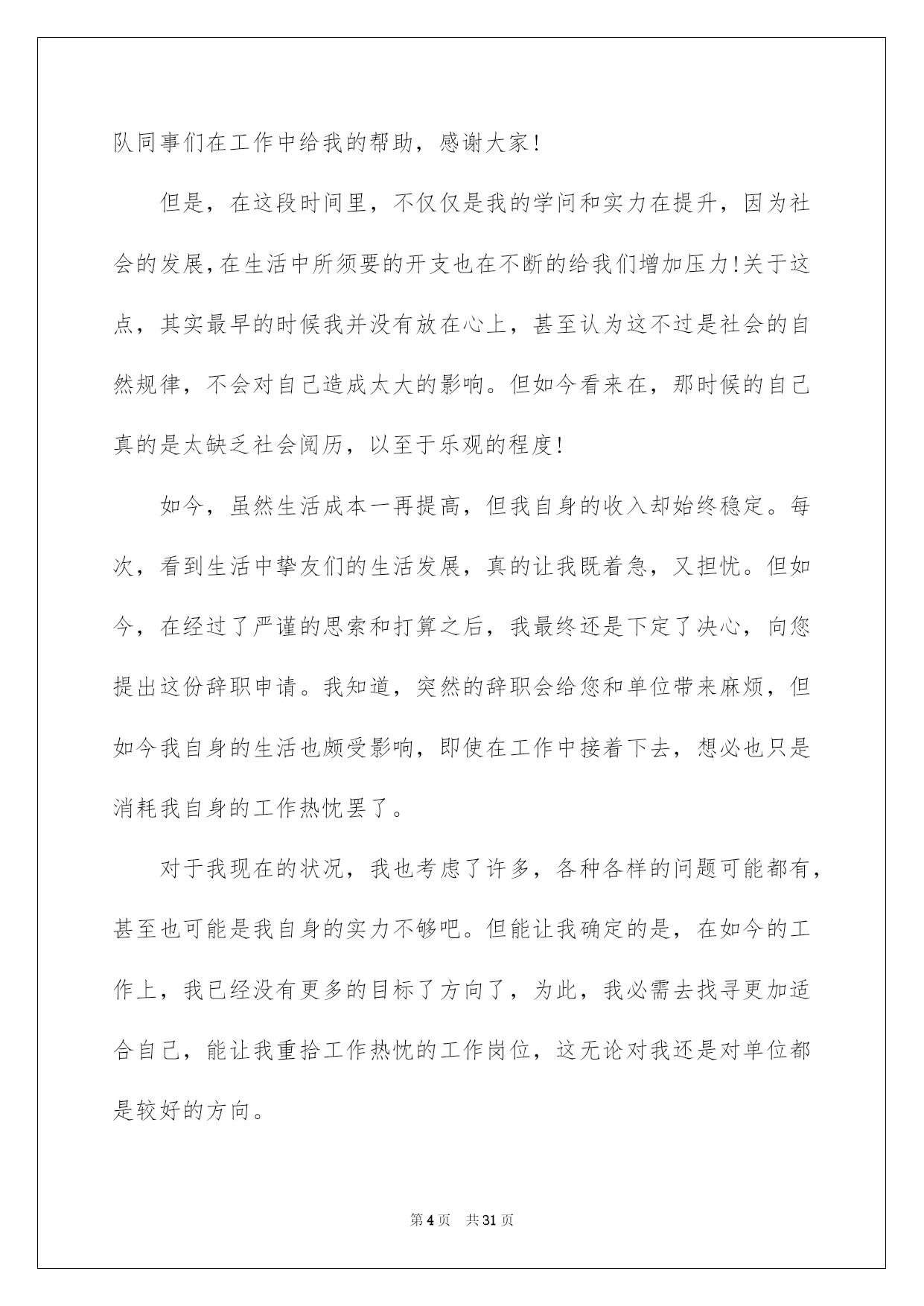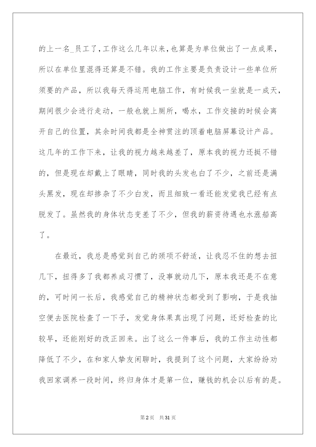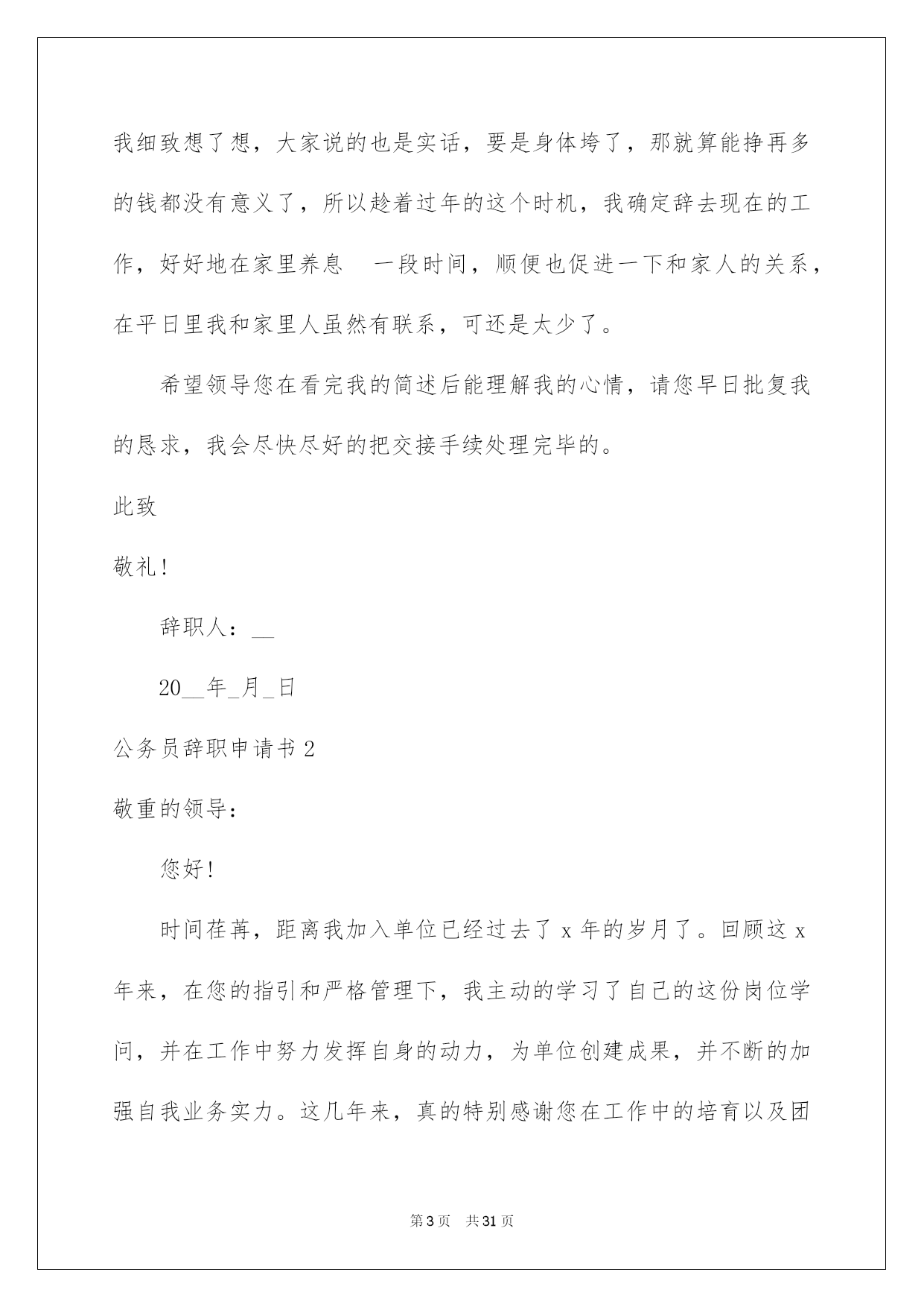 第PAGE\*Arabic\*MERGEFORMAT31页共NUMPAGES\*Arabic\*MERGEFORMAT31页第PAGE\*MERGEFORMAT31页共NUMPAGES\*MERGEFORMAT31页第PAGE\*MERGEFORMAT31页共NUMPAGES\*MERGEFORMAT31页第PAGE\*MERGEFORMAT31页共NUMPAGES\*MERGEFORMAT31页第PAGE\*MERGEFORMAT31页共NUMPAGES\*MERGEFORMAT31页第PAGE\*MERGEFORMAT31页共NUMPAGES\*MERGEFORMAT31页第PAGE\*MERGEFORMAT31页共NUMPAGES\*MERGEFORMAT31页第PAGE\*MERGEFORMAT31页共NUMPAGES\*MERGEFORMAT31页第PAGE\*MERGEFORMAT31页共NUMPAGES\*MERGEFORMAT31页第PAGE\*MERGEFORMAT31页共NUMPAGES\*MERGEFORMAT31页第PAGE\*MERGEFORMAT31页共NUMPAGES\*MERGEFORMAT31页2022公务员辞职申请书公务员辞职申请书(15篇)在这个高速发展的时代,申请书运用的次数愈发增长,我们在写申请书的时候须要留意问题。大家知道申请书的格式吗?下面是我细心整理的公务员辞职申请书,仅供参考,欢迎大家阅读。公务员辞职申请书1敬重的领导:您好!这一年立刻就要结束了,我们即将迎来一个充溢了期盼的新年,在此之际,我先祝单位在新的一年里能越来越红火,取得更好的业绩。我在今日给领导您写这么一封信,不仅仅只是来祝愿单位的,同时这也是我的告辞信,因为我在这个月结束之后,我就会正式离开单位,看到这里,领导您可能会觉得讶异,终归立刻就要过年了,找工作难不说,年终奖还没发呢,这么焦急离开为的是什么?接下来就让我来给领导您说明一下。我来到咱们单位当技术员已经有几年的时间了,在单位里我也算的上一名_员工了,工作这么几年以来,也算是为单位做出了一点成果,所以在单位里混得还算是不错。我的工作主要是负责设计一些单位所须要的产品,所以我每天得运用电脑工作,有时候我一坐就是一成天,期间很少会进行走动,一般也就上厕所,喝水,工作交接的时候会离开自己的位置,其余时间我都是全神贯注的顶着电脑屏幕设计产品。这几年的工作下来,让我的视力越来越差了,原本我的视力还挺不错的,但是现在却戴上了眼睛,同时我的头发也白了不少,之前还是满头黑发,现在却掺杂了不少白发,而且细致一看还能发觉我已经有点脱发了。虽然我的身体状态变差了不少,但我的薪资待遇也水涨船高了。在最近,我总是感觉到自己的颈项不舒适,让我忍不住的想去扭几下,扭得多了我都养成习惯了,没事就动几下,原本我还是不在意的,可时间一长后,我感觉自己的精神状态都受到了影响,于是我抽空便去医院检查了一下子,发觉身体果真出现了问题,还好检查的比较早,还能刚好的改正回来。出了这么一件事后,我的工作主动性都降低了不少,在和家人挚友闲聊时,我提到了这个问题,大家纷纷劝我回家调养一段时间,终归身体才是第一位,赚钱的机会以后有的是。我细致想了想,大家说的也是实话,要是身体垮了,那就算能挣再多的钱都没有意义了,所以趁着过年的这个时机,我确定辞去现在的工作,好好地在家里养息一段时间,顺便也促进一下和家人的关系,在平日里我和家里人虽然有联系,可还是太少了。希望领导您在看完我的简述后能理解我的心情,请您早日批复我的恳求,我会尽快尽好的把交接手续处理完毕的。此致敬礼!辞职人:__20__年_月_日公务员辞职申请书2敬重的领导:您好!时间荏苒,距离我加入单位已经过去了x年的岁月了。回顾这x年来,在您的指引和严格管理下,我主动的学习了自己的这份岗位学问,并在工作中努力发挥自身的动力,为单位创建成果,并不断的加强自我业务实力。这几年来,真的特别感谢您在工作中的培育以及团队同事们在工作中给我的帮助,感谢大家!但是,在这段时间里,不仅仅是我的学问和实力在提升,因为社会的发展,在生活中所须要的开支也在不断的给我们增加压力!关于这点,其实最早的时候我并没有放在心上,甚至认为这不过是社会的自然规律,不会对自己造成太大的影响。但如今看来在,那时候的自己真的是太缺乏社会阅历,以至于乐观的程度!如今,虽然生活成本一再提高,但我自身的收入却始终稳定。每次,看到生活中挚友们的生活发展,真的让我既着急,又担忧。但如今,在经过了严谨的思索和打算之后,我最终还是下定了决心,向您提出这份辞职申请。