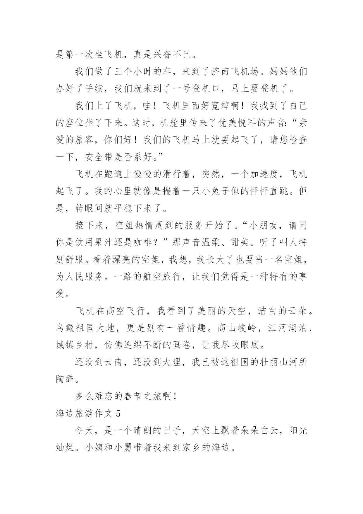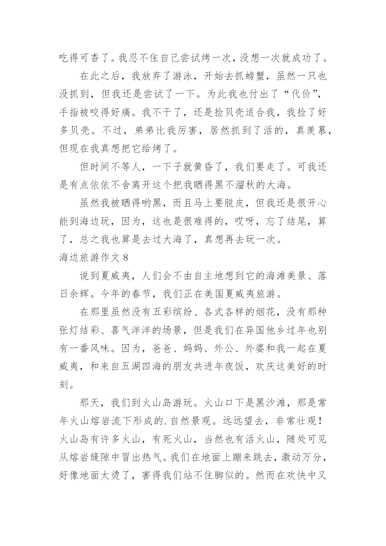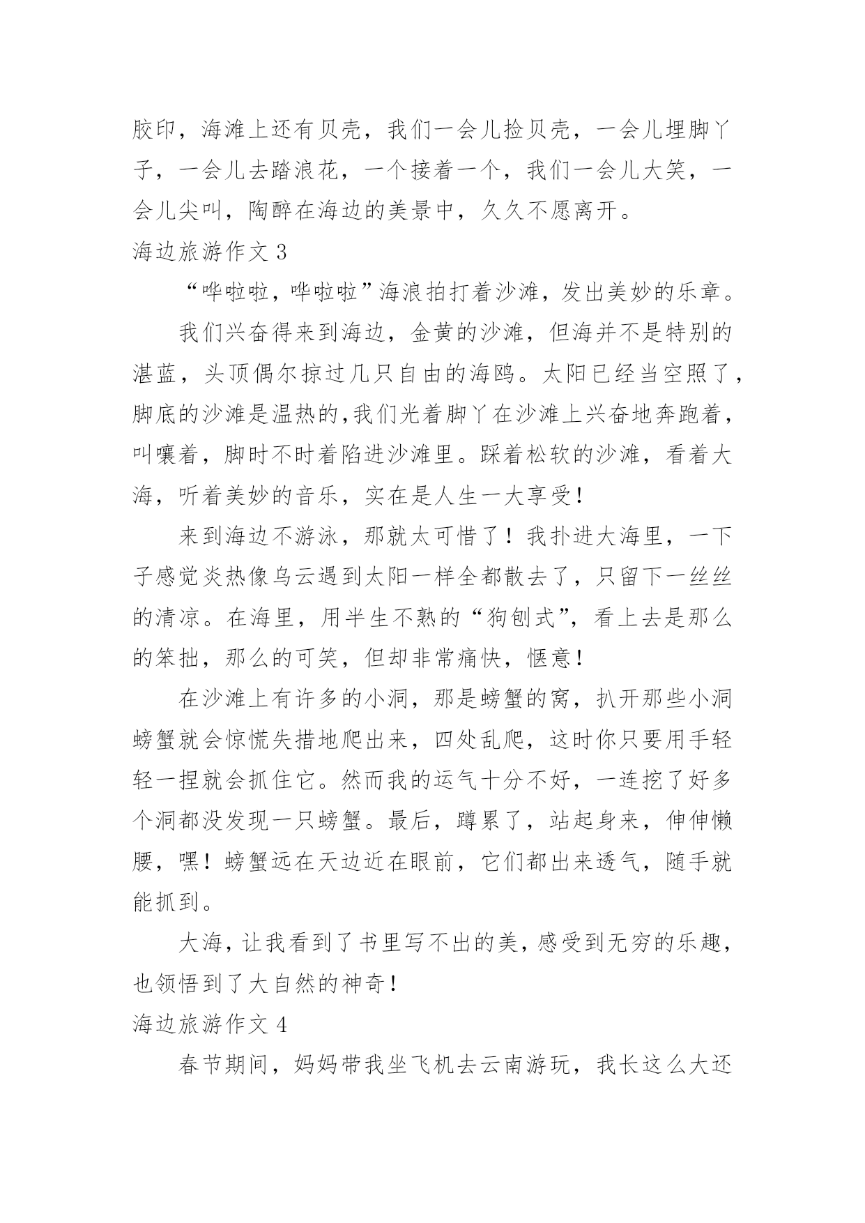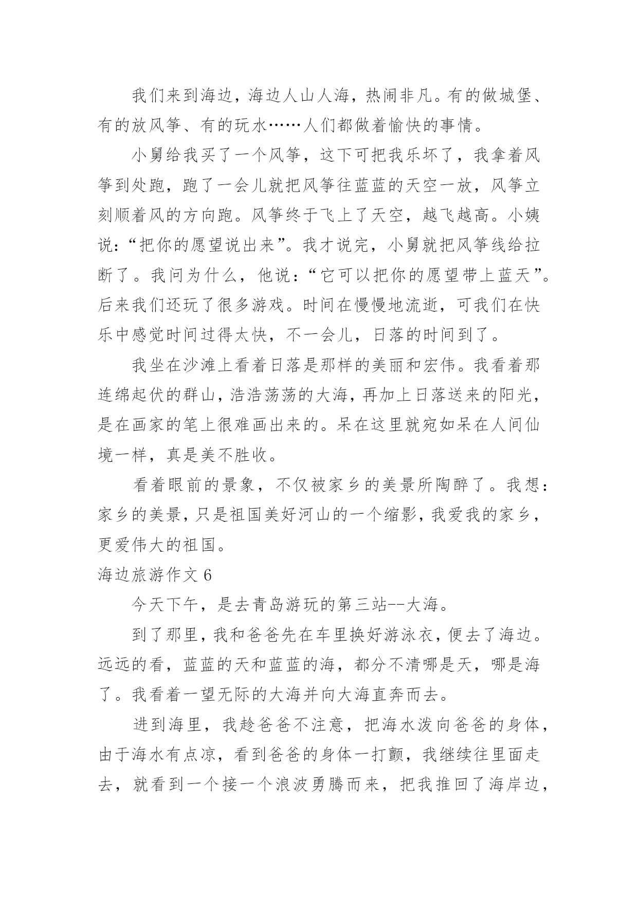 海边旅游作文海边旅游作文(合集15篇)无论是在学校还是在社会中,许多人都有过写作文的经历,对作文都不陌生吧,通过作文可以把我们那些零零散散的思想,聚集在一块。那么你知道一篇好的作文该怎么写吗?以下是小编收集整理的海边旅游作文,希望能够帮助到大家。海边旅游作文1去海边是我最爱去的地方,我日日想、月月想、年年想,就盼望有这么几天去海边。那天,风和日丽,我们全家人一起去海边玩,我们下了车,展现在我眼前的是一望无际的大海。极目远眺,大海上的浪花很多,一阵微风吹了过来,凉爽的海风扑面而来,令人心旷神怡,爸爸交待了我们几句后,我们便向大海奔去,我们下了车,迈着大大的步子,直向海边奔去,哇——大海好大,真是一眼望去望不到边,真是无边无际。我在海边走了走,这时正在涨潮,却把裤子给弄湿了,湿的还真凉快,再往海里走了几米,差不多到了腰的时候,我没站稳,我浮在了水上,正好喝了一大口海水,真咸。然后我用力,站稳了,赶紧往回走去。我们马上换上游泳衣,在大海自由的游着,一阵海浪扑打在我的脸上,感觉凉爽、舒适。可是后来的一个大浪就不那么好玩了,那个浪一来,我和李瑞奇{我的好朋友}就都被淹在了地下,我的游泳圈掉了,我不会游泳。那个地方连大人的脚都够不到底,大人们急了,连忙去找,我的游泳圈在上面,而我在水底坐了好长时间,这时,奇迹出现了,不会游泳的我憋了一口气,自己就浮上来了。我们玩了一下午,然后,回到了宾馆,身上干了以后出现了许多盐渍,就痛痛快快洗了一个澡。我今天没玩够,明天我们还可以去海边游泳。海边旅游作文2暑假里,我和家人一起去珠海游玩,一大早,我们先去了海边,我一蹦一跳地冲在最前边,不到十分钟就看到一片汪洋大海,一望无边,天连着海,海接着天,全是蓝色的,中间有大大小小几座小岛点缀着,海面上有来来往往的轮船,爸爸告诉我,"咱们现在看到的海是南海,你以前去过日照,见到的是黄海。"我望着大海说:"哦,南海,黄海,中国好大啊!"爸爸笑了:"中国远比咱们能看到的大。"我心里十分激动,更喜欢这片大海了。海岸边长着椰子树、棕榈树,还有我叫不出名字的树,只好叫它们"南方树",很多南方树枝繁叶茂、高大粗壮,身上还生出许多"胡子",把海边装点得郁郁葱葱,在海风的吹拂下,跳着摇摆舞,带给人们夏日的凉爽,还有我超级喜欢的海滩,这里的海滩又大又平,离海水远一些的沙粒大一些,离海水近一些的沙粒细小,沙子太多了,所以,海边的海水被染成了黄色。沙子踩上去软软的,印着许多小胶印,海滩上还有贝壳,我们一会儿捡贝壳,一会儿埋脚丫子,一会儿去踏浪花,一个接着一个,我们一会儿大笑,一会儿尖叫,陶醉在海边的美景中,久久不愿离开。海边旅游作文3“哗啦啦,哗啦啦”海浪拍打着沙滩,发出美妙的乐章。我们兴奋得来到海边,金黄的沙滩,但海并不是特别的湛蓝,头顶偶尔掠过几只自由的海鸥。太阳已经当空照了,脚底的沙滩是温热的,我们光着脚丫在沙滩上兴奋地奔跑着,叫嚷着,脚时不时着陷进沙滩里。踩着松软的沙滩,看着大海,听着美妙的音乐,实在是人生一大享受!来到海边不游泳,那就太可惜了!我扑进大海里,一下子感觉炎热像乌云遇到太阳一样全都散去了,只留下一丝丝的清凉。在海里,用半生不熟的“狗刨式”,看上去是那么的笨拙,那么的可笑,但却非常痛快,惬意!在沙滩上有许多的小洞,那是螃蟹的窝,扒开那些小洞螃蟹就会惊慌失措地爬出来,四处乱爬,这时你只要用手轻轻一捏就会抓住它。然而我的运气十分不好,一连挖了好多个洞都没发现一只螃蟹。最后,蹲累了,站起身来,伸伸懒腰,嘿!螃蟹远在天边近在眼前,它们都出来透气,随手就能抓到。大海,让我看到了书里写不出的美,感受到无穷的乐趣,也领悟到了大自然的神奇!海边旅游作文4春节期间,妈妈带我坐飞机去云南游玩,我长这么大还是第一次坐飞机,真是兴奋不已。我们做了三个小时的车,来到了济南飞机场。妈妈他们办好了手续,我们就来到了一号登机口,马上要登机了。我们上了飞机,哇!飞机里面好宽绰啊!我找到了自己的座位坐了下来。这时,机舱里传来了优美悦耳的声音:“亲爱的旅客,你们好!我们的飞机马上就要起飞了,请您检查一下,安全带是否系好。”飞机在跑道上慢慢的滑行着,突然,一个加速度,飞机起飞了。我的心里就像是揣着一只小兔子似的怦怦直跳。但是,转眼间就平稳下来了。接下来,空姐热情周到的服务开始了。“小朋友,请问你是饮用果汁还是咖啡?”那声音温柔、甜美。听了叫人特别舒服。看着漂亮的空姐,我想,我长大了也要当一名空姐,为人民服务。一路的航空旅行,让我们觉得是一种特有的享受。飞机在高空飞行,我看到了美丽的天空,洁白的云朵。鸟瞰祖国大地,更是别有一番情趣。高山峻岭,江河湖泊、城镇乡村,仿佛连绵不断的画卷,让我尽收眼底。还没到云南,还没到大理,我已被这祖国的壮丽山河所陶醉。多么难忘的春节之旅啊!海边旅游作文5今天,是一个晴朗的日子