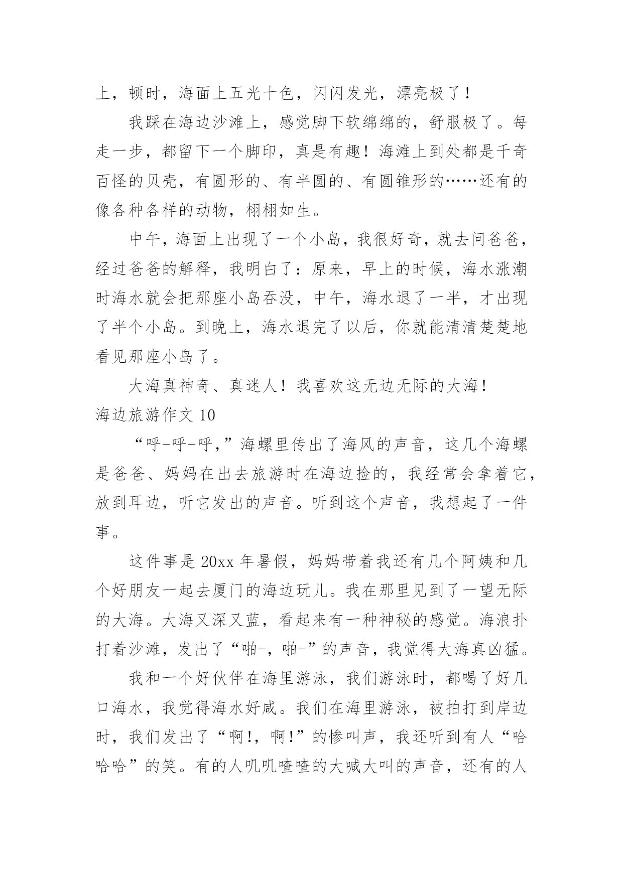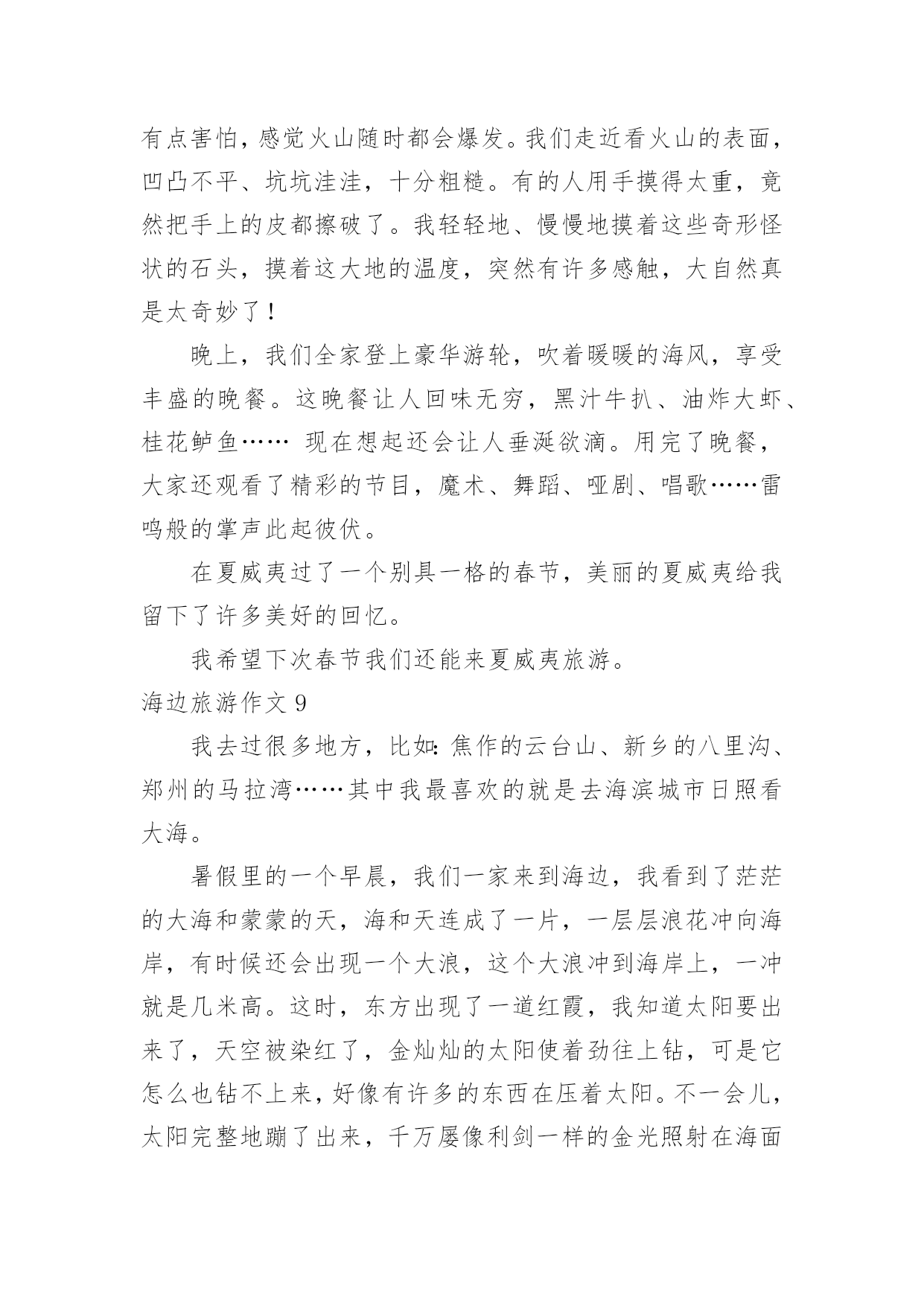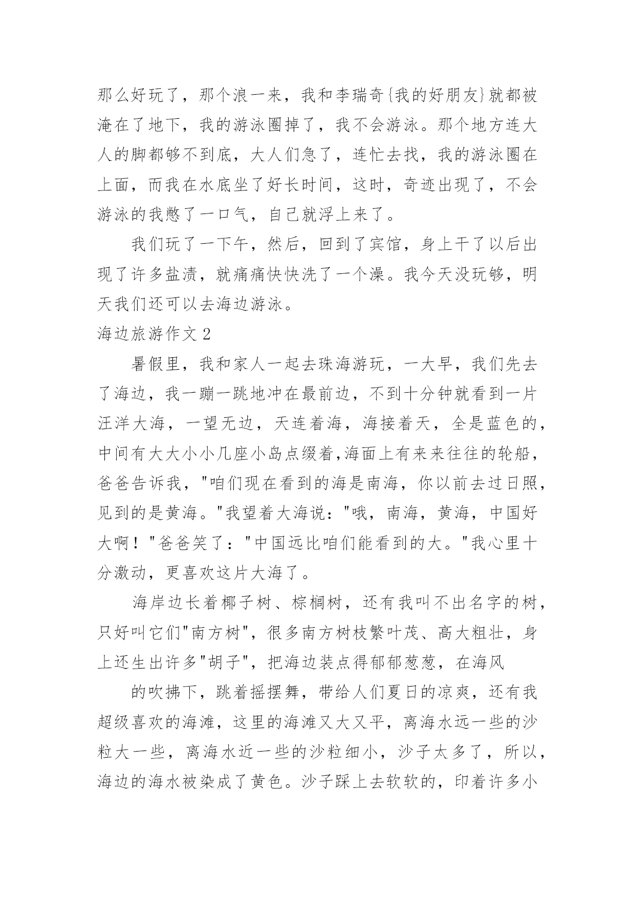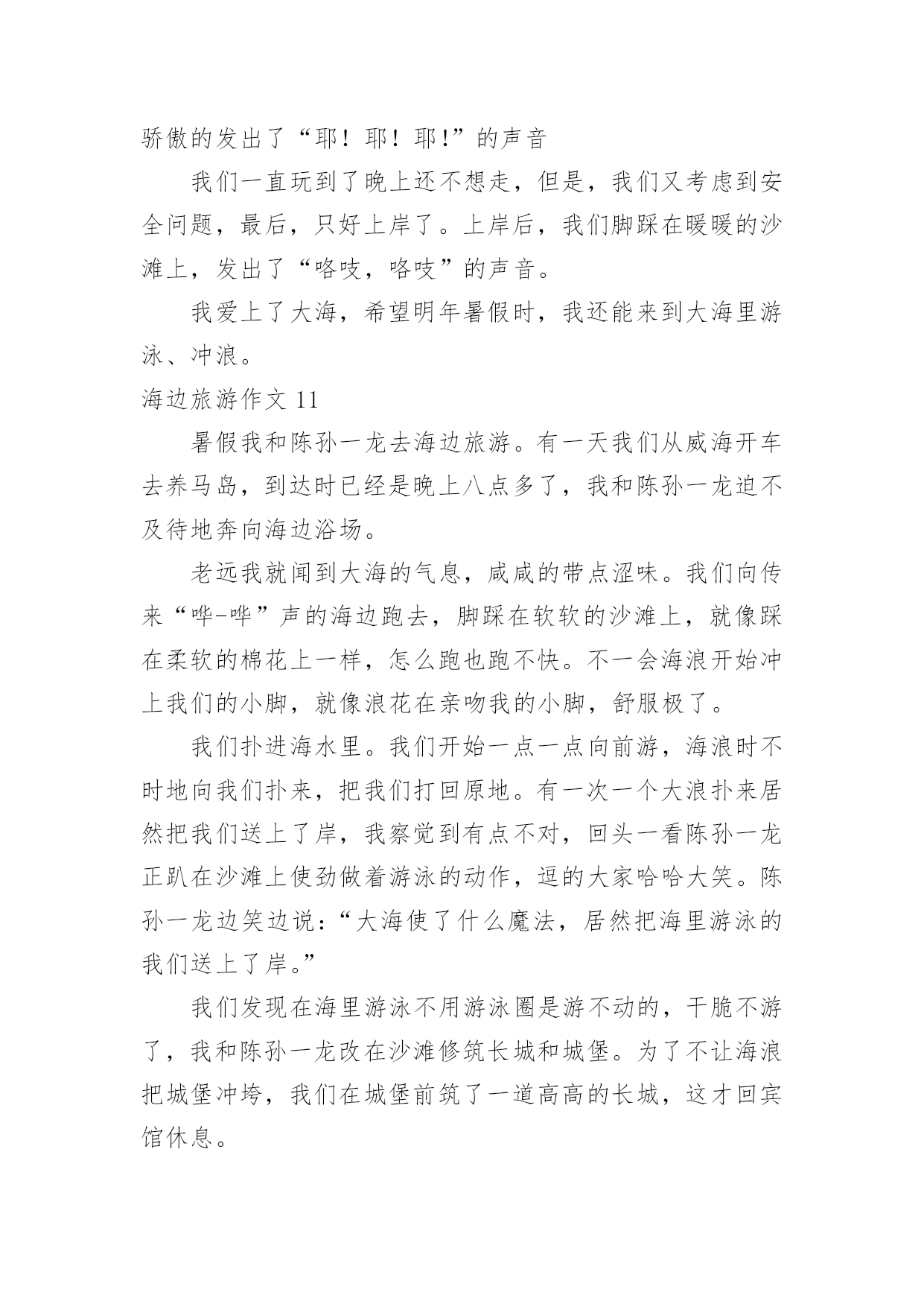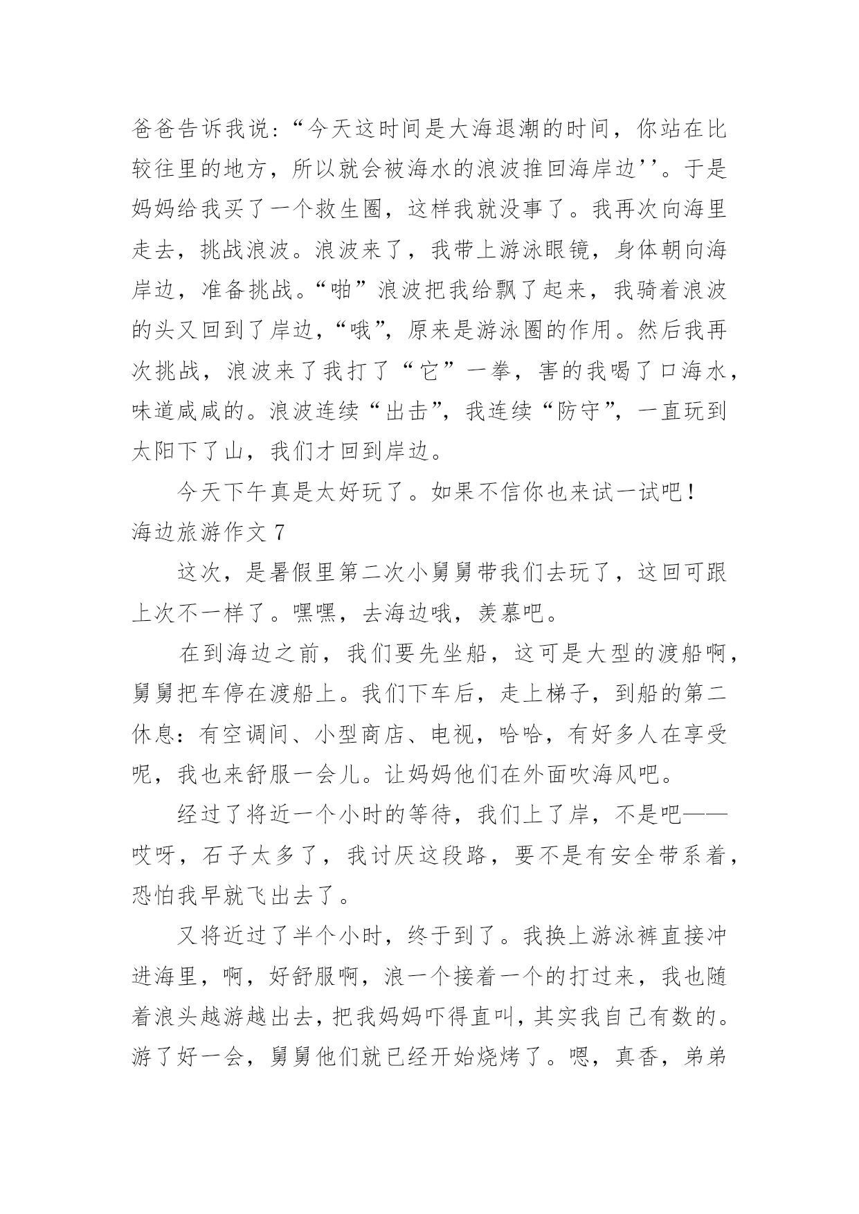 海边旅游作文海边旅游作文(合集15篇)无论是在学校还是在社会中,许多人都有过写作文的经历,对作文都不陌生吧,通过作文可以把我们那些零零散散的思想,聚集在一块。那么你知道一篇好的作文该怎么写吗?以下是小编收集整理的海边旅游作文,希望能够帮助到大家。海边旅游作文1去海边是我最爱去的地方,我日日想、月月想、年年想,就盼望有这么几天去海边。那天,风和日丽,我们全家人一起去海边玩,我们下了车,展现在我眼前的是一望无际的大海。极目远眺,大海上的浪花很多,一阵微风吹了过来,凉爽的海风扑面而来,令人心旷神怡,爸爸交待了我们几句后,我们便向大海奔去,我们下了车,迈着大大的步子,直向海边奔去,哇——大海好大,真是一眼望去望不到边,真是无边无际。我在海边走了走,这时正在涨潮,却把裤子给弄湿了,湿的还真凉快,再往海里走了几米,差不多到了腰的时候,我没站稳,我浮在了水上,正好喝了一大口海水,真咸。然后我用力,站稳了,赶紧往回走去。我们马上换上游泳衣,在大海自由的游着,一阵海浪扑打在我的脸上,感觉凉爽、舒适。可是后来的一个大浪就不那么好玩了,那个浪一来,我和李瑞奇{我的好朋友}就都被淹在了地下,我的游泳圈掉了,我不会游泳。那个地方连大人的脚都够不到底,大人们急了,连忙去找,我的游泳圈在上面,而我在水底坐了好长时间,这时,奇迹出现了,不会游泳的我憋了一口气,自己就浮上来了。我们玩了一下午,然后,回到了宾馆,身上干了以后出现了许多盐渍,就痛痛快快洗了一个澡。我今天没玩够,明天我们还可以去海边游泳。海边旅游作文2暑假里,我和家人一起去珠海游玩,一大早,我们先去了海边,我一蹦一跳地冲在最前边,不到十分钟就看到一片汪洋大海,一望无边,天连着海,海接着天,全是蓝色的,中间有大大小小几座小岛点缀着,海面上有来来往往的轮船,爸爸告诉我,"咱们现在看到的海是南海,你以前去过日照,见到的是黄海。"我望着大海说:"哦,南海,黄海,中国好大啊!"爸爸笑了:"中国远比咱们能看到的大。"我心里十分激动,更喜欢这片大海了。海岸边长着椰子树、棕榈树,还有我叫不出名字的树,只好叫它们"南方树",很多南方树枝繁叶茂、高大粗壮,身上还生出许多"胡子",把海边装点得郁郁葱葱,在海风的吹拂下,跳着摇摆舞,带给人们夏日的凉爽,还有我超级喜欢的海滩,这里的海滩又大又平,离海水远一些的沙粒大一些,离海水近一些的沙粒细小,沙子太多了,所以,海边的海水被染成了黄色。沙子踩上去软软的,印着许多小胶印,海滩上还有贝壳,我们一会儿捡贝壳,一会儿埋脚丫子,一会儿去踏浪花,一个接着一个,我们一会儿大笑,一会儿尖叫,陶醉在海边的美景中,久久不愿离开。海边旅游作文3“哗啦啦,哗啦啦”海浪拍打着沙滩,发出美妙的乐章。我们兴奋得来到海边,金黄的沙滩,但海并不是特别的湛蓝,头顶偶尔掠过几只自由的海鸥。太阳已经当空照了,脚底的沙滩是温热的,我们光着脚丫在沙滩上兴奋地奔跑着,叫嚷着,脚时不时着陷进沙滩里。踩着松软的沙滩,看着大海,听着美妙的音乐,实在是人生一大享受!来到海边不游泳,那就太可惜了!我扑进大海里,一下子感觉炎热像乌云遇到太阳一样全都散去了,只留下一丝丝的清凉。在海里,用半生不熟的“狗刨式”,看上去是那么的笨拙,那么的可笑,但却非常痛快,惬意!在沙滩上有许多的小洞,那是螃蟹的窝,扒开那些小洞螃蟹就会惊慌失措地爬出来,四处乱爬,这时你只要用手轻轻一捏就会抓住它。然而我的运气十分不好,一连挖了好多个洞都没发现一只螃蟹。最后,蹲累了,站起身来,伸伸懒腰,嘿!螃蟹远在天边近在眼前,它们都出来透气,随手就能抓到。大海,让我看到了书里写不出的美,感受到无穷的乐趣,也领悟到了大自然的神奇!海边旅游作文4春节期间,妈妈带我坐飞机去云南游玩,我长这么大还是第一次坐飞机,真是兴奋不已。我们做了三个小时的车,来到了济南飞机场。妈妈他们办好了手续,我们就来到了一号登机口,马上要登机了。我们上了飞机,哇!飞机里面好宽绰啊!我找到了自己的座位坐了下来。这时,机舱里传来了优美悦耳的声音:“亲爱的旅客,你们好!我们的飞机马上就要起飞了,请您检查一下,安全带是否系好。”飞机在跑道上慢慢的滑行着,突然,一个加速度,飞机起飞了。我的心里就像是揣着一只小兔子似的怦怦直跳。但是,转眼间就平稳下来了。接下来,空姐热情周到的服务开始了。“小朋友,请问你是饮用果汁还是咖啡?”那声音温柔、甜美。听了叫人特别舒服。看着漂亮的空姐,我想,我长大了也要当一名空姐,为人民服务。一路的航空旅行,让我们觉得是一种特有的享受。飞机在高空飞行,我看到了美丽的天空,洁白的云朵。鸟瞰祖国大地,更是别有一番情趣。高山峻岭,江河湖泊、城镇乡村,仿佛连绵不断的画卷,让我尽收眼底。还没到云南,还没到大理,我已被这祖国的壮丽山河所陶醉。多么难忘的春节之旅啊!海边旅游作文5今天,是一个晴朗的日子
