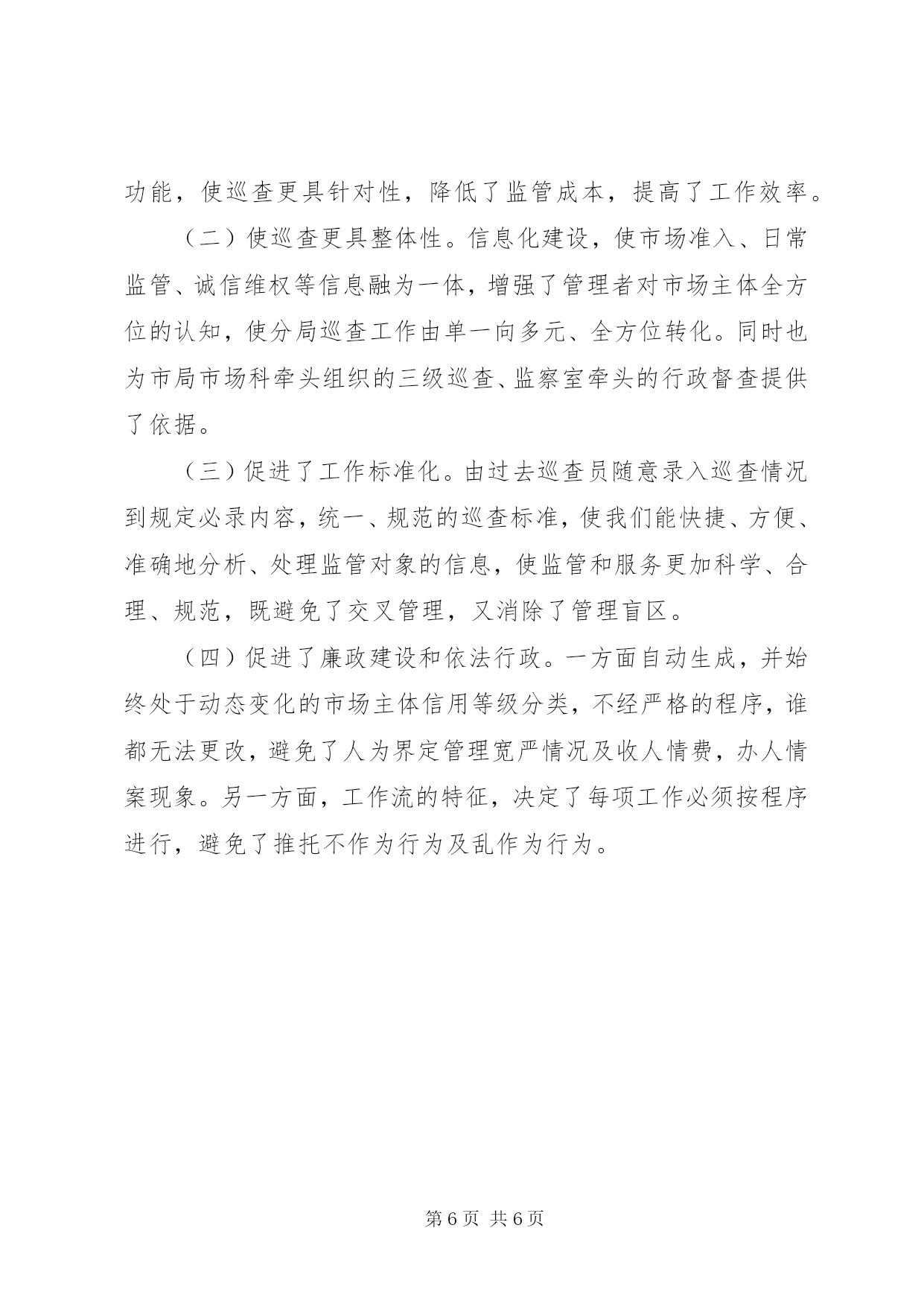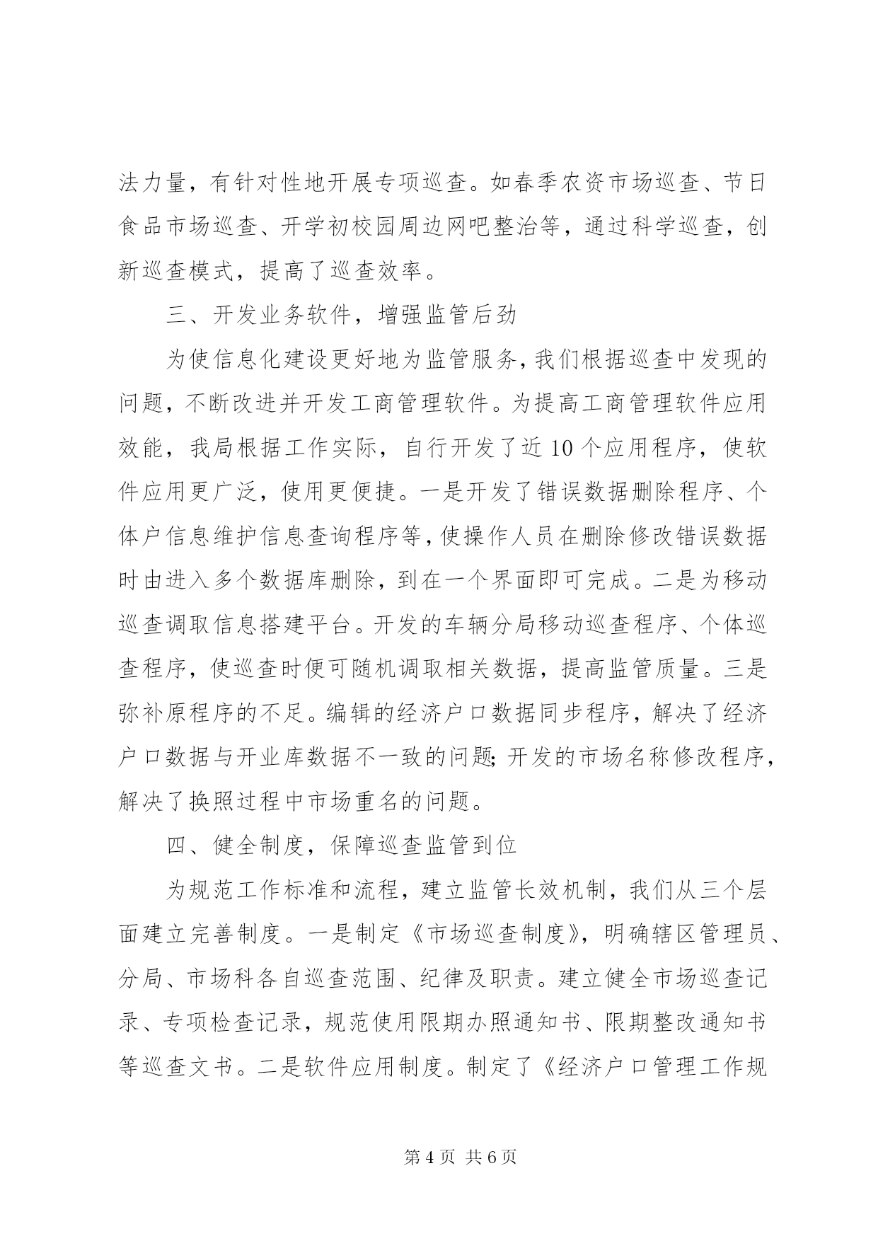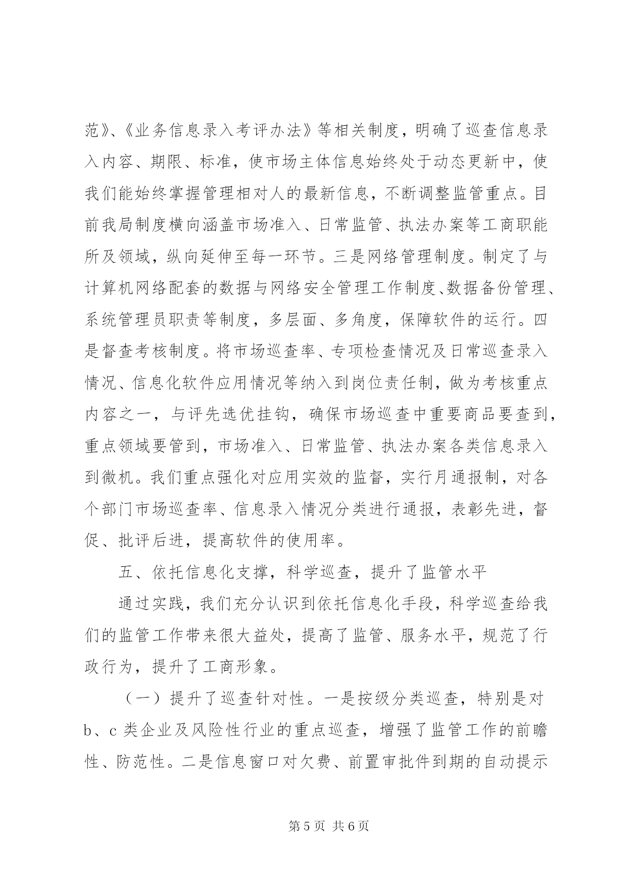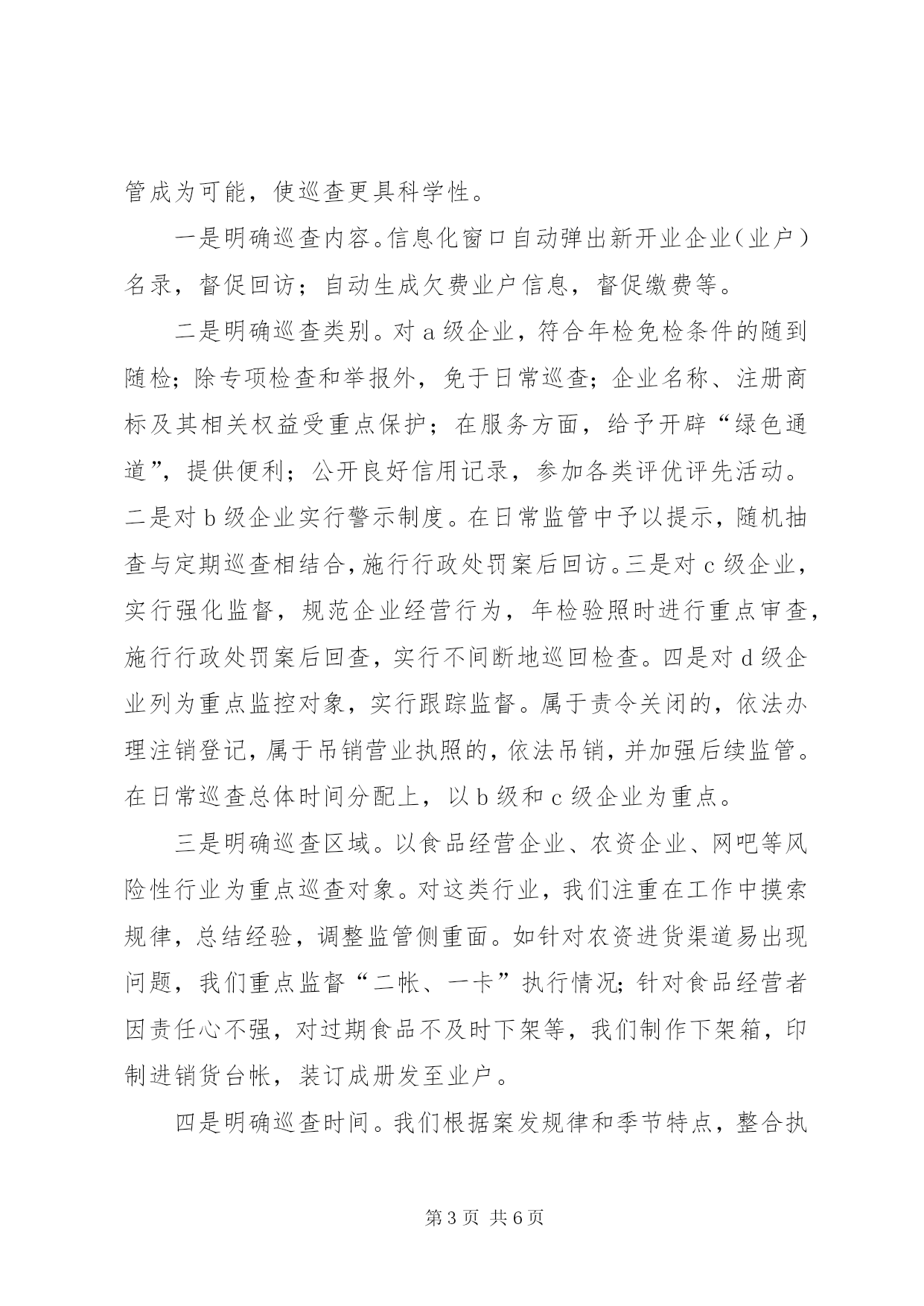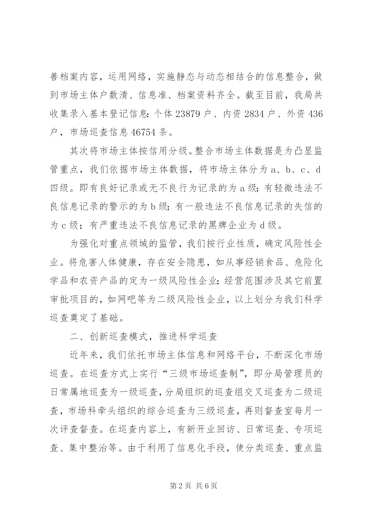 第PAGE\*Arabic\*MERGEFORMAT6页共NUMPAGES\*MERGEFORMAT6页市工商局市场巡查经验材料我局现有在岗职工231人,辖区有内资企业2528户、外资企业223户、个体工商户23701户。近年来,我局利用信息化手段,推进科学巡查,有效提升了监管水平,使监管工作更具整体性、连续性、高效性。我们的主要做法如下:一、搭建信息化平台,夯实科学巡查基础为从众多的市场主体、繁复的市场行为中认定监管重点,使市场巡查高效、有的放矢,以较少的人力,实现监管最大化,我局注重信息整合,依托信息化手段,进行科学巡查,强化监管到位。首先建立完善市场主体信息库。信息化平台的建设离不开完善、准确的市场主体信息库,将登记准入、市场巡查、诚信荣誉、执法办案等信息整合,才能为我们科学巡查提供依据。为使信息完整,在建信息库过程中我们着力把握了“二关”:一是把好市场主体数据采集关。为掌握详细的数据,我局按分级管理的原则,依据各自职责采集市场主体信息,做到“三必采集”,即失信行为必采、荣誉必采、获得知名商标等评定必采。二是把好数据录入关。我局本着“谁登记,谁录入,谁检查,谁录入,谁处罚,谁录入”的原则,完善数据库。为确保录入准确,首先对原有的登记档案进行全面的清理,统一建立经济户口台帐,实行一户一档、一档一卡,做到帐、卡、档齐全,数据真实。其次,不断完善档案内容,运用网络,实施静态与动态相结合的信息整合,做到市场主体户数清、信息准、档案资料齐全。截至目前,我局共收集录入基本登记信息:个体23879户、内资2834户、外资436户,市场巡查信息46754条。其次将市场主体按信用分级。整合市场主体数据是为凸显监管重点,我们依据市场主体数据,将市场主体分为a、b、c、d四级。即有良好记录或无不良行为记录的为a级;有轻微违法不良信息记录的警示的为b级;有一般违法不良信息记录的失信的为c级;有严重违法不良信息记录的黑牌企业为d级。为强化对重点领域的监管,我们按行业性质,确定风险性企业。将危害人体健康,存在安全隐患,如从事经销食品、危险化学品和农资产品的定为一级风险性企业;经营范围涉及其它前置审批项目的,如网吧等为二级风险性企业,以上划分为我们科学巡查奠定了基础。二、创新巡查模式,推进科学巡查近年来,我们依托市场主体信息和网络平台,不断深化市场巡查。在巡查方式上实行“三级市场巡查制”,即分局管理员的日常属地巡查为一级巡查,分局组织的巡查组交叉巡查为二级巡查,市场科牵头组织的综合巡查为三级巡查,再则督查室每月一次评查督查。在巡查内容上,有新开业回访、日常巡查、专项巡查、集中整治等。由于利用了信息化手段,使分类巡查、重点监管成为可能,使巡查更具科学性。一是明确巡查内容。信息化窗口自动弹出新开业企业(业户)名录,督促回访;自动生成欠费业户信息,督促缴费等。二是明确巡查类别。对a级企业,符合年检免检条件的随到随检;除专项检查和举报外,免于日常巡查;企业名称、注册商标及其相关权益受重点保护;在服务方面,给予开辟“绿色通道”,提供便利;公开良好信用记录,参加各类评优评先活动。二是对b级企业实行警示制度。在日常监管中予以提示,随机抽查与定期巡查相结合,施行行政处罚案后回访。三是对c级企业,实行强化监督,规范企业经营行为,年检验照时进行重点审查,施行行政处罚案后回查,实行不间断地巡回检查。四是对d级企业列为重点监控对象,实行跟踪监督。属于责令关闭的,依法办理注销登记,属于吊销营业执照的,依法吊销,并加强后续监管。在日常巡查总体时间分配上,以b级和c级企业为重点。三是明确巡查区域。以食品经营企业、农资企业、网吧等风险性行业为重点巡查对象。对这类行业,我们注重在工作中摸索规律,总结经验,调整监管侧重面。如针对农资进货渠道易出现问题,我们重点监督“二帐、一卡”执行情况;针对食品经营者因责任心不强,对过期食品不及时下架等,我们制作下架箱,印制进销货台帐,装订成册发至业户。四是明确巡查时间。我们根据案发规律和季节特点,整合执法力量,有针对性地开展专项巡查。如春季农资市场巡查、节日食品市场巡查、开学初校园周边网吧整治等,通过科学巡查,创新巡查模式,提高了巡查效率。三、开发业务软件,增强监管后劲为使信息化建设更好地为监管服务,我们根据巡查中发现的问题,不断改进并开发工商管理软件。为提高工商管理软件应用效能,我局根据工作实际,自行开发了近10个应用程序,使软件应用更广泛,使用更便捷。一是开发了错误数据删除程序、个体户信息维护信息查询程序等,使操作人员在删除修改错误数据时由进入多个数据库删除,到在一个界面即可完成。二是为移动巡查调取信息搭建平台。开发的车辆分局移动巡查程序、个体巡查程序,使巡查时便可随机调取相关数据,提高监管质量。三是弥补原程序的不足。编