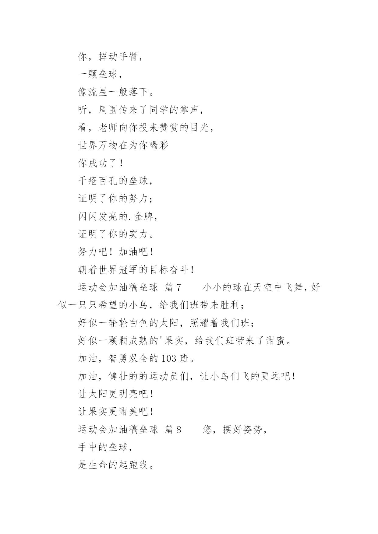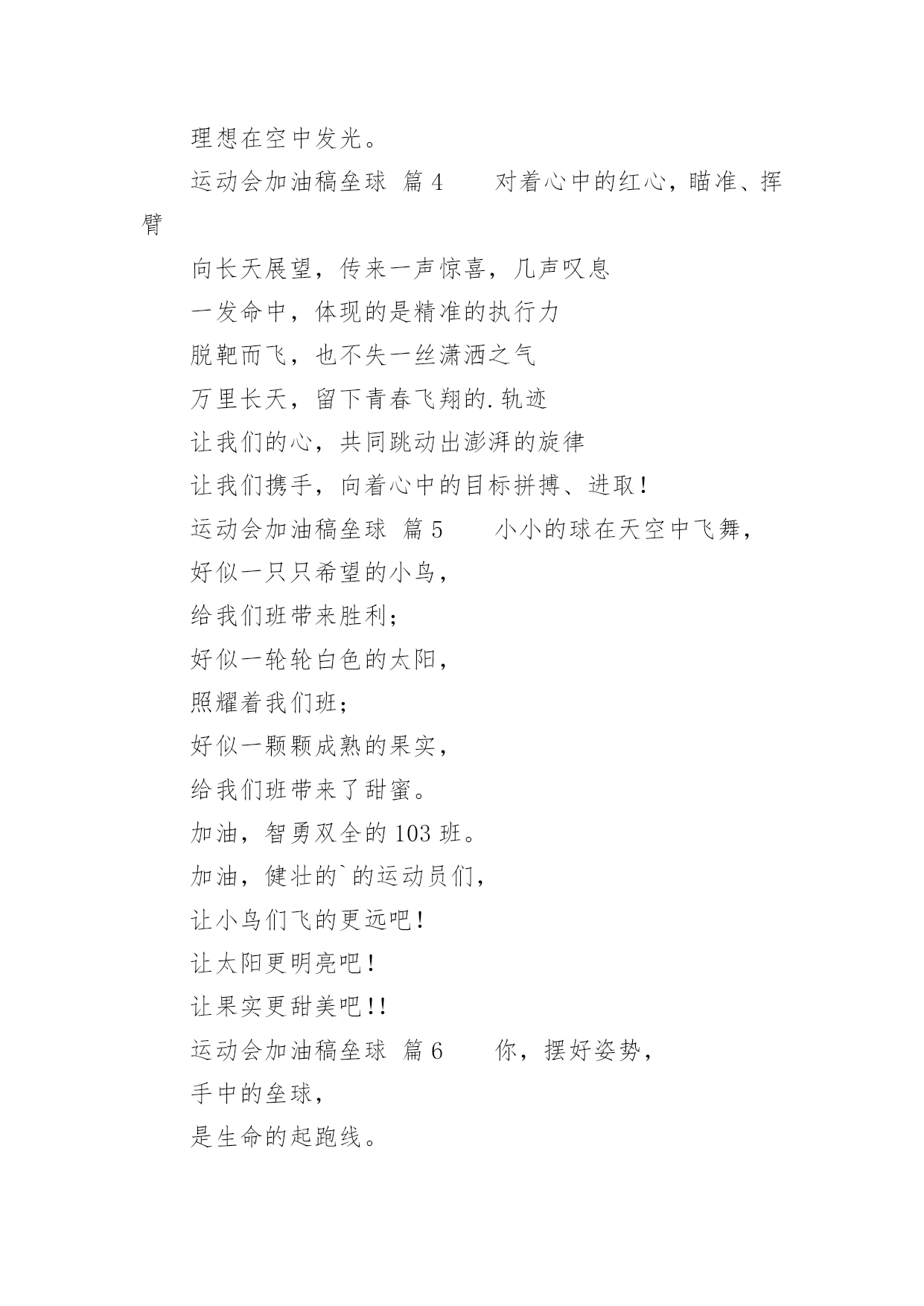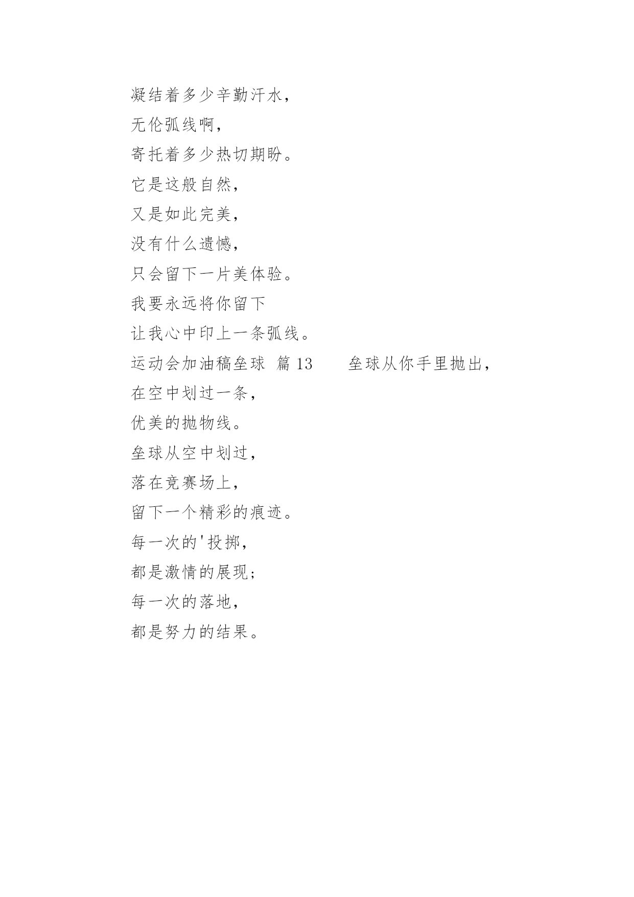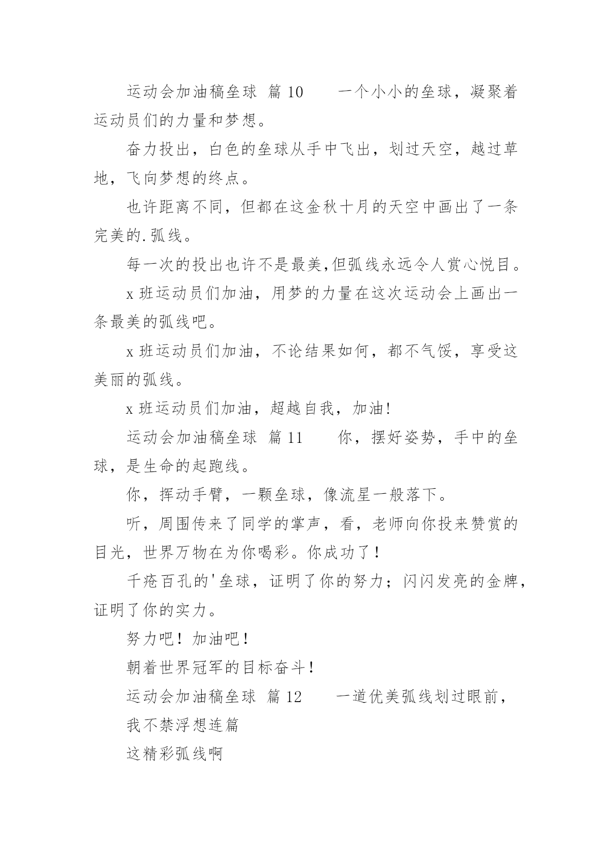 运动会加油稿垒球运动会加油稿垒球(精选13篇)随着社会一步步向前发展,我们用到加油稿的地方越来越多,借助加油稿可以激励他人的士气。那要怎么写好加油稿呢?下面是小编帮大家整理的运动会加油稿垒球,供大家参考借鉴,希望可以帮助到有需要的朋友。运动会加油稿垒球篇1垒球从你手里抛出,在空中划过一条,优美的抛物线。垒球从空中划过,落在竞赛场上,留下一个精彩的痕迹。每一次的投掷,都是激情的展现;每一次的`落地,都是努力的结果。运动会加油稿垒球篇2一个小小的'垒球,凝聚着运动员们的力量和梦想。奋力投出,白色的垒球从手中飞出,划过天空,越过草地,飞向梦想的终点。运动会加油稿垒球篇3手里紧握那沉重的垒球,那铅球上凝集了你的`希望,你的理想,汇集全身的力量,推出理想,推出希望,垒球在空中闪亮,理想在空中发光。运动会加油稿垒球篇4对着心中的红心,瞄准、挥臂向长天展望,传来一声惊喜,几声叹息一发命中,体现的是精准的执行力脱靶而飞,也不失一丝潇洒之气万里长天,留下青春飞翔的.轨迹让我们的心,共同跳动出澎湃的旋律让我们携手,向着心中的目标拼搏、进取!运动会加油稿垒球篇5小小的球在天空中飞舞,好似一只只希望的小鸟,给我们班带来胜利;好似一轮轮白色的太阳,照耀着我们班;好似一颗颗成熟的果实,给我们班带来了甜蜜。加油,智勇双全的103班。加油,健壮的`的运动员们,让小鸟们飞的更远吧!让太阳更明亮吧!让果实更甜美吧!!运动会加油稿垒球篇6你,摆好姿势,手中的垒球,是生命的起跑线。你,挥动手臂,一颗垒球,像流星一般落下。听,周围传来了同学的掌声,看,老师向你投来赞赏的目光,世界万物在为你喝彩你成功了!千疮百孔的垒球,证明了你的努力;闪闪发亮的.金牌,证明了你的实力。努力吧!加油吧!朝着世界冠军的目标奋斗!运动会加油稿垒球篇7小小的球在天空中飞舞,好似一只只希望的小鸟,给我们班带来胜利;好似一轮轮白色的太阳,照耀着我们班;好似一颗颗成熟的'果实,给我们班带来了甜蜜。加油,智勇双全的103班。加油,健壮的的运动员们,让小鸟们飞的更远吧!让太阳更明亮吧!让果实更甜美吧!运动会加油稿垒球篇8您,摆好姿势,手中的垒球,是生命的起跑线。您,挥动手臂,一颗垒球,像流星一般落下。听,周围传来了同学的掌声,看,老师向您投来赞赏的.目光,世界万物在为您喝彩您成功了!千疮百孔的垒球,证明了您的努力;闪闪发亮的金牌,证明了您的实力。努力吧!加油吧!朝着世界冠军的目标奋斗!运动会加油稿垒球篇9手里紧握那沉重的垒球,那铅球上凝集了你的希望,你的'理想,汇集全身的力量,推出理想,推出希望,垒球在空中闪亮,理想在空中发光垒球从你手里抛出,在空中划过一条,优美的抛物线。垒球从空中划过,落在竞赛场上,留下一个精彩的痕迹。每一次的投掷,都是激情的展现;每一次的落地,都是努力的结果。运动会加油稿垒球篇10一个小小的垒球,凝聚着运动员们的力量和梦想。奋力投出,白色的垒球从手中飞出,划过天空,越过草地,飞向梦想的终点。也许距离不同,但都在这金秋十月的天空中画出了一条完美的.弧线。每一次的投出也许不是最美,但弧线永远令人赏心悦目。x班运动员们加油,用梦的力量在这次运动会上画出一条最美的弧线吧。x班运动员们加油,不论结果如何,都不气馁,享受这美丽的弧线。x班运动员们加油,超越自我,加油!运动会加油稿垒球篇11你,摆好姿势,手中的垒球,是生命的起跑线。你,挥动手臂,一颗垒球,像流星一般落下。听,周围传来了同学的掌声,看,老师向你投来赞赏的目光,世界万物在为你喝彩。你成功了!千疮百孔的'垒球,证明了你的努力;闪闪发亮的金牌,证明了你的实力。努力吧!加油吧!朝着世界冠军的目标奋斗!运动会加油稿垒球篇12一道优美弧线划过眼前,我不禁浮想连篇这精彩弧线啊凝结着多少辛勤汗水,无伦弧线啊,寄托着多少热切期盼。它是这般自然,又是如此完美,没有什么遗憾,只会留下一片美体验。我要永远将你留下让我心中印上一条弧线。运动会加油稿垒球篇13垒球从你手里抛出,在空中划过一条,优美的抛物线。垒球从空中划过,落在竞赛场上,留下一个精彩的痕迹。每一次的'投掷,都是激情的展现;每一次的落地,都是努力的结果。