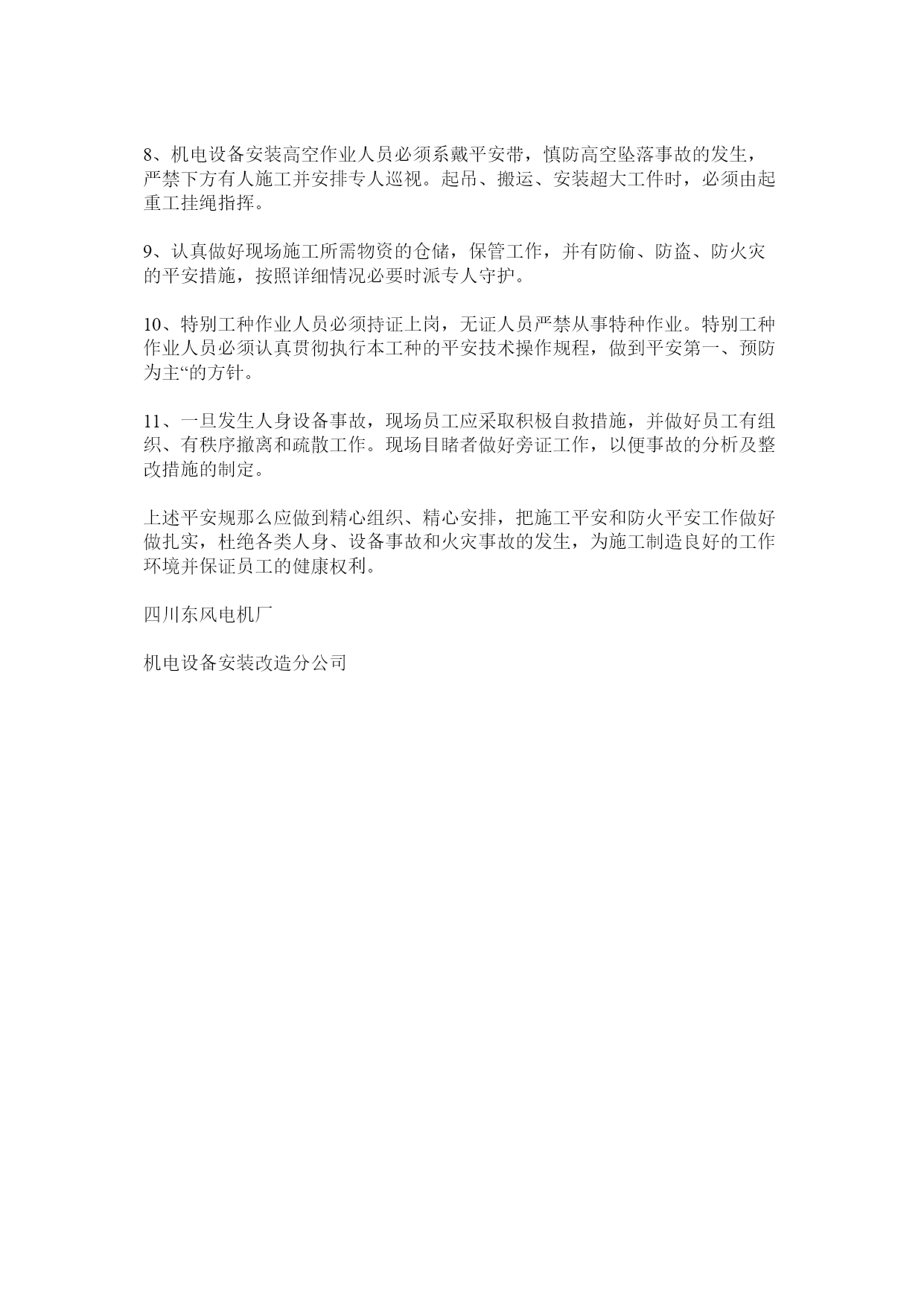 机电设备安装现场平安规那么南河一级水电站机电设备安装工程工程部按照国家机电安装和建筑安装工程的有关平安规定,同时结合安装改造分公司对南河一级水电站机电设备安装工程工程部平安要求和安装工程的特点,特制定以下机电设备安装现场的平安规那么:一、认真贯彻国家机电安装和建筑安装工作的平安法规,坚持谁主管,谁负责“的原那么,要把安装施工现场的人身、设备平安工作和防火工作放在首位,确实做到责任重于泰山“。二、实在认真做好机电设备安装现场的施工平安、防火平安和生活平安,现场的平安施工、防火平安和生活平安措施,要落实到每项详细工作中去并指定专人负责治理。三、机电设备安装工程工程经理为现场施工平安、防火平安和生活平安的第一负责人“,有着不可推脱的责任,应当认真做好员工的平安教育工作和恪守平安法规。四、机电设备安装施工平安、防火平安和员工生活平安是各项工作的头等大事,要求工程经理部负责做好督查、抽查,同时要求按以下内容严格执行;1、施工现场要有醒目的平安条幅和相关工作的警告牌,提高员工的防备认识。2、施工作业中将施工平安和防火平安责任制落实到每位员工,要求各施工组;班前、班后进展一次自检。3、在安装施工作业区域内,尤其是有易燃、易爆的场所严格留意火灾的防备工作,工程经理指派专人负责检查落实。4、保持施工作业现场和生活区域内的环境整洁,有利于员工的身心健康,严禁施工现场抽游烟。施工现场必须开拓专用平安通道,不得以任何理由擅自占用和堵塞。5、施工现场和生活住地严禁不标准的乱拉乱接电源,慎防电气火灾和触电伤人,严禁施工作业中穿拖鞋。6、进展施工作业前每个员工应穿戴好规定的劳动保护用品,防止不必要的损害。7、机电设备安装施工现场严禁燃烧杂物及垃圾。严防火灾隐患。8、机电设备安装高空作业人员必须系戴平安带,慎防高空坠落事故的发生,严禁下方有人施工并安排专人巡视。起吊、搬运、安装超大工件时,必须由起重工挂绳指挥。9、认真做好现场施工所需物资的仓储,保管工作,并有防偷、防盗、防火灾的平安措施,按照详细情况必要时派专人守护。10、特别工种作业人员必须持证上岗,无证人员严禁从事特种作业。特别工种作业人员必须认真贯彻执行本工种的平安技术操作规程,做到平安第一、预防为主“的方针。11、一旦发生人身设备事故,现场员工应采取积极自救措施,并做好员工有组织、有秩序撤离和疏散工作。现场目睹者做好旁证工作,以便事故的分析及整改措施的制定。上述平安规那么应做到精心组织、精心安排,把施工平安和防火平安工作做好做扎实,杜绝各类人身、设备事故和火灾事故的发生,为施工制造良好的工作环境并保证员工的健康权利。四川东风电机厂机电设备安装改造分公司