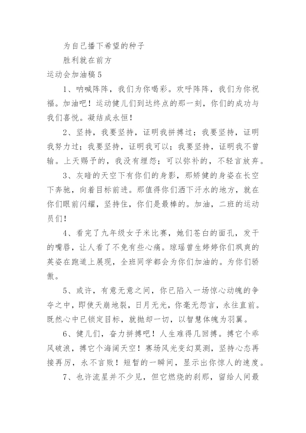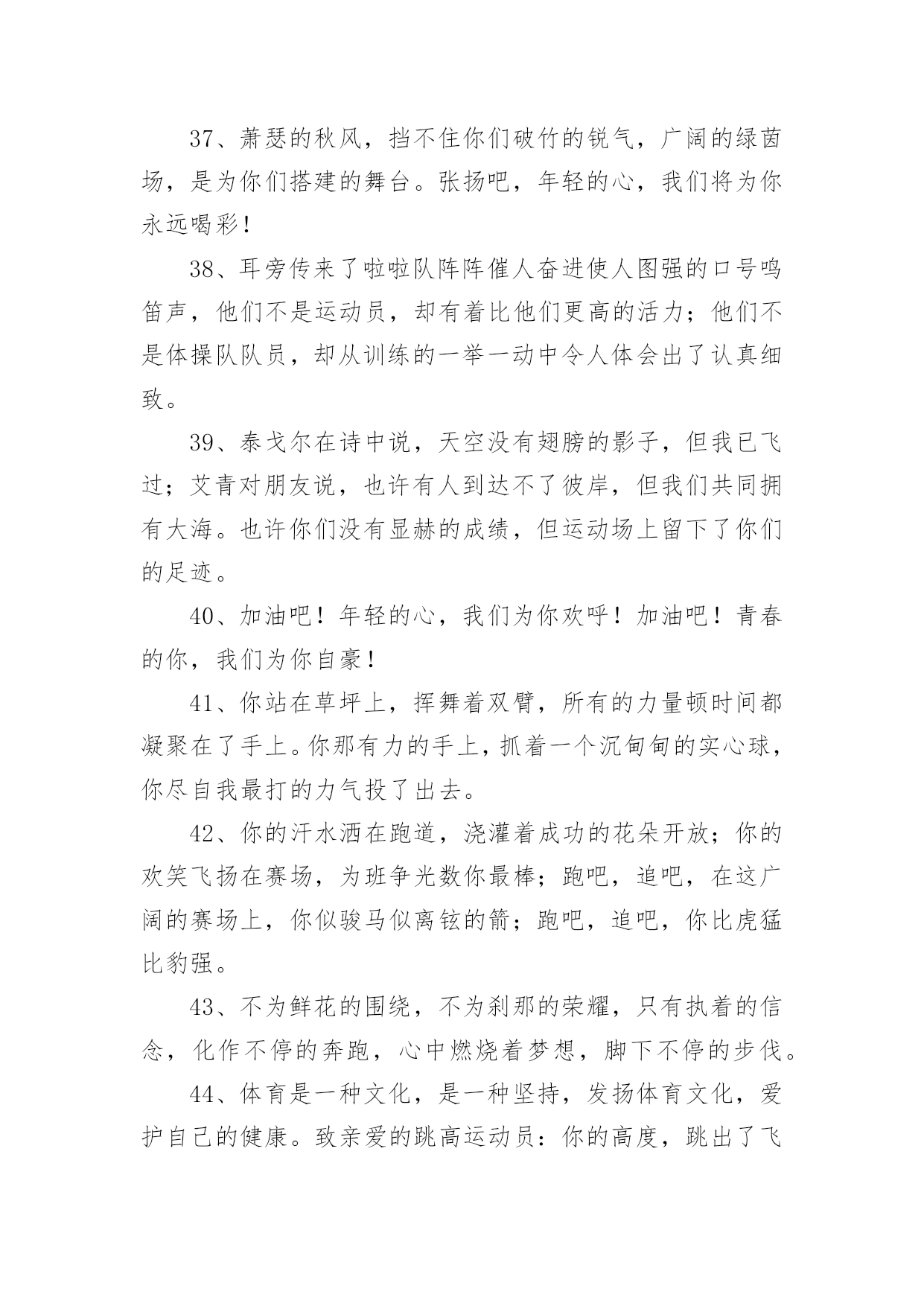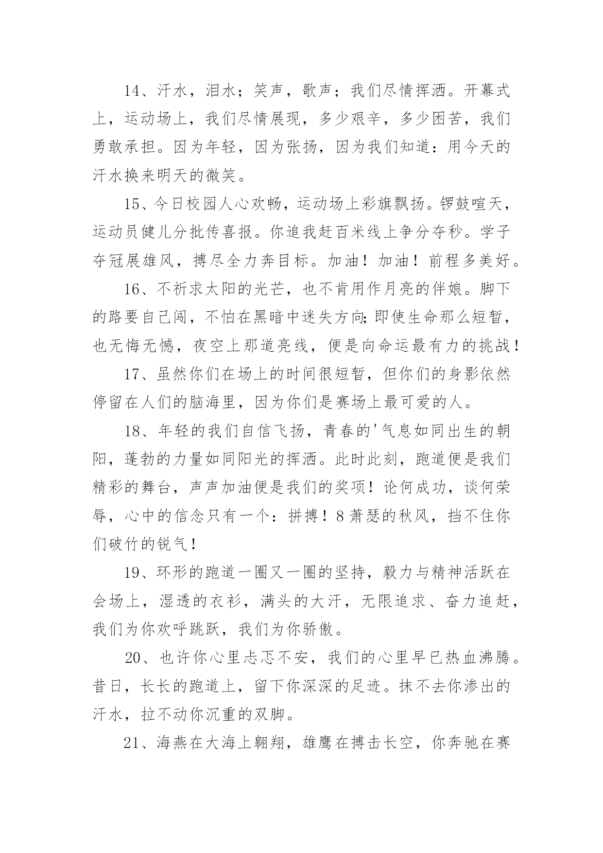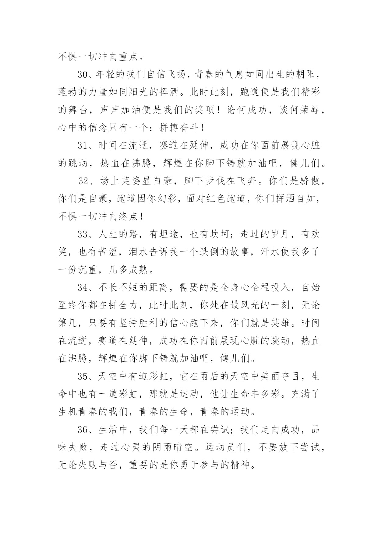 运动会加油稿运动会加油稿15篇(优)在生活中,各种加油稿频频出现,借助加油稿可以激起人的希望,催人奋进。如何写一份恰当的加油稿呢?以下是小编整理的运动会加油稿,欢迎阅读与收藏。运动会加油稿11、有多少次挥汗如雨,伤痛曾添满记忆,只因为始终相信,去拼搏才能胜利。总在鼓舞自己,要成功就得努力。热血在赛场沸腾,巨人在赛场升起。相信自己,你将赢得胜利,创造奇迹;相信自己,梦想在你手中,这是你的天地。当一切过去,你们将是第一。相信自己,你们将超越极限,超越自己!相信自己,加油吧,健儿们,相信你自己。2、让你们的身影在运动场上留下优美的风景线,让你们的雄心壮志在运动场上发挥的淋漓尽致。3、一根小小的木棒,连接的是团结和友爱;一根小小的木棒,传递的是勇气和力量;一根小小的木棒,演绎的是奋斗和拼搏;加油吧!让这激动人心的`时刻,一直回荡在我们心中!4、深深的呼吸,等待你的是艰难的1500米。相信胜利会属于你们。但在这征途上,需要你勇敢的心去面对。我们在为你加油,你是否听到了我们发自心中的呐喊?困难和胜利都在向你招手,去呀,快去呀,不要犹豫。快去击败困难、快去夺取胜利!相信你会送给我们一个汗水浸湿的微笑!5、生活中,我们每天都在尝试;我们走向成功,品味失败,走过心灵的阴雨晴空。运动员们,不要放弃尝试,无论失败与否,重要的是你勇于参与的精神,付出的背后是胜利;无论是否成功,我们永远赞美你,你们永远是我们的骄傲。运动会加油稿2晴空万里,阳光下的健儿们经过数礼拜的训练,自信的站在赛道上,这一刻他们或许等了许久,等待着一声枪响,他们就会飞奔在赛道上争夺冠军。加油,让这一刻成为你们的风光,人们为你欢呼,拼尽全力的去奔跑吧,释放你们青春的活力。或许你会感到紧张,但是日日夜夜的苦练会坚定你的心。集中你的.注意力,那终点线在向你们招手,拼尽全力去奔跑吧,这里是你们的主场,这里是你们的天地,加油,运动员,为你们的班级争光,为你们的班级夺下奖牌吧。挥洒自己的汗水,展现风采,实现自身的价值。让努力的付出在这次的运动会上都能得到更好的回报。相信自己一定能行,困难不会使你们退缩,坚持不懈,永不放弃地奔向美好的地方吧,加油,运动健儿们。可能会得不到自己想要的结果,但是你们永远是班级闪亮的星星,你们的参加让班集体变得更加优秀,为班集体增添了光彩,我为你们感到自豪。加油,操场上的你们最美、最帅,为你们喝彩,加油!运动会加油稿31.年轻的我们自信飞扬,青春的气息如同出生的朝阳,蓬勃的力量如同阳光的挥洒。此时此刻,跑道便是我们精彩的舞台,声声加油便是我们最高的奖项!论何成功,谈何荣辱,心中的信念只有一个:拼搏!萧瑟的秋风,挡不住你们破竹的锐气。2.就像花儿准备了春秋冬,就是为了红透整个盛夏。就像雪花经历了春夏秋就是为了洁白整个严冬。蹲下,昂首,出发……轻轻的一抬脚,便牵动了全场的目光潇洒的迫挥挥手,便满足了那一份无言的`等待。迎着朝阳,你们踏歌而去,背着期望,我们等待你们的归来。3.踏着春天的气息,迈着轻盈的脚步,我们迎来了心仪已久的运动会。那里就是展示自我的舞台。我们向往高山的坚忍不拔,我们渴望大海的博大精深,还有,我们更痴迷于你们的速度激情。来吧,尽情释放你的活力。你的每一次冲刺,都叩动着我们的心弦;你的每一次跨越,都吸引着我们的视线;你的每一次起跳,都绷紧我们的神经。我们为你呐喊,我们为你自豪,我们为你疯狂。4.也许流星并不少见,但它燃烧的刹那,留给人间最美丽的回忆!也许笑脸并不少见,但胜利的喜悦,总会留给世界精彩的一瞬!是的,那些以前美妙的东西只有短短的一瞬间,但那却把最辉煌的一刻留给了人间。胜利,是每个人所追求的,胜利的喜悦,是胜利与重新开始的转折,胜利是新的开始!5.虽然你们在场上的时间很短暂,但你们的身影依然停留在人们的脑海里,因为你们是赛场上最可爱的人,不为掌声的注释,不为刻意的征服,不为失败的痛苦,只有辛勤的汗水化作成功的脚步。6.坚定,执着,耐力与期望,在延伸的白色跑道中点点凝聚!力量,信念,拼搏与奋斗,在遥远的终点线上渐渐明亮!时代的强音正在你的脚下踏响。运动会加油稿4漫漫长路,的确令人忐忑然而我们知道,你们早已跑过多次早已在这红色的跑道上挥汗如雨劳累没有使你们退缩酸痛没有使你们放弃你们用毅力证明内心的渴望天气转凉,秋叶泛黄而你们便是那生生不息的`希望用倔强和坚持,用顽强的拼劲展现春的生气冬天快到了,春天还会远吗在起点焦灼等待的人儿啊扬帆起航吧,驶向春天驶向渴望,驶向美好的明天终点那里有专属于你们的土地期待你们为自己开春为自己播下希望的种子胜利就在前方运动会加油稿51、呐喊阵阵,我们为你喝彩。欢呼阵阵,我们为你祝福。加油吧!运动健儿们到达终点的那一刻,你们的成功与我们喜悦。凝结成永恒!2、坚持,我要坚持,证明我拼搏过;我要坚持,证明我努力过;我要坚持,证