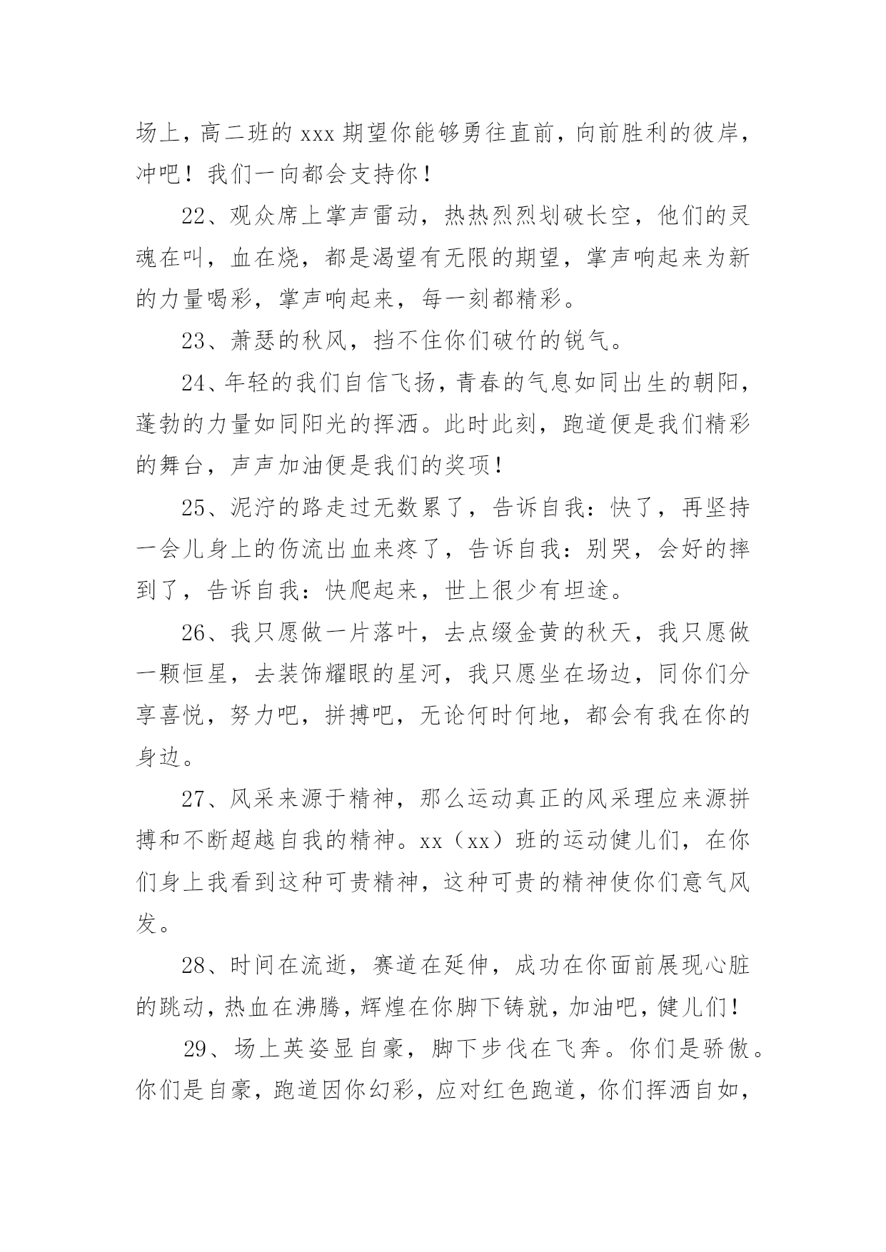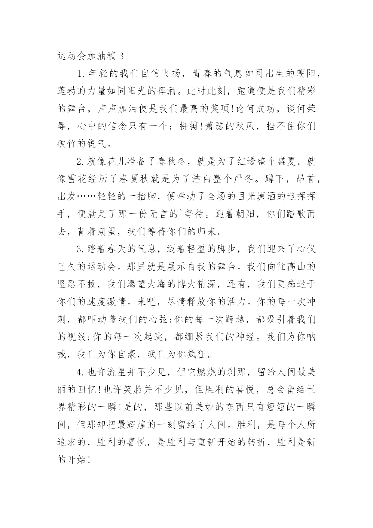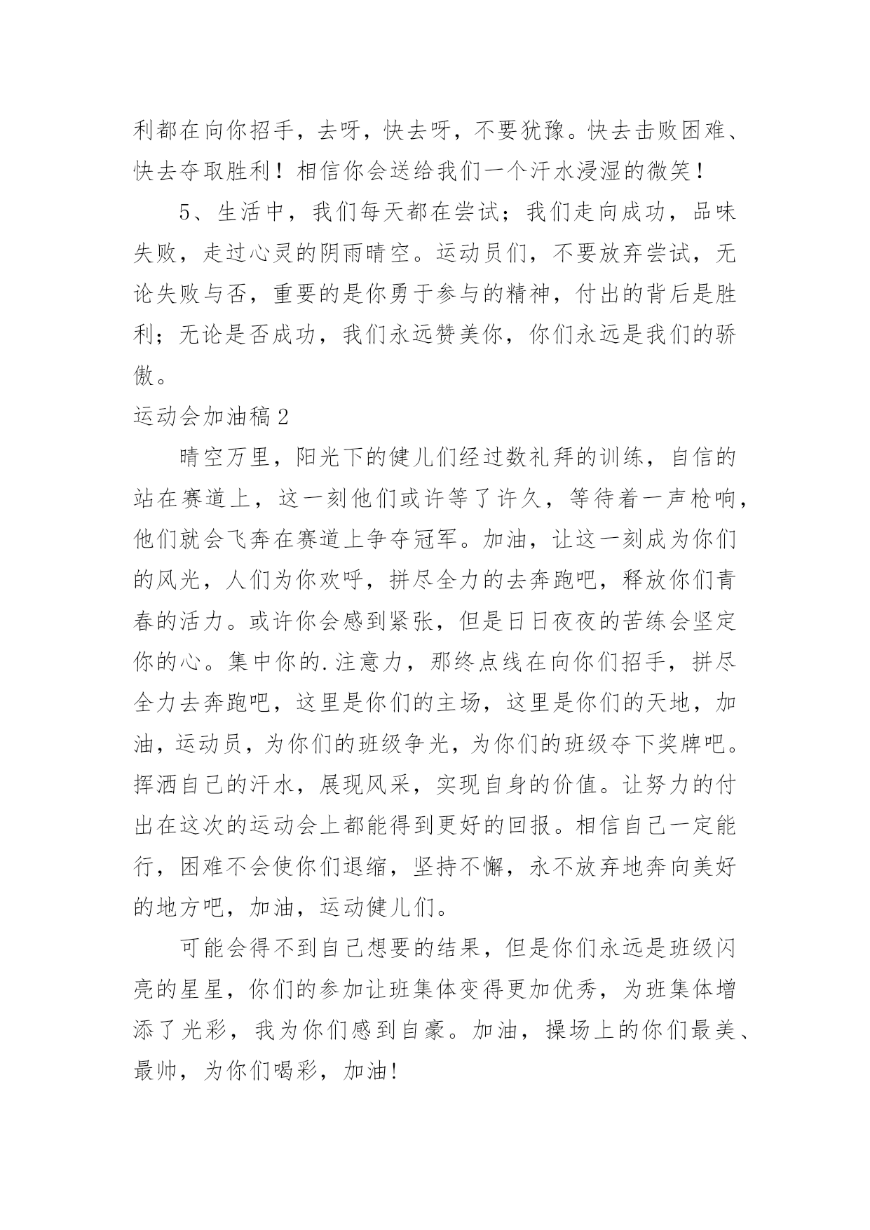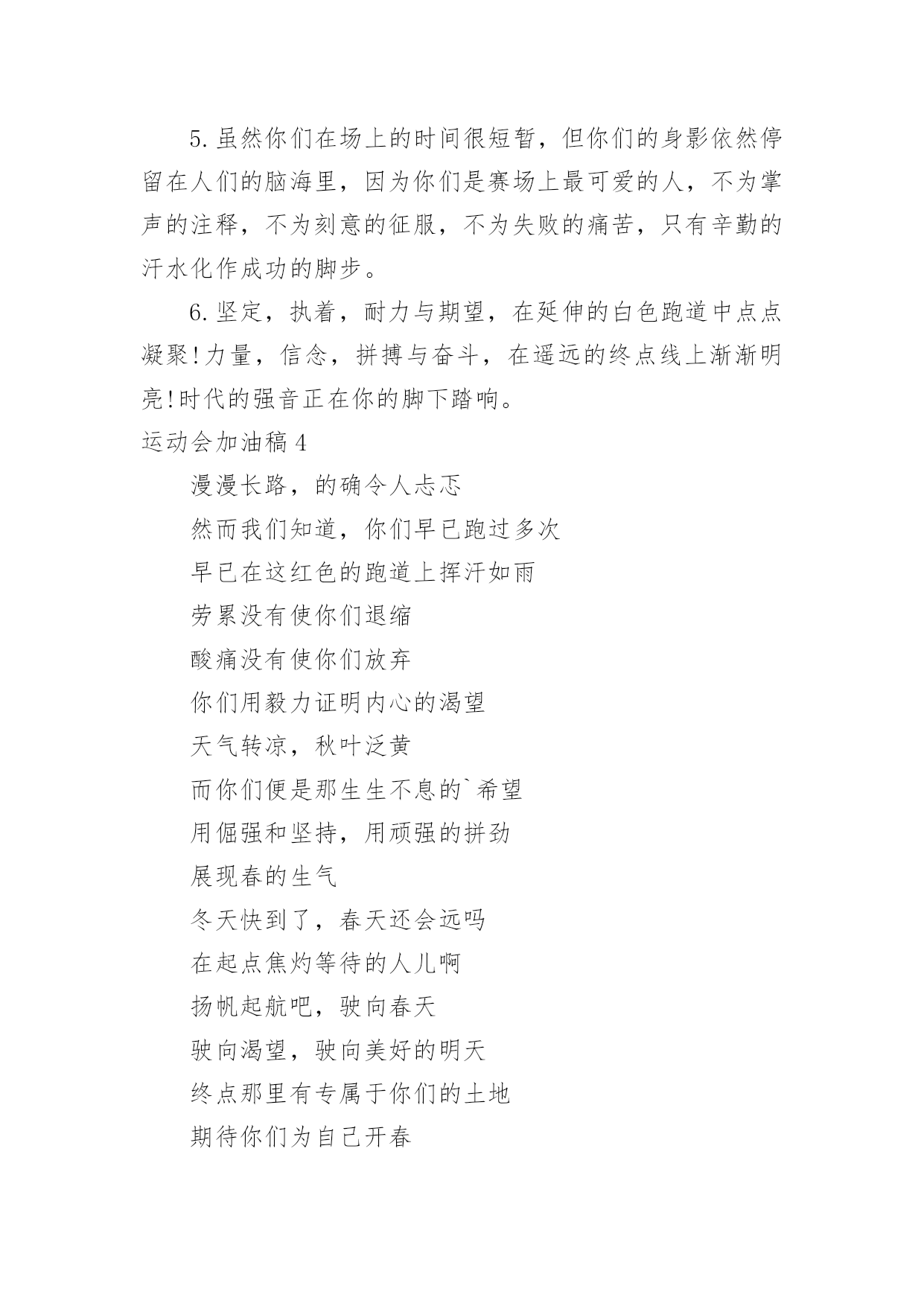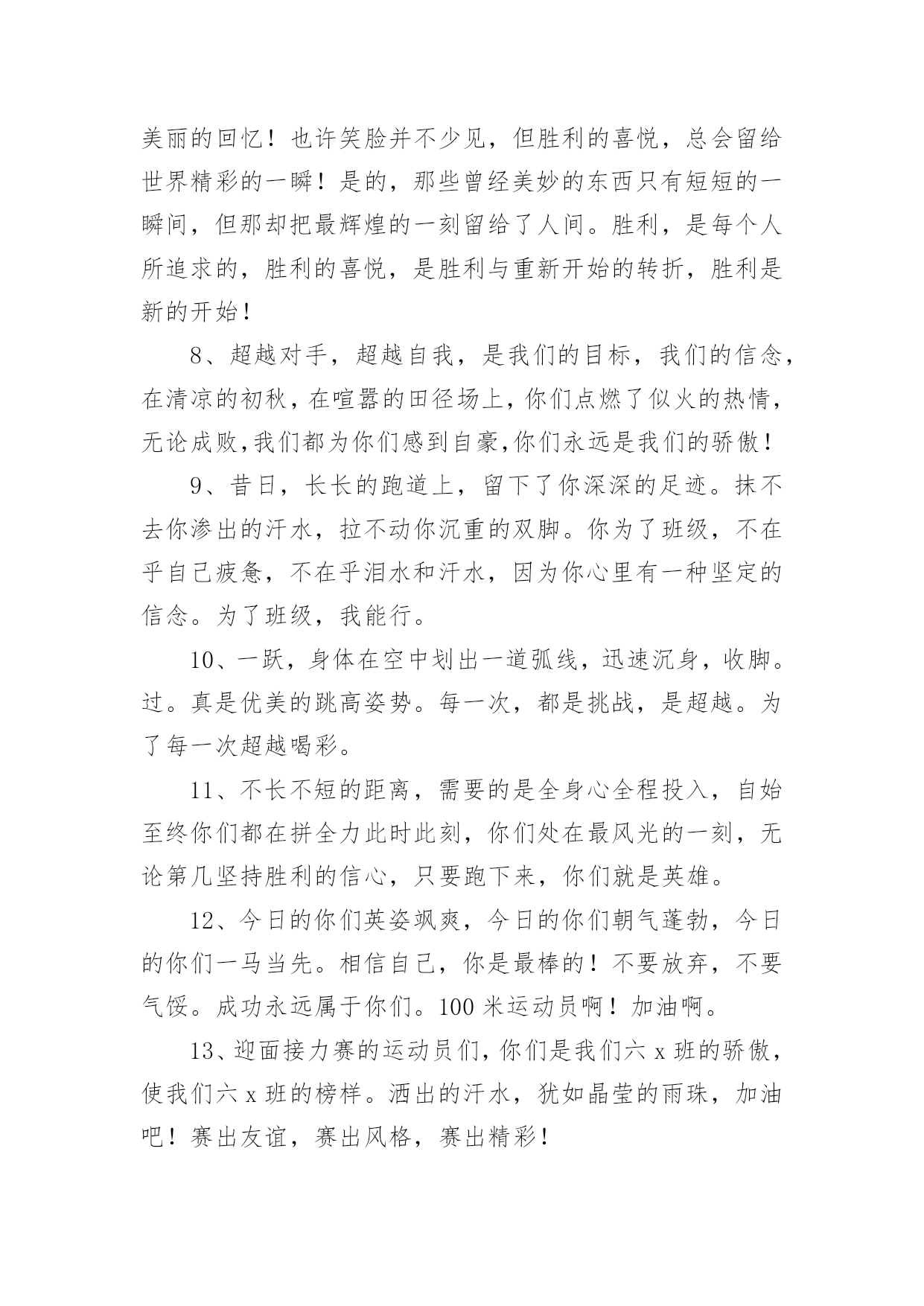 运动会加油稿运动会加油稿15篇(优)在生活中,各种加油稿频频出现,借助加油稿可以激起人的希望,催人奋进。如何写一份恰当的加油稿呢?以下是小编整理的运动会加油稿,欢迎阅读与收藏。运动会加油稿11、有多少次挥汗如雨,伤痛曾添满记忆,只因为始终相信,去拼搏才能胜利。总在鼓舞自己,要成功就得努力。热血在赛场沸腾,巨人在赛场升起。相信自己,你将赢得胜利,创造奇迹;相信自己,梦想在你手中,这是你的天地。当一切过去,你们将是第一。相信自己,你们将超越极限,超越自己!相信自己,加油吧,健儿们,相信你自己。2、让你们的身影在运动场上留下优美的风景线,让你们的雄心壮志在运动场上发挥的淋漓尽致。3、一根小小的木棒,连接的是团结和友爱;一根小小的木棒,传递的是勇气和力量;一根小小的木棒,演绎的是奋斗和拼搏;加油吧!让这激动人心的`时刻,一直回荡在我们心中!4、深深的呼吸,等待你的是艰难的1500米。相信胜利会属于你们。但在这征途上,需要你勇敢的心去面对。我们在为你加油,你是否听到了我们发自心中的呐喊?困难和胜利都在向你招手,去呀,快去呀,不要犹豫。快去击败困难、快去夺取胜利!相信你会送给我们一个汗水浸湿的微笑!5、生活中,我们每天都在尝试;我们走向成功,品味失败,走过心灵的阴雨晴空。运动员们,不要放弃尝试,无论失败与否,重要的是你勇于参与的精神,付出的背后是胜利;无论是否成功,我们永远赞美你,你们永远是我们的骄傲。运动会加油稿2晴空万里,阳光下的健儿们经过数礼拜的训练,自信的站在赛道上,这一刻他们或许等了许久,等待着一声枪响,他们就会飞奔在赛道上争夺冠军。加油,让这一刻成为你们的风光,人们为你欢呼,拼尽全力的去奔跑吧,释放你们青春的活力。或许你会感到紧张,但是日日夜夜的苦练会坚定你的心。集中你的.注意力,那终点线在向你们招手,拼尽全力去奔跑吧,这里是你们的主场,这里是你们的天地,加油,运动员,为你们的班级争光,为你们的班级夺下奖牌吧。挥洒自己的汗水,展现风采,实现自身的价值。让努力的付出在这次的运动会上都能得到更好的回报。相信自己一定能行,困难不会使你们退缩,坚持不懈,永不放弃地奔向美好的地方吧,加油,运动健儿们。可能会得不到自己想要的结果,但是你们永远是班级闪亮的星星,你们的参加让班集体变得更加优秀,为班集体增添了光彩,我为你们感到自豪。加油,操场上的你们最美、最帅,为你们喝彩,加油!运动会加油稿31.年轻的我们自信飞扬,青春的气息如同出生的朝阳,蓬勃的力量如同阳光的挥洒。此时此刻,跑道便是我们精彩的舞台,声声加油便是我们最高的奖项!论何成功,谈何荣辱,心中的信念只有一个:拼搏!萧瑟的秋风,挡不住你们破竹的锐气。2.就像花儿准备了春秋冬,就是为了红透整个盛夏。就像雪花经历了春夏秋就是为了洁白整个严冬。蹲下,昂首,出发……轻轻的一抬脚,便牵动了全场的目光潇洒的迫挥挥手,便满足了那一份无言的`等待。迎着朝阳,你们踏歌而去,背着期望,我们等待你们的归来。3.踏着春天的气息,迈着轻盈的脚步,我们迎来了心仪已久的运动会。那里就是展示自我的舞台。我们向往高山的坚忍不拔,我们渴望大海的博大精深,还有,我们更痴迷于你们的速度激情。来吧,尽情释放你的活力。你的每一次冲刺,都叩动着我们的心弦;你的每一次跨越,都吸引着我们的视线;你的每一次起跳,都绷紧我们的神经。我们为你呐喊,我们为你自豪,我们为你疯狂。4.也许流星并不少见,但它燃烧的刹那,留给人间最美丽的回忆!也许笑脸并不少见,但胜利的喜悦,总会留给世界精彩的一瞬!是的,那些以前美妙的东西只有短短的一瞬间,但那却把最辉煌的一刻留给了人间。胜利,是每个人所追求的,胜利的喜悦,是胜利与重新开始的转折,胜利是新的开始!5.虽然你们在场上的时间很短暂,但你们的身影依然停留在人们的脑海里,因为你们是赛场上最可爱的人,不为掌声的注释,不为刻意的征服,不为失败的痛苦,只有辛勤的汗水化作成功的脚步。6.坚定,执着,耐力与期望,在延伸的白色跑道中点点凝聚!力量,信念,拼搏与奋斗,在遥远的终点线上渐渐明亮!时代的强音正在你的脚下踏响。运动会加油稿4漫漫长路,的确令人忐忑然而我们知道,你们早已跑过多次早已在这红色的跑道上挥汗如雨劳累没有使你们退缩酸痛没有使你们放弃你们用毅力证明内心的渴望天气转凉,秋叶泛黄而你们便是那生生不息的`希望用倔强和坚持,用顽强的拼劲展现春的生气冬天快到了,春天还会远吗在起点焦灼等待的人儿啊扬帆起航吧,驶向春天驶向渴望,驶向美好的明天终点那里有专属于你们的土地期待你们为自己开春为自己播下希望的种子胜利就在前方运动会加油稿51、呐喊阵阵,我们为你喝彩。欢呼阵阵,我们为你祝福。加油吧!运动健儿们到达终点的那一刻,你们的成功与我们喜悦。凝结成永恒!2、坚持,我要坚持,证明我拼搏过;我要坚持,证明我努力过;我要坚持,证