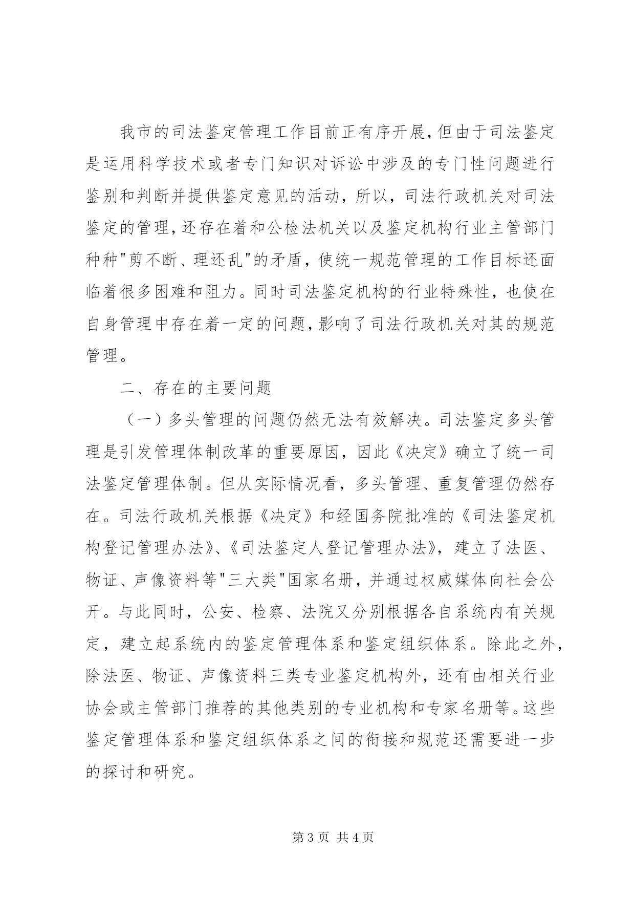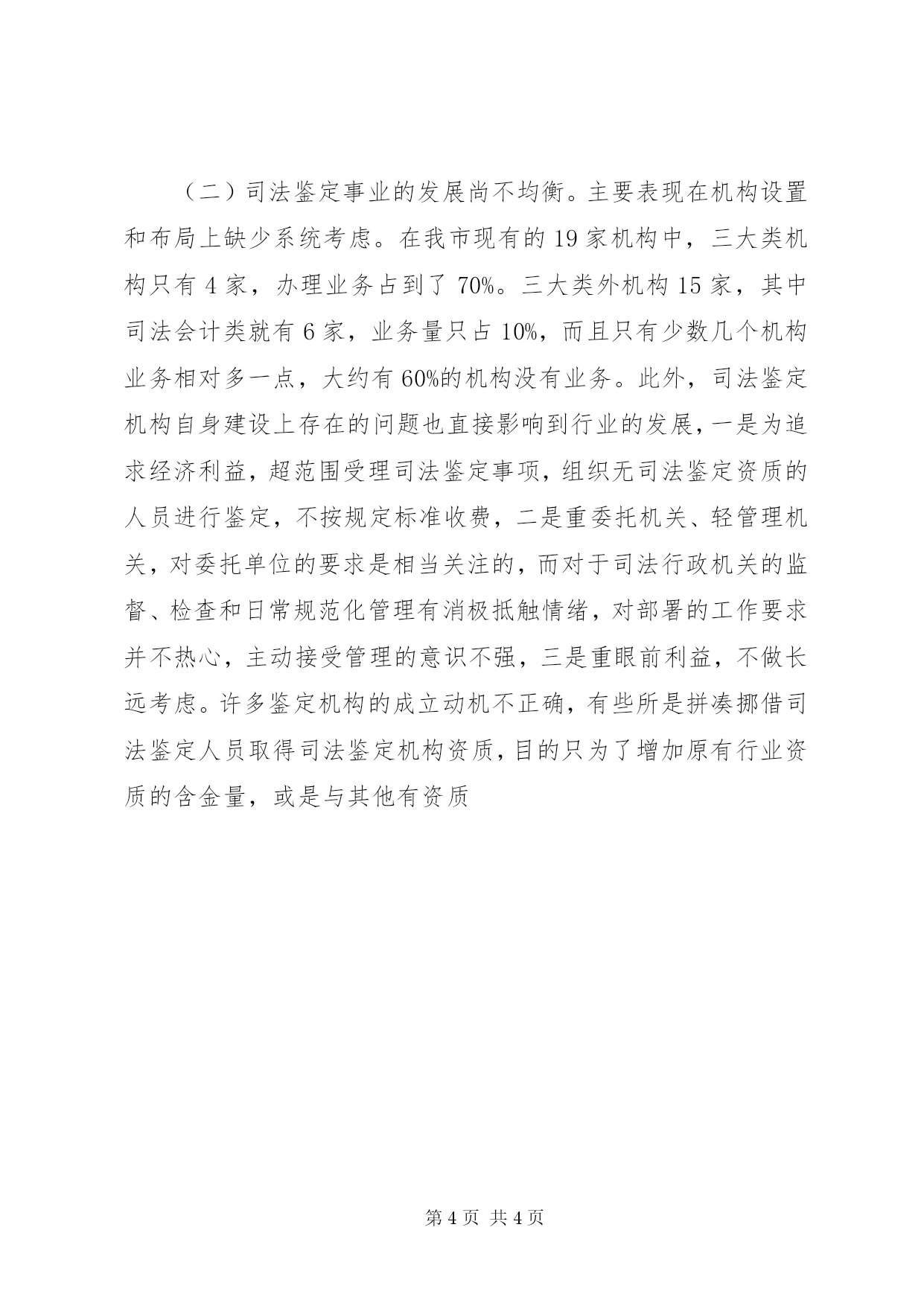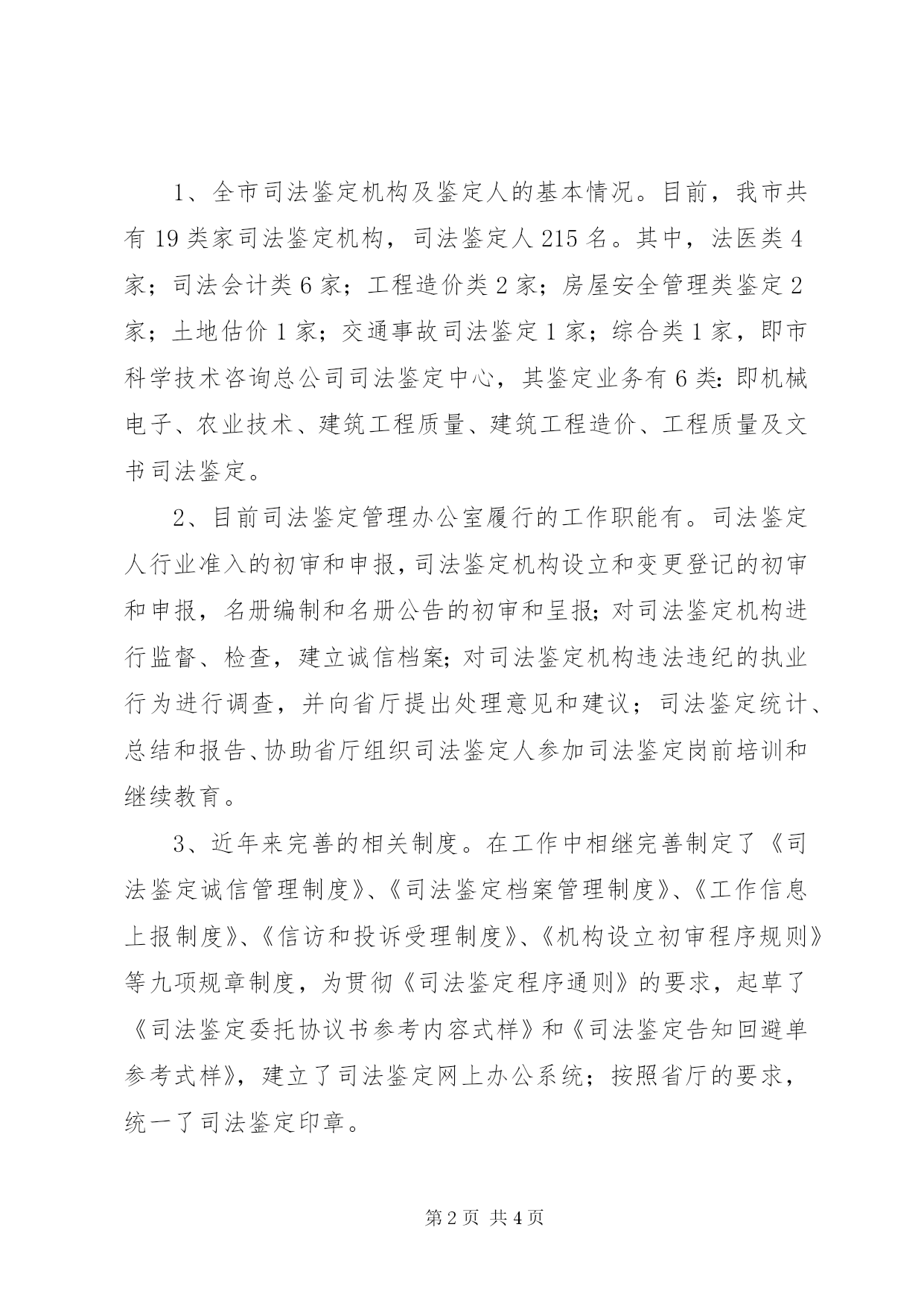 第PAGE\*Arabic\*MERGEFORMAT4页共NUMPAGES\*MERGEFORMAT4页司法鉴定机构管理现状调研报告规范管理科学指导推动司法鉴定行业新发展司法鉴定是广大人民群众处理劳动争议、医疗纠纷、交通肇事等涉及自身合法权益的事情的有效途径和手段,司法鉴定的公信力直接关系到司法审判的公平、公正,进而影响到广大人民群众对司法公正的信心和信念。近年来,随着社会各项事业的蓬勃发展,司法鉴定行业也不断的发展壮大。行业的发展对行业管理的标准提出了更高的要求,如何在新的形势下,按照新任务的要求,创新思路,加强指导,科学运作,规范管理,促进行业的健康、良性、协调发展,是司法鉴定管理部门要着重研究的课题。最近通过学习实践科学发展观活动,深切地体会到,科学发展观的要义、核心、要求、方法在指导司法鉴定管理工作上有着深远的意义,有以指导工作实践,必能收到事半功倍的效果。我们司法鉴定管理处按照科学发展观的要求,对全市司法鉴定机构的整体情况进行了调查研究,梳理总结了管理工作中的经验和存在的问题,查找到影响和制约行业科学发展的突出矛盾,决心以科学的态度去认真加以解决,使司法鉴定行业在规范的管理下、在科学的指导下,获得更好更快的发展。一、我市司法鉴定机构及管理的现状1、全市司法鉴定机构及鉴定人的基本情况。目前,我市共有19类家司法鉴定机构,司法鉴定人215名。其中,法医类4家;司法会计类6家;工程造价类2家;房屋安全管理类鉴定2家;土地估价1家;交通事故司法鉴定1家;综合类1家,即市科学技术咨询总公司司法鉴定中心,其鉴定业务有6类:即机械电子、农业技术、建筑工程质量、建筑工程造价、工程质量及文书司法鉴定。2、目前司法鉴定管理办公室履行的工作职能有。司法鉴定人行业准入的初审和申报,司法鉴定机构设立和变更登记的初审和申报,名册编制和名册公告的初审和呈报;对司法鉴定机构进行监督、检查,建立诚信档案;对司法鉴定机构违法违纪的执业行为进行调查,并向省厅提出处理意见和建议;司法鉴定统计、总结和报告、协助省厅组织司法鉴定人参加司法鉴定岗前培训和继续教育。3、近年来完善的相关制度。在工作中相继完善制定了《司法鉴定诚信管理制度》、《司法鉴定档案管理制度》、《工作信息上报制度》、《信访和投诉受理制度》、《机构设立初审程序规则》等九项规章制度,为贯彻《司法鉴定程序通则》的要求,起草了《司法鉴定委托协议书参考内容式样》和《司法鉴定告知回避单参考式样》,建立了司法鉴定网上办公系统;按照省厅的要求,统一了司法鉴定印章。我市的司法鉴定管理工作目前正有序开展,但由于司法鉴定是运用科学技术或者专门知识对诉讼中涉及的专门性问题进行鉴别和判断并提供鉴定意见的活动,所以,司法行政机关对司法鉴定的管理,还存在着和公检法机关以及鉴定机构行业主管部门种种"剪不断、理还乱"的矛盾,使统一规范管理的工作目标还面临着很多困难和阻力。同时司法鉴定机构的行业特殊性,也使在自身管理中存在着一定的问题,影响了司法行政机关对其的规范管理。二、存在的主要问题(一)多头管理的问题仍然无法有效解决。司法鉴定多头管理是引发管理体制改革的重要原因,因此《决定》确立了统一司法鉴定管理体制。但从实际情况看,多头管理、重复管理仍然存在。司法行政机关根据《决定》和经国务院批准的《司法鉴定机构登记管理办法》、《司法鉴定人登记管理办法》,建立了法医、物证、声像资料等"三大类"国家名册,并通过权威媒体向社会公开。与此同时,公安、检察、法院又分别根据各自系统内有关规定,建立起系统内的鉴定管理体系和鉴定组织体系。除此之外,除法医、物证、声像资料三类专业鉴定机构外,还有由相关行业协会或主管部门推荐的其他类别的专业机构和专家名册等。这些鉴定管理体系和鉴定组织体系之间的衔接和规范还需要进一步的探讨和研究。(二)司法鉴定事业的发展尚不均衡。主要表现在机构设置和布局上缺少系统考虑。在我市现有的19家机构中,三大类机构只有4家,办理业务占到了70%。三大类外机构15家,其中司法会计类就有6家,业务量只占10%,而且只有少数几个机构业务相对多一点,大约有60%的机构没有业务。此外,司法鉴定机构自身建设上存在的问题也直接影响到行业的发展,一是为追求经济利益,超范围受理司法鉴定事项,组织无司法鉴定资质的人员进行鉴定,不按规定标准收费,二是重委托机关、轻管理机关,对委托单位的要求是相当关注的,而对于司法行政机关的监督、检查和日常规范化管理有消极抵触情绪,对部署的工作要求并不热心,主动接受管理的意识不强,三是重眼前利益,不做长远考虑。许多鉴定机构的成立动机不正确,有些所是拼凑挪借司法鉴定人员取得司法鉴定机构资质,目的只为了增加原有行业资质的含金量,或是与其他有资质