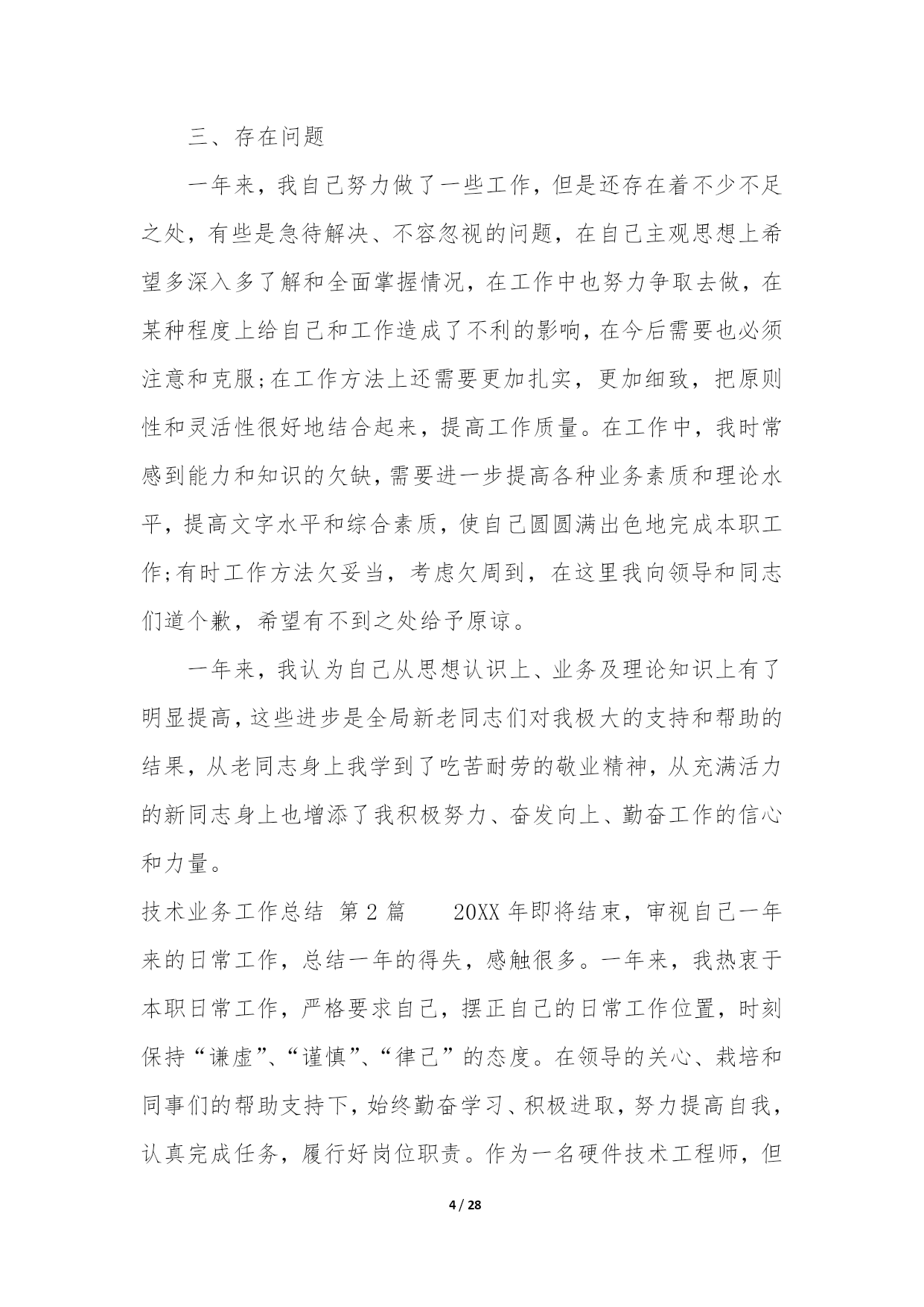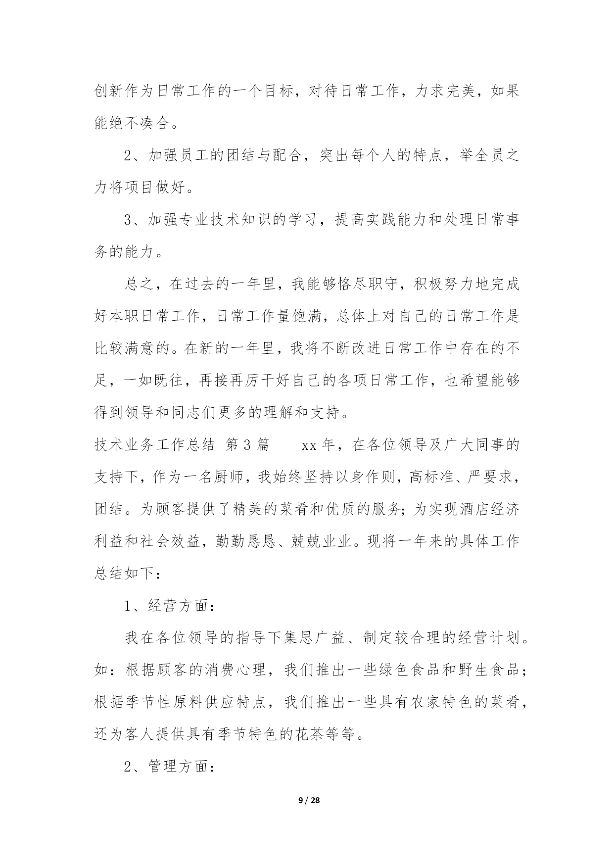 PAGE28/NUMPAGES28技术业务工作总结(推荐8篇)技术业务工作总结第1篇作为一名医生,我的工作职责就是“竭尽全力除人类之病痛,助健康之完美,维系医术的圣洁和荣誉,救死扶伤”。作为一名基层的医务工作者新手,我不辞艰辛,执着追求。乡镇医疗卫生工作是预防为主、防治结合的卫生机构,是农村三级卫生服务网的枢纽,是新型农村合作医疗制度的重要服务载体。从我到这里的x年来的实践工作,我对自己工作有很多的思考和感受,在这里我作一下总结。一、努力学习,不断提高政治理论水平和业务素质在实践的工作中,把“实践”作为检验理论的唯一标准,工作中的点点滴滴,使我越来越深刻地认识到在当今残酷的社会竞争中,知识更新的必要性,现实驱使着我,只有抓紧一切可以利用的时间努力学习,才能适应日趋激烈的竞争,胜任本职工作,否则,终究要被现实所淘汰。努力学习各种科学理论知识,学习各种法律、法规和政策,在政治上、思想上始终同组织保持一致,保证在实践工作上不偏离正确的轨道。同时,在实践中不断总结经验教训并结合本职工作,我认真学习有关国家医疗卫生政策,医疗卫生理论及技能,不断武装自己的头脑。并根据工作中实际情况,努力用理论指导实践,以客观事实为依据,解决自己在工作中遇到的问题。希望,将来回首自己所做的工作时不因碌碌无为而后悔,不因虚度时光而羞愧。二、恪尽职守,踏实工作当我们步入神圣的医学学府的时候起,我就谨庄严宣誓过:“我志愿献身医学,热爱祖国,忠于人民,恪守医德,尊师守纪,刻苦钻研,孜孜不倦,精益求精,全面发展。我决心竭尽全力除人类之病痛,助健康之完美,维系医术的圣洁和荣誉,救死扶伤,不辞艰辛,执着追求。为祖国医药卫生事业的发展和人类身心健康奋斗终生”。今天,我不断的努力着。基层医疗工作,更使用我深深的体会到,作为一名基层医疗工作者,肩负的重任和应尽的职责。按照分工,摆正位置,做到不越位,不离任,严格遵守职责,完成本职工作。只有把位置任准,把职责搞清,团结同志、诚恳待人,脚踏实地,忠于职守、勤奋工作,一步一个脚印,认认真真工作,才能完成好本职工作,做好我作为一名基层医疗报务工作者的本职工作。在门诊,往院的诊疗工作中,我随时肩负着乡人的健康。天天随诊。那怕是节假日,休息日,时时应诊。不管是在任何时候,不耽误病人治疗,不推诿病人,理智诊疗。平等待人,不欺贫爱富,关心,体贴,同情每一位就诊的患者。做到合理检查、合理治疗,合理收费。在新型农村合作医疗的诊疗中,严格按照新型农村合作医疗就诊规则,开展门诊,往院的诊疗工作。相关政策宣传及居民健康教育方面,从20xx年新合医在我乡开展以来,本人认真学习新型农村合作医疗政策及相关新型农村合医疗会议精神与新型农村合作医疗诊疗制度,组织村医生及本院职工进行培训学习,并利用赶集、到卫生室督导检查和下村体验时间及平时诊疗工作中,以发放宣传资料等方式宣传新合医工作。以电话、现场咨询及发放资料等方式,开展居民健康教育工作。安全生产维稳管理、新型农村合医疗管理。创造安全舒适的工作环境,是日常工作正常开展的前提,20xx年的本院的安全生产维稳管理,本人通过职工的会议培训,使全院职工安全意识有明显提高,通过组织安全生产隐患排查,使我院的事故发生率全年为零,保证了我院日常工作正学开展。在日常的工作中注意搜集、汇总、反馈及时上报各新型农村合医疗管理方面的意见和材料,为院领导班子更好地决策,并协助管理我院及我乡的新合医及乡村一体化工作。科室管理。20xx年本人自负责医疗科工作以来,按照分工,摆正位置,做到不越位,不离任、不超位,严格遵守职责,搞清职责,团结同志、诚恳待人,脚踏实地,忠于职守、勤奋工作。在院领导指导下,在本科室全体工作人员的支持和协助下,各项工作落实到位并扎实推进,辅助科室相互协作,使科室医疗服务工作有条不紊的开展着。通过派人进修、自我学习,集体培训等方式,使全体医务人员的诊疗知识、诊疗技能及业务水平有了明显的提高。增强了我院的诊疗报务水平。三、存在问题一年来,我自己努力做了一些工作,但是还存在着不少不足之处,有些是急待解决、不容忽视的问题,在自己主观思想上希望多深入多了解和全面掌握情况,在工作中也努力争取去做,在某种程度上给自己和工作造成了不利的影响,在今后需要也必须注意和克服;在工作方法上还需要更加扎实,更加细致,把原则性和灵活性很好地结合起来,提高工作质量。在工作中,我时常感到能力和知识的欠缺,需要进一步提高各种业务素质和理论水平,提高文字水平和综合素质,使自己圆圆满出色地完成本职工作;有时工作方法欠妥当,考虑欠周到,在这里我向领导和同志们道个歉,希望有不到之处给予原谅。一年来,我认为自己从思想认识上、业务及理论知识上有了明显提高,这些进步是全局新老同志们对我极大的支持和帮助的结果,从老同志身上我学到了吃苦耐劳的敬业
