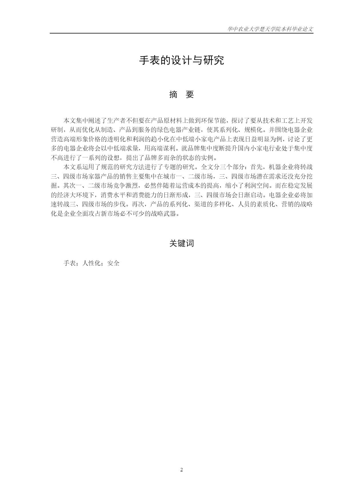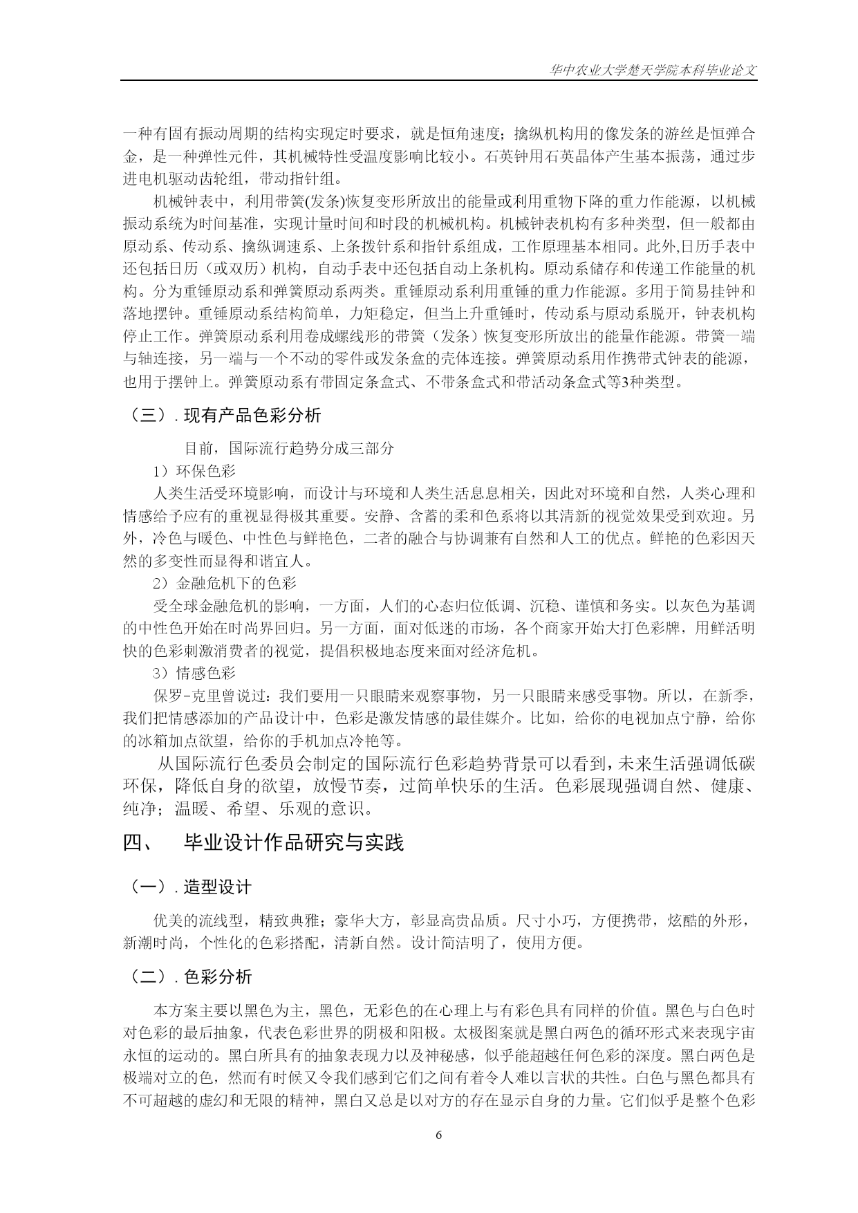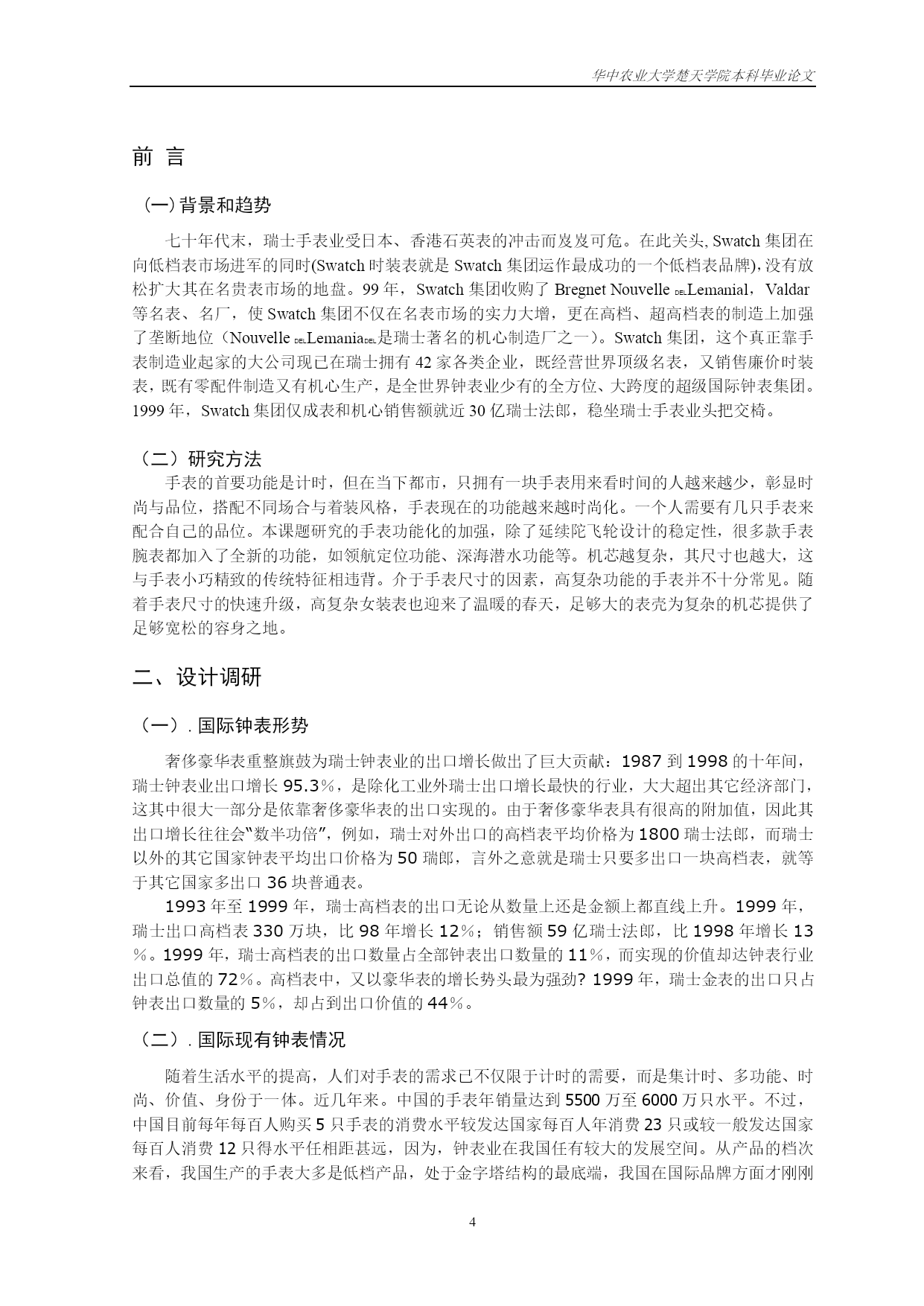 华中农业大学楚天学院本科毕业论文PAGE10华中农业大学楚天学院本科毕业论文分类号密级华中农业大学楚天学院本科毕业论文手表的设计与研究Thedesignofthewatch学生姓名:学生学号:学生专业:指导教师:华中农业大学楚天学院艺术设计传播学院二○一二年五月目录TOC\o"1-3"\h\z\uHYPERLINK"file:///C:\\Documents%20and%20Settings\\Administrator\\桌面\\智睿论文.doc"\l"_Toc325131650"摘要2HYPERLINK"file:///C:\\Documents%20and%20Settings\\Administrator\\桌面\\智睿论文.doc"\l"_Toc325131651"关键词2HYPERLINK"file:///C:\\Documents%20and%20Settings\\Administrator\\桌面\\智睿论文.doc"\l"_Toc325131652"Abstract3HYPERLINK"file:///C:\\Documents%20and%20Settings\\Administrator\\桌面\\智睿论文.doc"\l"_Toc325131653"Keywords3HYPERLINK"file:///C:\\Documents%20and%20Settings\\Administrator\\桌面\\智睿论文.doc"\l"_Toc325131654"一、前言4HYPERLINK"file:///C:\\Documents%20and%20Settings\\Administrator\\桌面\\智睿论文.doc"\l"_Toc325131659"(一)背景和趋势4HYPERLINK"file:///C:\\Documents%20and%20Settings\\Administrator\\桌面\\智睿论文.doc"\l"_Toc325131659"(二)研究方法4HYPERLINK"file:///C:\\Documents%20and%20Settings\\Administrator\\桌面\\智睿论文.doc"\l"_Toc325131656"二、设计调研6HYPERLINK"file:///C:\\Documents%20and%20Settings\\Administrator\\桌面\\智睿论文.doc"\l"_Toc325131657"(一)国际钟表形势6HYPERLINK"file:///C:\\Documents%20and%20Settings\\Administrator\\桌面\\智睿论文.doc"\l"_Toc325131658"(二)国际现有钟表情况6HYPERLINK"file:///C:\\Documents%20and%20Settings\\Administrator\\桌面\\智睿论文.doc"\l"_Toc325131659"(三)人群生活状况6HYPERLINK"file:///C:\\Documents%20and%20Settings\\Administrator\\桌面\\智睿论文.doc"\l"_Toc325131660"三、现有产品分析7HYPERLINK"file:///C:\\Documents%20and%20Settings\\Administrator\\桌面\\智睿论文.doc"\l"_Toc325131661"(一)现有产品工作原理7HYPERLINK"file:///C:\\Documents%20and%20Settings\\Administrator\\桌面\\智睿论文.doc"\l"_Toc325131662"(二)现有产品造型趋势7HYPERLINK"file:///C:\\Documents%20and%20Settings\\Administrator\\桌面\\智睿论文.doc"\l"_Toc325131663"(三)现有产品色彩趋势7HYPERLINK"file:///C:\\Documents%20and%20Settings\\Administrator\\桌面\\智睿论文.doc"\l"_Toc325131665"四、毕业设计作品研究7HYPERLINK"file:///C:\\Documents%20and%20Settings\\Administrator\\桌面\\智睿论文