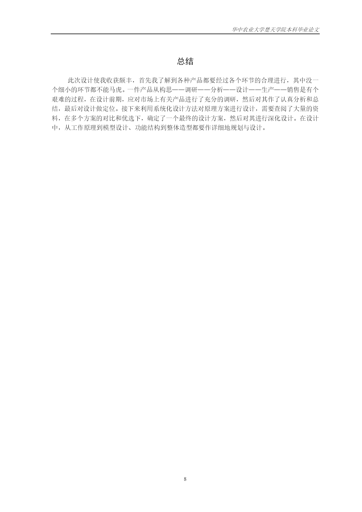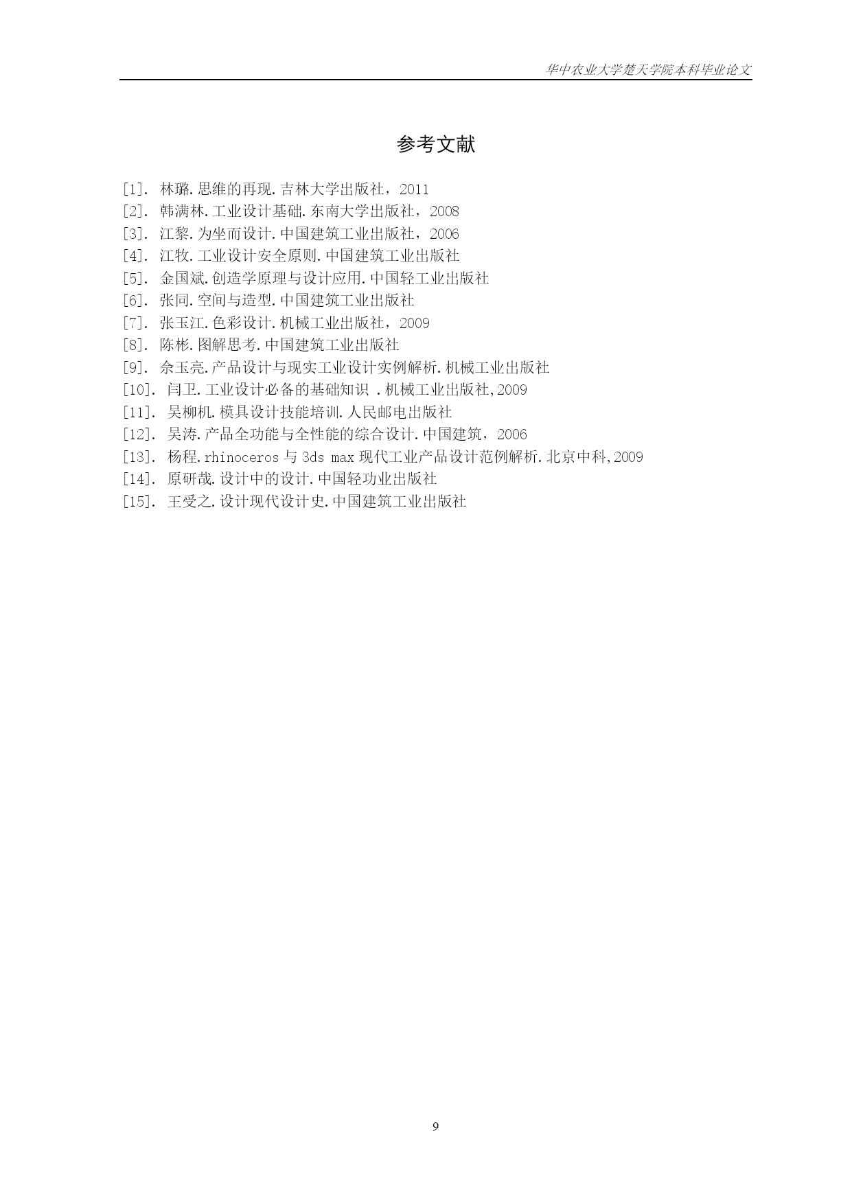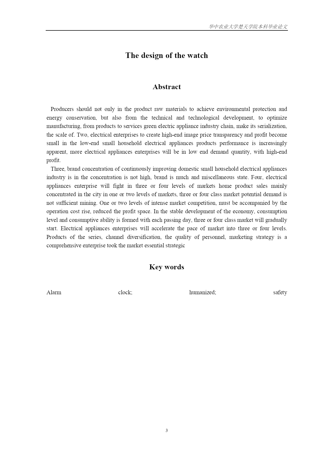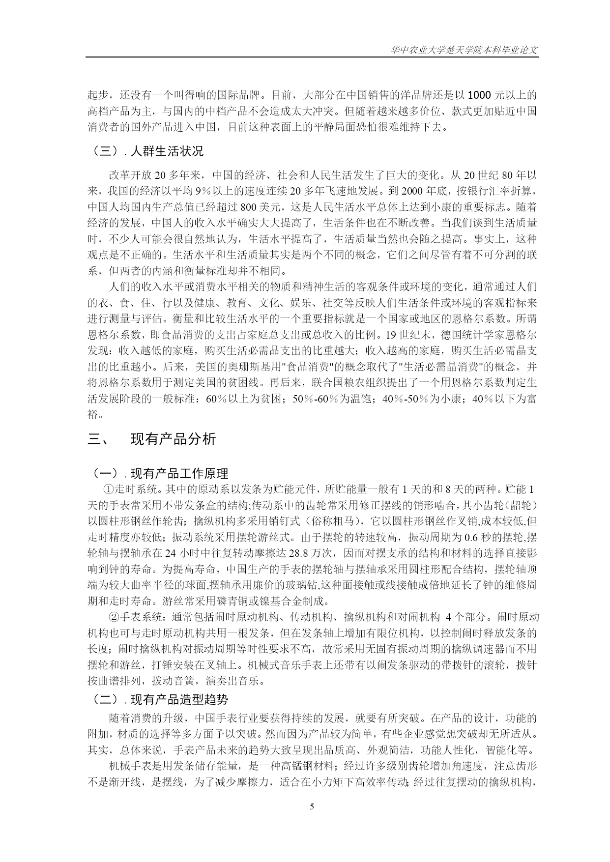 华中农业大学楚天学院本科毕业论文PAGE10华中农业大学楚天学院本科毕业论文分类号密级华中农业大学楚天学院本科毕业论文手表的设计与研究Thedesignofthewatch学生姓名:学生学号:学生专业:指导教师:华中农业大学楚天学院艺术设计传播学院二○一二年五月目录TOC\o"1-3"\h\z\uHYPERLINK"file:///C:\\Documents%20and%20Settings\\Administrator\\桌面\\智睿论文.doc"\l"_Toc325131650"摘要2HYPERLINK"file:///C:\\Documents%20and%20Settings\\Administrator\\桌面\\智睿论文.doc"\l"_Toc325131651"关键词2HYPERLINK"file:///C:\\Documents%20and%20Settings\\Administrator\\桌面\\智睿论文.doc"\l"_Toc325131652"Abstract3HYPERLINK"file:///C:\\Documents%20and%20Settings\\Administrator\\桌面\\智睿论文.doc"\l"_Toc325131653"Keywords3HYPERLINK"file:///C:\\Documents%20and%20Settings\\Administrator\\桌面\\智睿论文.doc"\l"_Toc325131654"一、前言4HYPERLINK"file:///C:\\Documents%20and%20Settings\\Administrator\\桌面\\智睿论文.doc"\l"_Toc325131659"(一)背景和趋势4HYPERLINK"file:///C:\\Documents%20and%20Settings\\Administrator\\桌面\\智睿论文.doc"\l"_Toc325131659"(二)研究方法4HYPERLINK"file:///C:\\Documents%20and%20Settings\\Administrator\\桌面\\智睿论文.doc"\l"_Toc325131656"二、设计调研6HYPERLINK"file:///C:\\Documents%20and%20Settings\\Administrator\\桌面\\智睿论文.doc"\l"_Toc325131657"(一)国际钟表形势6HYPERLINK"file:///C:\\Documents%20and%20Settings\\Administrator\\桌面\\智睿论文.doc"\l"_Toc325131658"(二)国际现有钟表情况6HYPERLINK"file:///C:\\Documents%20and%20Settings\\Administrator\\桌面\\智睿论文.doc"\l"_Toc325131659"(三)人群生活状况6HYPERLINK"file:///C:\\Documents%20and%20Settings\\Administrator\\桌面\\智睿论文.doc"\l"_Toc325131660"三、现有产品分析7HYPERLINK"file:///C:\\Documents%20and%20Settings\\Administrator\\桌面\\智睿论文.doc"\l"_Toc325131661"(一)现有产品工作原理7HYPERLINK"file:///C:\\Documents%20and%20Settings\\Administrator\\桌面\\智睿论文.doc"\l"_Toc325131662"(二)现有产品造型趋势7HYPERLINK"file:///C:\\Documents%20and%20Settings\\Administrator\\桌面\\智睿论文.doc"\l"_Toc325131663"(三)现有产品色彩趋势7HYPERLINK"file:///C:\\Documents%20and%20Settings\\Administrator\\桌面\\智睿论文.doc"\l"_Toc325131665"四、毕业设计作品研究7HYPERLINK"file:///C:\\Documents%20and%20Settings\\Administrator\\桌面\\智睿论文