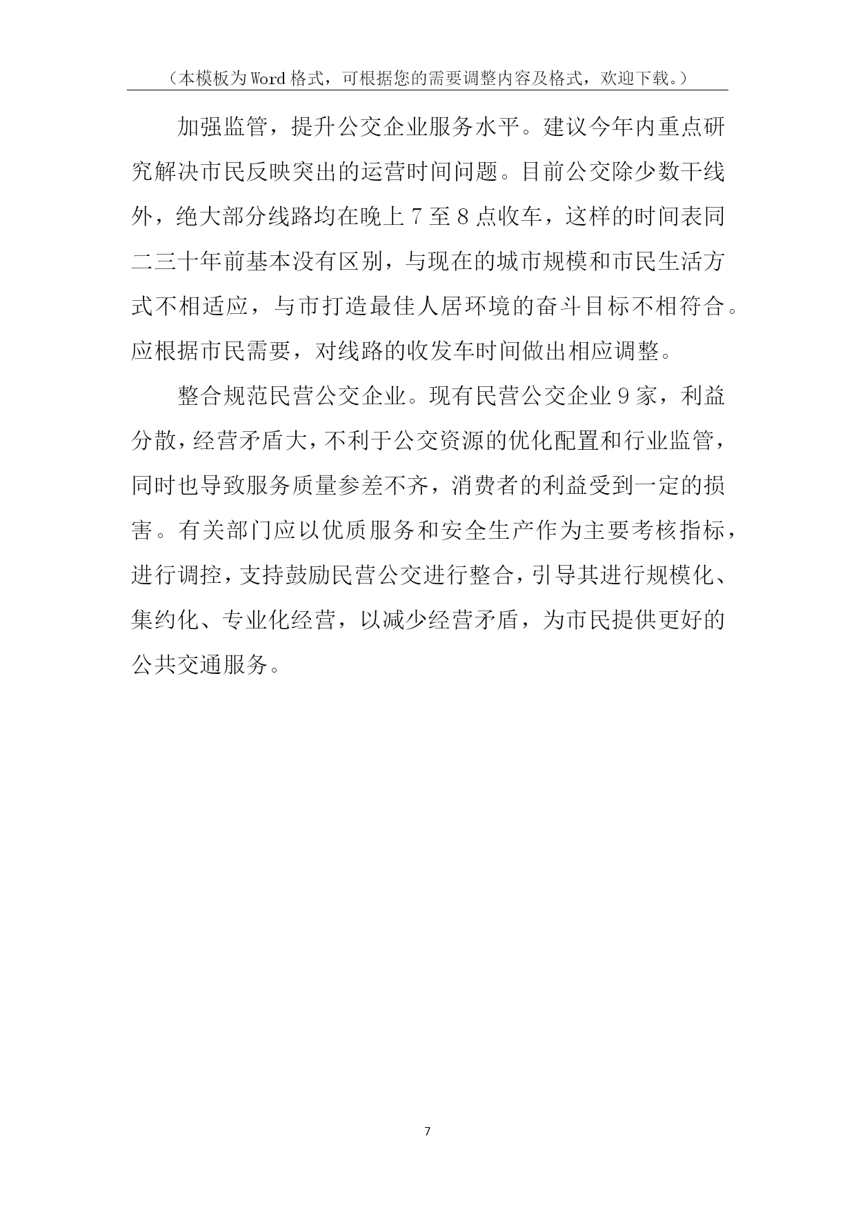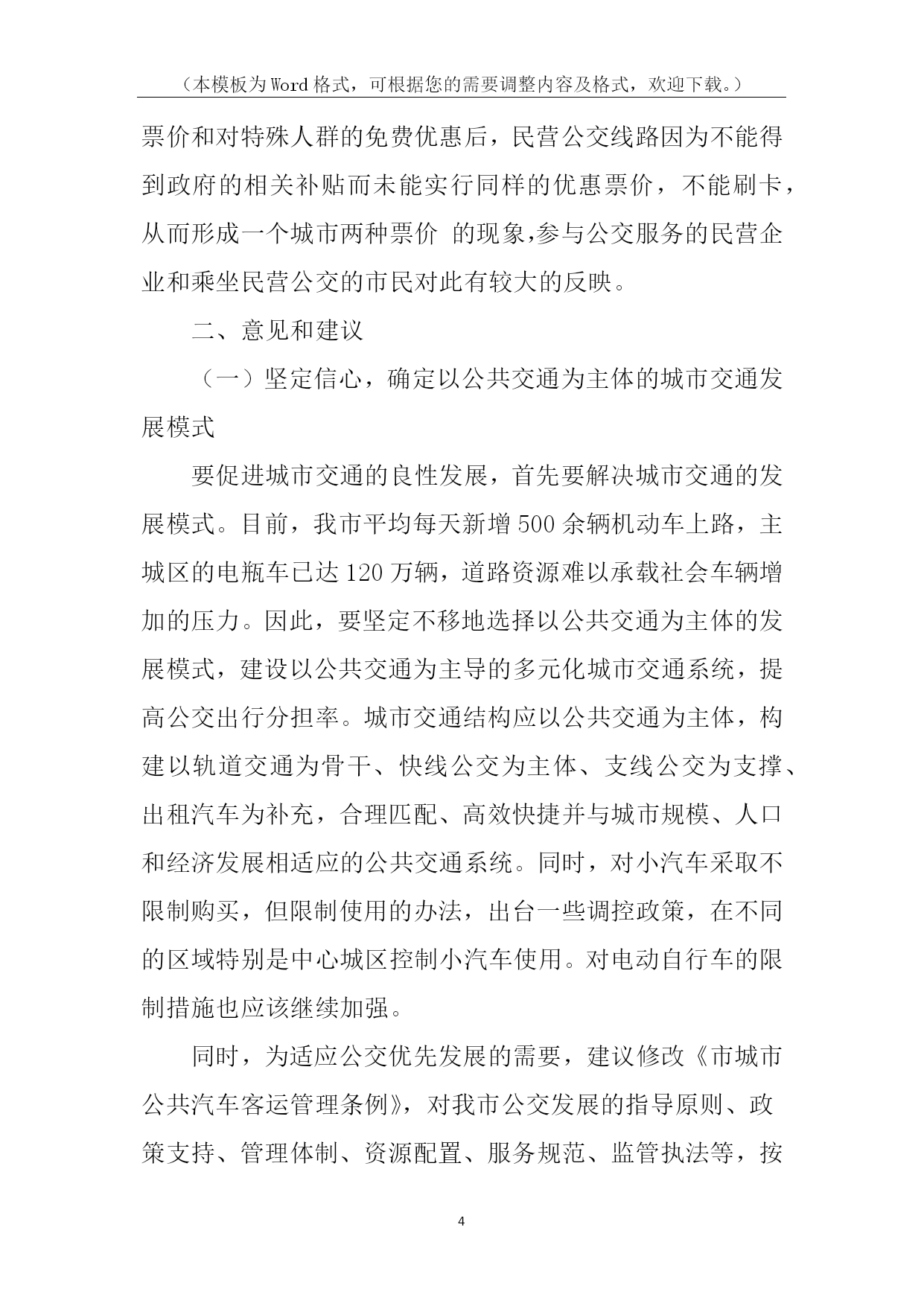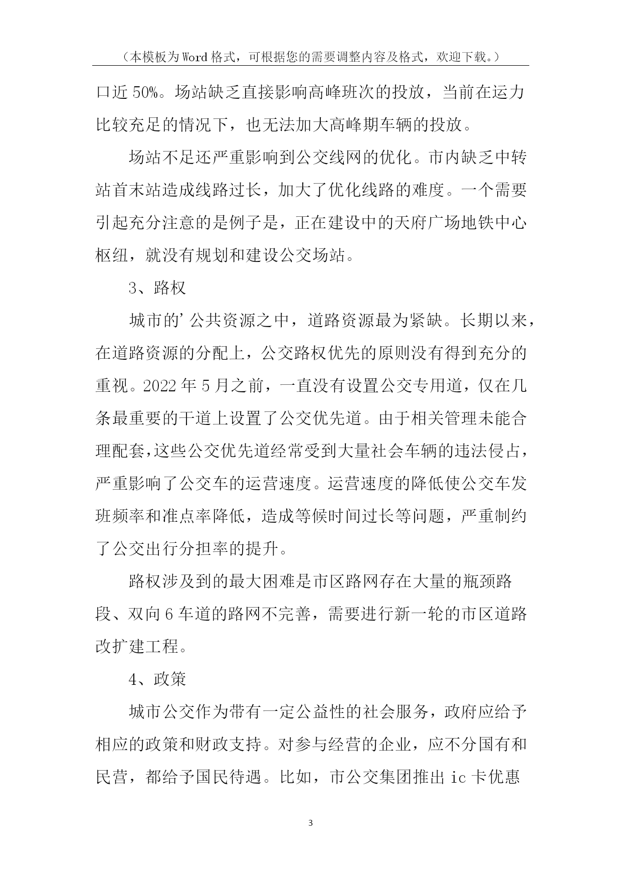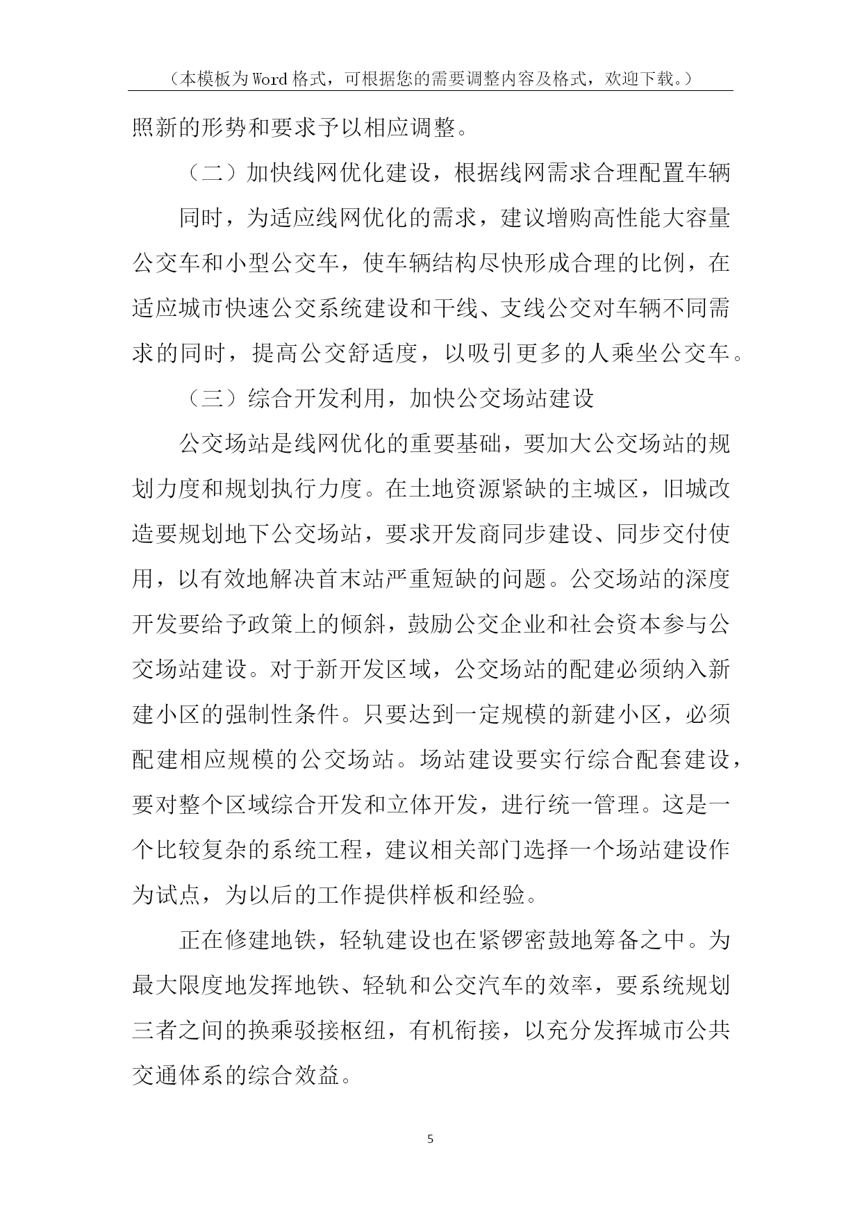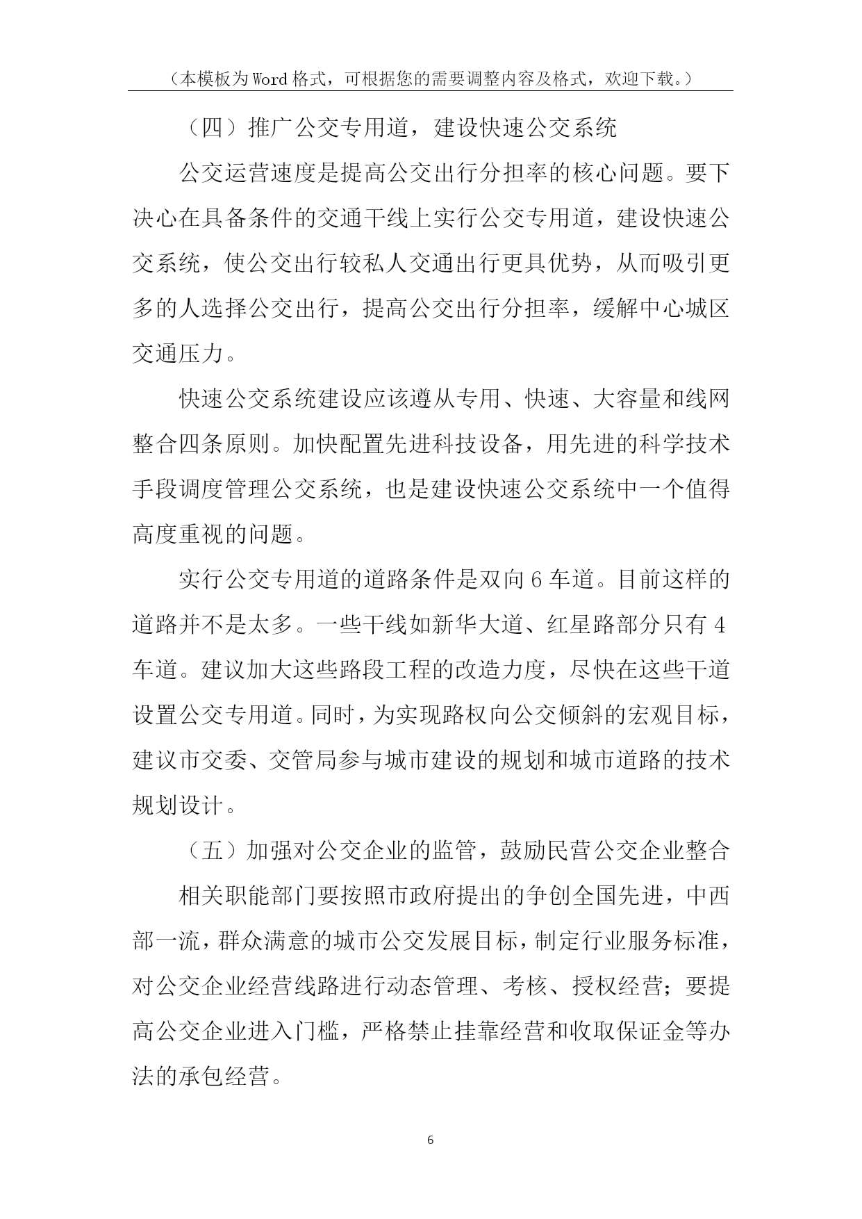 (本模板为Word格式,可根据您的需要调整内容及格式,欢迎下载。)PAGE\*MERGEFORMAT7发展公共交通的调查报告一、公交现状(一)基本情况17。67标台,城区公交出行分担率23。22%。近年来,为建设全国先进、中西部一流、群众满意的城市公交,解决市民出行难问题,市政府采取多种措施,大力发展国有主导的城市公交,取得了明显的成绩。主要做法有:1、增加车辆和调整线路,提高公交运力XX年底,中心城区公交营运车辆52202、推行ic卡票制改革,提高公交出行分担率市公交集团公司推出ic卡并相继采取一系列优惠措施后,3、试行公交专用道,提高公交运行效率(二)主要问题在国内同类大城市中,市的公交一直处于相对落后的位置。主要表现为站点远、乘车难、换乘难,从而导致公交车速度慢,准点率低。特别是在上下班高峰时期,公交车候车时间过长,车内拥挤不堪,上下车秩序混乱,群众反应强烈。公交服务水平不高导致市民大量选择私家车、自行车、电瓶车、出租车等方式出行,大大增加了本来就不堪重负的道路负荷;而道路负荷大、拥堵又导致公交车的运营速度更慢,促使更多的人选择乘坐公交车以外的方式出行,从而形成恶性循环。公共交通发展落后已经成为影响发展的重要因素。经过深入分析,我们认为制约公交发展的主要因素有线网、场站、路权、行业监管、内部管理及相关配套政策。这些因素相互影响,引发一系列问题,制约了公共交通的发展,使得市民出行难的问题长期得不到缓解。1、线网现有的城市公交线网设置不够科学,层次不分明,分工不明确。这是影响公交发展的最主要因素。主要表现为:线路重叠过多,线路走向设置不合理,对市民出行考虑不周。许多居民小区没有公交车经停,居民公交出行困难,被迫选择其他出行方式。近年来有关部门虽然已在着手进行线网优化,但尚未达到科学规划、合理设置的标准。2、场站公交场站建设滞后,是影响公交发展的瓶颈。长期以来,城市建设中对公交场站的规划和建设严重不足。新开发区域的公交场站建设常被忽视,旧城区原有的公交场站也被大量挤占挪作他用。一环路以内现在已经没有一个公交场站。市公交集团近年来车辆增加很快,但场站建设滞后,目前使用场站仅50个,计835余亩,按国家建设部有关标准计算缺口近50%。场站缺乏直接影响高峰班次的投放,当前在运力比较充足的情况下,也无法加大高峰期车辆的投放。场站不足还严重影响到公交线网的优化。市内缺乏中转站首末站造成线路过长,加大了优化线路的难度。一个需要引起充分注意的是例子是,正在建设中的天府广场地铁中心枢纽,就没有规划和建设公交场站。3、路权城市的'公共资源之中,道路资源最为紧缺。长期以来,在道路资源的分配上,公交路权优先的原则没有得到充分的重视。2022年5月之前,一直没有设置公交专用道,仅在几条最重要的干道上设置了公交优先道。由于相关管理未能合理配套,这些公交优先道经常受到大量社会车辆的违法侵占,严重影响了公交车的运营速度。运营速度的降低使公交车发班频率和准点率降低,造成等候时间过长等问题,严重制约了公交出行分担率的提升。路权涉及到的最大困难是市区路网存在大量的瓶颈路段、双向6车道的路网不完善,需要进行新一轮的市区道路改扩建工程。4、政策城市公交作为带有一定公益性的社会服务,政府应给予相应的政策和财政支持。对参与经营的企业,应不分国有和民营,都给予国民待遇。比如,市公交集团推出ic卡优惠票价和对特殊人群的免费优惠后,民营公交线路因为不能得到政府的相关补贴而未能实行同样的优惠票价,不能刷卡,从而形成一个城市两种票价的现象,参与公交服务的民营企业和乘坐民营公交的市民对此有较大的反映。二、意见和建议(一)坚定信心,确定以公共交通为主体的城市交通发展模式要促进城市交通的良性发展,首先要解决城市交通的发展模式。目前,我市平均每天新增500余辆机动车上路,主城区的电瓶车已达120万辆,道路资源难以承载社会车辆增加的压力。因此,要坚定不移地选择以公共交通为主体的发展模式,建设以公共交通为主导的多元化城市交通系统,提高公交出行分担率。城市交通结构应以公共交通为主体,构建以轨道交通为骨干、快线公交为主体、支线公交为支撑、出租汽车为补充,合理匹配、高效快捷并与城市规模、人口和经济发展相适应的公共交通系统。同时,对小汽车采取不限制购买,但限制使用的办法,出台一些调控政策,在不同的区域特别是中心城区控制小汽车使用。对电动自行车的限制措施也应该继续加强。同时,为适应公交优先发展的需要,建议修改《市城市公共汽车客运管理条例》,对我市公交发展的指导原则、政策支持、管理体制、资源配置、服务规范、监管执法等,按照新的形势和要求予以相应调整。(二)加快线网优化建设,根据线网需求合理配置车辆同时,为适应线网优化的需求,建议增购高性能大容量公交车和小型公交车,使车辆结构尽快形成合理