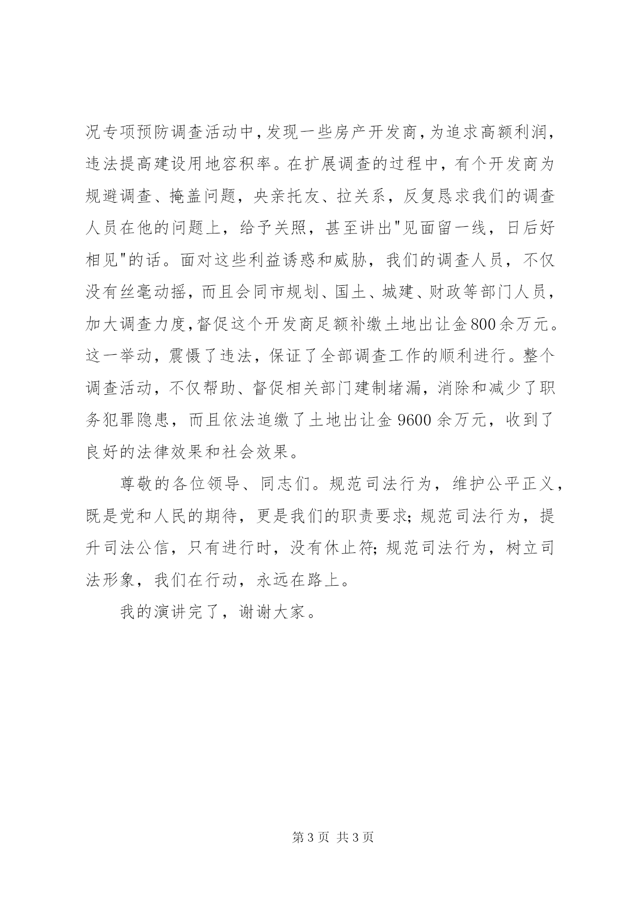 第PAGE\*Arabic\*MERGEFORMAT3页共NUMPAGES\*MERGEFORMAT3页检察院规范司法行为演讲稿规范司法行为我们在行动市院职务犯罪预防局张诗童尊敬的各位领导、同志们:我宣讲的题目是《规范司法行为,我们在行动》。在检察系统,有一支专门从事职务犯罪预防的检察官队伍,他们送法上门,释法说理,传播廉政文化,努力为干部清正、政府清廉、政治清明注入精神"正能量";他们注重调查,未雨绸缪,为反腐倡廉建言献策,努力为预防和减少职务犯罪构筑法治"防火墙";他们立足职能,强化预防监督,用实际行动诠释着检察机关惩防并举、标本兼治的司法理念,彰显着人民检察官立检为公、执法为民的良好形象。也许,在有些人看来,预防工作无非是讲个课、搞搞预防宣传,或者搞个犯罪分析、开展个预防调查、发发检察建议,既无直面职犯罪的斗智斗勇,也无办案目标的压力和挑战,日常工作非常轻松、简单,规范司法行为,似乎也和预防工作没有多少关联。殊不知,无论是警示教育宣讲、典型案例剖析,还是专项预防调查和对策建议研究,无论是介入监督,还是预防咨询,每一项业务,都有明确的程序要求和严格的行为规范。就拿看似简单平常的警示教育来讲,绝对不能千篇一律,泛泛而谈。为了讲好每一堂课,真正使我们的宣讲能够打动听众,引起思想共鸣和心灵震撼,我们的预防干警往往要加班加点,突击熟悉相关行业的法律法规,收集、分析相关案例、数据,揭示职务犯罪的行业特点和发案规律,指出原因、危害,提出预防告诫。所有这一切,都需要投入巨大的精力,付出大量的心血。然而,为了传播和培育检察特色预防文化,让更多的公职人员知法守法,廉洁从政,远离职务犯罪,我们的预防干警付出再多,也无怨无悔。如果说,预防宣教是一种"务虚"的话,那么,预防调查,就是"虚实结合、虚功实做"的一项专门工作,是检察预防专业化的最好体现,程序严、要求高。从预防调查的选题、审批、启动、备案,到宏观分析、深入调查、对策研究和调查成果的转化、应用,每一步、每一个阶段都有明确的考量标准和严格程序规范。为了查清某一领域、某项公共事务管理中的廉政风险和职务犯罪隐患,提出符合实际的检察建议,拿出"有分量、可转化"的调查报告,都需要我们的调查人员调阅大量资料,走访、座谈大量相关人员,甚至还要组织一些专业性的现场测量、勘查勘验等等,所有这一系列工作,哪一步都不能马虎草率,不能有半点的敷衍应付。与此同时,因为专项预防调查可能会触及到一些人的既得利益,在调查过程中,也会遇到一些干扰和阻力,也会遭遇"公与私、情与法"的较量。记得在开展城市建设用地容积率调整情况专项预防调查活动中,发现一些房产开发商,为追求高额利润,违法提高建设用地容积率。在扩展调查的过程中,有个开发商为规避调查、掩盖问题,央亲托友、拉关系,反复恳求我们的调查人员在他的问题上,给予关照,甚至讲出"见面留一线,日后好相见"的话。面对这些利益诱惑和威胁,我们的调查人员,不仅没有丝毫动摇,而且会同市规划、国土、城建、财政等部门人员,加大调查力度,督促这个开发商足额补缴土地出让金800余万元。这一举动,震慑了违法,保证了全部调查工作的顺利进行。整个调查活动,不仅帮助、督促相关部门建制堵漏,消除和减少了职务犯罪隐患,而且依法追缴了土地出让金9600余万元,收到了良好的法律效果和社会效果。尊敬的各位领导、同志们。规范司法行为,维护公平正义,既是党和人民的期待,更是我们的职责要求;规范司法行为,提升司法公信,只有进行时,没有休止符;规范司法行为,树立司法形象,我们在行动,永远在路上。我的演讲完了,谢谢大家。