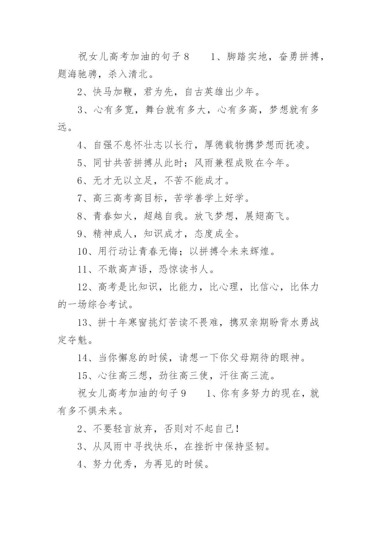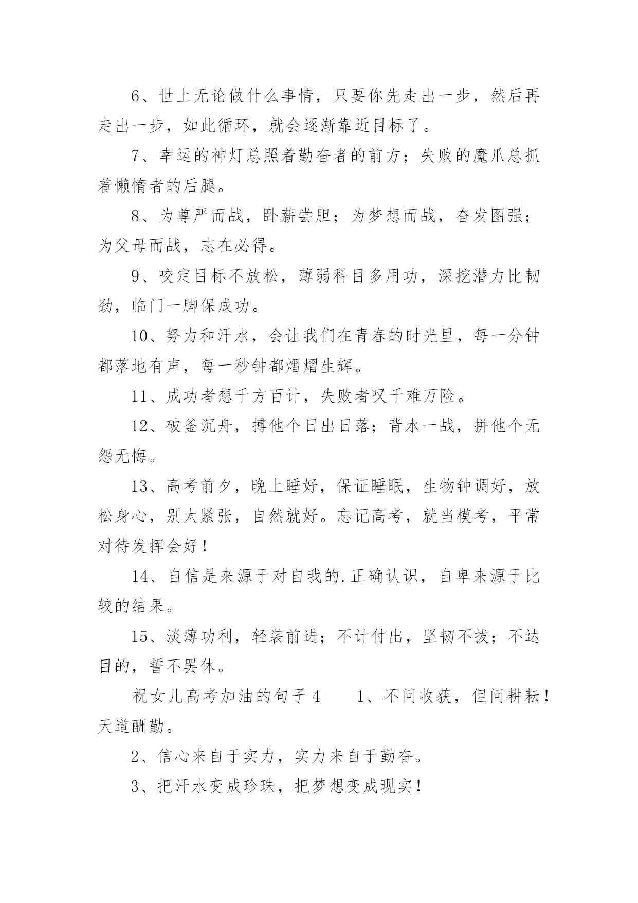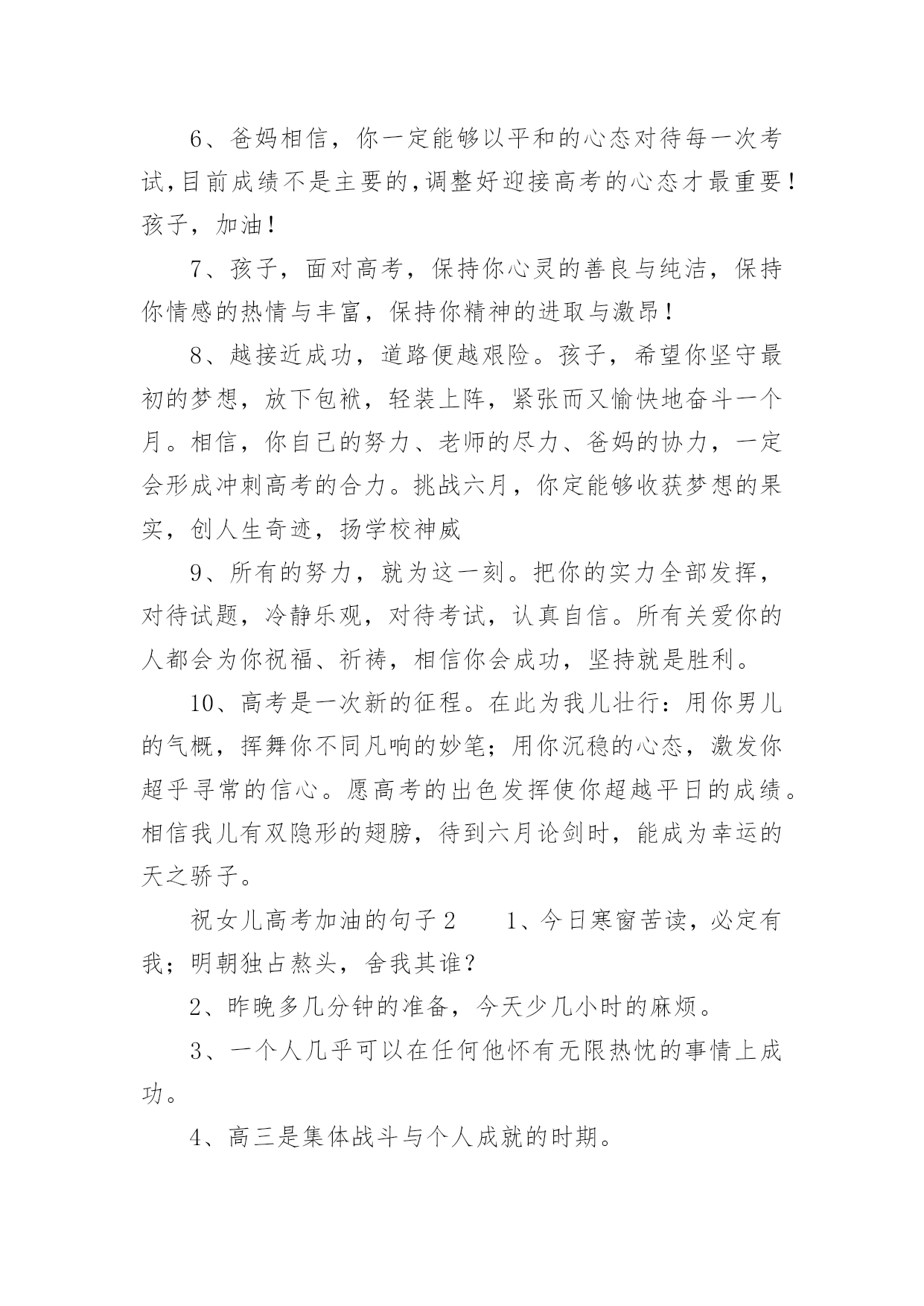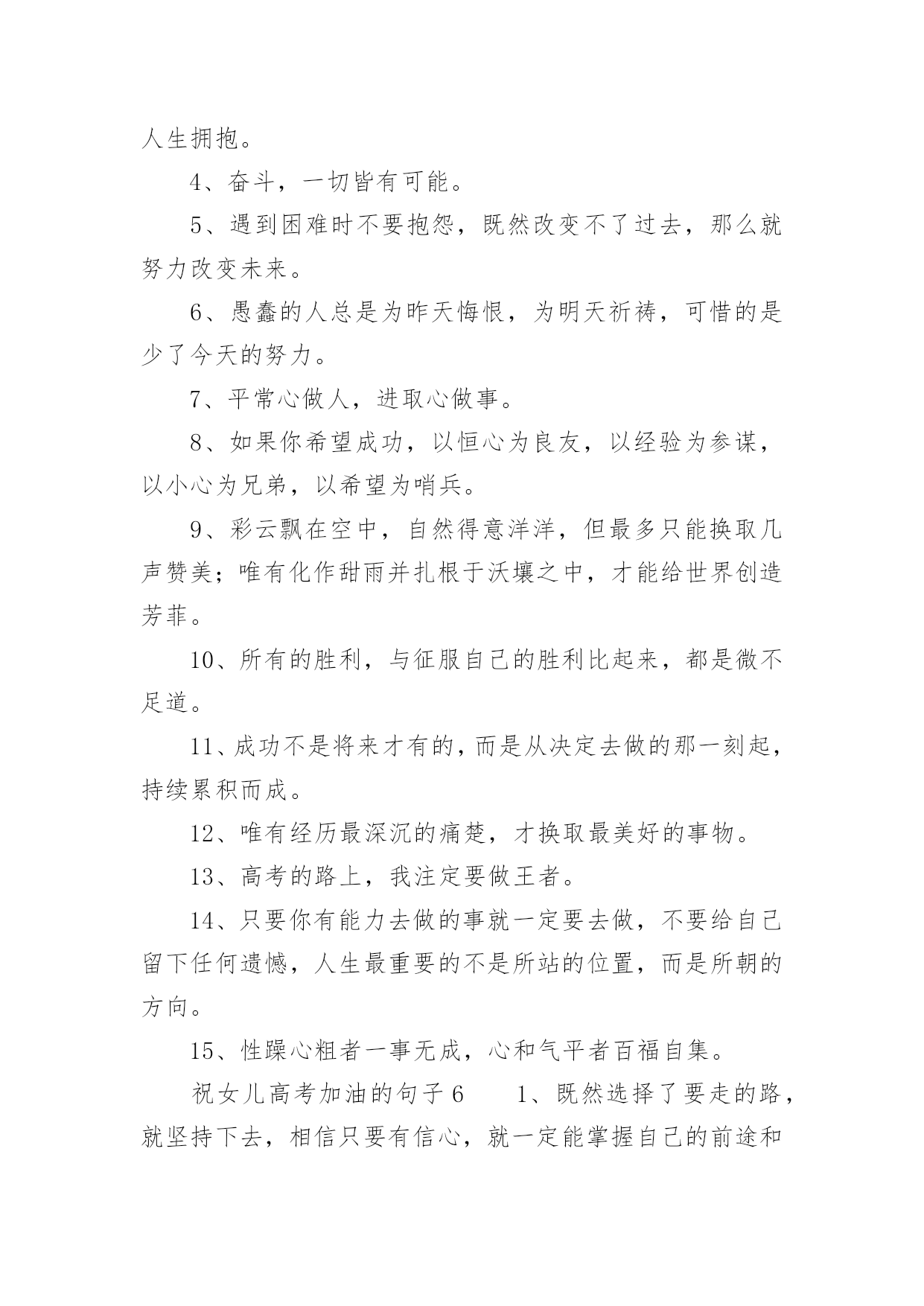 祝女儿高考加油的句子祝女儿高考加油的句子(精选130句)在平日的学习、工作和生活里,大家都收藏过令自己印象深刻的句子吧,句子是由词或词组构成的语言基本运用单位。你所见过的句子是什么样的呢?下面是小编精心整理的祝女儿高考加油的句子(精选130句),仅供参考,欢迎大家阅读。祝女儿高考加油的句子11、孩子,爸爸、妈妈想对你说:我们永远爱你!我们不要求你做最棒的人,但我们要求你做最健康、最阳光、最上进的人。孩子,我们希望你能以一颗平常心去面对一切挑战。2、今天的拼搏是为了明天的胜利。加油吧,女儿!爸爸、妈妈相信你一定会成功的,爸妈永远支持你,爱你到永远。3、愿我的祝愿能给孩子带来好运,给二中的高三学子带来好运。世上无难事,只怕有心人。孩子加油!孩子必胜!二中加油!二中必胜!4、信心是成功的一半。高考是一种丰收,它包蕴太多的内涵。无论高考成绩如何,你的成长与成熟是毋庸置疑。这三年的辛勤付出,你将获得太多、太多。试试就能行,争争定能赢!5、爸爸祝福你:调整心态,放松心情,沉着答题,发挥水平。孩子加油,你是最棒的!爸爸相信你一定会成功!6、爸妈相信,你一定能够以平和的心态对待每一次考试,目前成绩不是主要的,调整好迎接高考的心态才最重要!孩子,加油!7、孩子,面对高考,保持你心灵的善良与纯洁,保持你情感的热情与丰富,保持你精神的进取与激昂!8、越接近成功,道路便越艰险。孩子,希望你坚守最初的梦想,放下包袱,轻装上阵,紧张而又愉快地奋斗一个月。相信,你自己的努力、老师的尽力、爸妈的协力,一定会形成冲刺高考的合力。挑战六月,你定能够收获梦想的果实,创人生奇迹,扬学校神威9、所有的努力,就为这一刻。把你的实力全部发挥,对待试题,冷静乐观,对待考试,认真自信。所有关爱你的人都会为你祝福、祈祷,相信你会成功,坚持就是胜利。10、高考是一次新的征程。在此为我儿壮行:用你男儿的气概,挥舞你不同凡响的妙笔;用你沉稳的心态,激发你超乎寻常的信心。愿高考的出色发挥使你超越平日的成绩。相信我儿有双隐形的翅膀,待到六月论剑时,能成为幸运的天之骄子。祝女儿高考加油的句子21、今日寒窗苦读,必定有我;明朝独占熬头,舍我其谁?2、昨晚多几分钟的准备,今天少几小时的麻烦。3、一个人几乎可以在任何他怀有无限热忱的事情上成功。4、高三是集体战斗与个人成就的时期。5、苦想没盼头,苦干有奔头。6、我要握住一个最美的梦给未来的自己!7、面对高考,保持你心灵的善良与纯洁;保持你情感的热情与丰富;保持你精神的进取与激昂!8、如果我们都去做自己能力做得到的事,我们真会叫自己大吃一惊。9、壮志凌云,十载求学纵苦三伏三九无悔无怨;众志成城,一朝成就再忆全心全力有苦有乐。10、世界上那些最容易的事情中,拖延时间最不费力。11、努力是帆,理想是船,冲向彼岸,定能夺冠。12、争分夺秒巧复习,勤学苦练创佳绩。13、事实上,成功仅代表了你工作的1%,成功是99%失败的结果。14、只有强者才懂得斗争;弱者甚至失败都不够资格,而是生来就是被征服的。15、勤学,勤思,勤问,苦钻。祝女儿高考加油的句子31、立壮志,比心态,拼毅力,决胜高考。2、人生之路无须过多准备,只要迈动双脚,路就在你脚下延伸;只要扬帆,就会有八面来风。3、得意失意,切莫在意;顺境逆境,切莫止境。4、如果我们每天都为了追赶目标进步一点点,即使你赢不了秀者,你也已经是一个超越了绝大多数人的大赢家了。5、抓基础,重细节,讲方法,科学高效。6、世上无论做什么事情,只要你先走出一步,然后再走出一步,如此循环,就会逐渐靠近目标了。7、幸运的神灯总照着勤奋者的前方;失败的魔爪总抓着懒惰者的后腿。8、为尊严而战,卧薪尝胆;为梦想而战,奋发图强;为父母而战,志在必得。9、咬定目标不放松,薄弱科目多用功,深挖潜力比韧劲,临门一脚保成功。10、努力和汗水,会让我们在青春的时光里,每一分钟都落地有声,每一秒钟都熠熠生辉。11、成功者想千方百计,失败者叹千难万险。12、破釜沉舟,搏他个日出日落;背水一战,拼他个无怨无悔。13、高考前夕,晚上睡好,保证睡眠,生物钟调好,放松身心,别太紧张,自然就好。忘记高考,就当模考,平常对待发挥会好!14、自信是来源于对自我的.正确认识,自卑来源于比较的结果。15、淡薄功利,轻装前进;不计付出,坚韧不拔;不达目的,誓不罢休。祝女儿高考加油的句子41、不问收获,但问耕耘!天道酬勤。2、信心来自于实力,实力来自于勤奋。3、把汗水变成珍珠,把梦想变成现实!4、停止奋斗的脚步,江河就会沦为一潭死水。5、只要你选择了一条路,别人肯定会为你让路。6、努力就是光,成功就是影。没有光哪儿来影?7、沉湎于希望的人和守株待兔的樵夫没有什么两样。8、小鸟眷恋春天,因为它懂得飞翔才是生命的价值。9、岸边的奇花异草,是拘留不住奔腾向前的江水的。10、攀登
