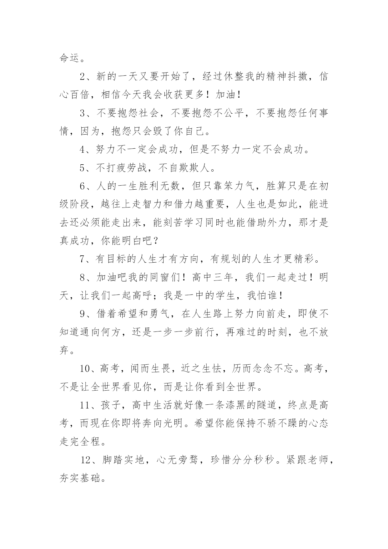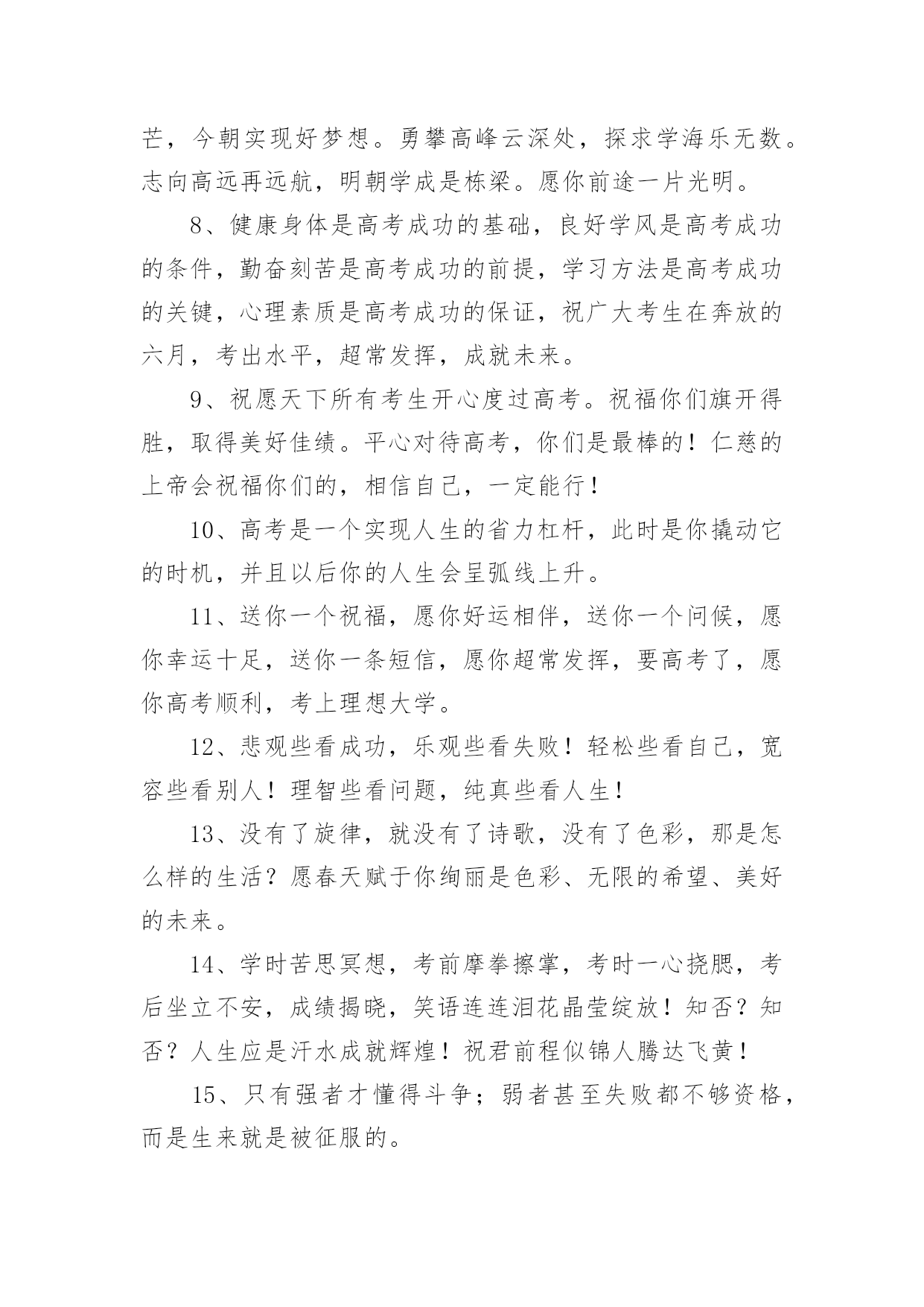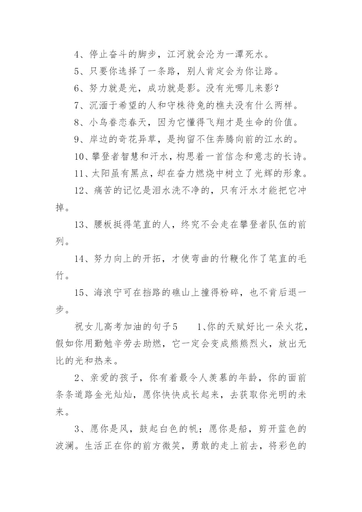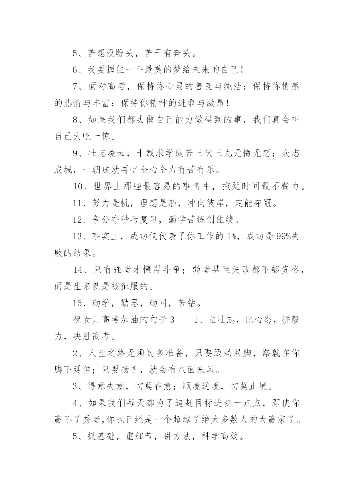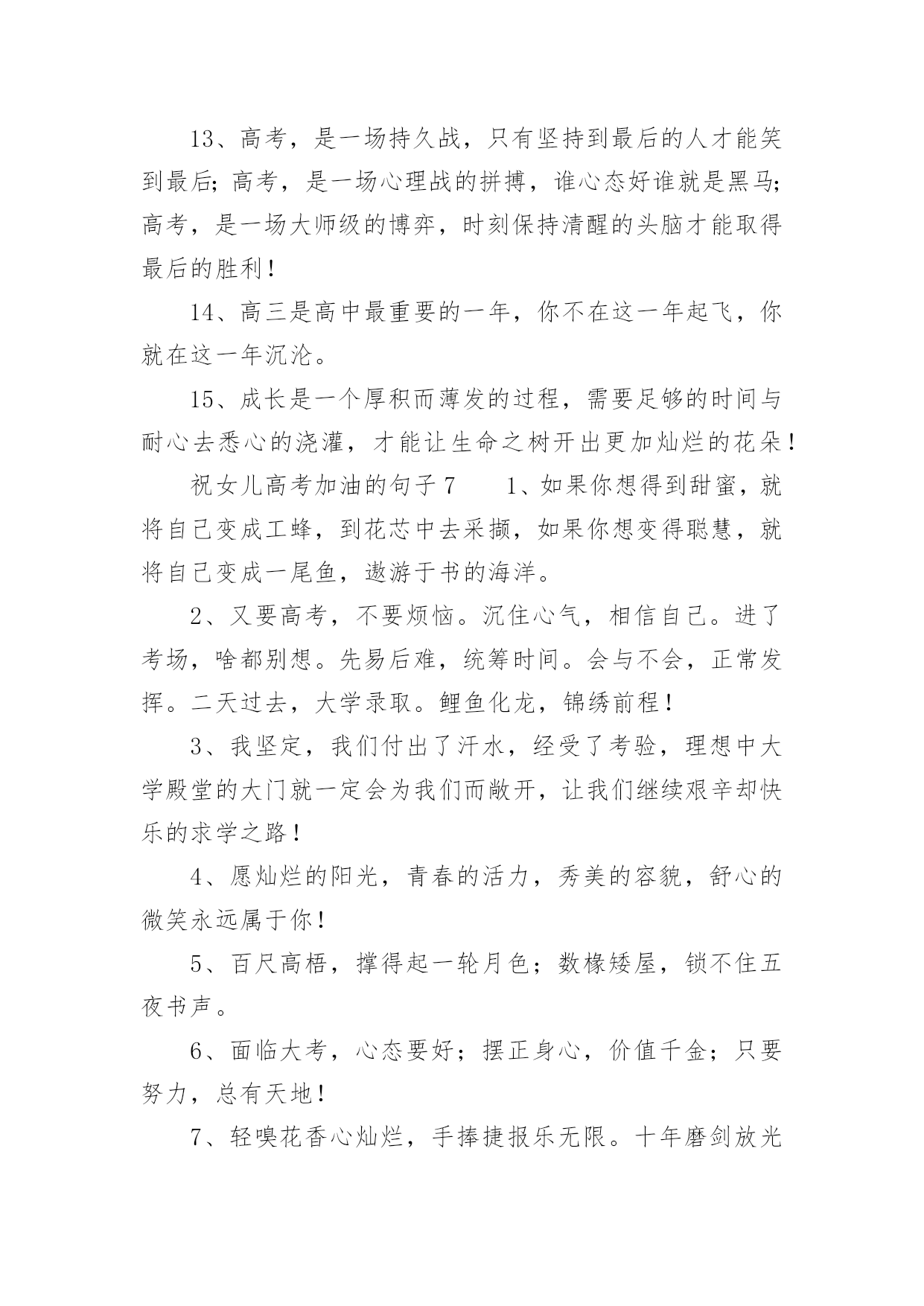 祝女儿高考加油的句子祝女儿高考加油的句子(精选130句)在平日的学习、工作和生活里,大家都收藏过令自己印象深刻的句子吧,句子是由词或词组构成的语言基本运用单位。你所见过的句子是什么样的呢?下面是小编精心整理的祝女儿高考加油的句子(精选130句),仅供参考,欢迎大家阅读。祝女儿高考加油的句子11、孩子,爸爸、妈妈想对你说:我们永远爱你!我们不要求你做最棒的人,但我们要求你做最健康、最阳光、最上进的人。孩子,我们希望你能以一颗平常心去面对一切挑战。2、今天的拼搏是为了明天的胜利。加油吧,女儿!爸爸、妈妈相信你一定会成功的,爸妈永远支持你,爱你到永远。3、愿我的祝愿能给孩子带来好运,给二中的高三学子带来好运。世上无难事,只怕有心人。孩子加油!孩子必胜!二中加油!二中必胜!4、信心是成功的一半。高考是一种丰收,它包蕴太多的内涵。无论高考成绩如何,你的成长与成熟是毋庸置疑。这三年的辛勤付出,你将获得太多、太多。试试就能行,争争定能赢!5、爸爸祝福你:调整心态,放松心情,沉着答题,发挥水平。孩子加油,你是最棒的!爸爸相信你一定会成功!6、爸妈相信,你一定能够以平和的心态对待每一次考试,目前成绩不是主要的,调整好迎接高考的心态才最重要!孩子,加油!7、孩子,面对高考,保持你心灵的善良与纯洁,保持你情感的热情与丰富,保持你精神的进取与激昂!8、越接近成功,道路便越艰险。孩子,希望你坚守最初的梦想,放下包袱,轻装上阵,紧张而又愉快地奋斗一个月。相信,你自己的努力、老师的尽力、爸妈的协力,一定会形成冲刺高考的合力。挑战六月,你定能够收获梦想的果实,创人生奇迹,扬学校神威9、所有的努力,就为这一刻。把你的实力全部发挥,对待试题,冷静乐观,对待考试,认真自信。所有关爱你的人都会为你祝福、祈祷,相信你会成功,坚持就是胜利。10、高考是一次新的征程。在此为我儿壮行:用你男儿的气概,挥舞你不同凡响的妙笔;用你沉稳的心态,激发你超乎寻常的信心。愿高考的出色发挥使你超越平日的成绩。相信我儿有双隐形的翅膀,待到六月论剑时,能成为幸运的天之骄子。祝女儿高考加油的句子21、今日寒窗苦读,必定有我;明朝独占熬头,舍我其谁?2、昨晚多几分钟的准备,今天少几小时的麻烦。3、一个人几乎可以在任何他怀有无限热忱的事情上成功。4、高三是集体战斗与个人成就的时期。5、苦想没盼头,苦干有奔头。6、我要握住一个最美的梦给未来的自己!7、面对高考,保持你心灵的善良与纯洁;保持你情感的热情与丰富;保持你精神的进取与激昂!8、如果我们都去做自己能力做得到的事,我们真会叫自己大吃一惊。9、壮志凌云,十载求学纵苦三伏三九无悔无怨;众志成城,一朝成就再忆全心全力有苦有乐。10、世界上那些最容易的事情中,拖延时间最不费力。11、努力是帆,理想是船,冲向彼岸,定能夺冠。12、争分夺秒巧复习,勤学苦练创佳绩。13、事实上,成功仅代表了你工作的1%,成功是99%失败的结果。14、只有强者才懂得斗争;弱者甚至失败都不够资格,而是生来就是被征服的。15、勤学,勤思,勤问,苦钻。祝女儿高考加油的句子31、立壮志,比心态,拼毅力,决胜高考。2、人生之路无须过多准备,只要迈动双脚,路就在你脚下延伸;只要扬帆,就会有八面来风。3、得意失意,切莫在意;顺境逆境,切莫止境。4、如果我们每天都为了追赶目标进步一点点,即使你赢不了秀者,你也已经是一个超越了绝大多数人的大赢家了。5、抓基础,重细节,讲方法,科学高效。6、世上无论做什么事情,只要你先走出一步,然后再走出一步,如此循环,就会逐渐靠近目标了。7、幸运的神灯总照着勤奋者的前方;失败的魔爪总抓着懒惰者的后腿。8、为尊严而战,卧薪尝胆;为梦想而战,奋发图强;为父母而战,志在必得。9、咬定目标不放松,薄弱科目多用功,深挖潜力比韧劲,临门一脚保成功。10、努力和汗水,会让我们在青春的时光里,每一分钟都落地有声,每一秒钟都熠熠生辉。11、成功者想千方百计,失败者叹千难万险。12、破釜沉舟,搏他个日出日落;背水一战,拼他个无怨无悔。13、高考前夕,晚上睡好,保证睡眠,生物钟调好,放松身心,别太紧张,自然就好。忘记高考,就当模考,平常对待发挥会好!14、自信是来源于对自我的.正确认识,自卑来源于比较的结果。15、淡薄功利,轻装前进;不计付出,坚韧不拔;不达目的,誓不罢休。祝女儿高考加油的句子41、不问收获,但问耕耘!天道酬勤。2、信心来自于实力,实力来自于勤奋。3、把汗水变成珍珠,把梦想变成现实!4、停止奋斗的脚步,江河就会沦为一潭死水。5、只要你选择了一条路,别人肯定会为你让路。6、努力就是光,成功就是影。没有光哪儿来影?7、沉湎于希望的人和守株待兔的樵夫没有什么两样。8、小鸟眷恋春天,因为它懂得飞翔才是生命的价值。9、岸边的奇花异草,是拘留不住奔腾向前的江水的。10、攀登