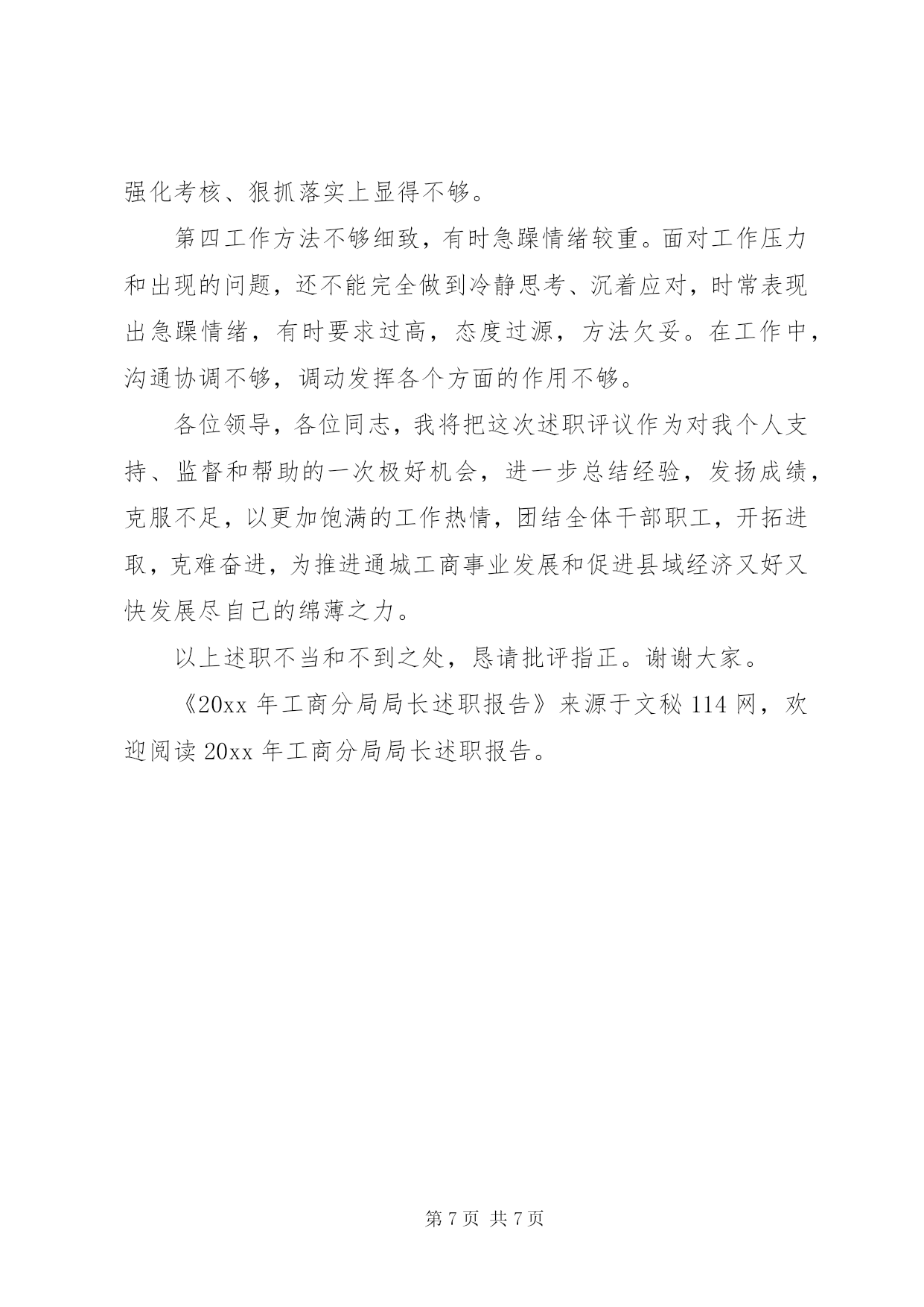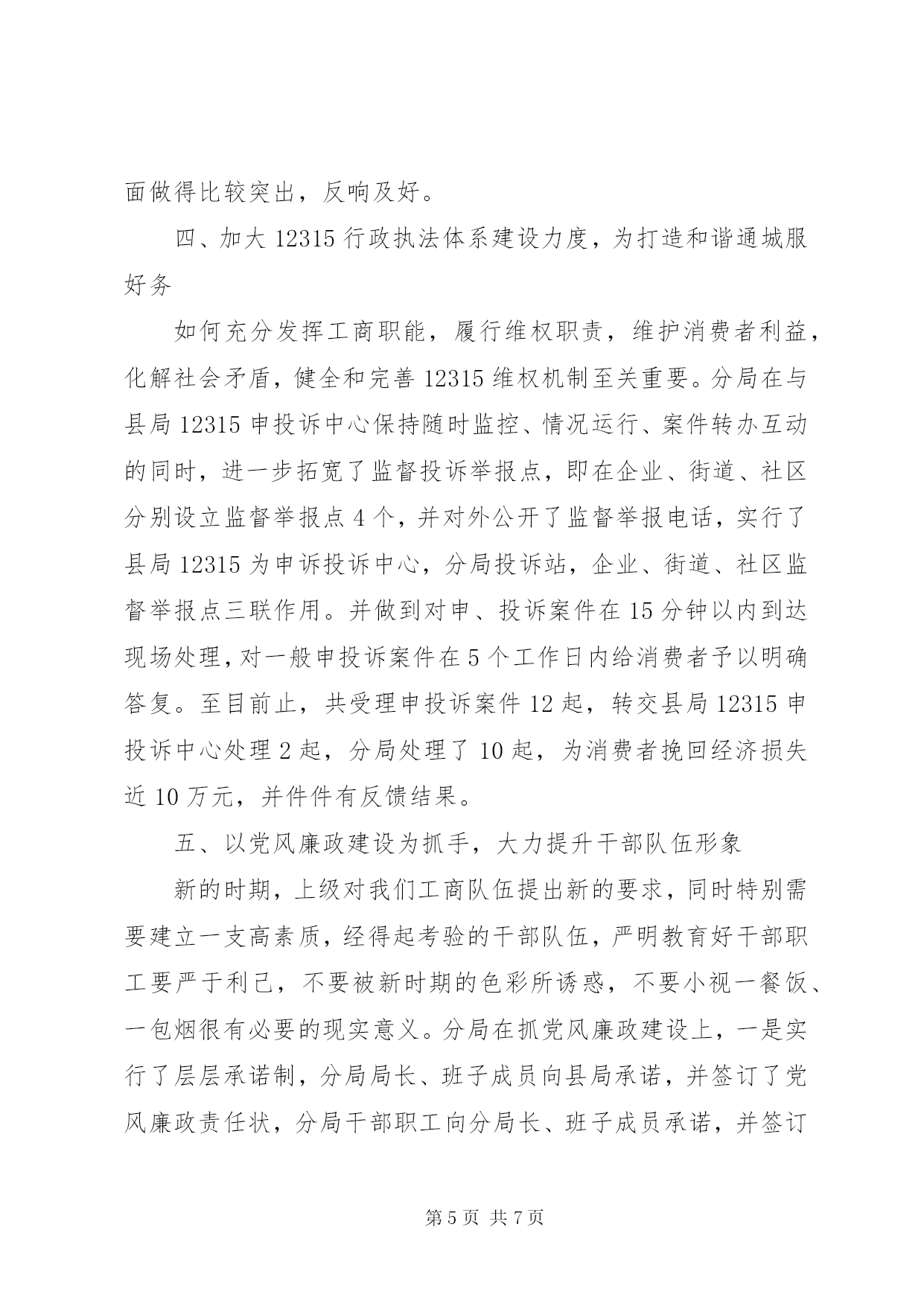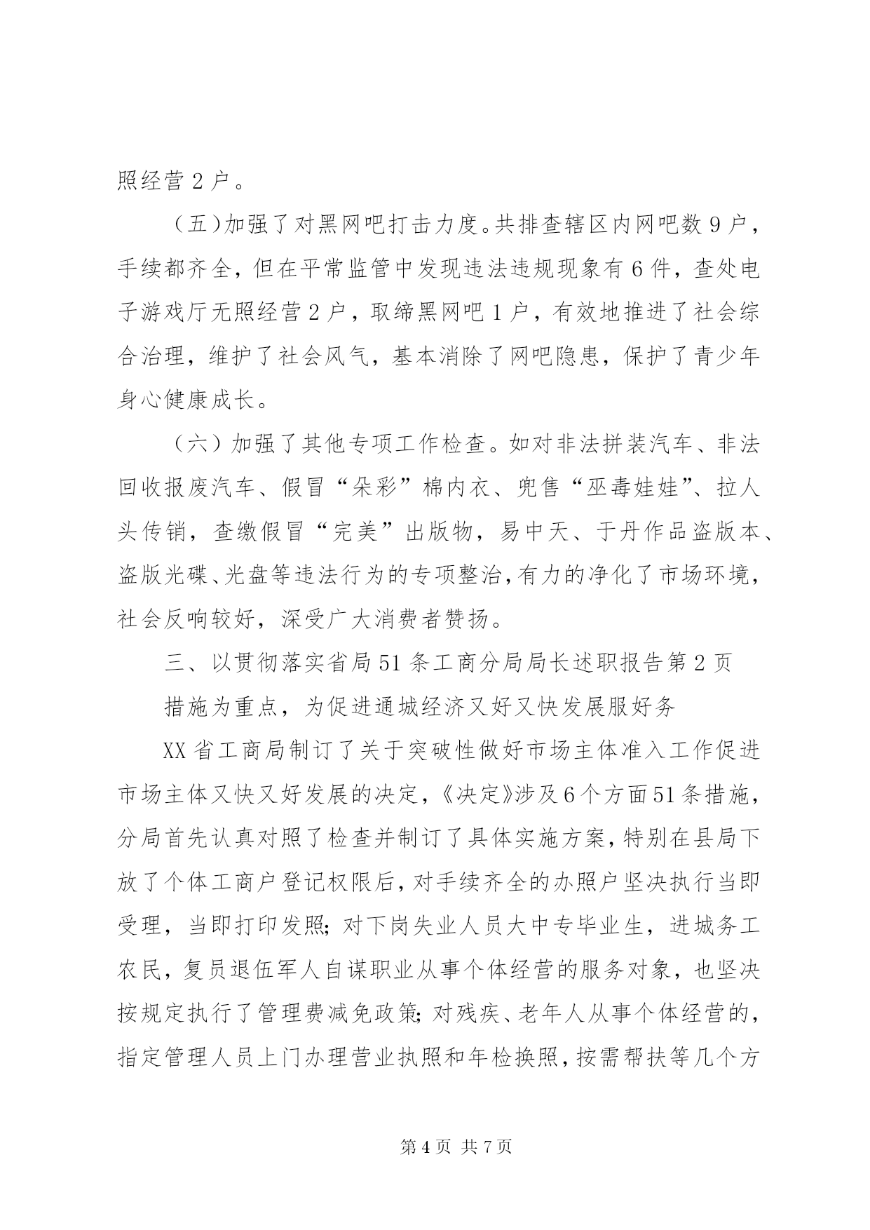 第PAGE\*Arabic\*MERGEFORMAT7页共NUMPAGES\*MERGEFORMAT7页工商分局局长述职报告文章标题:20xx年工商分局局长述职报告[文秘网站的龙头__文秘114网]尊敬的各位领导、各位代表、各位来宾:我叫***,今年3月份到城南工商分局任职。任职以来,我始终坚持“以人为本、立足本职、求真务实、改革创新”的理念和作风,凝聚和团结分局一班人,以群众满意和社会满意为衡量我们工作的一把尺子,以党风廉政建设和队伍建设为基础,依法行政,切实履行监管职能,服务于县局及党委政府的领导,服务于地方经济的建设和发展,较好地完成了各项工作任务。现将今年来的工作作如下述职,请予评议。一、着力提高队伍素质,夯实发展基础各项工作的好坏,关键在人,关键在我们分局这支队伍。今年来,我们在队伍建设上,着力抓好三个方面:一是抓好了建章立制。先后制订了工作上班签到制度、上岗着装制度、例会、会议学习制度,工作程序制度,公开承诺制度,廉政勤政制度和行政执法责任追究制度等十多项管理制度,对干部职工有了约束力。二是加强了学习与教育相结合。坚持了每星期一上午为分局例会学习“雷打不动”,例会上少不了学习上级文件精神,法律法规政策,典型执法管理经验等,坚持了每月15日和28日为分局领导主动找干部交心谈心日,掌握干部职工思想动态,对发现有不对的苗头和不轨行为能在交心谈心过程中指出,帮助其改正,几个月来共找干部职工交心谈心108人次,发现和纠正不对的苗头和行为70多人次,这种方法既融洽了同志之间关系,也很有效地教育了干部职工。三是抓好了领导班子自身建设。分局领导班子成员严格要求自己,率先垂范,敢于开展批评与自我批评,思想纯洁,言行端庄,议事讲规则,办事讲原则。由于制度约束,教育得当,领导班子自律,使队伍素质实现了三个提升,即提升了队伍的凝聚力,提升了队伍的活力,提升了队伍的战斗力。二、以食品安全监管为重点,为打造平安通城服好务(一)加强了食品安全监管。分局分别与辖区内152户经营副食、餐饮、冷饮、蛋糕加工等食品个体经营户签订了食品安全责任状,特别对存在食品隐患的校园周边及重点学校食品经营门店、摊点进行了全面检查,并建立了食品市场电子监管台帐,落实了一户“市食品安全示范点”和三户“县食品安全示范点”的申报手续办理。至九月份以来先后开展食品市场检查5次,共收缴假冒伪劣过期变质以及“三无”食品饮料等10多箱167瓶1350小袋。立案查处12起,并取缔无照经营5户。如在今年5月16日,XX市工商局委托XX市产品质量监督所来我县和平街徐某经营的副食店对“面筋”、“比萨卷”等食品进行了抽样检验,后经检验,“面筋”食品为不合格产品,检验单送至分局后,分局立即予以立案调查,调查终结后,定性为属不合格产品冒充合格产品销售行为,对该5件“面筋”食品每件进价78元,销售价108元,零售每小包价0.5元,共销售金额540元,作出了没收非法所得150元,罚款900元的行政处罚决定,当事人徐某诚恳接受了工商部门的处罚决定,使食品经营市场得到了进一步净化。(二)加强了春耕农资市场监管。先后开展了4次农资市场检查,查处农资商品无照经营2户(其中饲料无照经营1户),并分别与辖区内15户农资商品经营户签订了农资经营责任状和承诺书,同时建立了农资市场电子台帐,切实维护了农民春耕生产的安全。(三)加强了肉食市场监管。6月中旬,分局对辖区内猪肉经营户进行了清查登记,共有36户,手续齐全的仅2户,无卫生许可证、无照经营的有34户,除15户分别进入了辖区九房门物资局内和沿河便民市场经营外,其余的都分布在街边、路边经营。针对这一现状,分局制订了整改措施,并成立了专项整治专班,先后开展了4次执法行动,效果比较明显,至目前止已取得合法经营手续的有18户,手续不齐责令限期改正13户,取缔无照经营5户,有效地规范了肉食市场经营秩序。(四)加强了易然易爆物、娱乐服务业、化学危险品及“五小”经营户专项清查整治。共排查辖区内有17户,手续齐全的9户,对6户手续不齐的进行了行政处罚并责令限期改正,取缔无照经营2户。(五)加强了对黑网吧打击力度。共排查辖区内网吧数9户,手续都齐全,但在平常监管中发现违法违规现象有6件,查处电子游戏厅无照经营2户,取缔黑网吧1户,有效地推进了社会综合治理,维护了社会风气,基本消除了网吧隐患,保护了青少年身心健康成长。(六)加强了其他专项工作检查。如对非法拼装汽车、非法回收报废汽车、假冒“朵彩”棉内衣、兜售“巫毒娃娃”、拉人头传销,查缴假冒“完美”出版物,易中天、于丹作品盗版本、盗版光碟、光盘等违法行为的专项整治,有力的净化了市场环境,社会反响较好,深受广大消费者赞扬。三、以贯彻落实省局51条工商分局局长述职报告措施为重点,为促进通城经济又好又快发展服好务X