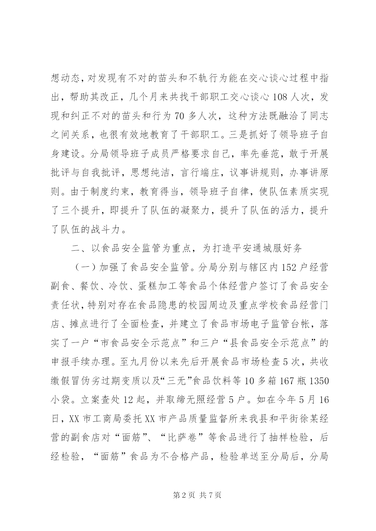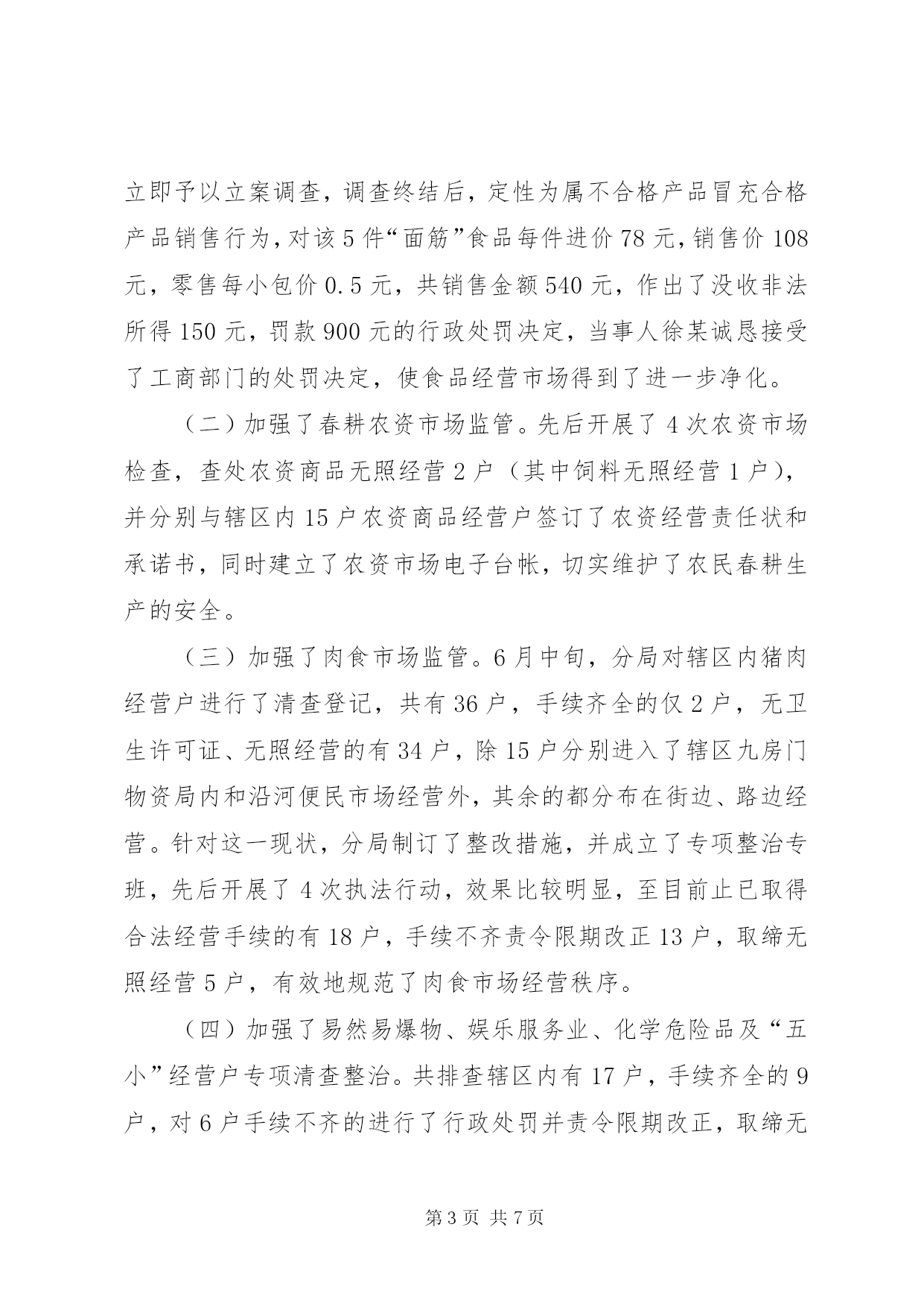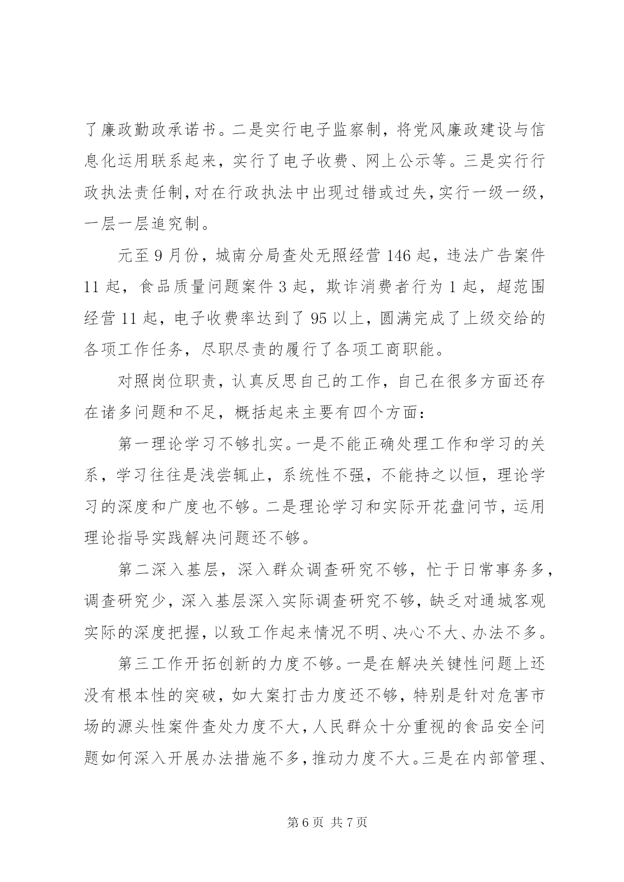 第PAGE\*Arabic\*MERGEFORMAT7页共NUMPAGES\*MERGEFORMAT7页工商分局局长述职报告文章标题:20xx年工商分局局长述职报告[文秘网站的龙头__文秘114网]尊敬的各位领导、各位代表、各位来宾:我叫***,今年3月份到城南工商分局任职。任职以来,我始终坚持“以人为本、立足本职、求真务实、改革创新”的理念和作风,凝聚和团结分局一班人,以群众满意和社会满意为衡量我们工作的一把尺子,以党风廉政建设和队伍建设为基础,依法行政,切实履行监管职能,服务于县局及党委政府的领导,服务于地方经济的建设和发展,较好地完成了各项工作任务。现将今年来的工作作如下述职,请予评议。一、着力提高队伍素质,夯实发展基础各项工作的好坏,关键在人,关键在我们分局这支队伍。今年来,我们在队伍建设上,着力抓好三个方面:一是抓好了建章立制。先后制订了工作上班签到制度、上岗着装制度、例会、会议学习制度,工作程序制度,公开承诺制度,廉政勤政制度和行政执法责任追究制度等十多项管理制度,对干部职工有了约束力。二是加强了学习与教育相结合。坚持了每星期一上午为分局例会学习“雷打不动”,例会上少不了学习上级文件精神,法律法规政策,典型执法管理经验等,坚持了每月15日和28日为分局领导主动找干部交心谈心日,掌握干部职工思想动态,对发现有不对的苗头和不轨行为能在交心谈心过程中指出,帮助其改正,几个月来共找干部职工交心谈心108人次,发现和纠正不对的苗头和行为70多人次,这种方法既融洽了同志之间关系,也很有效地教育了干部职工。三是抓好了领导班子自身建设。分局领导班子成员严格要求自己,率先垂范,敢于开展批评与自我批评,思想纯洁,言行端庄,议事讲规则,办事讲原则。由于制度约束,教育得当,领导班子自律,使队伍素质实现了三个提升,即提升了队伍的凝聚力,提升了队伍的活力,提升了队伍的战斗力。二、以食品安全监管为重点,为打造平安通城服好务(一)加强了食品安全监管。分局分别与辖区内152户经营副食、餐饮、冷饮、蛋糕加工等食品个体经营户签订了食品安全责任状,特别对存在食品隐患的校园周边及重点学校食品经营门店、摊点进行了全面检查,并建立了食品市场电子监管台帐,落实了一户“市食品安全示范点”和三户“县食品安全示范点”的申报手续办理。至九月份以来先后开展食品市场检查5次,共收缴假冒伪劣过期变质以及“三无”食品饮料等10多箱167瓶1350小袋。立案查处12起,并取缔无照经营5户。如在今年5月16日,XX市工商局委托XX市产品质量监督所来我县和平街徐某经营的副食店对“面筋”、“比萨卷”等食品进行了抽样检验,后经检验,“面筋”食品为不合格产品,检验单送至分局后,分局立即予以立案调查,调查终结后,定性为属不合格产品冒充合格产品销售行为,对该5件“面筋”食品每件进价78元,销售价108元,零售每小包价0.5元,共销售金额540元,作出了没收非法所得150元,罚款900元的行政处罚决定,当事人徐某诚恳接受了工商部门的处罚决定,使食品经营市场得到了进一步净化。(二)加强了春耕农资市场监管。先后开展了4次农资市场检查,查处农资商品无照经营2户(其中饲料无照经营1户),并分别与辖区内15户农资商品经营户签订了农资经营责任状和承诺书,同时建立了农资市场电子台帐,切实维护了农民春耕生产的安全。(三)加强了肉食市场监管。6月中旬,分局对辖区内猪肉经营户进行了清查登记,共有36户,手续齐全的仅2户,无卫生许可证、无照经营的有34户,除15户分别进入了辖区九房门物资局内和沿河便民市场经营外,其余的都分布在街边、路边经营。针对这一现状,分局制订了整改措施,并成立了专项整治专班,先后开展了4次执法行动,效果比较明显,至目前止已取得合法经营手续的有18户,手续不齐责令限期改正13户,取缔无照经营5户,有效地规范了肉食市场经营秩序。(四)加强了易然易爆物、娱乐服务业、化学危险品及“五小”经营户专项清查整治。共排查辖区内有17户,手续齐全的9户,对6户手续不齐的进行了行政处罚并责令限期改正,取缔无照经营2户。(五)加强了对黑网吧打击力度。共排查辖区内网吧数9户,手续都齐全,但在平常监管中发现违法违规现象有6件,查处电子游戏厅无照经营2户,取缔黑网吧1户,有效地推进了社会综合治理,维护了社会风气,基本消除了网吧隐患,保护了青少年身心健康成长。(六)加强了其他专项工作检查。如对非法拼装汽车、非法回收报废汽车、假冒“朵彩”棉内衣、兜售“巫毒娃娃”、拉人头传销,查缴假冒“完美”出版物,易中天、于丹作品盗版本、盗版光碟、光盘等违法行为的专项整治,有力的净化了市场环境,社会反响较好,深受广大消费者赞扬。三、以贯彻落实省局51条工商分局局长述职报告措施为重点,为促进通城经济又好又快发展服好务X