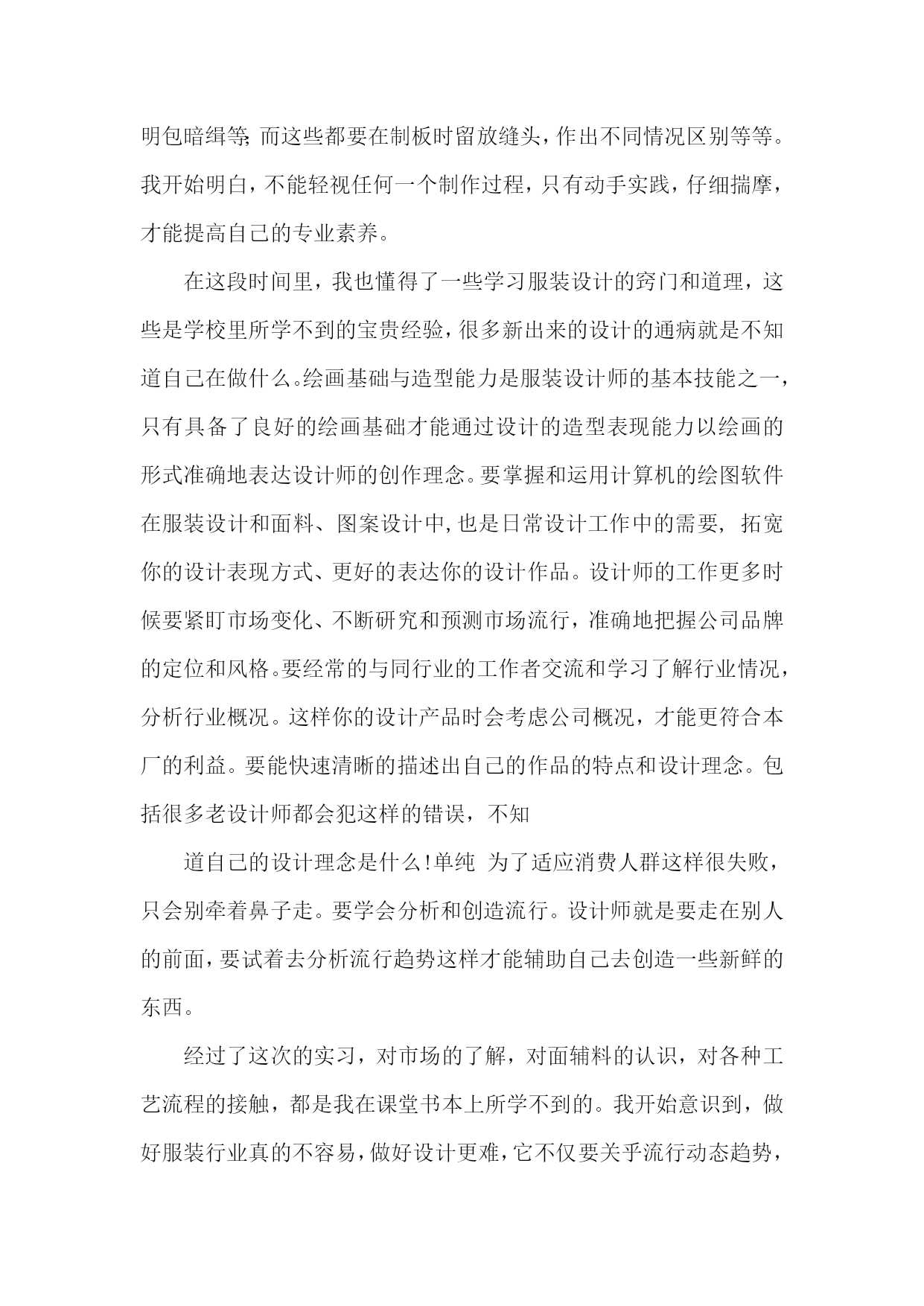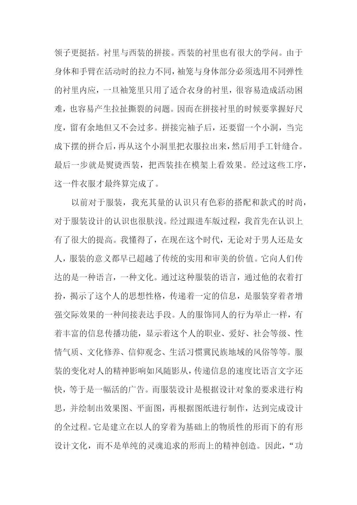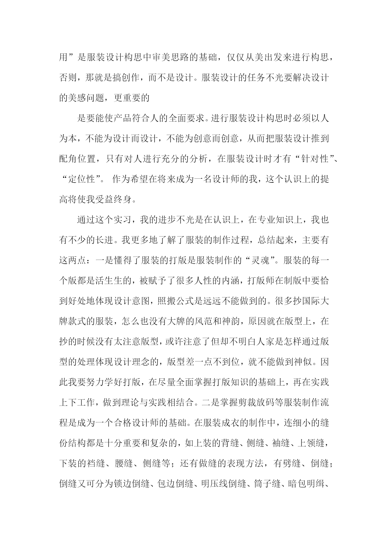 设计实习报告有关设计实习报告1一、实习目的这次实习,有助于我们认识到自身的不足,在实践学习中存在着哪些缺陷,为以前的学习做一个合理的检验,为了更深入的做好女装服饰流行趋势,以及对今后的学习做一个恰当的规划,并对以后的实习工作打下一个良好的基础。二、实习内容1、实习职位:服装设计师助理2、实习时间:20xx年XX月XX日-20xx年XX月XX日3、实习地点:东莞虎门4、实习公司:锦彩服装三、实习结果在这学期我们接受了学校安排的实习课程,通过公司实习,我更加深刻地领会了老师在上课时候所讲的一些知识和要领,在制作服装这样的实践基础上,我也明白了自己设计、制作一件成衣的繁复与艰难。正式工作后,我首先进行的是跟版。通过了解,我明白了服装制版是一件需要数字量化的工作,是建立在人体的三围(胸围、腰围、臀围)的尺寸基础上的量化的工作,除此此外,还涉及到胸高点、腰节、肩胛点、衣长、省量、缝份、开衩、领围、领高、领深等多方面的数据的综合考虑、计算,因而打版是一项非常重要的工作。在设计师的指导下,我要跟进纸样师傅对服装的版式进行修改修饰,最终成形。纸样师傅出版之后我要跟进车版师傅的工作,在其中我学到许多服装制作要领,这是我以前在学校十分困惑的部分。为了使面料更挺括,必须把昨裁剪好的衬布与布料熨烫在一起。西装是十分正式的服装,因此,把衬布和布料有机的粘烫在一起就显得更为重要了。师傅告诉我,使用蒸汽喷雾电熨斗时,要根据衬里纤维的种类调整合适的熨烫温度,而为了安全,最好再用加垫白棉布的方法。车版这个过程需要付出非常大的耐心,首先要做是前片和后片各自的拼接。前片的制作中,为了使胸型比较好看,踩的时候,弧线部分一定要小心。接下去是要在边缘加上粘合衬,使领子部分也有自然的弯曲。而后是口袋的制作,口袋制作算是一个难点,因为做工很复杂,其复杂不逊于肩膀的制作。由于口袋的开合频繁,很容易造成袋口撕裂,因此袋口的边线十分重要,通过学习,我知道使用半圆型补强线边可以十分有效地预防袋口的撕裂。接着是袖子的熨烫及制作。袖子的熨烫是有窍门的,只要把它烫出弯幅,等拼接后就可自然弯曲。领子的制作也是一大难点,要踩得十分细致,一件西装制作得成败与否很大程度上取决于领子的制作,因此,西装领子制作工艺的要求比较高。领子制作首先要烫衬,再修剪领里(留做缝),然后把领面放在领里下车。西装的最关键之处就是“领袖”,领子的制作要讲究挺括度,线条简洁明朗,一气呵成,在弧度上不能有断线,还要在领子的边缘踩一条大约0.2mm的线,使领子更挺括。衬里与西装的拼接。西装的衬里也有很大的学问。由于身体和手臂在活动时的拉力不同,袖笼与身体部分必须选用不同弹性的衬里内应,一旦袖笼里只用了适合衣身的衬里,很容易造成活动困难,也容易产生拉扯撕裂的问题。因而在拼接衬里的时候要掌握好尺度,留有余地但又不会过多。拼接完袖子后,还要留一个小洞,当完成下摆的拼合后,再从这个小洞里把衣服拉出来,然后用手工针缝合。最后一步就是熨烫西装,把西装挂在模架上看效果。经过这些工序,这一件衣服才最终算完成了。以前对于服装,我充其量的认识只有色彩的搭配和款式的时尚,对于服装设计的认识也很肤浅。经过跟进车版过程,我首先在认识上有了很大的提高。我懂得了,在现在这个时代,无论对于男人还是女人,服装的意义都早已超越了传统的实用和审美的价值。它向人们传达的是一种语言,一种文化。通过这种服装的语言,通过他的衣着打扮,揭示了这个人的思想性格,传递着一定的信息,是服装穿着者增强交际效果的一种间接表达手段。人的服饰同人的行为举止一样,有着丰富的信息传播功能,显示着这个人的职业、爱好、社会等级、性情气质、文化修养、信仰观念、生活习惯冀民族地域的风俗等等。服装的变化对人的精神影响如风随影从,传递信息的速度比语言文字还快,等于是一幅活的广告。而服装设计是根据设计对象的要求进行构思,并绘制出效果图、平面图,再根据图纸进行制作,达到完成设计的全过程。它是建立在以人的穿着为基础上的物质性的形而下的有形设计文化,而不是单纯的灵魂追求的形而上的精神创造。因此,“功用”是服装设计构思中审美思路的基础,仅仅从美出发来进行构思,否则,那就是搞创作,而不是设计。服装设计的任务不光要解决设计的美感问题,更重要的是要能使产品符合人的全面要求。进行服装设计构思时必须以人为本,不能为设计而设计,不能为创意而创意,从而把服装设计推到配角位置,只有对人进行充分的分析,在服装设计时才有“针对性”、“定位性”。作为希望在将来成为一名设计师的我,这个认识上的提高将使我受益终身。通过这个实习,我的进步不光是在认识上,在专业知识上,我也有不少的长进。我更多地了解了服装的制作过程,总结起来,主要有这两点:一是懂得了服装的打版是服装制作的“灵魂”。服装的每一个版都是活生生的,被赋予了很多人性的内涵,打版