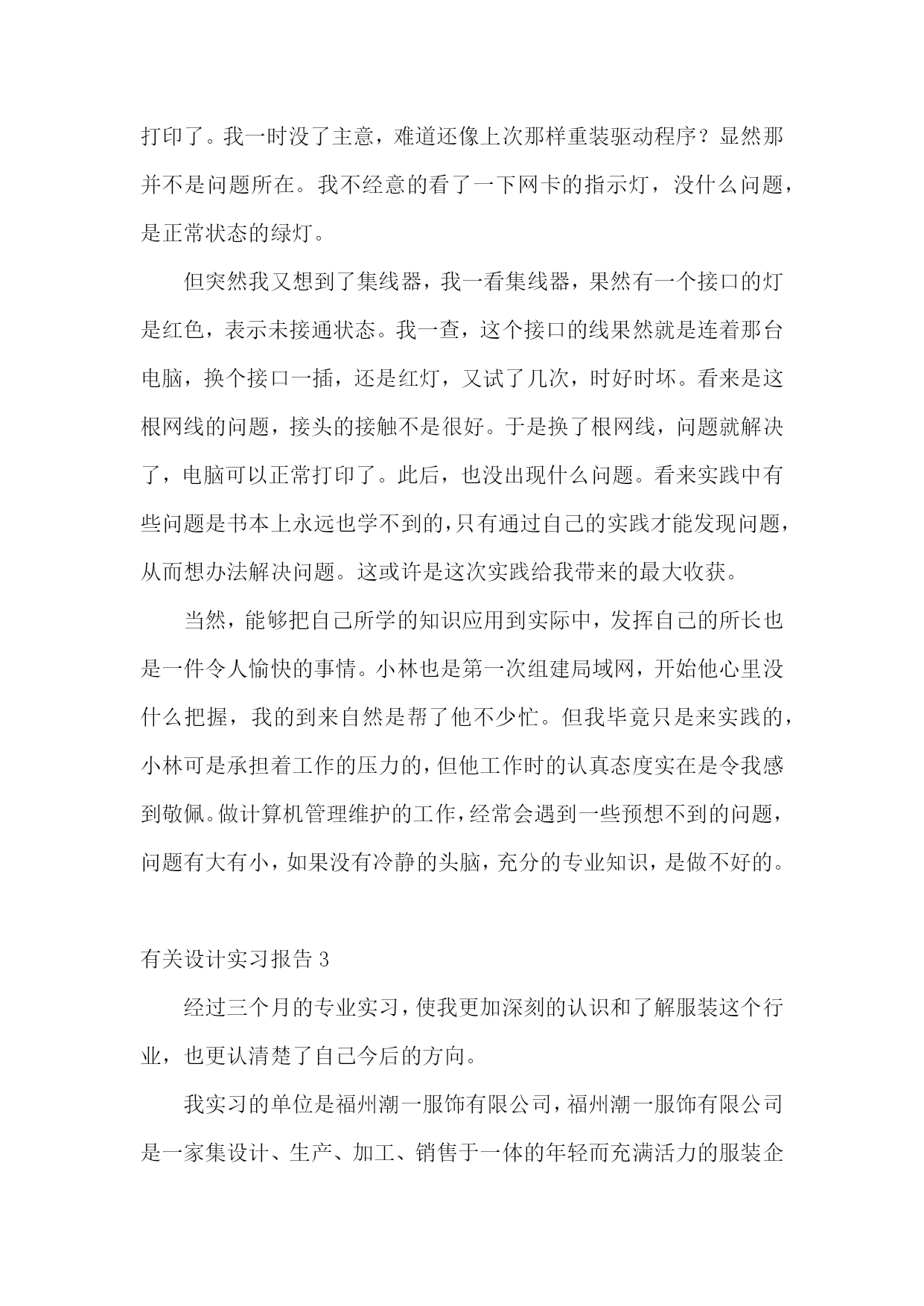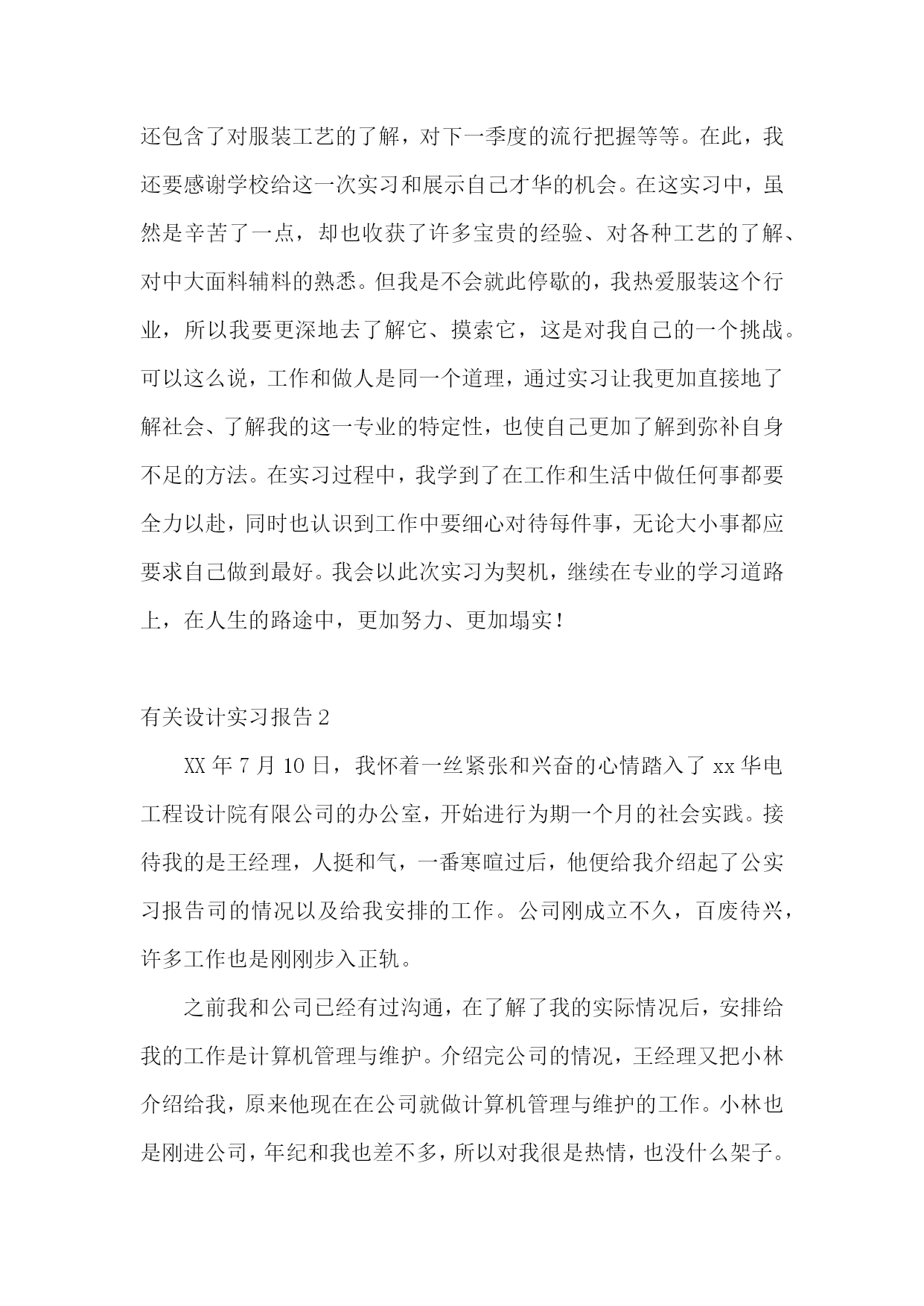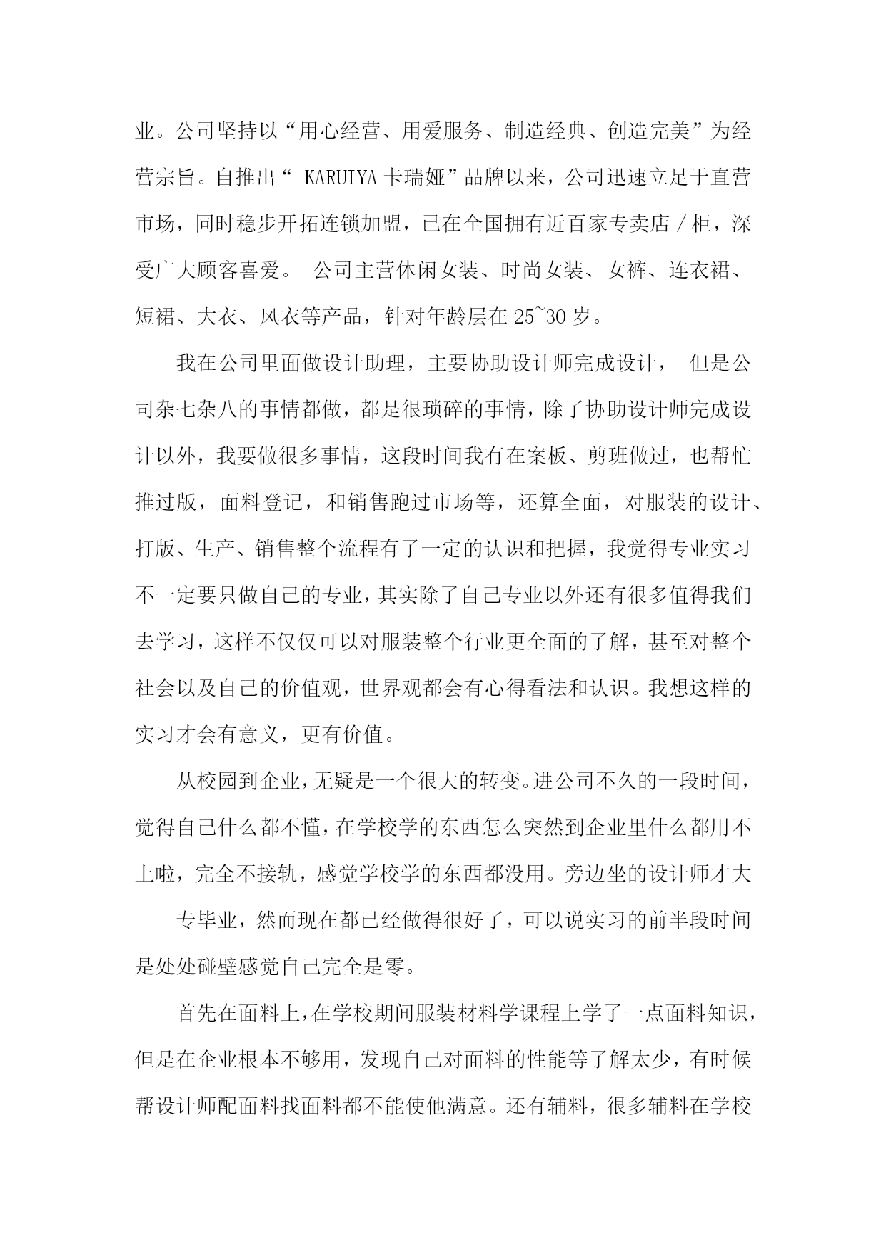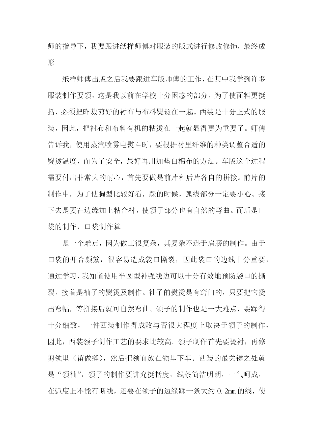 设计实习报告有关设计实习报告1一、实习目的这次实习,有助于我们认识到自身的不足,在实践学习中存在着哪些缺陷,为以前的学习做一个合理的检验,为了更深入的做好女装服饰流行趋势,以及对今后的学习做一个恰当的规划,并对以后的实习工作打下一个良好的基础。二、实习内容1、实习职位:服装设计师助理2、实习时间:20xx年XX月XX日-20xx年XX月XX日3、实习地点:东莞虎门4、实习公司:锦彩服装三、实习结果在这学期我们接受了学校安排的实习课程,通过公司实习,我更加深刻地领会了老师在上课时候所讲的一些知识和要领,在制作服装这样的实践基础上,我也明白了自己设计、制作一件成衣的繁复与艰难。正式工作后,我首先进行的是跟版。通过了解,我明白了服装制版是一件需要数字量化的工作,是建立在人体的三围(胸围、腰围、臀围)的尺寸基础上的量化的工作,除此此外,还涉及到胸高点、腰节、肩胛点、衣长、省量、缝份、开衩、领围、领高、领深等多方面的数据的综合考虑、计算,因而打版是一项非常重要的工作。在设计师的指导下,我要跟进纸样师傅对服装的版式进行修改修饰,最终成形。纸样师傅出版之后我要跟进车版师傅的工作,在其中我学到许多服装制作要领,这是我以前在学校十分困惑的部分。为了使面料更挺括,必须把昨裁剪好的衬布与布料熨烫在一起。西装是十分正式的服装,因此,把衬布和布料有机的粘烫在一起就显得更为重要了。师傅告诉我,使用蒸汽喷雾电熨斗时,要根据衬里纤维的种类调整合适的熨烫温度,而为了安全,最好再用加垫白棉布的方法。车版这个过程需要付出非常大的耐心,首先要做是前片和后片各自的拼接。前片的制作中,为了使胸型比较好看,踩的时候,弧线部分一定要小心。接下去是要在边缘加上粘合衬,使领子部分也有自然的弯曲。而后是口袋的制作,口袋制作算是一个难点,因为做工很复杂,其复杂不逊于肩膀的制作。由于口袋的开合频繁,很容易造成袋口撕裂,因此袋口的边线十分重要,通过学习,我知道使用半圆型补强线边可以十分有效地预防袋口的撕裂。接着是袖子的熨烫及制作。袖子的熨烫是有窍门的,只要把它烫出弯幅,等拼接后就可自然弯曲。领子的制作也是一大难点,要踩得十分细致,一件西装制作得成败与否很大程度上取决于领子的制作,因此,西装领子制作工艺的要求比较高。领子制作首先要烫衬,再修剪领里(留做缝),然后把领面放在领里下车。西装的最关键之处就是“领袖”,领子的制作要讲究挺括度,线条简洁明朗,一气呵成,在弧度上不能有断线,还要在领子的边缘踩一条大约0.2mm的线,使领子更挺括。衬里与西装的拼接。西装的衬里也有很大的学问。由于身体和手臂在活动时的拉力不同,袖笼与身体部分必须选用不同弹性的衬里内应,一旦袖笼里只用了适合衣身的衬里,很容易造成活动困难,也容易产生拉扯撕裂的问题。因而在拼接衬里的时候要掌握好尺度,留有余地但又不会过多。拼接完袖子后,还要留一个小洞,当完成下摆的拼合后,再从这个小洞里把衣服拉出来,然后用手工针缝合。最后一步就是熨烫西装,把西装挂在模架上看效果。经过这些工序,这一件衣服才最终算完成了。以前对于服装,我充其量的认识只有色彩的搭配和款式的时尚,对于服装设计的认识也很肤浅。经过跟进车版过程,我首先在认识上有了很大的提高。我懂得了,在现在这个时代,无论对于男人还是女人,服装的意义都早已超越了传统的实用和审美的价值。它向人们传达的是一种语言,一种文化。通过这种服装的语言,通过他的衣着打扮,揭示了这个人的思想性格,传递着一定的信息,是服装穿着者增强交际效果的一种间接表达手段。人的服饰同人的行为举止一样,有着丰富的信息传播功能,显示着这个人的职业、爱好、社会等级、性情气质、文化修养、信仰观念、生活习惯冀民族地域的风俗等等。服装的变化对人的精神影响如风随影从,传递信息的速度比语言文字还快,等于是一幅活的广告。而服装设计是根据设计对象的要求进行构思,并绘制出效果图、平面图,再根据图纸进行制作,达到完成设计的全过程。它是建立在以人的穿着为基础上的物质性的形而下的有形设计文化,而不是单纯的灵魂追求的形而上的精神创造。因此,“功用”是服装设计构思中审美思路的基础,仅仅从美出发来进行构思,否则,那就是搞创作,而不是设计。服装设计的任务不光要解决设计的美感问题,更重要的是要能使产品符合人的全面要求。进行服装设计构思时必须以人为本,不能为设计而设计,不能为创意而创意,从而把服装设计推到配角位置,只有对人进行充分的分析,在服装设计时才有“针对性”、“定位性”。作为希望在将来成为一名设计师的我,这个认识上的提高将使我受益终身。通过这个实习,我的进步不光是在认识上,在专业知识上,我也有不少的长进。我更多地了解了服装的制作过程,总结起来,主要有这两点:一是懂得了服装的打版是服装制作的“灵魂”。服装的每一个版都是活生生的,被赋予了很多人性的内涵,打版