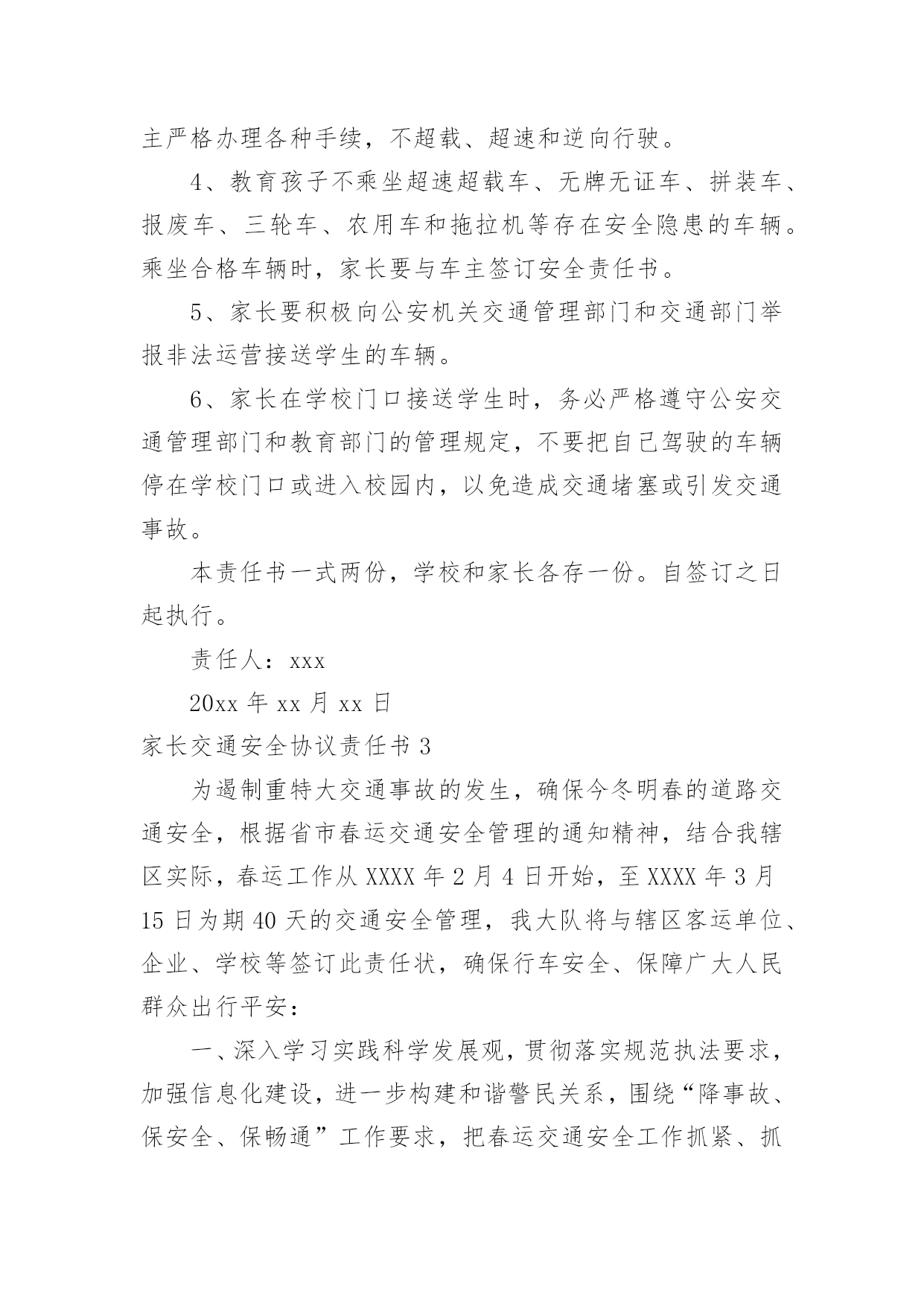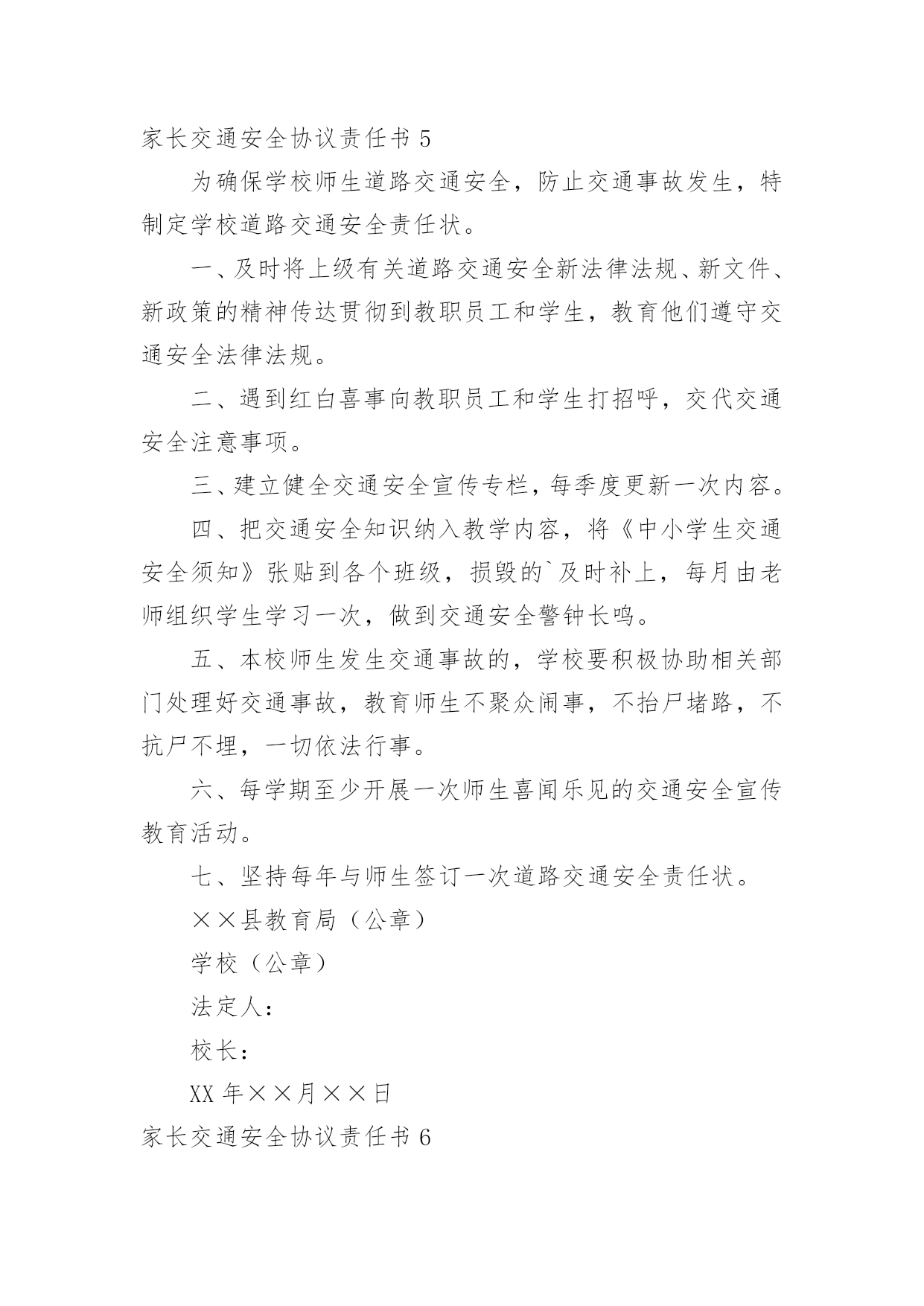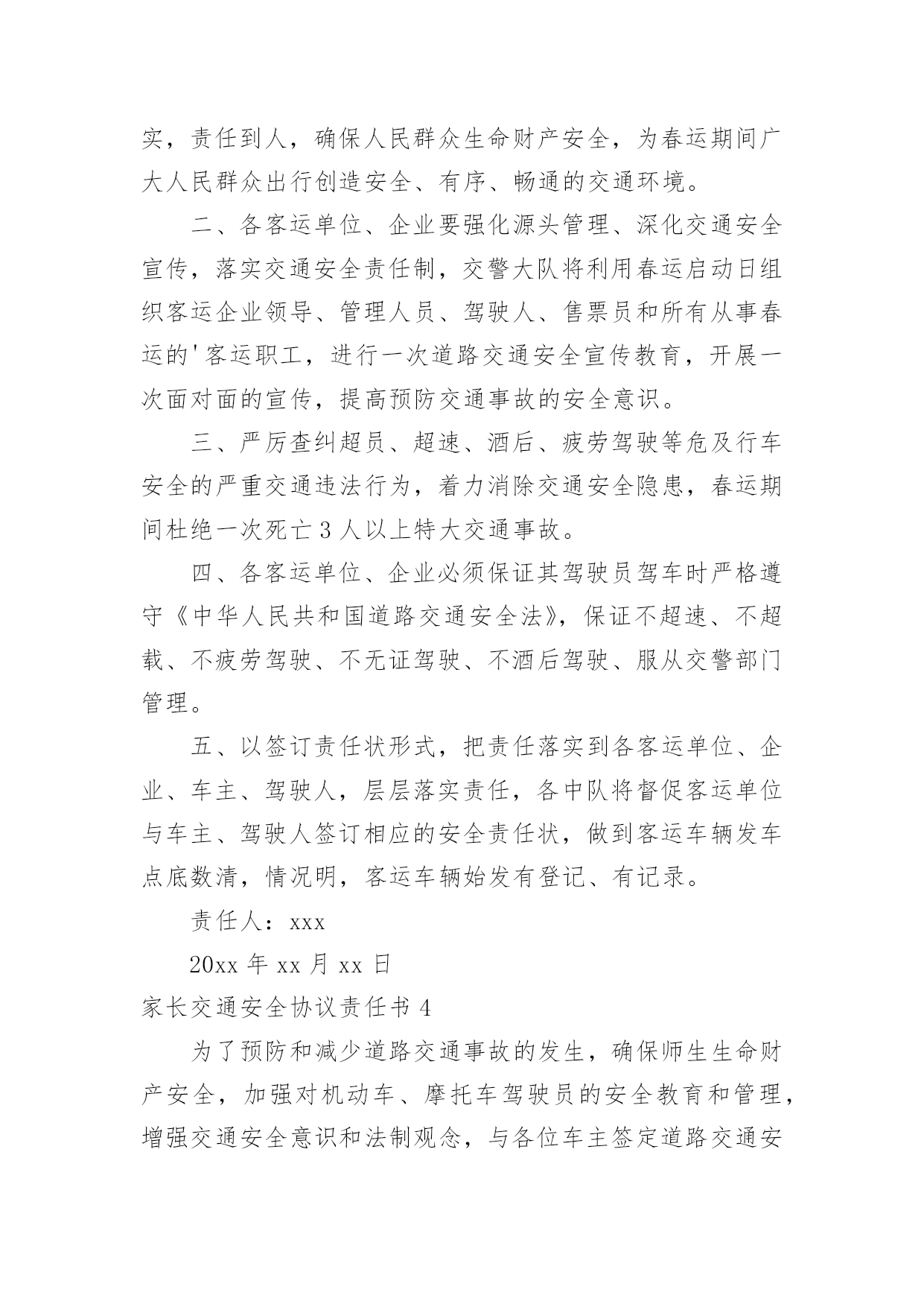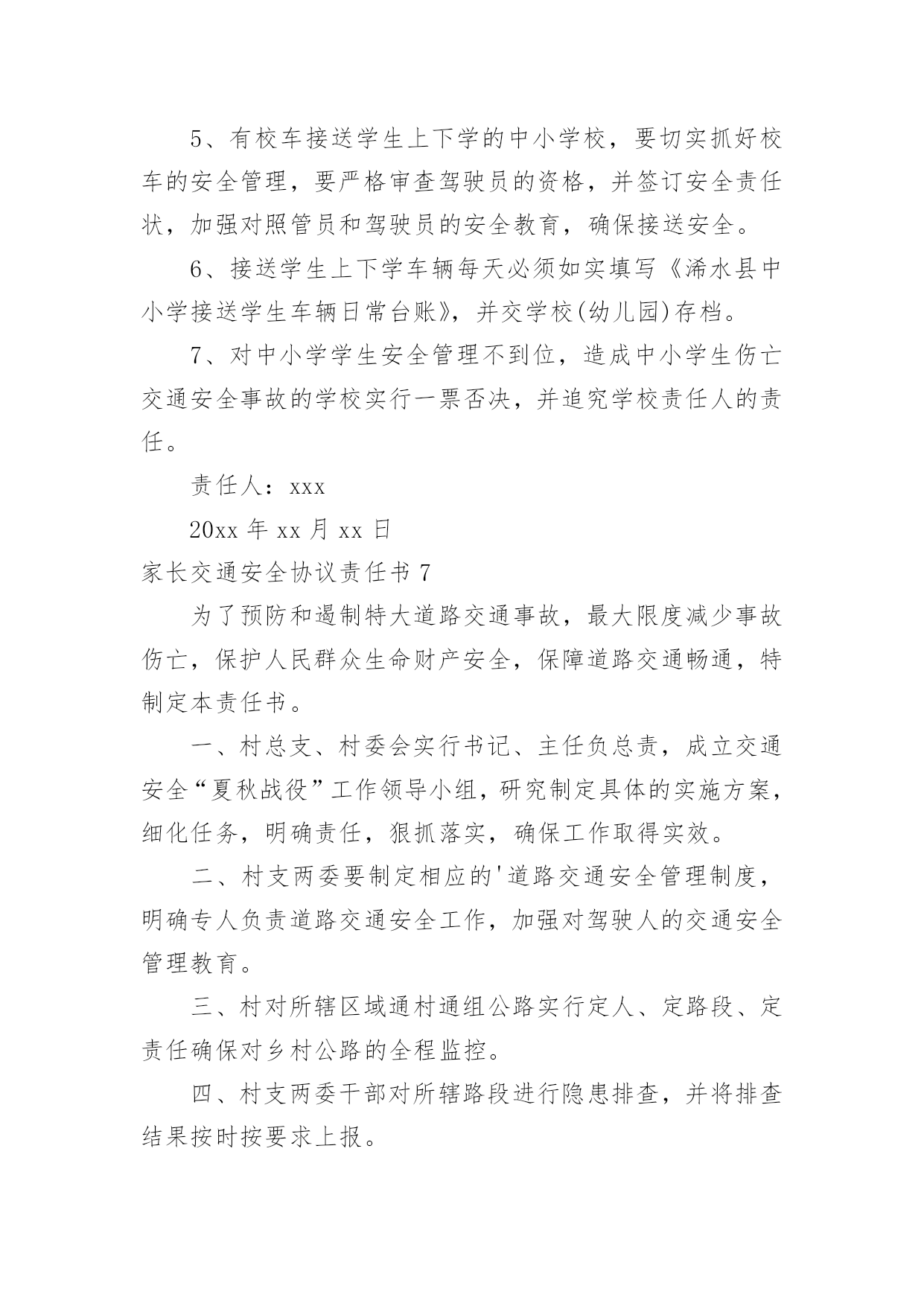 家长交通安全协议责任书家长交通安全协议责任书在充满活力,日益开放的今天,协议在生活中的使用越来越广泛,协议协调着人与人,人与事之间的关系。协议到底怎么写才合适呢?下面是小编整理的家长交通安全协议责任书,供大家参考借鉴,希望可以帮助到有需要的朋友。家长交通安全协议责任书1长岗小学地处军二路边,紧邻合界高速出口。交通便利,安全隐患却严重存在。为了确保学生的交通安全,依据道路交通法规,特制定学生道路交通规则,并与家长签订安全责任书。1、学生放学:中午以校,下午以班,整队出门。以自然村庄编排路队,每队设路队长两名,路队旗两面。放学时,由教师护送学生从斑马线处穿过公路。路上行走时,一律按路队单排靠公路右边路牙行走,不得插队、抢先、推搡、横穿公路等。2、学生上学:一律靠道路右边行走,需要横穿公路的,必须在家门口(由家长护送)或从学校前的斑马线穿过,不得在公路上玩耍、嬉戏、追逐等。3、接送学生的家长不得进入校园,使用的允许上路的各种交通工具必须停靠在大门主体道两边或公路边,不得挤占主体道和斑马线。4、上学放学乘车的同学要求一律坐公交车,下车时一定要看清前后左右,在确定无车辆通过时快速穿过公路。放学乘车的学生要随同路队穿过公路后站在公路边以外等候,排队上车。人同意不擅自外出,不走僻静小路,不随便搭乘便车,不论在路途还是在居所不随便与陌生人交往。5、严禁爬高和携带危险物品,远离危险地带,雷雨天不要外出,以防雷击。6、妥善保管好家庭存放的有毒、有害物品,防止孩子接触易燃、易爆等危险品。教育孩子在家要注意防火、防触电、防煤气中毒。7、引导孩子安全上网、文明上网,教育孩子从网络中获取健康有益的信息。坚决不进营业性网吧、游戏厅、舞厅、录像厅、台球馆。应严格禁止孩子打游戏机、看不健康书刊和录像。8、督促孩子在家做一些力所能及的家务劳动;多引导孩子接触大自然、了解社会,在大自然和社会活动中磨炼意志;鼓励子女积极参加各类社会实践活动,使孩子从小树立对社会的责任感,促使他们全面素质的提高。9、教育孩子争做文明小公民,遵守社会公德,敬老爱幼,勤俭节约,做到节约水电、节约粮食。10、各位家长应在百忙之中抽出更多的时间与孩子沟通交流,让孩子感受家庭的温情。此外,请您在指导好孩子科学、合理地安排作息时间的'同时,督促其完成暑假作业,认真阅读课外读物,不断增长见识;做到劳逸结合,引导孩子适时参加体育锻炼。家长是未成年子女的法定监护人,担负着教育子女成长的义务,望能在假期配合学校抓好安全工作,让子女从小成为文明、守纪的好公民。责任人:xxx20xx年xx月xx日家长交通安全协议责任书2为进一步明确学校、家庭对学生进行交通安全教育和管理的责任,加强对学生的交通安全教育,增强“交通安全无小事”的意识,提高学生自救自护的能力,做到责任落实,确保交通安全。学校与家长签订本责任书。学校方面:1、了解本校学生上下学乘坐交通工具情况,掌握学校接送学生车辆的`需求情况。2、定期对学生进行交通安全教育,教育中小学生坚决不乘拼装车、报废车、农用车、货运车等非法运营车辆上下学,教育提醒步行和骑车上下学的中小学生遵守交通规则,主动安全避让行驶车辆。3、学校设专人负责接送学生车辆管理,建立接送学生车辆及驾驶人安全管理制度。4、经常提醒家长提高安全意识和监护人责任意识,千万不要租用不符合安全规定的车辆接送学生。5、学校租用社会车辆时,必须经教育主管部门或有关部门核准,必须与车辆出租单位签订安全责任书,明确安全责任,严禁安全状况达不到要求的车辆上路。配合公安机关交通管理部门定期对接送学生车辆所有人和驾驶人进行安全教育,增强其安全意识、责任意识和守法意识。6、发现接送学生车辆交通违法行为、学生乘坐非法运营车辆,要予以制止,及时告知学生家长,报告公安、交通运输、教育部门。7、制定应对极端天气交通安全措施,防范冬季大雾、降雪及路面结冰对学生上下学交通安全的不利影响。必要时可采取停止接送或调整上课时间等安全措施。要明确驾驶人员按照雨、雪、雾、冰冻天气安全驾驶要求,使之时刻牢记安全第一,严禁超载、超速,确保交通安全。家长方面:1、教育孩子自觉遵守交通安全法规,上下学途中不得嬉戏打闹,过马路时要注意交通信号标志,注意来往车辆,要靠右行走。家长要护送低年级学生上学、下学并做好与学校的交接工作。2、教育孩子骑自行车上下学时要注意力集中,不得嬉笑、推扯、追逐、竟驶,不得双手离把或者手中持物,机动车驶来时及早下车躲避。禁止12周岁以下的孩子骑自行车上下学。3、家长对孩子所乘车辆是否加入保险、牌照是否真实有效、是否有资格接送学生等情况进行了解核实,并要求车主严格办理各种手续,不超载、超速和逆向行驶。4、教育孩子不乘坐超速超载车、无牌无证车、拼装车、报废车、三轮车、农用车和拖拉机等存在安全隐患的车辆。乘坐合格车辆时,家长