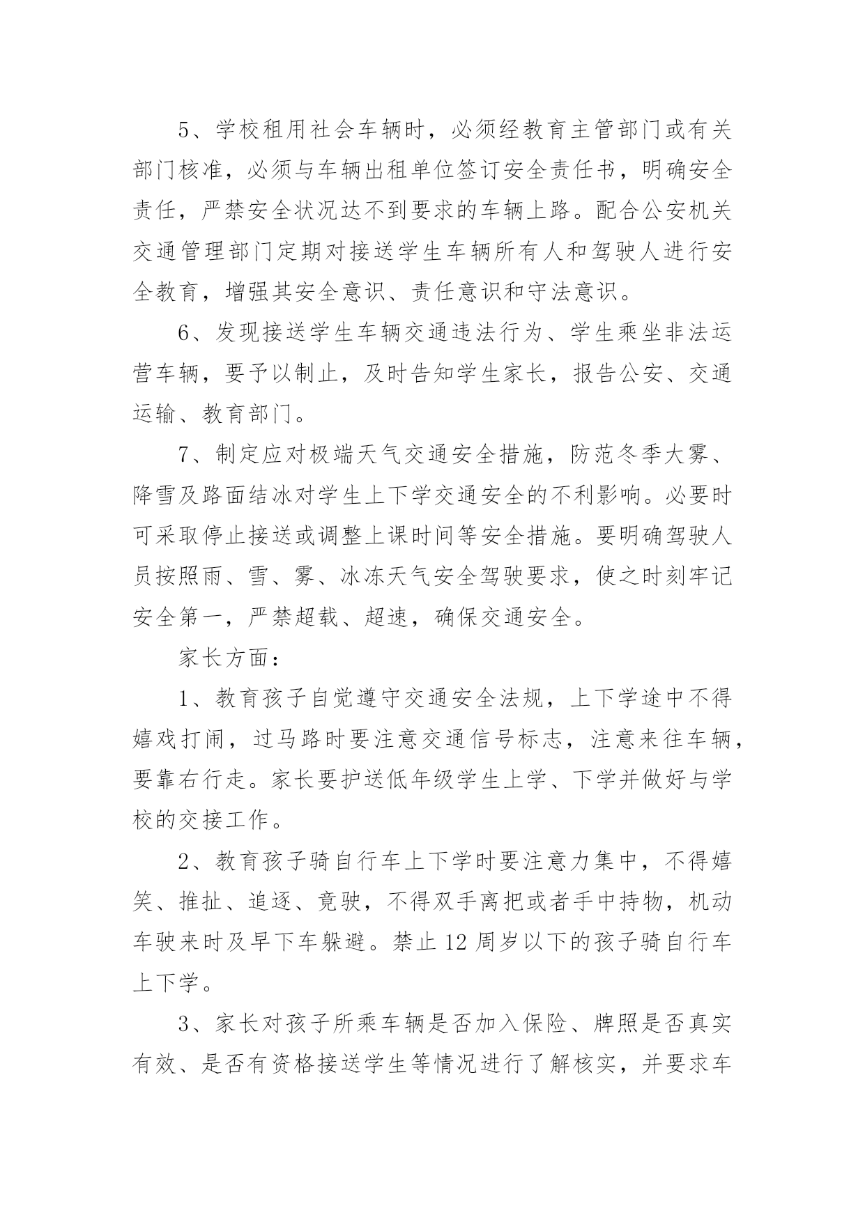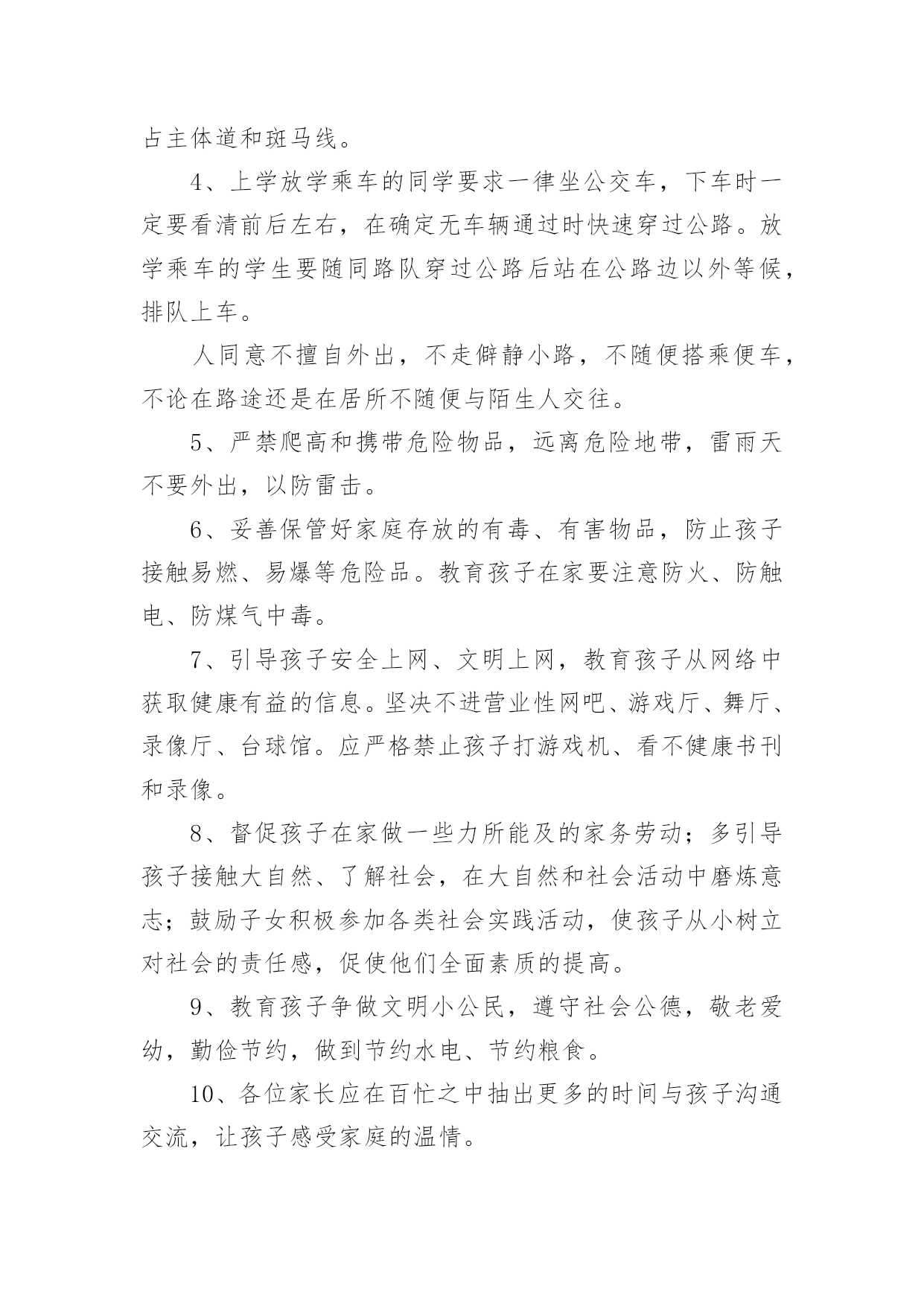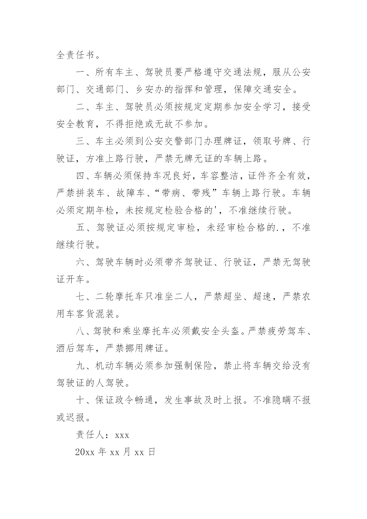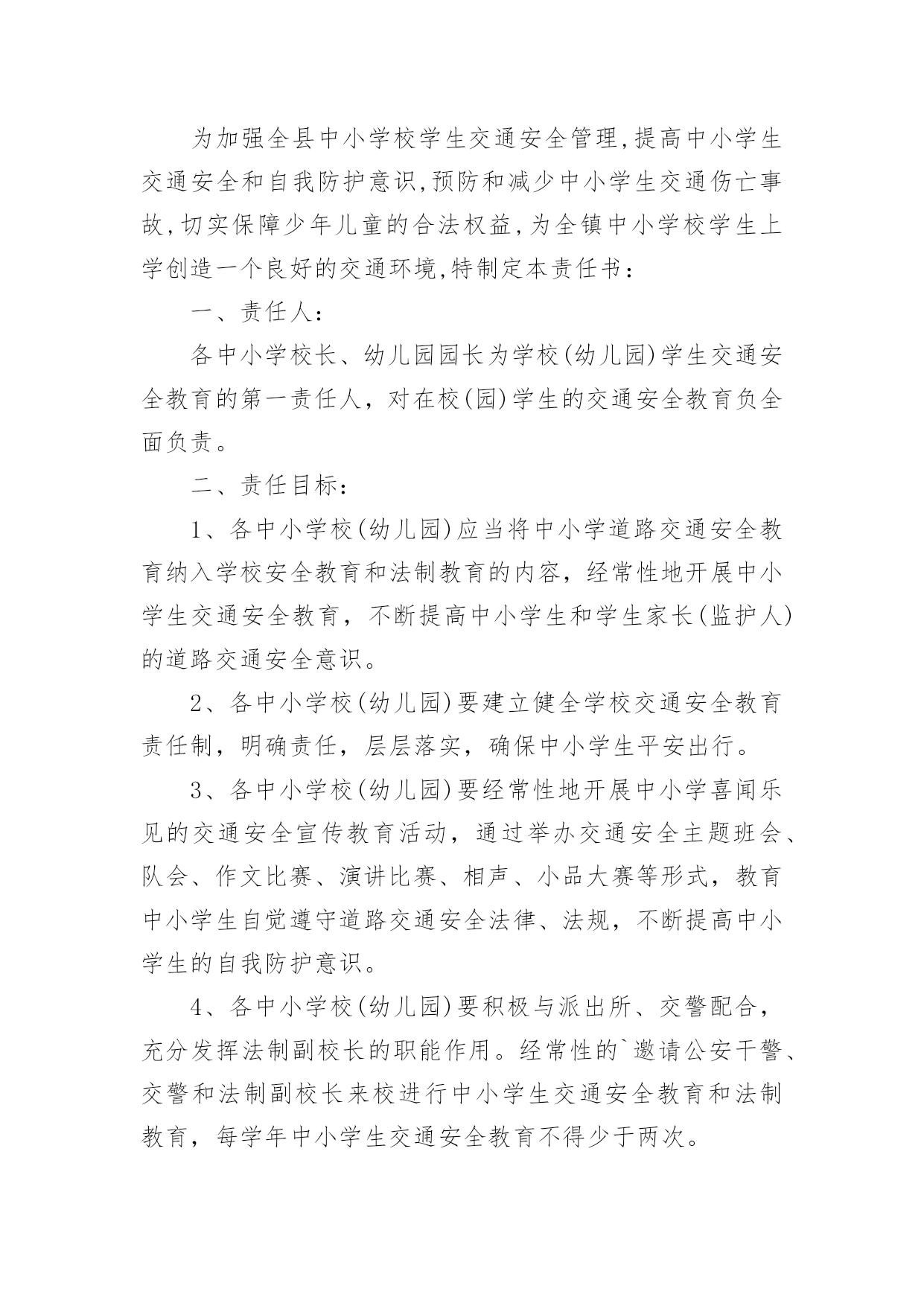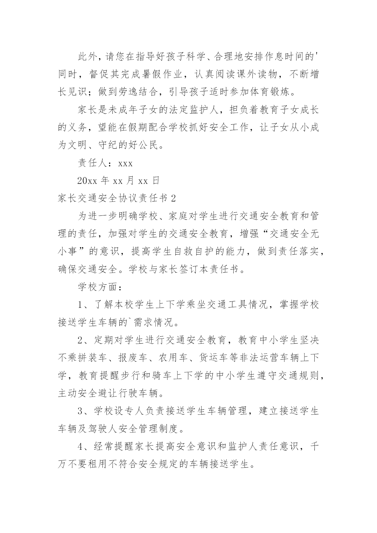 家长交通安全协议责任书家长交通安全协议责任书在充满活力,日益开放的今天,协议在生活中的使用越来越广泛,协议协调着人与人,人与事之间的关系。协议到底怎么写才合适呢?下面是小编整理的家长交通安全协议责任书,供大家参考借鉴,希望可以帮助到有需要的朋友。家长交通安全协议责任书1长岗小学地处军二路边,紧邻合界高速出口。交通便利,安全隐患却严重存在。为了确保学生的交通安全,依据道路交通法规,特制定学生道路交通规则,并与家长签订安全责任书。1、学生放学:中午以校,下午以班,整队出门。以自然村庄编排路队,每队设路队长两名,路队旗两面。放学时,由教师护送学生从斑马线处穿过公路。路上行走时,一律按路队单排靠公路右边路牙行走,不得插队、抢先、推搡、横穿公路等。2、学生上学:一律靠道路右边行走,需要横穿公路的,必须在家门口(由家长护送)或从学校前的斑马线穿过,不得在公路上玩耍、嬉戏、追逐等。3、接送学生的家长不得进入校园,使用的允许上路的各种交通工具必须停靠在大门主体道两边或公路边,不得挤占主体道和斑马线。4、上学放学乘车的同学要求一律坐公交车,下车时一定要看清前后左右,在确定无车辆通过时快速穿过公路。放学乘车的学生要随同路队穿过公路后站在公路边以外等候,排队上车。人同意不擅自外出,不走僻静小路,不随便搭乘便车,不论在路途还是在居所不随便与陌生人交往。5、严禁爬高和携带危险物品,远离危险地带,雷雨天不要外出,以防雷击。6、妥善保管好家庭存放的有毒、有害物品,防止孩子接触易燃、易爆等危险品。教育孩子在家要注意防火、防触电、防煤气中毒。7、引导孩子安全上网、文明上网,教育孩子从网络中获取健康有益的信息。坚决不进营业性网吧、游戏厅、舞厅、录像厅、台球馆。应严格禁止孩子打游戏机、看不健康书刊和录像。8、督促孩子在家做一些力所能及的家务劳动;多引导孩子接触大自然、了解社会,在大自然和社会活动中磨炼意志;鼓励子女积极参加各类社会实践活动,使孩子从小树立对社会的责任感,促使他们全面素质的提高。9、教育孩子争做文明小公民,遵守社会公德,敬老爱幼,勤俭节约,做到节约水电、节约粮食。10、各位家长应在百忙之中抽出更多的时间与孩子沟通交流,让孩子感受家庭的温情。此外,请您在指导好孩子科学、合理地安排作息时间的'同时,督促其完成暑假作业,认真阅读课外读物,不断增长见识;做到劳逸结合,引导孩子适时参加体育锻炼。家长是未成年子女的法定监护人,担负着教育子女成长的义务,望能在假期配合学校抓好安全工作,让子女从小成为文明、守纪的好公民。责任人:xxx20xx年xx月xx日家长交通安全协议责任书2为进一步明确学校、家庭对学生进行交通安全教育和管理的责任,加强对学生的交通安全教育,增强“交通安全无小事”的意识,提高学生自救自护的能力,做到责任落实,确保交通安全。学校与家长签订本责任书。学校方面:1、了解本校学生上下学乘坐交通工具情况,掌握学校接送学生车辆的`需求情况。2、定期对学生进行交通安全教育,教育中小学生坚决不乘拼装车、报废车、农用车、货运车等非法运营车辆上下学,教育提醒步行和骑车上下学的中小学生遵守交通规则,主动安全避让行驶车辆。3、学校设专人负责接送学生车辆管理,建立接送学生车辆及驾驶人安全管理制度。4、经常提醒家长提高安全意识和监护人责任意识,千万不要租用不符合安全规定的车辆接送学生。5、学校租用社会车辆时,必须经教育主管部门或有关部门核准,必须与车辆出租单位签订安全责任书,明确安全责任,严禁安全状况达不到要求的车辆上路。配合公安机关交通管理部门定期对接送学生车辆所有人和驾驶人进行安全教育,增强其安全意识、责任意识和守法意识。6、发现接送学生车辆交通违法行为、学生乘坐非法运营车辆,要予以制止,及时告知学生家长,报告公安、交通运输、教育部门。7、制定应对极端天气交通安全措施,防范冬季大雾、降雪及路面结冰对学生上下学交通安全的不利影响。必要时可采取停止接送或调整上课时间等安全措施。要明确驾驶人员按照雨、雪、雾、冰冻天气安全驾驶要求,使之时刻牢记安全第一,严禁超载、超速,确保交通安全。家长方面:1、教育孩子自觉遵守交通安全法规,上下学途中不得嬉戏打闹,过马路时要注意交通信号标志,注意来往车辆,要靠右行走。家长要护送低年级学生上学、下学并做好与学校的交接工作。2、教育孩子骑自行车上下学时要注意力集中,不得嬉笑、推扯、追逐、竟驶,不得双手离把或者手中持物,机动车驶来时及早下车躲避。禁止12周岁以下的孩子骑自行车上下学。3、家长对孩子所乘车辆是否加入保险、牌照是否真实有效、是否有资格接送学生等情况进行了解核实,并要求车主严格办理各种手续,不超载、超速和逆向行驶。4、教育孩子不乘坐超速超载车、无牌无证车、拼装车、报废车、三轮车、农用车和拖拉机等存在安全隐患的车辆。乘坐合格车辆时,家长