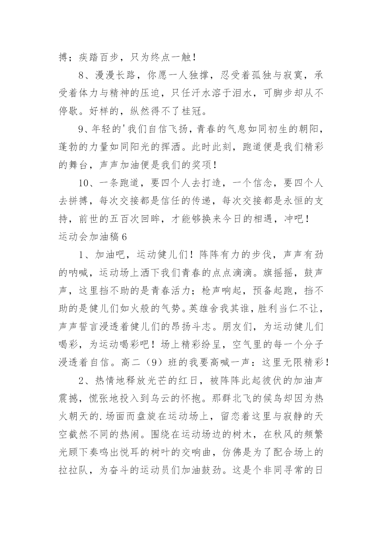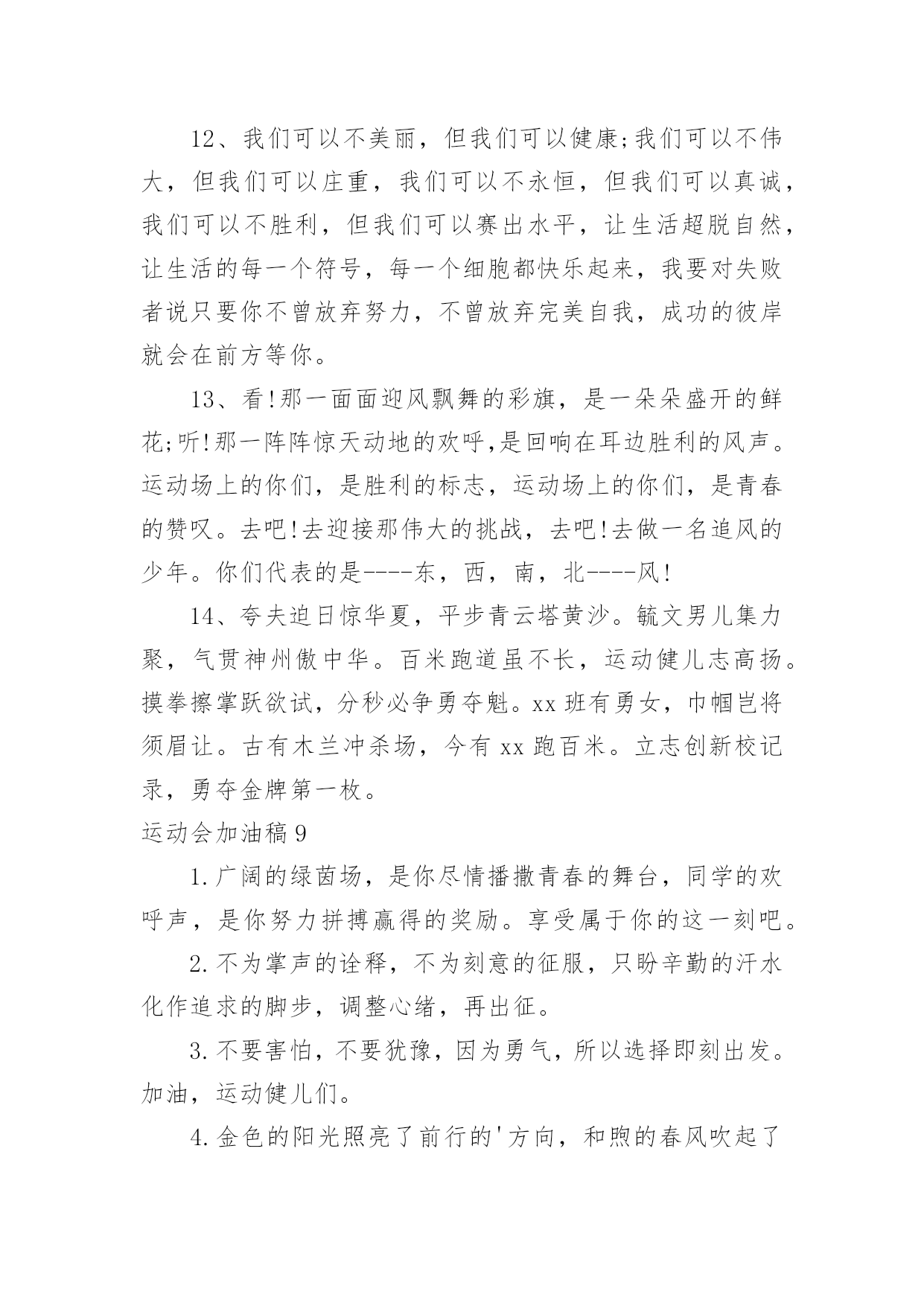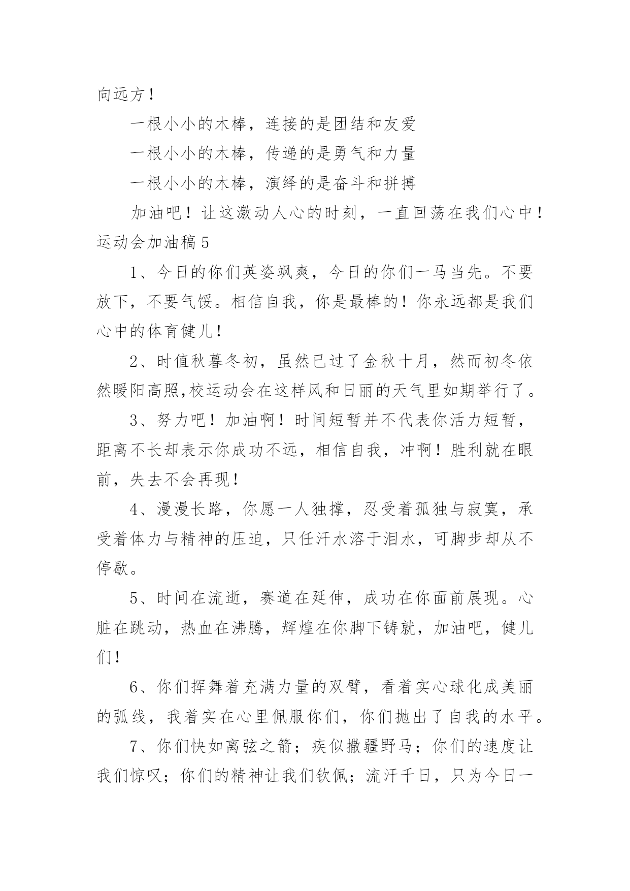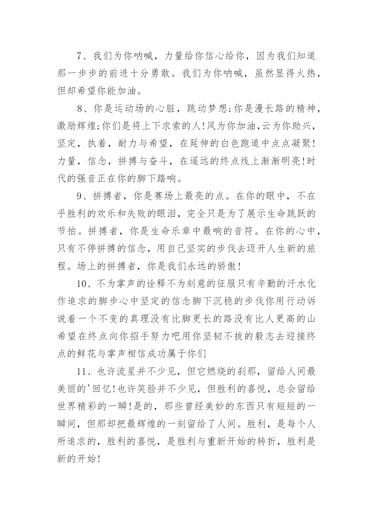 运动会加油稿运动会加油稿在快速变化和不断变革的今天,各种加油稿频频出现,借助加油稿可以激起人的希望,催人奋进。你知道加油稿怎样写才规范吗?下面是小编收集整理的运动会加油稿,欢迎大家分享。运动会加油稿1如海上的浪花,似浪花上的云燕。灵巧的.速跑,轻轻的一跃,落下的是小小的横竿,升起的是不屈的信念。在阳光的照耀下,跳高的比赛场地格外辉煌,运动健儿们,用那矫键的身躯,冲刺着一个又一个的高度。没有尝试,怎会知道自己是否为强者,超越自己,也许会创造一番新天地!运动健儿们加油吧,去创造一份份奇奇迹,去创造一份份惊喜!运动会加油稿2漫漫征途,加油吧!运动健儿们。不要畏惧对手的强大,你的对手只有你自己。800米算不得什么,付出的泪水就要得到回报。看,秋风在为你喝彩,和煦的阳光在为你加油。冲吧,运动健儿们。你所有的朋友在为你呐喊。勇敢的冲吧,勇士们。不要畏惧对手的.强大。你的对手只有自己。勇敢的冲吧。800米算不得什么。付出的汗水就要得到回报。胜利的泪水就要顺颊而下!也许你心里忐忑不安。我们的心里早已热血沸腾。运动会加油稿3拼搏者拼搏者,你是赛场上最亮的点。在你的眼中,不在乎胜利的欢乐和失败的眼泪,完全只是为了展示生命跳跃的节拍。拼搏者,你是生命乐章中最响的音符。在你的`心中,只有不停拼搏的信念,用自己坚实的步伐去迈开人生新的旅程。场上的拼搏者,你是我们永远的骄傲!珍惜每一次每一次起跑,都充满了希望,每一次腾空,都迸发出力量。每一次成功,都书写着激昂。每一次失败,都孕育着成长。珍惜这每一次的喜悦和失落,珍惜这每一次的感动和忧伤。让花季的心情挥洒万一片绮丽的彩霞,让青春的理想谱写出一段美妙的乐章。不要沉默不要沉默,不要卑怯的退缩;不要沉默,不要颓废的包裹;不要沉默,我们要拼搏,要在沉静中奋起,丢开羞涩,不要沉默!运动会加油稿4人生犹如一条路,在这段路中,有平坦的大道,也有崎岖的小路,有灿烂的鲜花,也有密布的荆棘;有成功的喜悦,也有失败的悲伤。失败了,我们可以爬起来再走;失败了,并不意味着你比别人差;失败了,也不能说没有成功。这次的'跌倒是为了下次更高的跳跃。失败,并不可怕,为了追寻自己的理想,我们要飞翔,去接受风雨的洗礼,为了实现人生的夙愿,我们要飞翔,去接受春风和朝阳。虽然我们并不坚强的翅膀也许会受伤,但我们一定要飞向远方!一根小小的木棒,连接的是团结和友爱一根小小的木棒,传递的是勇气和力量一根小小的木棒,演绎的是奋斗和拼搏加油吧!让这激动人心的时刻,一直回荡在我们心中!运动会加油稿51、今日的你们英姿飒爽,今日的你们一马当先。不要放下,不要气馁。相信自我,你是最棒的!你永远都是我们心中的体育健儿!2、时值秋暮冬初,虽然已过了金秋十月,然而初冬依然暖阳高照,校运动会在这样风和日丽的天气里如期举行了。3、努力吧!加油啊!时间短暂并不代表你活力短暂,距离不长却表示你成功不远,相信自我,冲啊!胜利就在眼前,失去不会再现!4、漫漫长路,你愿一人独撑,忍受着孤独与寂寞,承受着体力与精神的压迫,只任汗水溶于泪水,可脚步却从不停歇。5、时间在流逝,赛道在延伸,成功在你面前展现。心脏在跳动,热血在沸腾,辉煌在你脚下铸就,加油吧,健儿们!6、你们挥舞着充满力量的双臂,看着实心球化成美丽的弧线,我着实在心里佩服你们,你们抛出了自我的水平。7、你们快如离弦之箭;疾似撒疆野马;你们的速度让我们惊叹;你们的精神让我们钦佩;流汗千日,只为今日一搏;疾踏百步,只为终点一触!8、漫漫长路,你愿一人独撑,忍受着孤独与寂寞,承受着体力与精神的压迫,只任汗水溶于泪水,可脚步却从不停歇。好样的,纵然得不了桂冠。9、年轻的'我们自信飞扬,青春的气息如同初生的朝阳,蓬勃的力量如同阳光的挥洒。此时此刻,跑道便是我们精彩的舞台,声声加油便是我们的奖项!10、一条跑道,要四个人去打造,一个信念,要四个人去拼搏,每次交接都是信任的传递,每次交接都是永恒的支持,前世的五百次回眸,才能够换来今日的相遇,冲吧!运动会加油稿61、加油吧,运动健儿们!阵阵有力的步伐,声声有劲的呐喊,运动场上洒下我们青春的点点滴滴。旗摇摇,鼓声声,这里挡不助的是青春活力;枪声响起,预备起跑,挡不助的是健儿们如火般的气势。英雄舍我其谁,胜利当仁不让,声声誓言浸透着健儿们的昂扬斗志。朋友们,为运动健儿们喝彩,为运动喝彩吧!场上精彩纷呈,空气里的每一个分子浸透着自信。高二(9)班的我要高喊一声:这里无限精彩!2、热情地释放光芒的红日,被阵阵此起彼伏的加油声震撼,慌张地投入到乌云的怀抱。那群北飞的候鸟却因为热火朝天的.场面而盘旋在运动场上,留恋着这里与寂静的天空截然不同的热闹。围绕在运动场边的树木,在秋风的频繁光顾下奏鸣出悦耳的树叶的交响曲,仿佛是为了配合场上的拉拉队,为奋斗的运动员们加油鼓劲。这是个非同寻常的日子。场上的学子