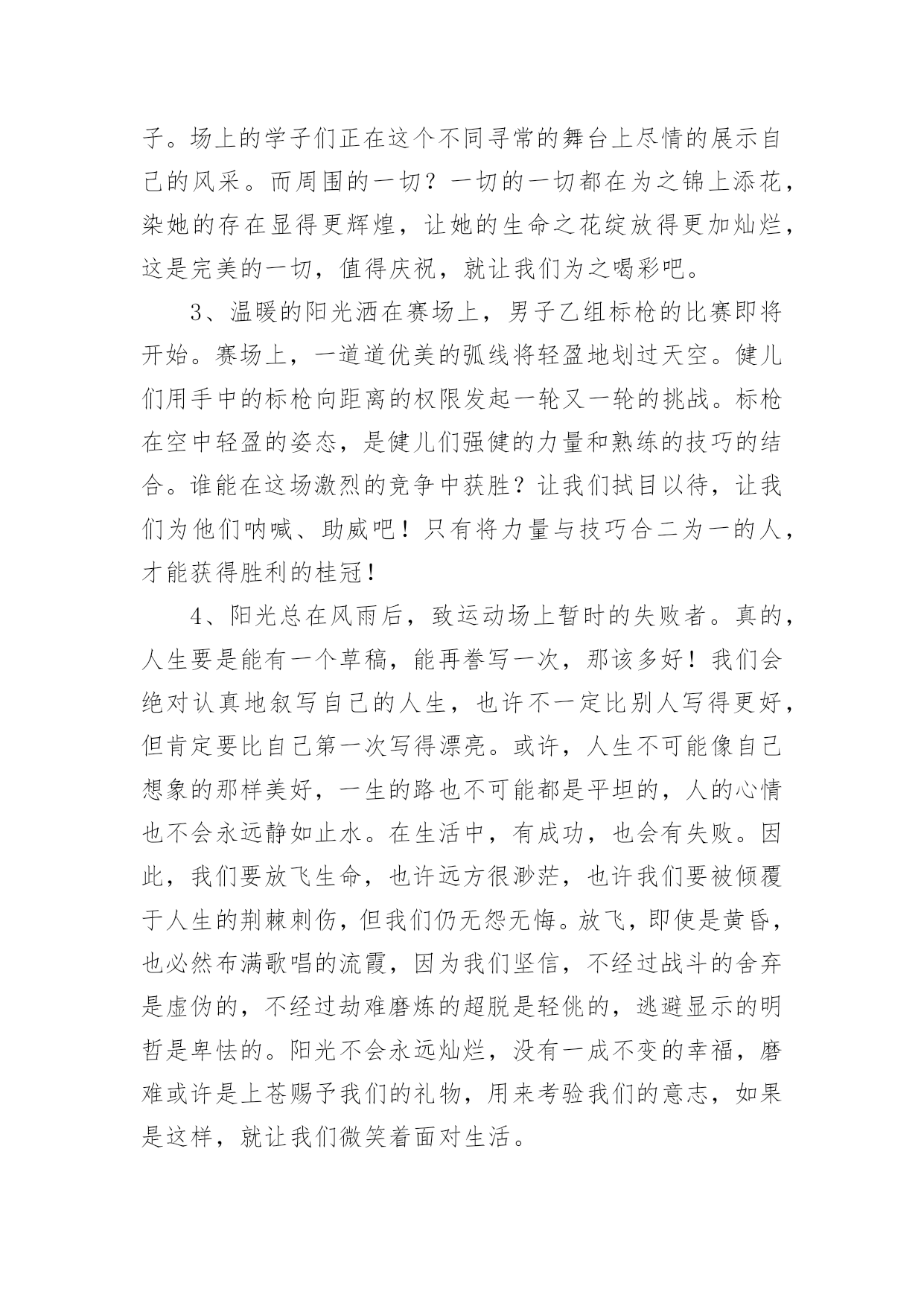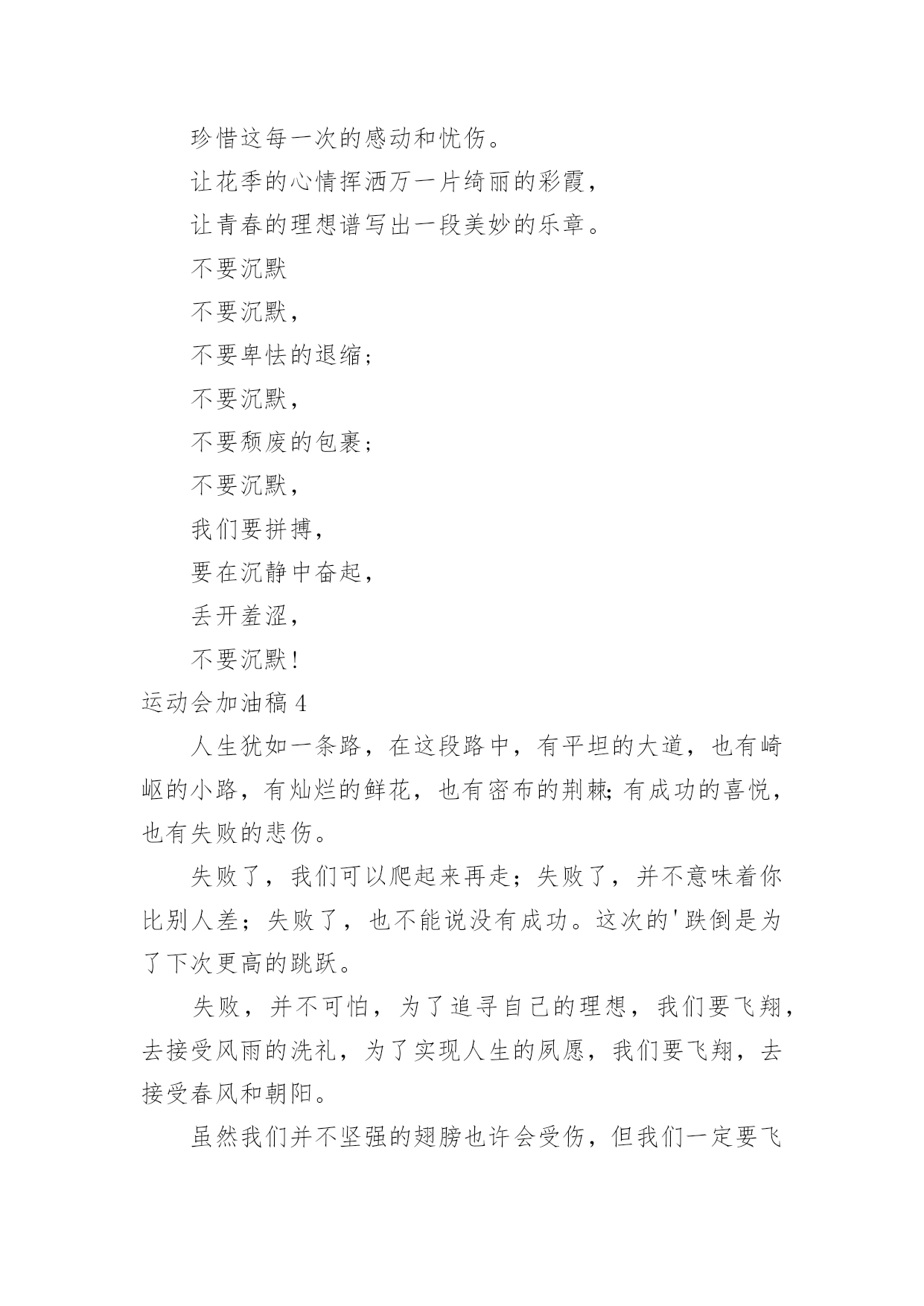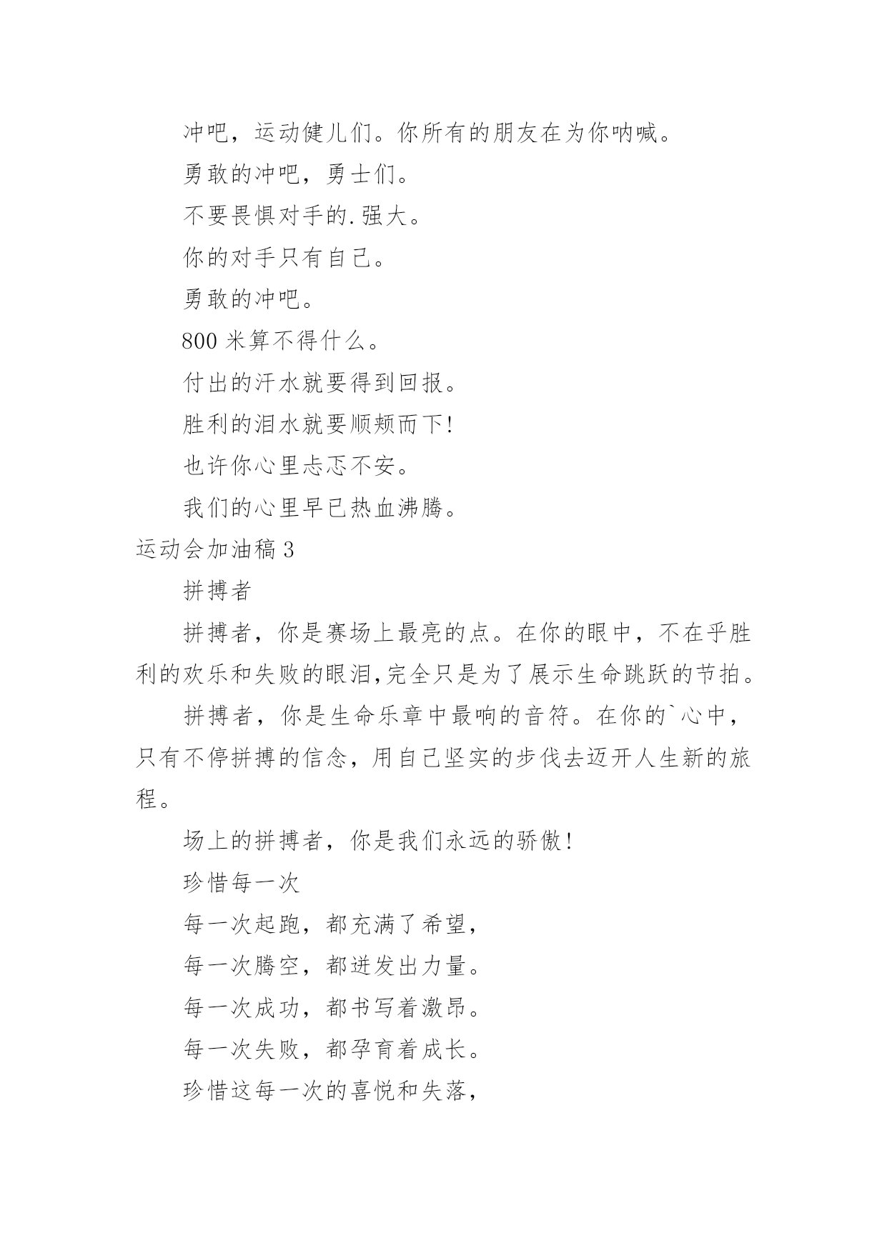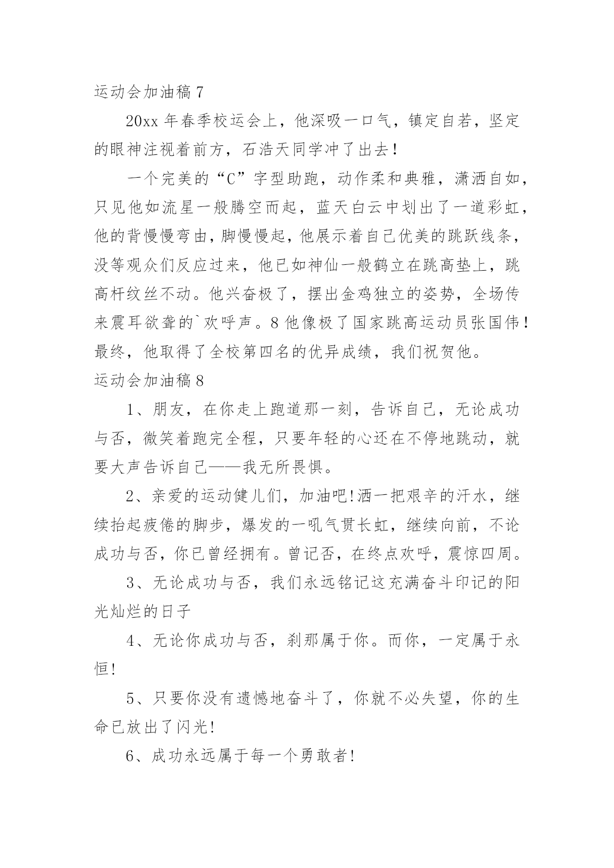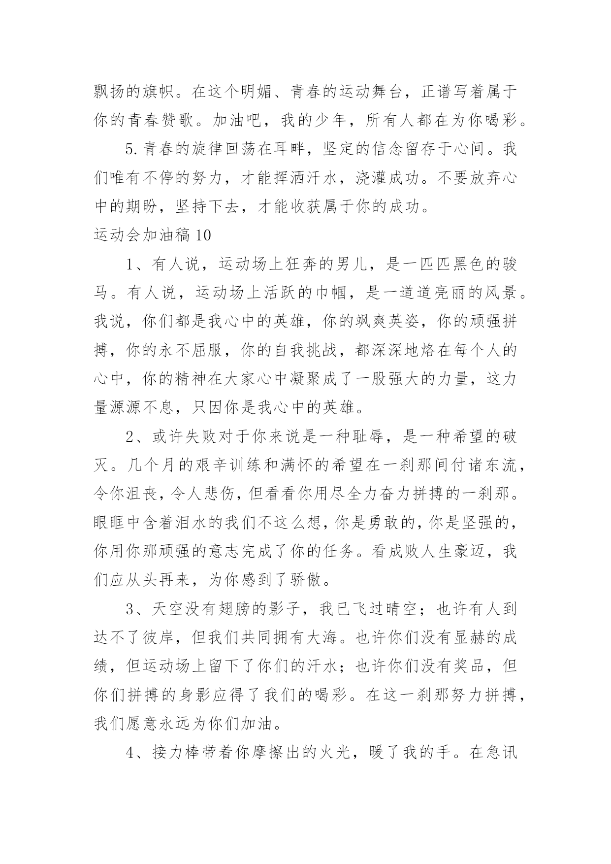 运动会加油稿运动会加油稿在快速变化和不断变革的今天,各种加油稿频频出现,借助加油稿可以激起人的希望,催人奋进。你知道加油稿怎样写才规范吗?下面是小编收集整理的运动会加油稿,欢迎大家分享。运动会加油稿1如海上的浪花,似浪花上的云燕。灵巧的.速跑,轻轻的一跃,落下的是小小的横竿,升起的是不屈的信念。在阳光的照耀下,跳高的比赛场地格外辉煌,运动健儿们,用那矫键的身躯,冲刺着一个又一个的高度。没有尝试,怎会知道自己是否为强者,超越自己,也许会创造一番新天地!运动健儿们加油吧,去创造一份份奇奇迹,去创造一份份惊喜!运动会加油稿2漫漫征途,加油吧!运动健儿们。不要畏惧对手的强大,你的对手只有你自己。800米算不得什么,付出的泪水就要得到回报。看,秋风在为你喝彩,和煦的阳光在为你加油。冲吧,运动健儿们。你所有的朋友在为你呐喊。勇敢的冲吧,勇士们。不要畏惧对手的.强大。你的对手只有自己。勇敢的冲吧。800米算不得什么。付出的汗水就要得到回报。胜利的泪水就要顺颊而下!也许你心里忐忑不安。我们的心里早已热血沸腾。运动会加油稿3拼搏者拼搏者,你是赛场上最亮的点。在你的眼中,不在乎胜利的欢乐和失败的眼泪,完全只是为了展示生命跳跃的节拍。拼搏者,你是生命乐章中最响的音符。在你的`心中,只有不停拼搏的信念,用自己坚实的步伐去迈开人生新的旅程。场上的拼搏者,你是我们永远的骄傲!珍惜每一次每一次起跑,都充满了希望,每一次腾空,都迸发出力量。每一次成功,都书写着激昂。每一次失败,都孕育着成长。珍惜这每一次的喜悦和失落,珍惜这每一次的感动和忧伤。让花季的心情挥洒万一片绮丽的彩霞,让青春的理想谱写出一段美妙的乐章。不要沉默不要沉默,不要卑怯的退缩;不要沉默,不要颓废的包裹;不要沉默,我们要拼搏,要在沉静中奋起,丢开羞涩,不要沉默!运动会加油稿4人生犹如一条路,在这段路中,有平坦的大道,也有崎岖的小路,有灿烂的鲜花,也有密布的荆棘;有成功的喜悦,也有失败的悲伤。失败了,我们可以爬起来再走;失败了,并不意味着你比别人差;失败了,也不能说没有成功。这次的'跌倒是为了下次更高的跳跃。失败,并不可怕,为了追寻自己的理想,我们要飞翔,去接受风雨的洗礼,为了实现人生的夙愿,我们要飞翔,去接受春风和朝阳。虽然我们并不坚强的翅膀也许会受伤,但我们一定要飞向远方!一根小小的木棒,连接的是团结和友爱一根小小的木棒,传递的是勇气和力量一根小小的木棒,演绎的是奋斗和拼搏加油吧!让这激动人心的时刻,一直回荡在我们心中!运动会加油稿51、今日的你们英姿飒爽,今日的你们一马当先。不要放下,不要气馁。相信自我,你是最棒的!你永远都是我们心中的体育健儿!2、时值秋暮冬初,虽然已过了金秋十月,然而初冬依然暖阳高照,校运动会在这样风和日丽的天气里如期举行了。3、努力吧!加油啊!时间短暂并不代表你活力短暂,距离不长却表示你成功不远,相信自我,冲啊!胜利就在眼前,失去不会再现!4、漫漫长路,你愿一人独撑,忍受着孤独与寂寞,承受着体力与精神的压迫,只任汗水溶于泪水,可脚步却从不停歇。5、时间在流逝,赛道在延伸,成功在你面前展现。心脏在跳动,热血在沸腾,辉煌在你脚下铸就,加油吧,健儿们!6、你们挥舞着充满力量的双臂,看着实心球化成美丽的弧线,我着实在心里佩服你们,你们抛出了自我的水平。7、你们快如离弦之箭;疾似撒疆野马;你们的速度让我们惊叹;你们的精神让我们钦佩;流汗千日,只为今日一搏;疾踏百步,只为终点一触!8、漫漫长路,你愿一人独撑,忍受着孤独与寂寞,承受着体力与精神的压迫,只任汗水溶于泪水,可脚步却从不停歇。好样的,纵然得不了桂冠。9、年轻的'我们自信飞扬,青春的气息如同初生的朝阳,蓬勃的力量如同阳光的挥洒。此时此刻,跑道便是我们精彩的舞台,声声加油便是我们的奖项!10、一条跑道,要四个人去打造,一个信念,要四个人去拼搏,每次交接都是信任的传递,每次交接都是永恒的支持,前世的五百次回眸,才能够换来今日的相遇,冲吧!运动会加油稿61、加油吧,运动健儿们!阵阵有力的步伐,声声有劲的呐喊,运动场上洒下我们青春的点点滴滴。旗摇摇,鼓声声,这里挡不助的是青春活力;枪声响起,预备起跑,挡不助的是健儿们如火般的气势。英雄舍我其谁,胜利当仁不让,声声誓言浸透着健儿们的昂扬斗志。朋友们,为运动健儿们喝彩,为运动喝彩吧!场上精彩纷呈,空气里的每一个分子浸透着自信。高二(9)班的我要高喊一声:这里无限精彩!2、热情地释放光芒的红日,被阵阵此起彼伏的加油声震撼,慌张地投入到乌云的怀抱。那群北飞的候鸟却因为热火朝天的.场面而盘旋在运动场上,留恋着这里与寂静的天空截然不同的热闹。围绕在运动场边的树木,在秋风的频繁光顾下奏鸣出悦耳的树叶的交响曲,仿佛是为了配合场上的拉拉队,为奋斗的运动员们加油鼓劲。这是个非同寻常的日子。场上的学子