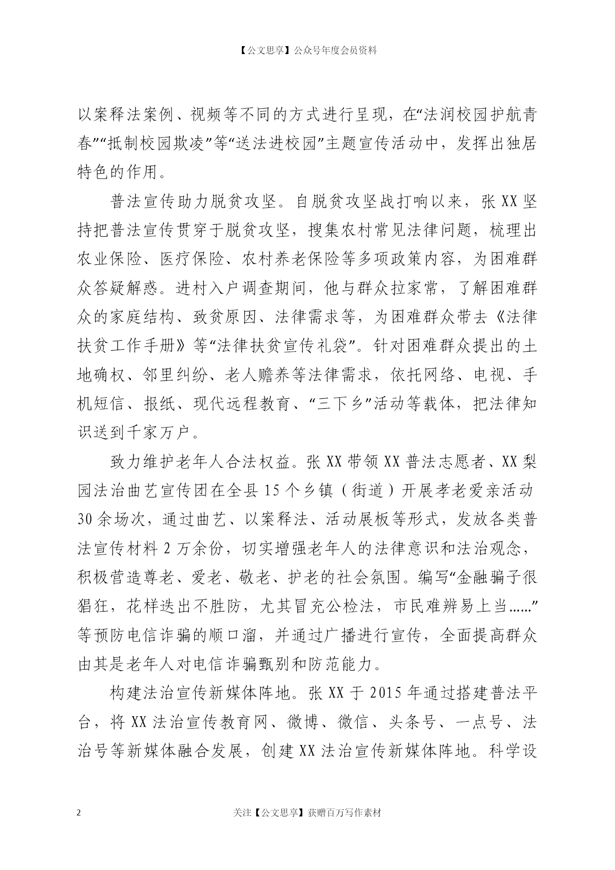 【公文思享】公众号年度会员资料PAGEPAGE4关注【公文思享】获赠百万写作素材司法行政系统英模事迹材料张XX,XX司法局普法与依法治理科副科长,多年来,他始终恪守一个共产党员的宗旨和信念,在平凡的工作岗位上,积极探索和创新法治宣传工作的新路,将法治宣传融入寻常百姓的生活,以求真务实的精神投身普法工作实践。先后荣获“法润江苏”系列专项活动先进个人、徐州市普法工作先进个人等荣誉。疫情中做最美“逆行人”。2020年初,面对突如其来的新冠肺炎疫情,张XX作为90后年轻党员,主动请缨,在社区开展志愿服务,对进出人员进行消毒登记,向群众发放疫情防控法律知识宣传材料,普及最新的疫情防控动态,讲解卫生防疫相关知识,了解群众身心状况,宣讲防网络诈骗相关知识等。疫情期间,他通过新媒体推送相关文章2000余次,在线解答群众问题30余次,累计发放、张贴疫情防控法律知识宣传材料2000余份,接受现场咨询100余次。法治护航青少年成长。少年强则国强,为做好青少年普法工作,张XX认真钻研,自学《教育学》《心理学》《教育心理学》等相关内容,并于2018年5月通过国家教师资格认证。张XX认真分析青少年不同年龄段的心理、生理特征,将《宪法》《预防未成年人犯罪法》《未成年人保护法》等法律知识,通过教案、以案释法案例、视频等不同的方式进行呈现,在“法润校园护航青春”“抵制校园欺凌”等“送法进校园”主题宣传活动中,发挥出独居特色的作用。普法宣传助力脱贫攻坚。自脱贫攻坚战打响以来,张XX坚持把普法宣传贯穿于脱贫攻坚,搜集农村常见法律问题,梳理出农业保险、医疗保险、农村养老保险等多项政策内容,为困难群众答疑解惑。进村入户调查期间,他与群众拉家常,了解困难群众的家庭结构、致贫原因、法律需求等,为困难群众带去《法律扶贫工作手册》等“法律扶贫宣传礼袋”。针对困难群众提出的土地确权、邻里纠纷、老人赡养等法律需求,依托网络、电视、手机短信、报纸、现代远程教育、“三下乡”活动等载体,把法律知识送到千家万户。致力维护老年人合法权益。张XX带领XX普法志愿者、XX梨园法治曲艺宣传团在全县15个乡镇(街道)开展孝老爱亲活动30余场次,通过曲艺、以案释法、活动展板等形式,发放各类普法宣传材料2万余份,切实增强老年人的法律意识和法治观念,积极营造尊老、爱老、敬老、护老的社会氛围。编写“金融骗子很猖狂,花样迭出不胜防,尤其冒充公检法,市民难辨易上当……”等预防电信诈骗的顺口溜,并通过广播进行宣传,全面提高群众由其是老年人对电信诈骗甄别和防范能力。构建法治宣传新媒体阵地。张XX于2015年通过搭建普法平台,将XX法治宣传教育网、微博、微信、头条号、一点号、法治号等新媒体融合发展,创建XX法治宣传新媒体阵地。科学设置工作动态、以案释法、法律法规、法治文化等栏目,实现“指尖上的微普法”,让群众动动手指就能获取法律知识。自新媒体阵地建成以来,累计更新普法工作动态、以案释法案例、新修订颁布的法律法规等1.6万余条,阅读量达200万余人次,解答群众咨询300余次,为群众提供在线服务400余人次。推动法治文化与乡村振兴融合。张XX创新性地推动法治宣传工作和旅游节假日有机结合,在“冰·蝉文化节”、“苹果节”、“梨花节”等特色文化节,利用苹果自摘园、盛世梨园等优势资源,通过果园寻“法”宝、寻找“平安果”、梨园赏花探“法”等趣味横生的小游戏,开展“德法涵养文明共建绿色生活”“美好生活法典相伴”等主题活动,让游客和群众在寓教于乐中学习到法律知识。「公文思享」全国公文写作交流平台做全国最专业的公文资料服务平台,各种资料应有尽有,有述职述廉、计划要点、各类讲话以及靓词金句、写作提纲等专题素材,目前已更新各类专刊(范文、素材、讲话汇编、解析)等1200余期,分享范文几万篇,并将持续更新。平台还有专家不定期更新范文解析、写作教学等资源。加入我们就可以享受所有资源。平台紧扣当前热门工作(如民主生活会、贯彻五中全会精神、乡村振兴、疫情防控等)分享相关资料,确保文稿资料的适用性和紧急性。同时我们有专家提供写作咨询、建议参考、文章修改和代写服务等。加入方式,微信公众号搜索”公文思享“或者扫描下方二维码联系到我们,也可以直接添加微信gwsxj123办理会员。