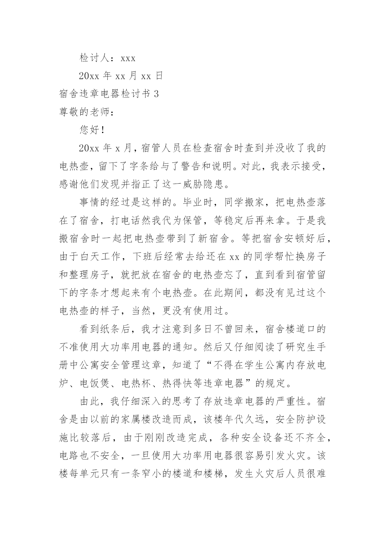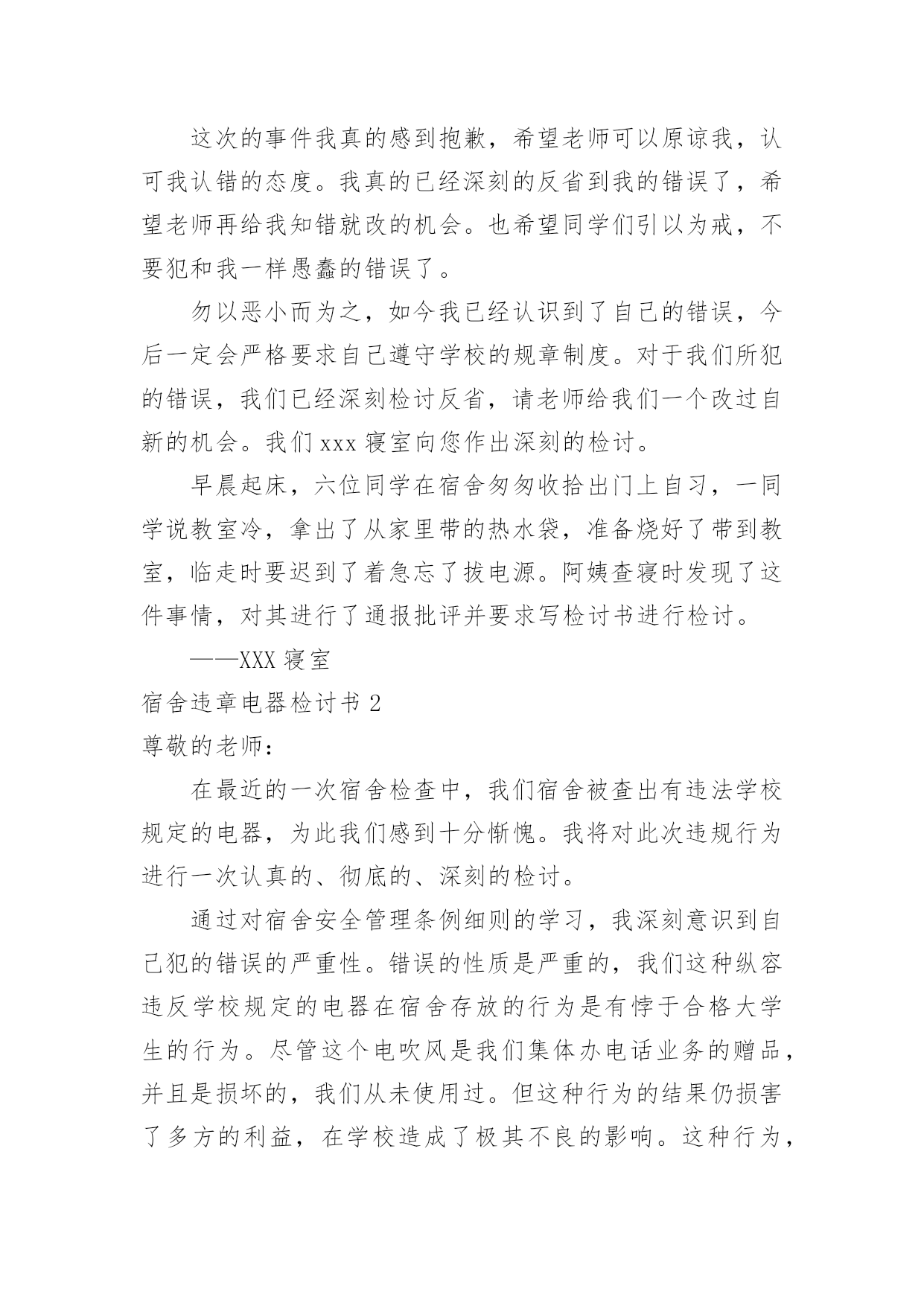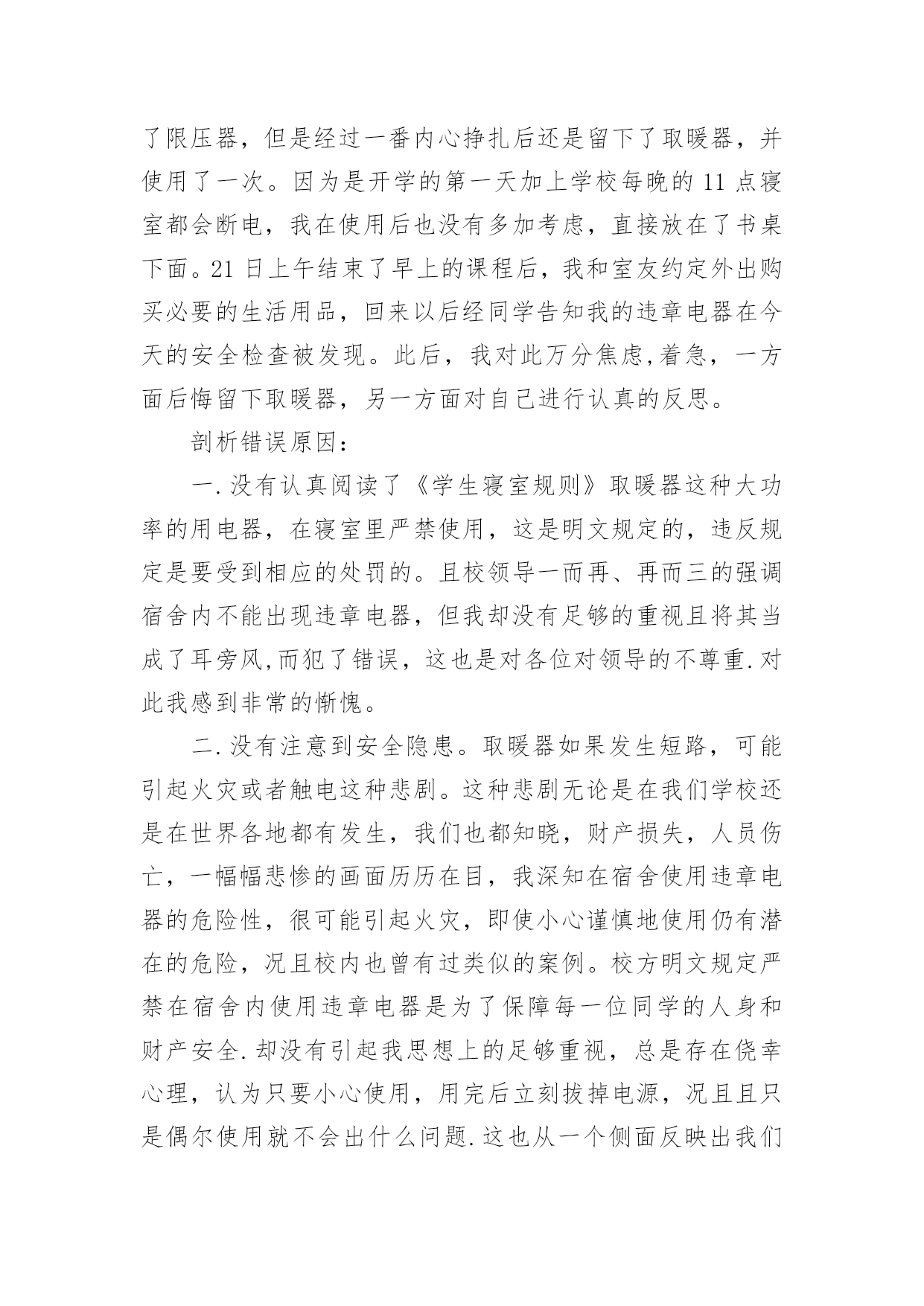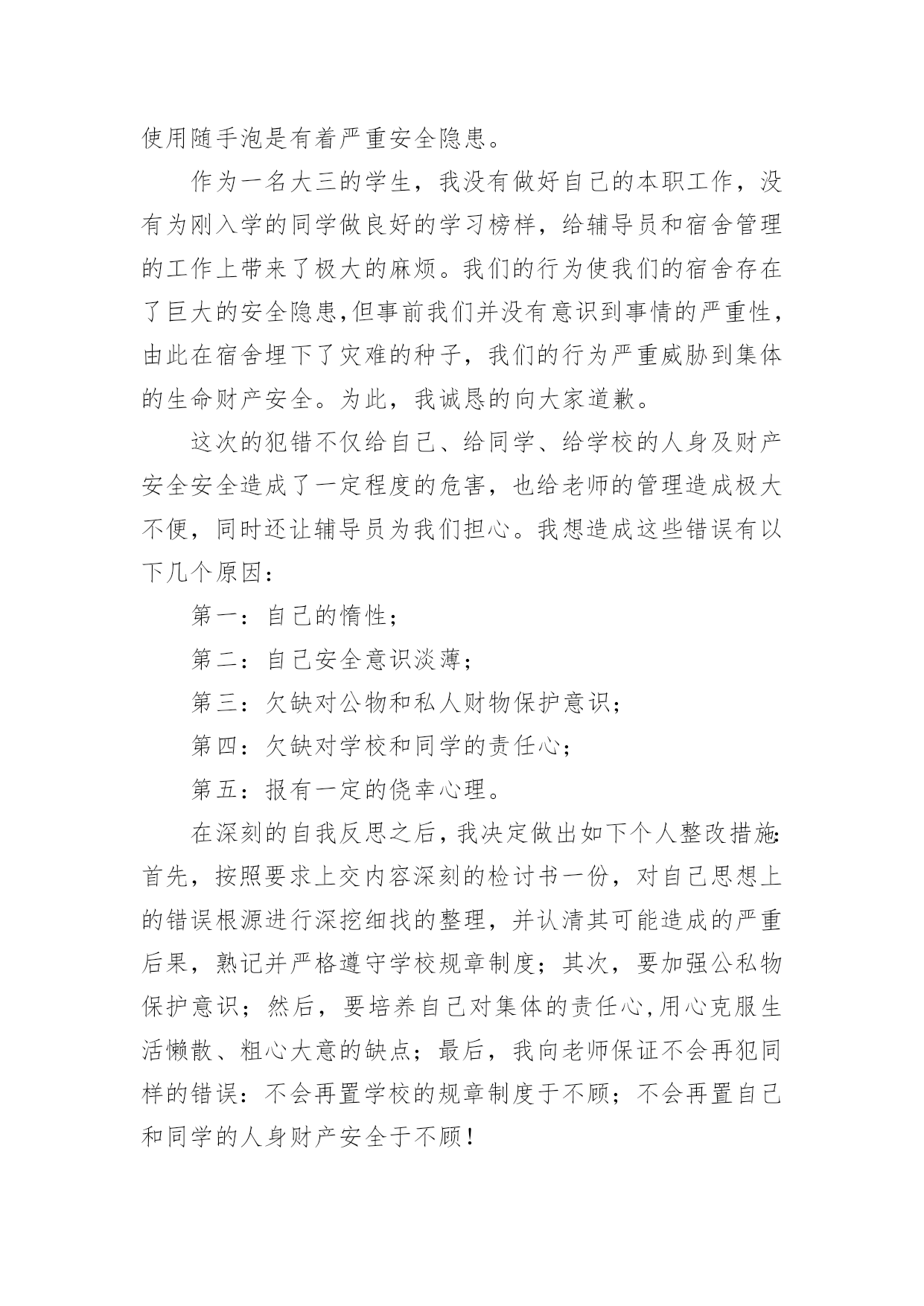 宿舍违章电器检讨书宿舍违章电器检讨书在有过错的情况下,为了避免再犯,常常要求写检讨书,以对出现的问题和过错进行检讨,请注意写检讨要把原因讲清楚。那么对应的检讨书到底怎么写呢?以下是小编精心整理的宿舍违章电器检讨书,欢迎阅读,希望大家能够喜欢。宿舍违章电器检讨书1老师们同学们:大家好!我们对自己违反学校规定在寝室内使用违章电器的行为向您表示歉意和强烈的自责。我们犯了使用大功率电器的错误,多亏老师及时发现,阿姨及时制止,才避免了更大的错误的发生。如果那天没有被发现,我们一定会犯错误,等到真的出了事情,后悔也没用了。针对所犯的错误我们寝室决定执行以下整改措施:(1)立即召开寝室会议,就违章用电的事件相关人做出深刻地检讨,给寝室带来的不好影响要负起责任,并立下保证。(2)重新阅读相关规则,保证日后绝对不做与规则相违背的事情。(3)检查自己的用电用品中是否还存在着违章电器,一旦发现立即处理,决不再用。这次的事件我真的感到抱歉,希望老师可以原谅我,认可我认错的态度。我真的已经深刻的反省到我的错误了,希望老师再给我知错就改的机会。也希望同学们引以为戒,不要犯和我一样愚蠢的错误了。勿以恶小而为之,如今我已经认识到了自己的错误,今后一定会严格要求自己遵守学校的规章制度。对于我们所犯的错误,我们已经深刻检讨反省,请老师给我们一个改过自新的机会。我们xxx寝室向您作出深刻的检讨。早晨起床,六位同学在宿舍匆匆收拾出门上自习,一同学说教室冷,拿出了从家里带的热水袋,准备烧好了带到教室,临走时要迟到了着急忘了拔电源。阿姨查寝时发现了这件事情,对其进行了通报批评并要求写检讨书进行检讨。——XXX寝室宿舍违章电器检讨书2尊敬的老师:在最近的一次宿舍检查中,我们宿舍被查出有违法学校规定的电器,为此我们感到十分惭愧。我将对此次违规行为进行一次认真的、彻底的、深刻的检讨。通过对宿舍安全管理条例细则的学习,我深刻意识到自己犯的错误的严重性。错误的性质是严重的,我们这种纵容违反学校规定的电器在宿舍存放的行为是有悖于合格大学生的行为。尽管这个电吹风是我们集体办电话业务的赠品,并且是损坏的,我们从未使用过。但这种行为的结果仍损害了多方的利益,在学校造成了极其不良的影响。这种行为,即使没有对宿舍及周围同学带来损失,这个举动本身就违背了做合格学生的原则。作为一名当代大学生,一名正在接受高等教育的人来说,如此低下的安全防范意识是对老师工作不尊重的表现,也是对身边的同学的生命和财产不尊重的表现,这种表现显然不符合社会对我们的要求。其次,我们的这种行为还在寝室间造成了极其不良的影响,破坏了学校的规章管理制度,不利于学校和院系的风气建设。同时,对学校形象也造成了一定的损害。我们应该去维护学校的形象而不是去破坏它。我们只有认真反思,寻找极大错误后面的深刻根源,认清问题的本质,才能给学校、集体、老师和自己一个交代,从而得以改正自己的错误,取得进步。作为一名大学生,我没有做好自己的本职工作,没有为刚入学的同学做良好的学习榜样,给宿舍管理科的老师在宿舍管理的工作上带来了极大的麻烦。我们的行为使我们的宿舍存在了巨大的安全隐患,但事前我们并没有意识到事情的严重性,由此在宿舍埋下了灾难的种子,我们的行为严重威胁到集体的生命财产安全。为此,我们全体宿舍成员诚恳的向大家道歉。我们认真阅读了上海商学院女生宿舍失火的新闻报道,认识到了这是用鲜血和生命铸成的惨痛教训。我们更深刻的意识到我们所犯错误的严重性,也理解了宿管科来世和学校领导对此事的重视。为此,我们深感内疚和惭愧。我们辜负了老师对我们的殷切希望,辜负了同学们对我们的信任,辜负了宿管科老师的教诲。我们再次向老师们和同学们进行诚挚的道歉。宿舍管理科的老师同其他老师一样,诚挚殷切的希望我们成为社会的栋梁之材。不仅仅在学习,还有生活方面也应认真的对待。我们在学好老师教给我们的知识的同时,更要学好如何做人,以及如何做一个对国家对社会有用的人。宿舍管理科的来世如同父母对我们的生活方面的爱是无私的,所以我们要把这种无私的爱发扬。通过这件事我深刻的感受到老师们同学校对我们那种恨铁不成钢的心情,这使我们感到万分的内疚与惭愧不安,我们太辜负我们的老师和学校的期望。这件事情对我们的教育是深刻的,同时也是惨痛的。我们的这次经历更使我们深深体会到安全意识的重要性。安全防范意识是非常重要的,这不仅关系到我们自己的生命财产安全,更关系到集体和大家的利益,我们的这种行为是一种自私的表现。因此,我们集体总结反思,反省自己的错误,并在以后的日子里互相监督宿舍是我们生活起居的地方,安全问题就显得尤为突出重要。我们每个人都有义务参与保护工作,并有权力生活在一个安全的环境中。因此我们要警钟长鸣,消除一些安全隐患,共同建设一个健康安全的生活环境。对于这次违规行为,我们已深刻意识到自己的错