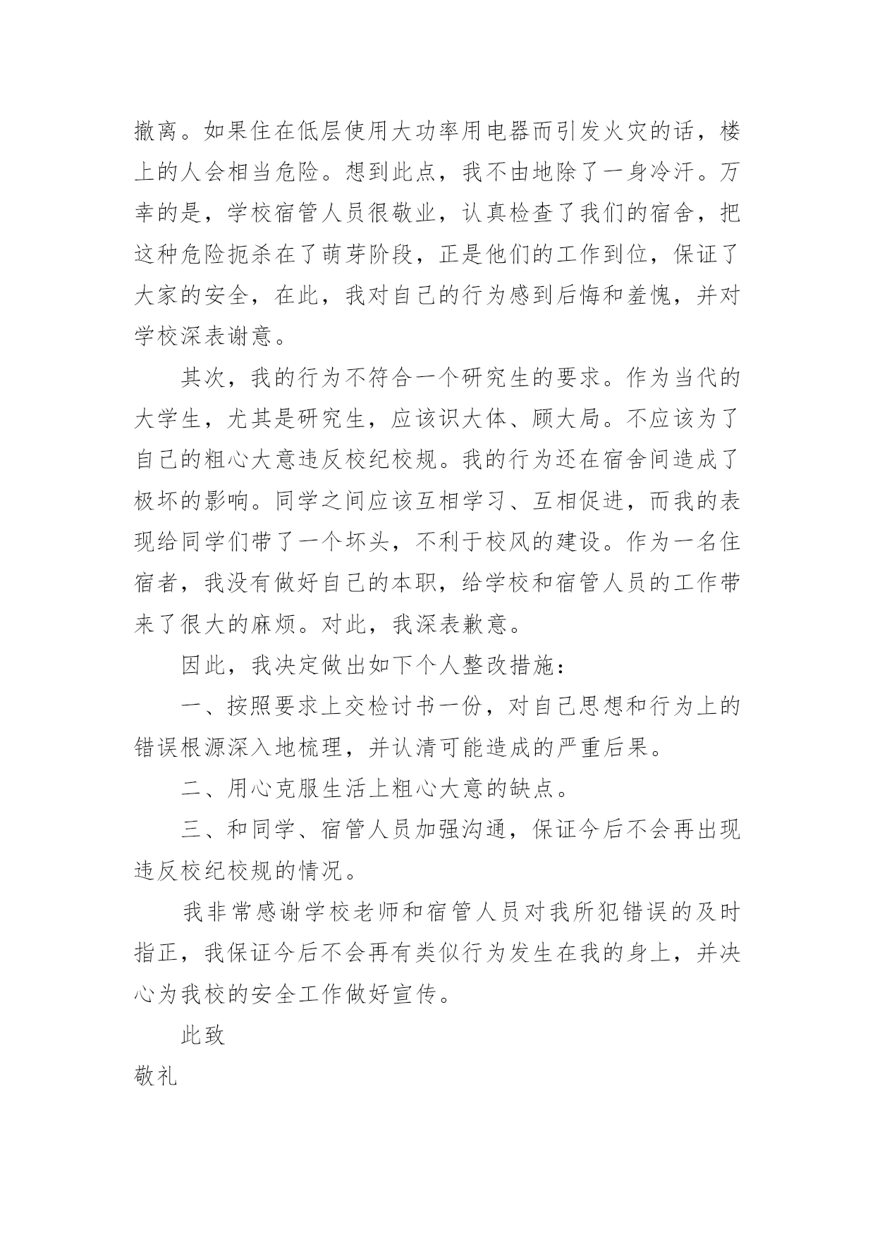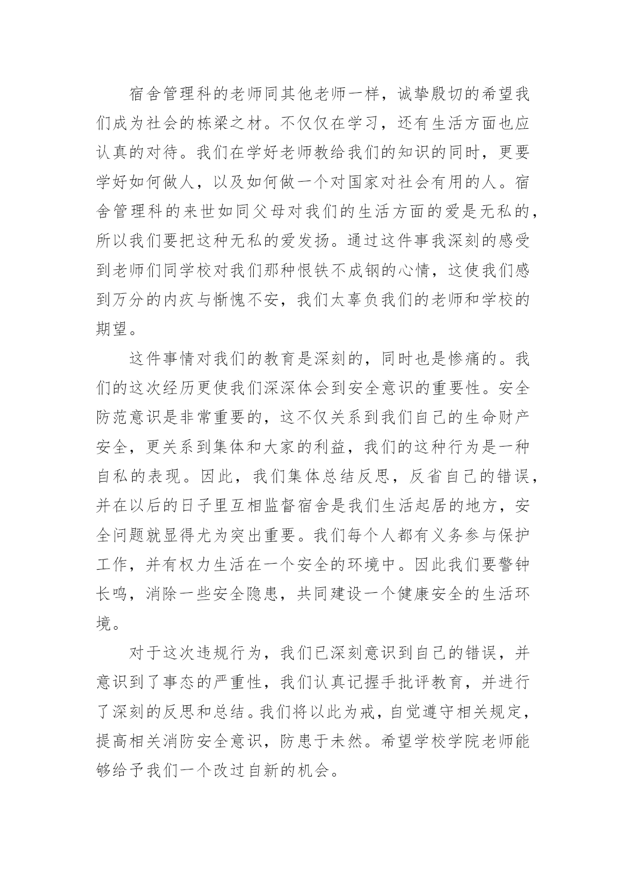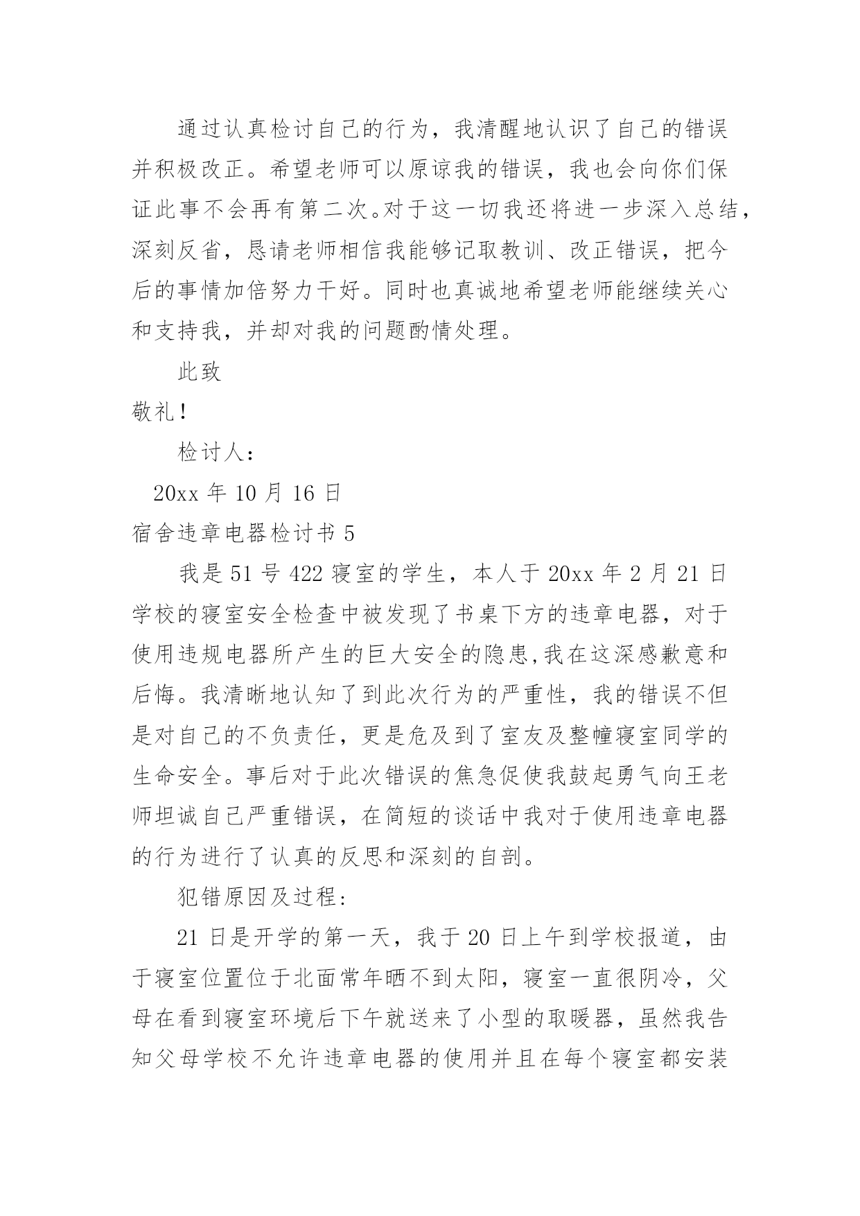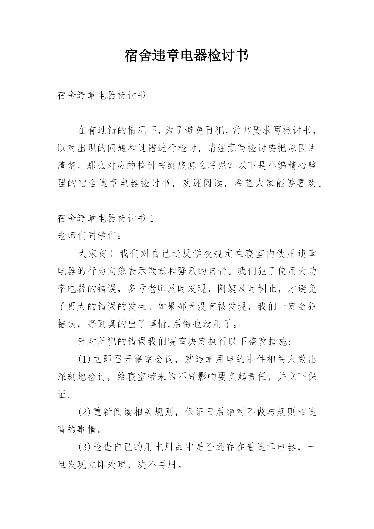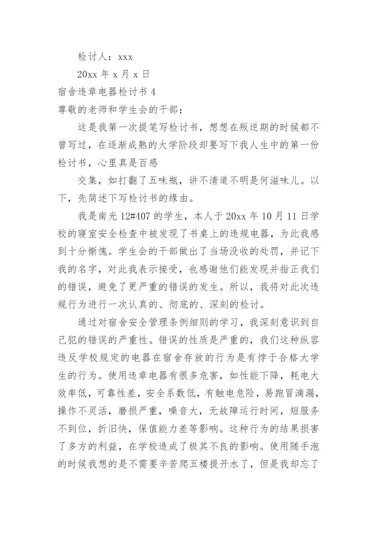 宿舍违章电器检讨书宿舍违章电器检讨书在有过错的情况下,为了避免再犯,常常要求写检讨书,以对出现的问题和过错进行检讨,请注意写检讨要把原因讲清楚。那么对应的检讨书到底怎么写呢?以下是小编精心整理的宿舍违章电器检讨书,欢迎阅读,希望大家能够喜欢。宿舍违章电器检讨书1老师们同学们:大家好!我们对自己违反学校规定在寝室内使用违章电器的行为向您表示歉意和强烈的自责。我们犯了使用大功率电器的错误,多亏老师及时发现,阿姨及时制止,才避免了更大的错误的发生。如果那天没有被发现,我们一定会犯错误,等到真的出了事情,后悔也没用了。针对所犯的错误我们寝室决定执行以下整改措施:(1)立即召开寝室会议,就违章用电的事件相关人做出深刻地检讨,给寝室带来的不好影响要负起责任,并立下保证。(2)重新阅读相关规则,保证日后绝对不做与规则相违背的事情。(3)检查自己的用电用品中是否还存在着违章电器,一旦发现立即处理,决不再用。这次的事件我真的感到抱歉,希望老师可以原谅我,认可我认错的态度。我真的已经深刻的反省到我的错误了,希望老师再给我知错就改的机会。也希望同学们引以为戒,不要犯和我一样愚蠢的错误了。勿以恶小而为之,如今我已经认识到了自己的错误,今后一定会严格要求自己遵守学校的规章制度。对于我们所犯的错误,我们已经深刻检讨反省,请老师给我们一个改过自新的机会。我们xxx寝室向您作出深刻的检讨。早晨起床,六位同学在宿舍匆匆收拾出门上自习,一同学说教室冷,拿出了从家里带的热水袋,准备烧好了带到教室,临走时要迟到了着急忘了拔电源。阿姨查寝时发现了这件事情,对其进行了通报批评并要求写检讨书进行检讨。——XXX寝室宿舍违章电器检讨书2尊敬的老师:在最近的一次宿舍检查中,我们宿舍被查出有违法学校规定的电器,为此我们感到十分惭愧。我将对此次违规行为进行一次认真的、彻底的、深刻的检讨。通过对宿舍安全管理条例细则的学习,我深刻意识到自己犯的错误的严重性。错误的性质是严重的,我们这种纵容违反学校规定的电器在宿舍存放的行为是有悖于合格大学生的行为。尽管这个电吹风是我们集体办电话业务的赠品,并且是损坏的,我们从未使用过。但这种行为的结果仍损害了多方的利益,在学校造成了极其不良的影响。这种行为,即使没有对宿舍及周围同学带来损失,这个举动本身就违背了做合格学生的原则。作为一名当代大学生,一名正在接受高等教育的人来说,如此低下的安全防范意识是对老师工作不尊重的表现,也是对身边的同学的生命和财产不尊重的表现,这种表现显然不符合社会对我们的要求。其次,我们的这种行为还在寝室间造成了极其不良的影响,破坏了学校的规章管理制度,不利于学校和院系的风气建设。同时,对学校形象也造成了一定的损害。我们应该去维护学校的形象而不是去破坏它。我们只有认真反思,寻找极大错误后面的深刻根源,认清问题的本质,才能给学校、集体、老师和自己一个交代,从而得以改正自己的错误,取得进步。作为一名大学生,我没有做好自己的本职工作,没有为刚入学的同学做良好的学习榜样,给宿舍管理科的老师在宿舍管理的工作上带来了极大的麻烦。我们的行为使我们的宿舍存在了巨大的安全隐患,但事前我们并没有意识到事情的严重性,由此在宿舍埋下了灾难的种子,我们的行为严重威胁到集体的生命财产安全。为此,我们全体宿舍成员诚恳的向大家道歉。我们认真阅读了上海商学院女生宿舍失火的新闻报道,认识到了这是用鲜血和生命铸成的惨痛教训。我们更深刻的意识到我们所犯错误的严重性,也理解了宿管科来世和学校领导对此事的重视。为此,我们深感内疚和惭愧。我们辜负了老师对我们的殷切希望,辜负了同学们对我们的信任,辜负了宿管科老师的教诲。我们再次向老师们和同学们进行诚挚的道歉。宿舍管理科的老师同其他老师一样,诚挚殷切的希望我们成为社会的栋梁之材。不仅仅在学习,还有生活方面也应认真的对待。我们在学好老师教给我们的知识的同时,更要学好如何做人,以及如何做一个对国家对社会有用的人。宿舍管理科的来世如同父母对我们的生活方面的爱是无私的,所以我们要把这种无私的爱发扬。通过这件事我深刻的感受到老师们同学校对我们那种恨铁不成钢的心情,这使我们感到万分的内疚与惭愧不安,我们太辜负我们的老师和学校的期望。这件事情对我们的教育是深刻的,同时也是惨痛的。我们的这次经历更使我们深深体会到安全意识的重要性。安全防范意识是非常重要的,这不仅关系到我们自己的生命财产安全,更关系到集体和大家的利益,我们的这种行为是一种自私的表现。因此,我们集体总结反思,反省自己的错误,并在以后的日子里互相监督宿舍是我们生活起居的地方,安全问题就显得尤为突出重要。我们每个人都有义务参与保护工作,并有权力生活在一个安全的环境中。因此我们要警钟长鸣,消除一些安全隐患,共同建设一个健康安全的生活环境。对于这次违规行为,我们已深刻意识到自己的错