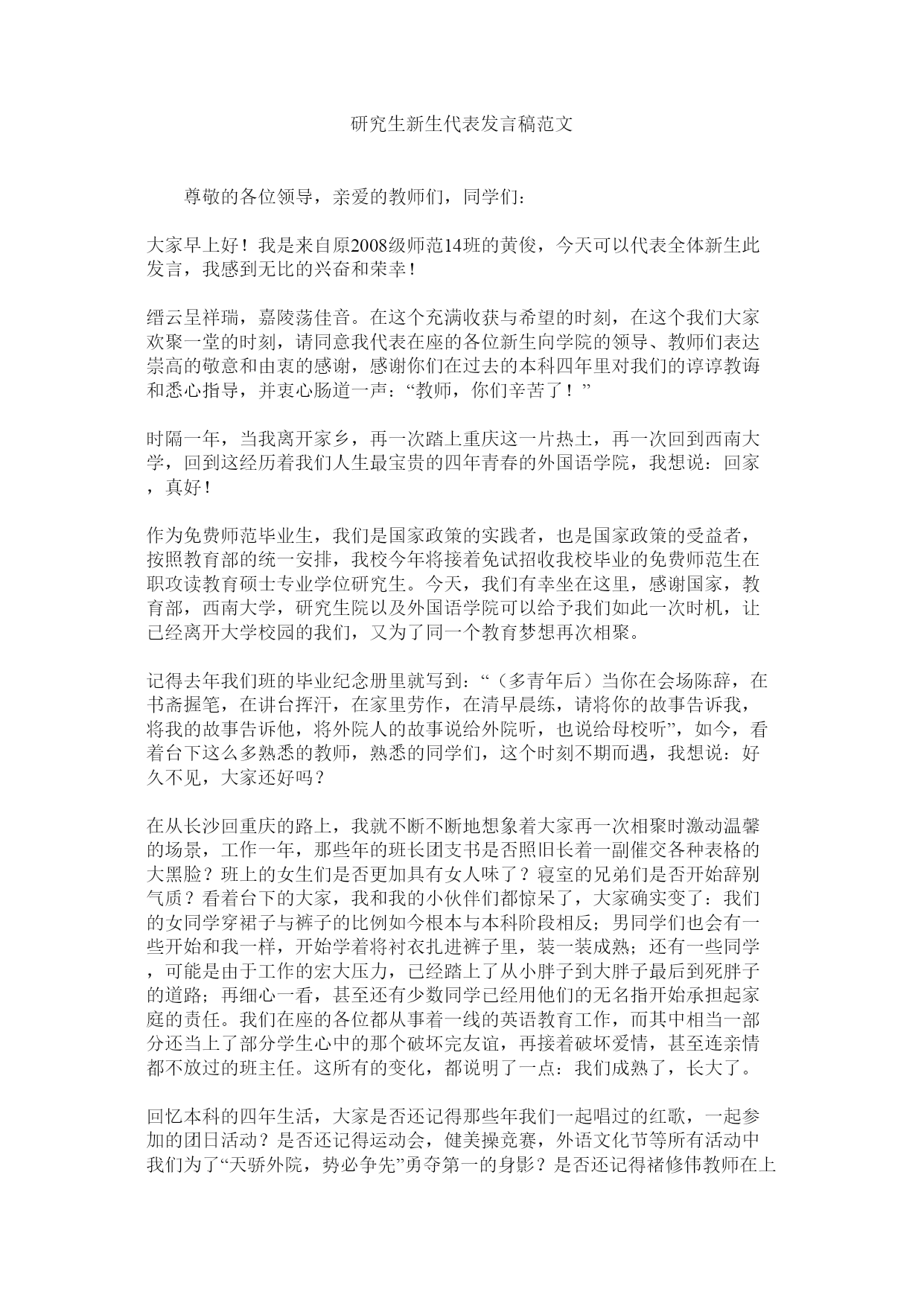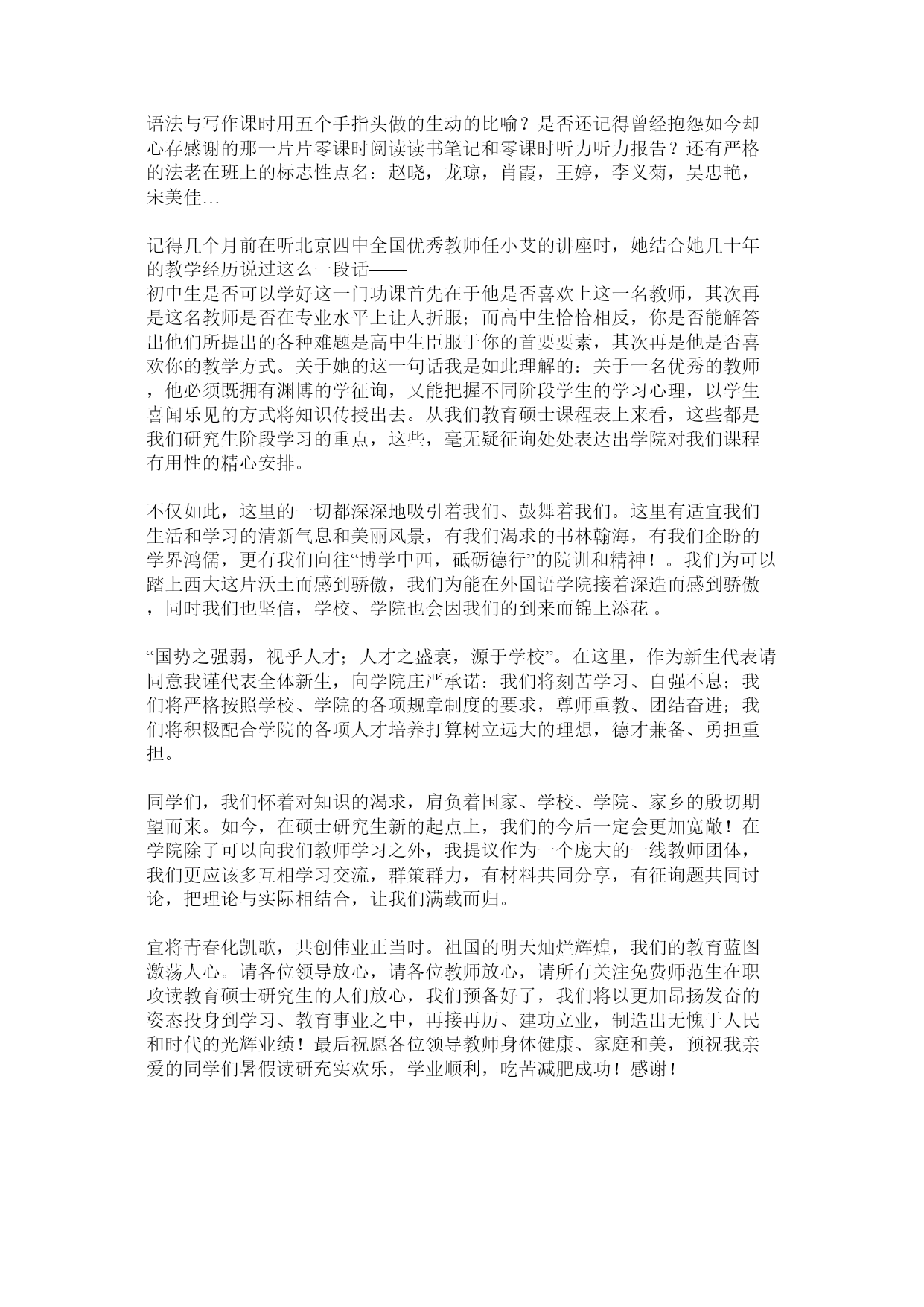 研究生新生代表发言稿范文尊敬的各位领导,亲爱的教师们,同学们:大家早上好!我是来自原2008级师范14班的黄俊,今天可以代表全体新生此发言,我感到无比的兴奋和荣幸!缙云呈祥瑞,嘉陵荡佳音。在这个充满收获与希望的时刻,在这个我们大家欢聚一堂的时刻,请同意我代表在座的各位新生向学院的领导、教师们表达崇高的敬意和由衷的感谢,感谢你们在过去的本科四年里对我们的谆谆教诲和悉心指导,并衷心肠道一声:“教师,你们辛苦了!”时隔一年,当我离开家乡,再一次踏上重庆这一片热土,再一次回到西南大学,回到这经历着我们人生最宝贵的四年青春的外国语学院,我想说:回家,真好!作为免费师范毕业生,我们是国家政策的实践者,也是国家政策的受益者,按照教育部的统一安排,我校今年将接着免试招收我校毕业的免费师范生在职攻读教育硕士专业学位研究生。今天,我们有幸坐在这里,感谢国家,教育部,西南大学,研究生院以及外国语学院可以给予我们如此一次时机,让已经离开大学校园的我们,又为了同一个教育梦想再次相聚。记得去年我们班的毕业纪念册里就写到:“(多青年后)当你在会场陈辞,在书斋握笔,在讲台挥汗,在家里劳作,在清早晨练,请将你的故事告诉我,将我的故事告诉他,将外院人的故事说给外院听,也说给母校听”,如今,看着台下这么多熟悉的教师,熟悉的同学们,这个时刻不期而遇,我想说:好久不见,大家还好吗?在从长沙回重庆的路上,我就不断不断地想象着大家再一次相聚时激动温馨的场景,工作一年,那些年的班长团支书是否照旧长着一副催交各种表格的大黑脸?班上的女生们是否更加具有女人味了?寝室的兄弟们是否开始辞别气质?看着台下的大家,我和我的小伙伴们都惊呆了,大家确实变了:我们的女同学穿裙子与裤子的比例如今根本与本科阶段相反;男同学们也会有一些开始和我一样,开始学着将衬衣扎进裤子里,装一装成熟;还有一些同学,可能是由于工作的宏大压力,已经踏上了从小胖子到大胖子最后到死胖子的道路;再细心一看,甚至还有少数同学已经用他们的无名指开始承担起家庭的责任。我们在座的各位都从事着一线的英语教育工作,而其中相当一部分还当上了部分学生心中的那个破坏完友谊,再接着破坏爱情,甚至连亲情都不放过的班主任。这所有的变化,都说明了一点:我们成熟了,长大了。回忆本科的四年生活,大家是否还记得那些年我们一起唱过的红歌,一起参加的团日活动?是否还记得运动会,健美操竞赛,外语文化节等所有活动中我们为了“天骄外院,势必争先”勇夺第一的身影?是否还记得褚修伟教师在上语法与写作课时用五个手指头做的生动的比喻?是否还记得曾经抱怨如今却心存感谢的那一片片零课时阅读读书笔记和零课时听力听力报告?还有严格的法老在班上的标志性点名:赵晓,龙琼,肖霞,王婷,李义菊,吴忠艳,宋美佳…记得几个月前在听北京四中全国优秀教师任小艾的讲座时,她结合她几十年的教学经历说过这么一段话——初中生是否可以学好这一门功课首先在于他是否喜欢上这一名教师,其次再是这名教师是否在专业水平上让人折服;而高中生恰恰相反,你是否能解答出他们所提出的各种难题是高中生臣服于你的首要要素,其次再是他是否喜欢你的教学方式。关于她的这一句话我是如此理解的:关于一名优秀的教师,他必须既拥有渊博的学征询,又能把握不同阶段学生的学习心理,以学生喜闻乐见的方式将知识传授出去。从我们教育硕士课程表上来看,这些都是我们研究生阶段学习的重点,这些,毫无疑征询处处表达出学院对我们课程有用性的精心安排。不仅如此,这里的一切都深深地吸引着我们、鼓舞着我们。这里有适宜我们生活和学习的清新气息和美丽风景,有我们渴求的书林翰海,有我们企盼的学界鸿儒,更有我们向往“博学中西,砥砺德行”的院训和精神!。我们为可以踏上西大这片沃土而感到骄傲,我们为能在外国语学院接着深造而感到骄傲,同时我们也坚信,学校、学院也会因我们的到来而锦上添花。“国势之强弱,视乎人才;人才之盛衰,源于学校”。在这里,作为新生代表请同意我谨代表全体新生,向学院庄严承诺:我们将刻苦学习、自强不息;我们将严格按照学校、学院的各项规章制度的要求,尊师重教、团结奋进;我们将积极配合学院的各项人才培养打算树立远大的理想,德才兼备、勇担重担。同学们,我们怀着对知识的渴求,肩负着国家、学校、学院、家乡的殷切期望而来。如今,在硕士研究生新的起点上,我们的今后一定会更加宽敞!在学院除了可以向我们教师学习之外,我提议作为一个庞大的一线教师团体,我们更应该多互相学习交流,群策群力,有材料共同分享,有征询题共同讨论,把理论与实际相结合,让我们满载而归。宜将青春化凯歌,共创伟业正当时。祖国的明天灿烂辉煌,我们的教育蓝图激荡人心。请各位领导放心,请各位教师放心,请所有关注免费师范生在职攻读教育硕士研究生的人们放心,我们预备好了,我们将以更加昂扬发奋的姿态投