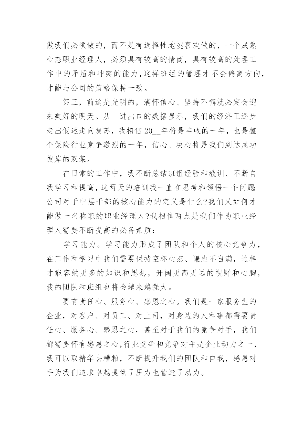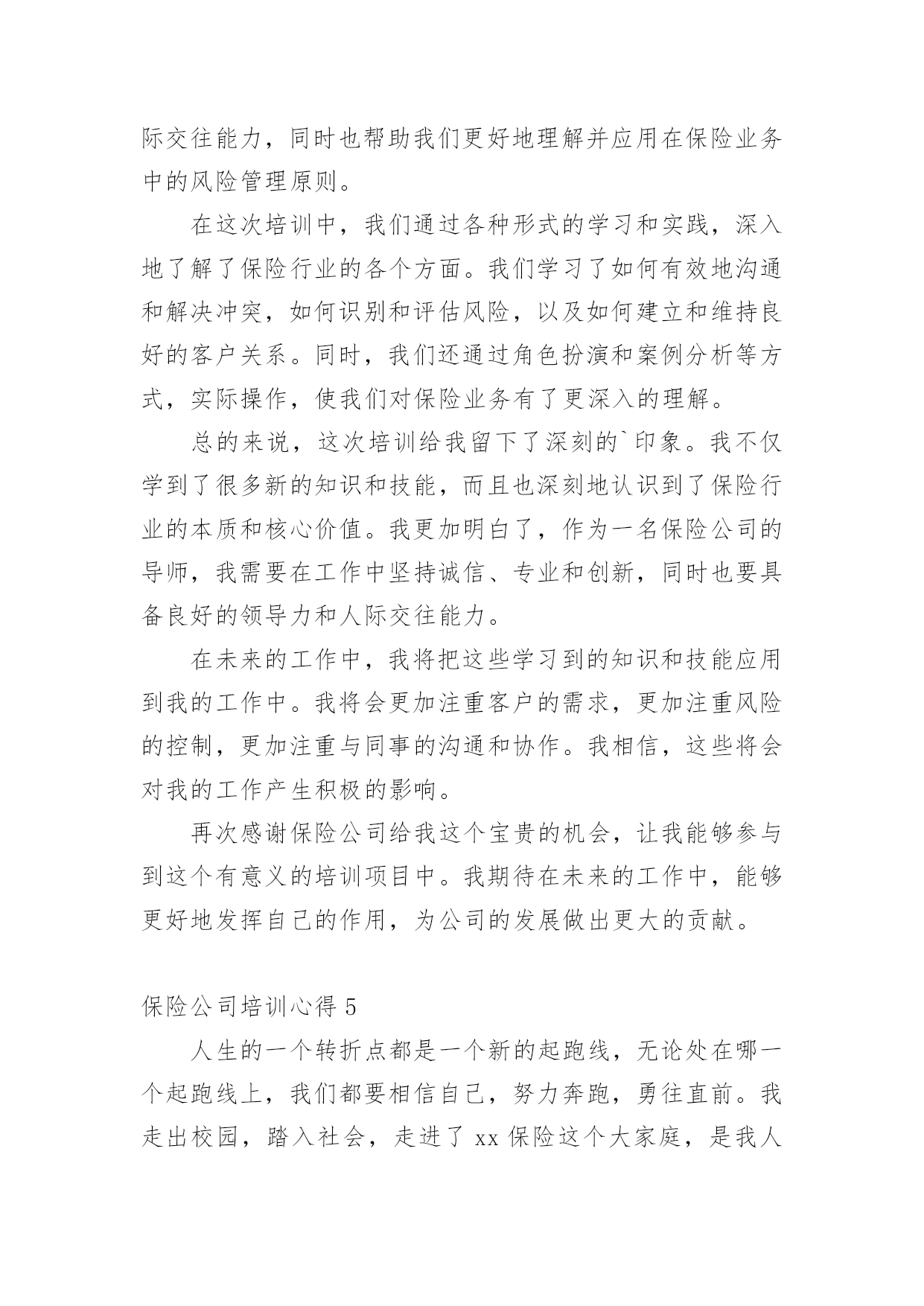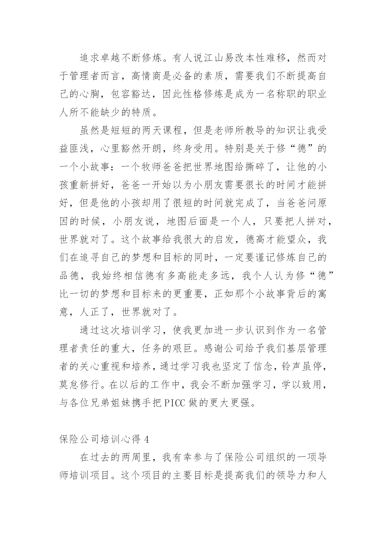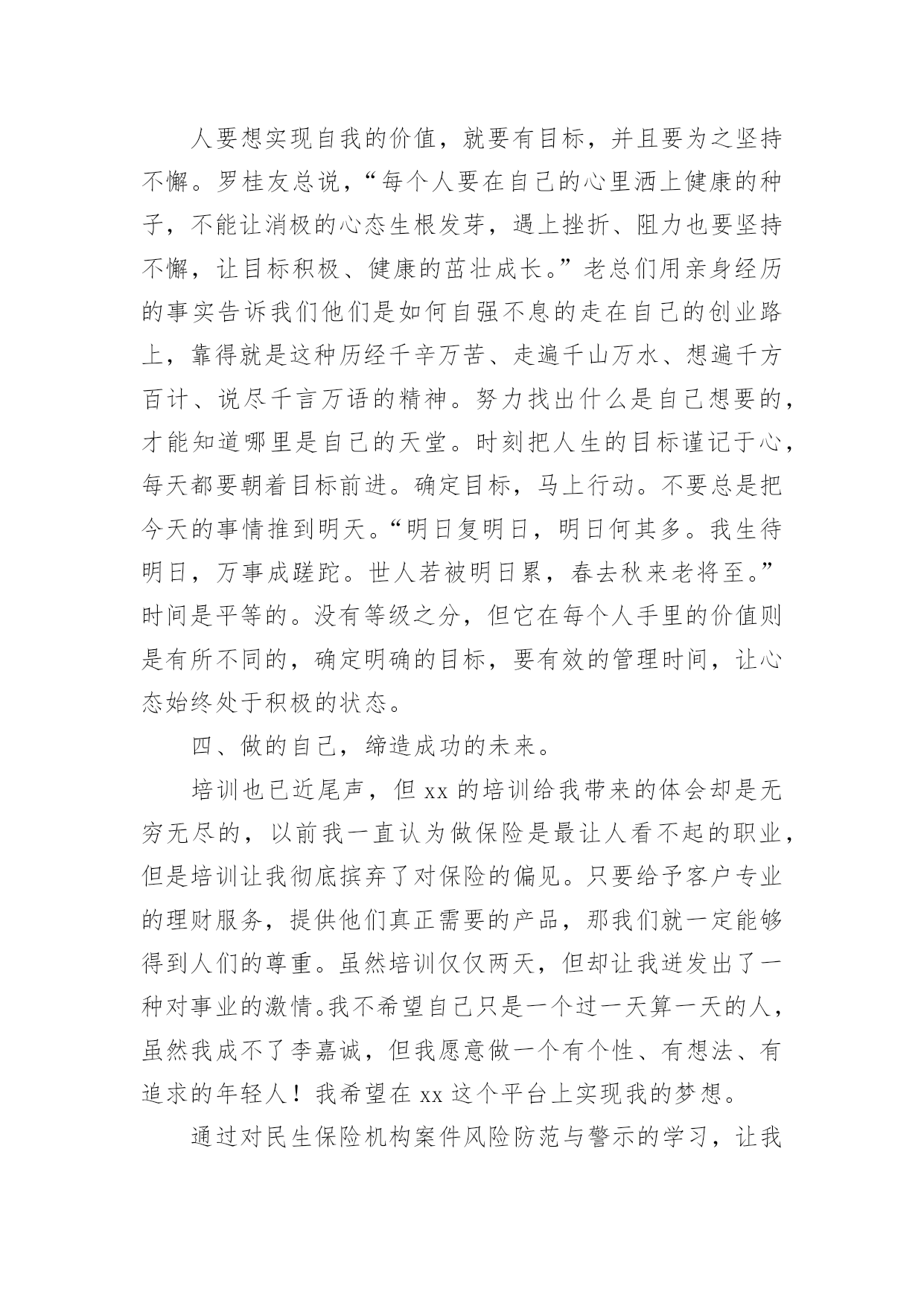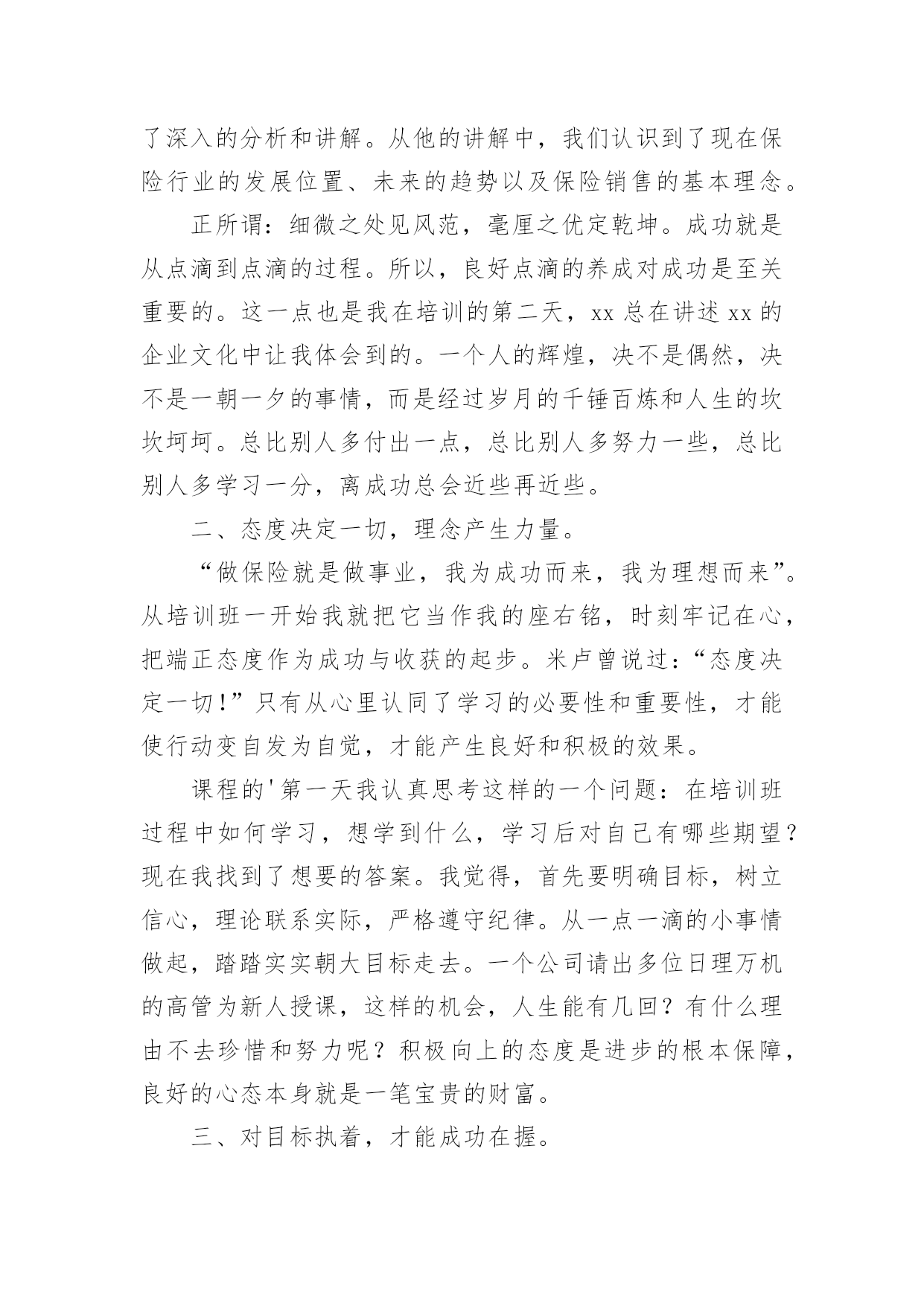 保险公司培训心得保险公司培训心得(合集15篇)我们得到了一些心得体会以后,将其记录在心得体会里,让自己铭记于心,这样我们可以养成良好的总结方法。那么心得体会到底应该怎么写呢?下面是小编为大家收集的保险公司培训心得,欢迎阅读,希望大家能够喜欢。保险公司培训心得1怀着空杯的心态,4月16日,我有幸参加了xx保险股份有限公司为期两天的新人班岗前培训,回首培训过程中经历的点点滴滴,感慨颇多。下面我从以下四点浅谈一下我的个人心得体会。一、课程紧张而有序,氛围严肃而活泼。第一天上午的培训,是银保的xx总和合规的xx总授课。授课中,xx总以他一贯的激情四射的风格紧紧吸引了大家。从他的讲述中,我对公司历史有了深入的了解:xx目前正处于高速发展阶段,是保险行业中第三兵团的佼佼者……他还谈到了他自己,在短短十余年时间里,怎样从一名不起眼的保险销售人员做到今天,成为生命人寿银保系统的领军人。他以自己的成长经历,激励在座的每一位学员。他的真诚、坦率、智慧、执着折服了现场的每一个人。激情四溢、精彩纷呈的课堂还在脑海里缭绕。转眼下午的培训又到了,xx总对目前保险行业的现状和发展趋势进行了深入的分析和讲解。从他的讲解中,我们认识到了现在保险行业的发展位置、未来的趋势以及保险销售的基本理念。正所谓:细微之处见风范,毫厘之优定乾坤。成功就是从点滴到点滴的过程。所以,良好点滴的养成对成功是至关重要的。这一点也是我在培训的第二天,xx总在讲述xx的企业文化中让我体会到的。一个人的辉煌,决不是偶然,决不是一朝一夕的事情,而是经过岁月的千锤百炼和人生的坎坎坷坷。总比别人多付出一点,总比别人多努力一些,总比别人多学习一分,离成功总会近些再近些。二、态度决定一切,理念产生力量。“做保险就是做事业,我为成功而来,我为理想而来”。从培训班一开始我就把它当作我的座右铭,时刻牢记在心,把端正态度作为成功与收获的起步。米卢曾说过:“态度决定一切!”只有从心里认同了学习的必要性和重要性,才能使行动变自发为自觉,才能产生良好和积极的效果。课程的'第一天我认真思考这样的一个问题:在培训班过程中如何学习,想学到什么,学习后对自己有哪些期望?现在我找到了想要的答案。我觉得,首先要明确目标,树立信心,理论联系实际,严格遵守纪律。从一点一滴的小事情做起,踏踏实实朝大目标走去。一个公司请出多位日理万机的高管为新人授课,这样的机会,人生能有几回?有什么理由不去珍惜和努力呢?积极向上的态度是进步的根本保障,良好的心态本身就是一笔宝贵的财富。三、对目标执着,才能成功在握。人要想实现自我的价值,就要有目标,并且要为之坚持不懈。罗桂友总说,“每个人要在自己的心里洒上健康的种子,不能让消极的心态生根发芽,遇上挫折、阻力也要坚持不懈,让目标积极、健康的茁壮成长。”老总们用亲身经历的事实告诉我们他们是如何自强不息的走在自己的创业路上,靠得就是这种历经千辛万苦、走遍千山万水、想遍千方百计、说尽千言万语的精神。努力找出什么是自己想要的,才能知道哪里是自己的天堂。时刻把人生的目标谨记于心,每天都要朝着目标前进。确定目标,马上行动。不要总是把今天的事情推到明天。“明日复明日,明日何其多。我生待明日,万事成蹉跎。世人若被明日累,春去秋来老将至。”时间是平等的。没有等级之分,但它在每个人手里的价值则是有所不同的,确定明确的目标,要有效的管理时间,让心态始终处于积极的状态。四、做的自己,缔造成功的未来。培训也已近尾声,但xx的培训给我带来的体会却是无穷无尽的,以前我一直认为做保险是最让人看不起的职业,但是培训让我彻底摈弃了对保险的偏见。只要给予客户专业的理财服务,提供他们真正需要的产品,那我们就一定能够得到人们的尊重。虽然培训仅仅两天,但却让我迸发出了一种对事业的激情。我不希望自己只是一个过一天算一天的人,虽然我成不了李嘉诚,但我愿意做一个有个性、有想法、有追求的年轻人!我希望在xx这个平台上实现我的梦想。通过对民生保险机构案件风险防范与警示的学习,让我深刻理解到此次学习的必要性。当案件发生时,无论对个人还是单位乃至社会都造成了极大的危害性。拿业务员挪用客户保险费为例:此案例不仅对客户造成了巨大的损失,还断送了自己美好前途和职业理想,同时也把自己送上了犯罪的道路,甚至引发社会对保险公司的不信任感,造成了如此的严重的后果。作为民生保险的续期管理岗,原本以为此类事情离我们很遥远,其实不然,有可能只因我们工作的稍微疏忽,就可能造成外勤队伍人员挪用客户保费现象的产生,成为犯罪活动的纵容者,因此,我们需要认真认真在认真的工作态度去做好每一笔未交件的后续工作,避免从业人员挪用保费现象的产生。知道了案件的危害性,就要懂得如何去防止案件的发生,通过这次学习,使我了解到案件防控的重要性,没有了安全的经营环境,那么其他的都是多余的,我认为要想