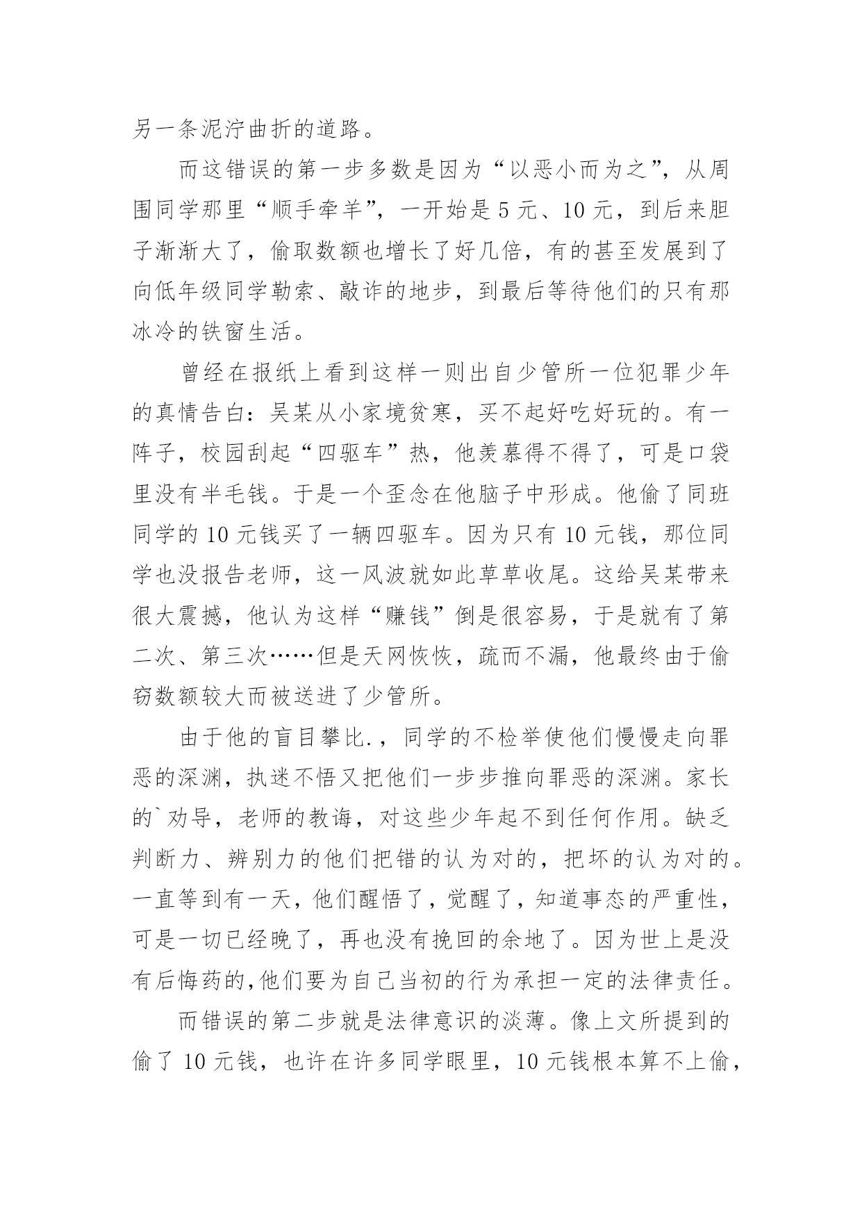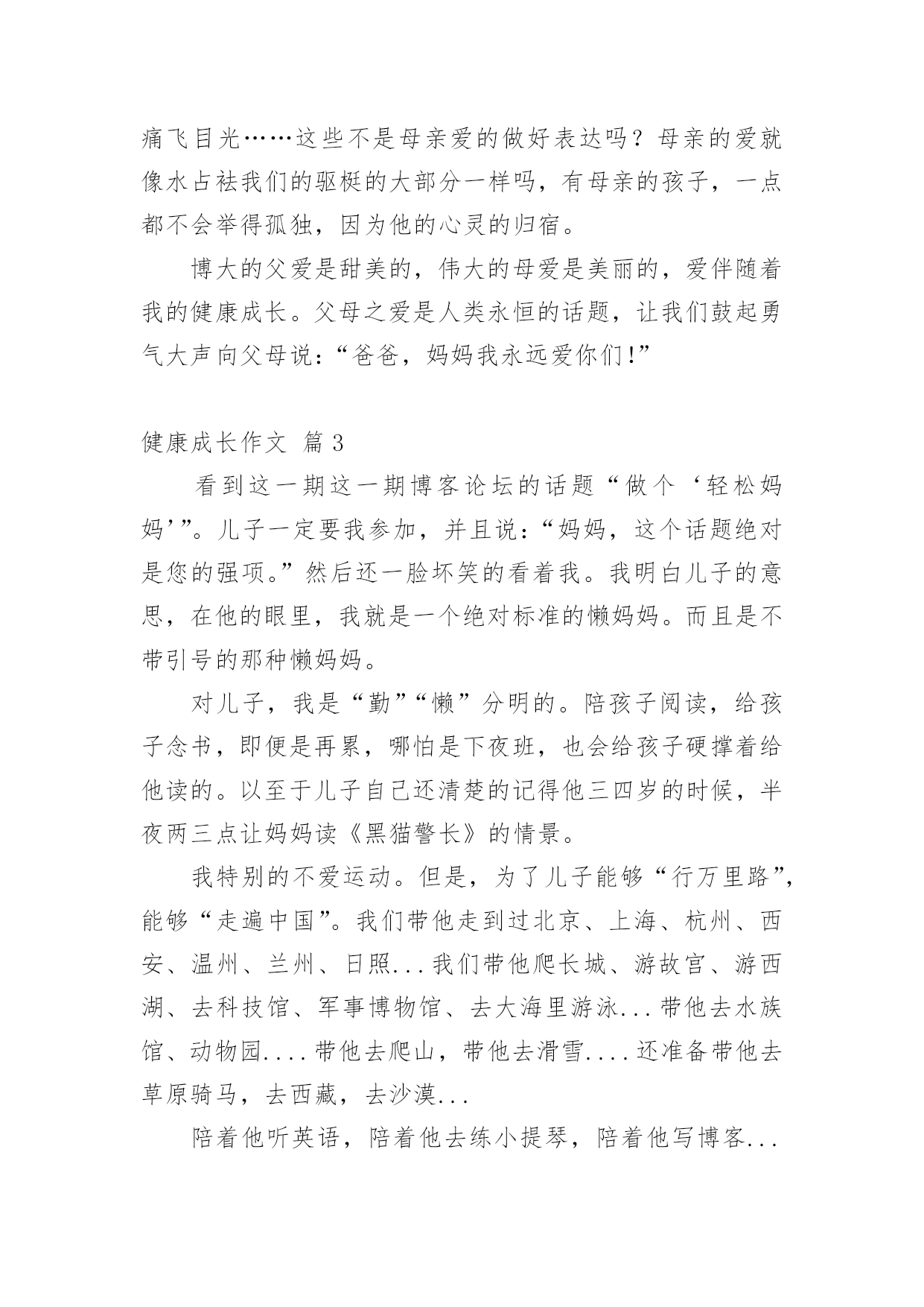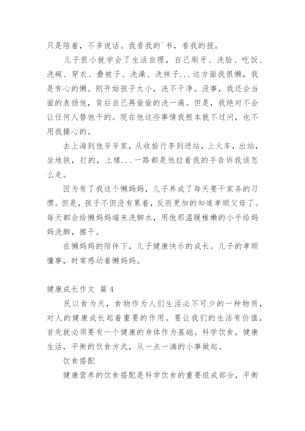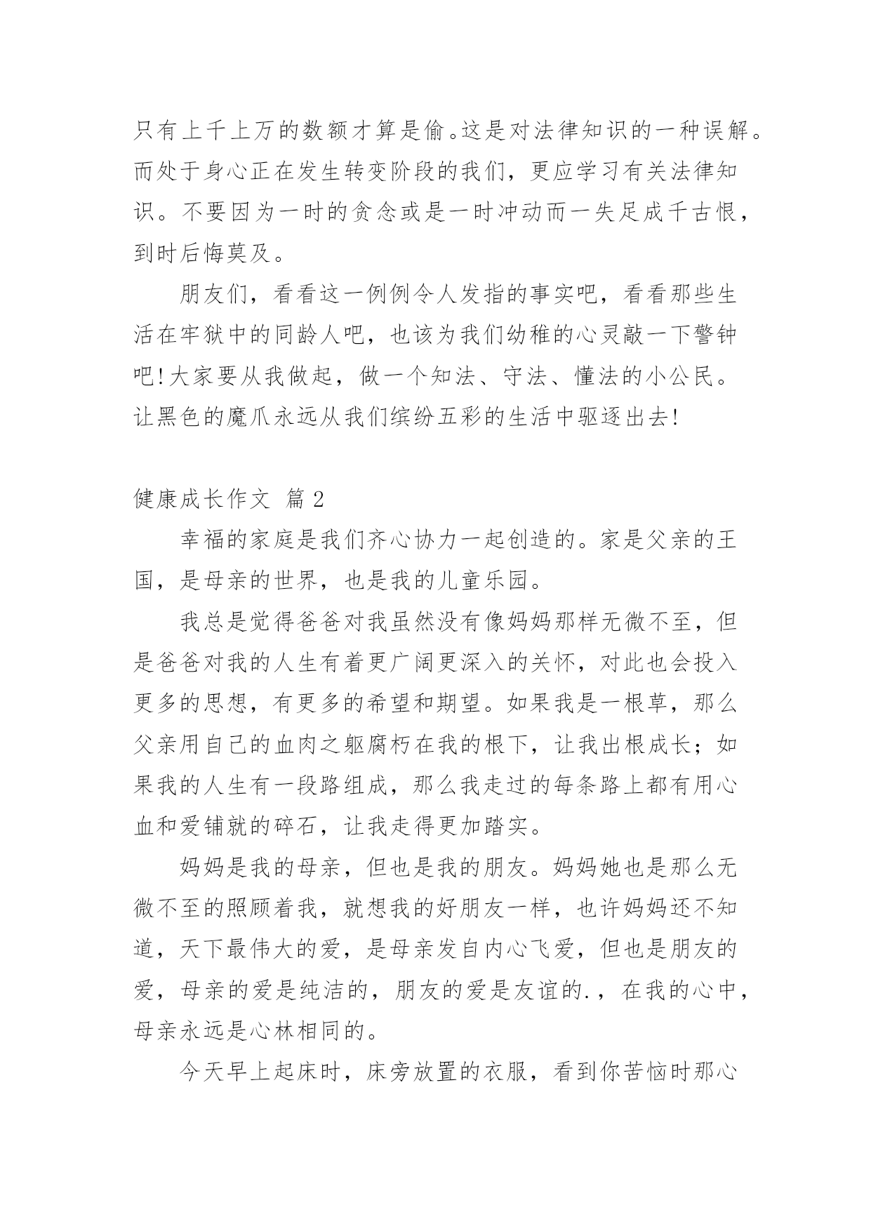 健康成长作文在平时的学习、工作或生活中,大家最不陌生的就是作文了吧,作文是从内部言语向外部言语的过渡,即从经过压缩的简要的、自己能明白的语言,向开展的、具有规范语法结构的、能为他人所理解的外部语言形式的转化。作文的注意事项有许多,你确定会写吗?下面是小编帮大家整理的健康成长作文4篇,希望能够帮助到大家。健康成长作文篇1邓小平同志说过:“法制教育要从娃娃抓起。”国无法不治,民无法不立。只有人人守法纪,凡事依法纪,则社会安宁,经济发展。倘若没有法纪的规范,失去法度的控制,各项秩序就无从保证,人们生存、发展的环境就会遭到破坏,人民群众就不可能安居乐业。但社会上却有这样一群少年,整天无所事事,游手好闲,靠着勒索、敲诈过日子,殊不知这种日子的尽头就是在铁栅栏、大墙内度过几年青春。这是一个发生在我身边的故事:我的表哥就读于初三年级某由于种种原因,厌学、逃学甚至彻夜不归,时常在学校附近欺诈低年级同学,后来竟发展到入室行窃,最后经警察,学校检举,被送往少教所教育……其实他们和我们一样,也和我们一样应该拥有一个五彩缤纷的未来,一个锦绣前程。可就是一时迷失方向,迈出错误的第一步,而离开了青少年应该遵循的正确轨道,走上了另一条泥泞曲折的道路。而这错误的第一步多数是因为“以恶小而为之”,从周围同学那里“顺手牵羊”,一开始是5元、10元,到后来胆子渐渐大了,偷取数额也增长了好几倍,有的甚至发展到了向低年级同学勒索、敲诈的地步,到最后等待他们的只有那冰冷的铁窗生活。曾经在报纸上看到这样一则出自少管所一位犯罪少年的真情告白:吴某从小家境贫寒,买不起好吃好玩的。有一阵子,校园刮起“四驱车”热,他羡慕得不得了,可是口袋里没有半毛钱。于是一个歪念在他脑子中形成。他偷了同班同学的10元钱买了一辆四驱车。因为只有10元钱,那位同学也没报告老师,这一风波就如此草草收尾。这给吴某带来很大震撼,他认为这样“赚钱”倒是很容易,于是就有了第二次、第三次……但是天网恢恢,疏而不漏,他最终由于偷窃数额较大而被送进了少管所。由于他的盲目攀比.,同学的不检举使他们慢慢走向罪恶的深渊,执迷不悟又把他们一步步推向罪恶的深渊。家长的`劝导,老师的教诲,对这些少年起不到任何作用。缺乏判断力、辨别力的他们把错的认为对的,把坏的认为对的。一直等到有一天,他们醒悟了,觉醒了,知道事态的严重性,可是一切已经晚了,再也没有挽回的余地了。因为世上是没有后悔药的,他们要为自己当初的行为承担一定的法律责任。而错误的第二步就是法律意识的淡薄。像上文所提到的偷了10元钱,也许在许多同学眼里,10元钱根本算不上偷,只有上千上万的数额才算是偷。这是对法律知识的一种误解。而处于身心正在发生转变阶段的我们,更应学习有关法律知识。不要因为一时的贪念或是一时冲动而一失足成千古恨,到时后悔莫及。朋友们,看看这一例例令人发指的事实吧,看看那些生活在牢狱中的同龄人吧,也该为我们幼稚的心灵敲一下警钟吧!大家要从我做起,做一个知法、守法、懂法的小公民。让黑色的魔爪永远从我们缤纷五彩的生活中驱逐出去!健康成长作文篇2幸福的家庭是我们齐心协力一起创造的。家是父亲的王国,是母亲的世界,也是我的儿童乐园。我总是觉得爸爸对我虽然没有像妈妈那样无微不至,但是爸爸对我的人生有着更广阔更深入的关怀,对此也会投入更多的思想,有更多的希望和期望。如果我是一根草,那么父亲用自己的血肉之躯腐朽在我的根下,让我出根成长;如果我的人生有一段路组成,那么我走过的每条路上都有用心血和爱铺就的碎石,让我走得更加踏实。妈妈是我的母亲,但也是我的朋友。妈妈她也是那么无微不至的照顾着我,就想我的好朋友一样,也许妈妈还不知道,天下最伟大的爱,是母亲发自内心飞爱,但也是朋友的爱,母亲的爱是纯洁的,朋友的爱是友谊的.,在我的心中,母亲永远是心林相同的。今天早上起床时,床旁放置的衣服,看到你苦恼时那心痛飞目光……这些不是母亲爱的做好表达吗?母亲的爱就像水占袪我们的驱梃的大部分一样吗,有母亲的孩子,一点都不会举得孤独,因为他的心灵的归宿。博大的父爱是甜美的,伟大的母爱是美丽的,爱伴随着我的健康成长。父母之爱是人类永恒的话题,让我们鼓起勇气大声向父母说:“爸爸,妈妈我永远爱你们!”健康成长作文篇3看到这一期这一期博客论坛的话题“做个‘轻松妈妈’”。儿子一定要我参加,并且说:“妈妈,这个话题绝对是您的强项。”然后还一脸坏笑的看着我。我明白儿子的意思,在他的眼里,我就是一个绝对标准的懒妈妈。而且是不带引号的那种懒妈妈。对儿子,我是“勤”“懒”分明的。陪孩子阅读,给孩子念书,即便是再累,哪怕是下夜班,也会给孩子硬撑着给他读的。以至于儿子自己还清楚的记得他三四岁的时候,半夜两三点让妈妈读《黑猫警长》的情景。我特别的不爱运动。但是,为了儿子能够“行万里路”,能够“走遍中国”。我们带他走到过