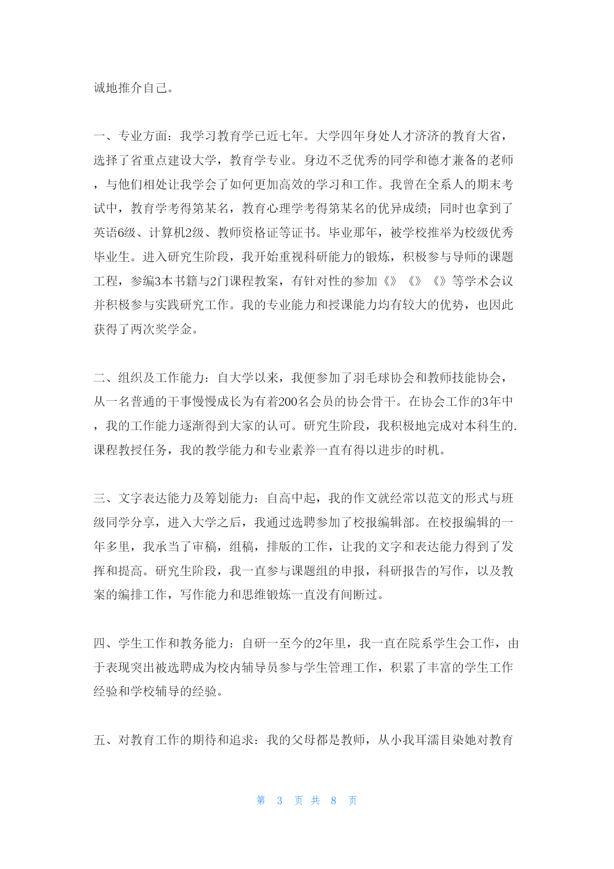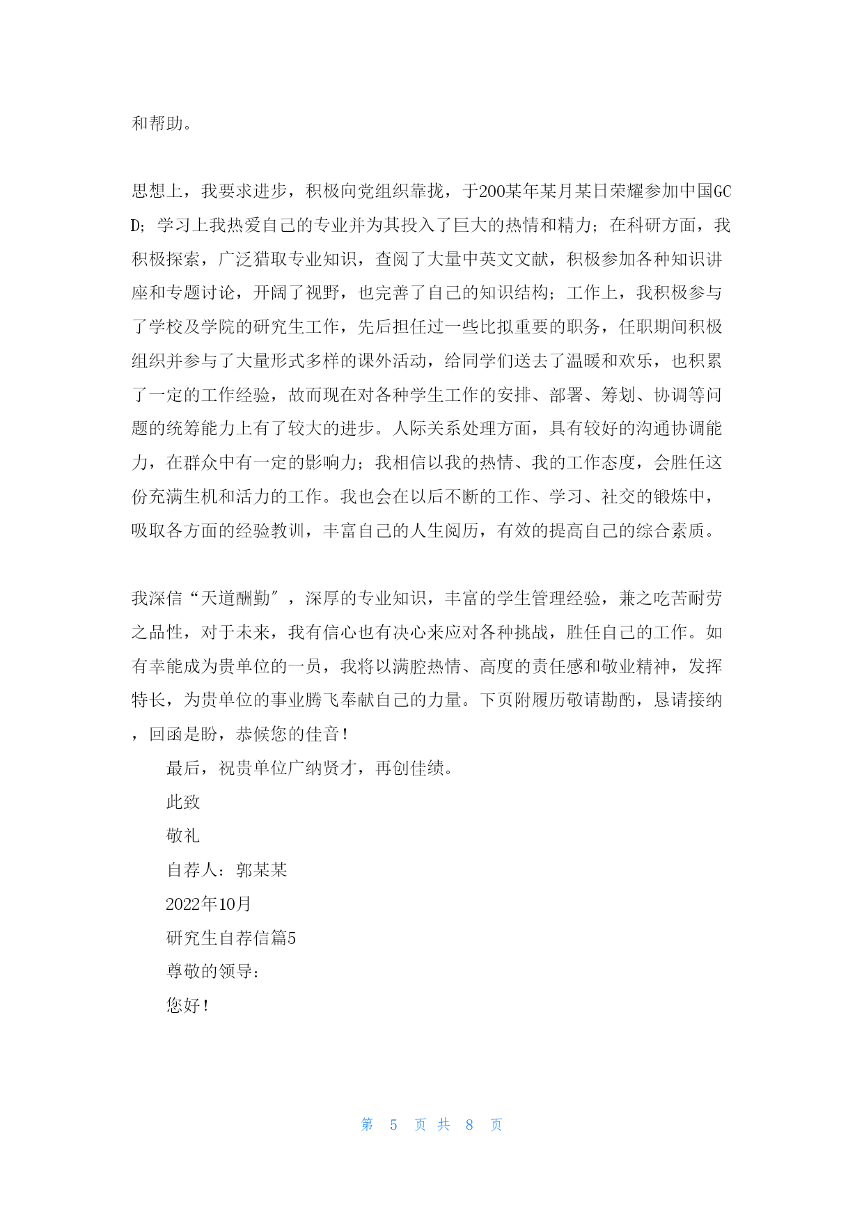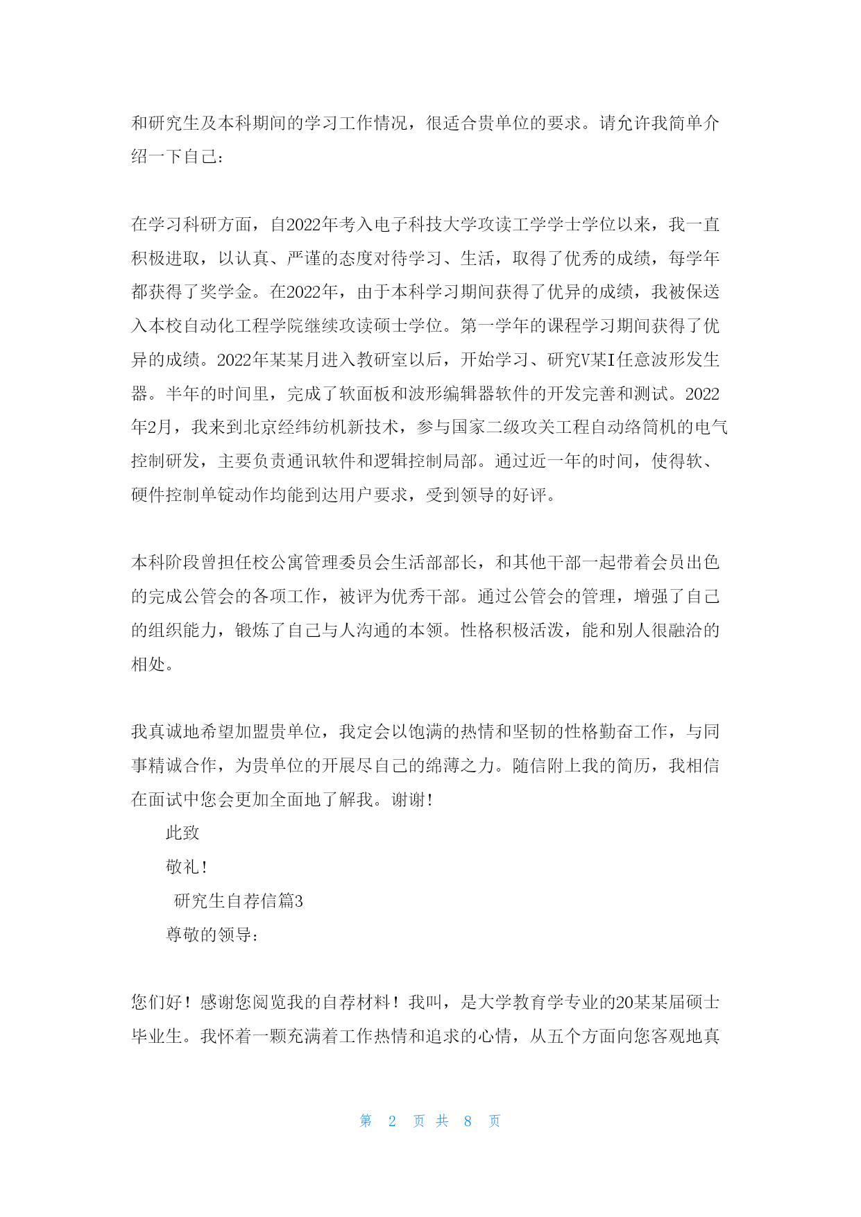 第PAGE8页共NUMPAGES8页研究生自荐信范文(fànwén)汇编5篇研究生自荐信范文(fànwén)汇编5篇研究生自荐信篇1亲爱(qīnài)的某教授(jiàoshòu):您好!我叫,男,人。就读(jiùdú)学院专业,本科学习期间,熟练掌握了相关知识技能〔附件中有本科成绩单〕,通过了全国英语四六级考试、计算机二级考试。今年报考了某某大学专业的学硕型研究生。初试总分356,机械设计:124,数学一:102,英语:64,政治:66。经您的学生推荐以及网上对您的了解,对您所研究的专业方向非常感兴趣。非常期望能跟随您读研究生!如果有幸能得到您的认可,我定不负所望,在读研期间认真跟随导师做研究,做工程,学知识,提高自己的学识水平。感谢您在百忙之中看我的信件,冒昧致信、还望海涵。祝老师工作顺利,万事如意,身体健康。此致敬礼!申请人:申请日期:2022年某某月某某日研究生自荐信篇2尊敬的女士/先生:您好!真诚地感谢您在百忙之中查阅我的求职信。我是电子科技大学自动化工程学院20某某级硕士研究生,2022年某某月我将顺利从学校毕业并获得硕士学位。有幸得悉贵单位正在招聘新员工,我觉得自己开朗稳重、善于学习思考的性格和研究生及本科期间的学习工作情况,很适合贵单位的要求。请允许我简单介绍一下自己:在学习科研方面,自2022年考入电子科技大学攻读工学学士学位以来,我一直积极进取,以认真、严谨的态度对待学习、生活,取得了优秀的成绩,每学年都获得了奖学金。在2022年,由于本科学习期间获得了优异的成绩,我被保送入本校自动化工程学院继续攻读硕士学位。第一学年的课程学习期间获得了优异的成绩。2022年某某月进入教研室以后,开始学习、研究V某I任意波形发生器。半年的时间里,完成了软面板和波形编辑器软件的开发完善和测试。2022年2月,我来到北京经纬纺机新技术,参与国家二级攻关工程自动络筒机的电气控制研发,主要负责通讯软件和逻辑控制局部。通过近一年的时间,使得软、硬件控制单锭动作均能到达用户要求,受到领导的好评。本科阶段曾担任校公寓管理委员会生活部部长,和其他干部一起带着会员出色的完成公管会的各项工作,被评为优秀干部。通过公管会的管理,增强了自己的组织能力,锻炼了自己与人沟通的本领。性格积极活泼,能和别人很融洽的相处。我真诚地希望加盟贵单位,我定会以饱满的热情和坚韧的性格勤奋工作,与同事精诚合作,为贵单位的开展尽自己的绵薄之力。随信附上我的简历,我相信在面试中您会更加全面地了解我。谢谢!此致敬礼!研究生自荐信篇3尊敬的领导:您们好!感谢您阅览我的自荐材料!我叫,是大学教育学专业的20某某届硕士毕业生。我怀着一颗充满着工作热情和追求的心情,从五个方面向您客观地真诚地推介自己。一、专业方面:我学习教育学已近七年。大学四年身处人才济济的教育大省,选择了省重点建设大学,教育学专业。身边不乏优秀的同学和德才兼备的老师,与他们相处让我学会了如何更加高效的学习和工作。我曾在全系人的期末考试中,教育学考得第某名,教育心理学考得第某名的优异成绩;同时也拿到了英语6级、计算机2级、教师资格证等证书。毕业那年,被学校推举为校级优秀毕业生。进入研究生阶段,我开始重视科研能力的锻炼,积极参与导师的课题工程,参编3本书籍与2门课程教案,有针对性的参加《》《》《》等学术会议并积极参与实践研究工作。我的专业能力和授课能力均有较大的优势,也因此获得了两次奖学金。二、组织及工作能力:自大学以来,我便参加了羽毛球协会和教师技能协会,从一名普通的干事慢慢成长为有着200名会员的协会骨干。在协会工作的3年中,我的工作能力逐渐得到大家的认可。研究生阶段,我积极地完成对本科生的.课程教授任务,我的教学能力和专业素养一直有得以进步的时机。三、文字表达能力及筹划能力:自高中起,我的作文就经常以范文的形式与班级同学分享,进入大学之后,我通过选聘参加了校报编辑部。在校报编辑的一年多里,我承当了审稿,组稿,排版的工作,让我的文字和表达能力得到了发挥和提高。研究生阶段,我一直参与课题组的申报,科研报告的写作,以及教案的编排工作,写作能力和思维锻炼一直没有间断过。四、学生工作和教务能力:自研一至今的2年里,我一直在院系学生会工作,由于表现突出被选聘成为校内辅导员参与学生管理工作,积累了丰富的学生工作经验和学校辅导的经验。五、对教育工作的期待和追求:我的父母都是教师,从小我耳濡目染她对教育的理念和践行。我看到她对学生的付出,看到学生对她的爱戴,看到家长对认真付出的工作的认可。我深知工作对我来说不仅仅是职业,而是我的事业,我一生的追求。这份追求让我确认我对教育生涯不只是一时的热度,我对学生工作的坚持和努力将会持续一生。生活中的我乐观积极好学,爱好游泳,旅游和。我相信自己可以与两道,同