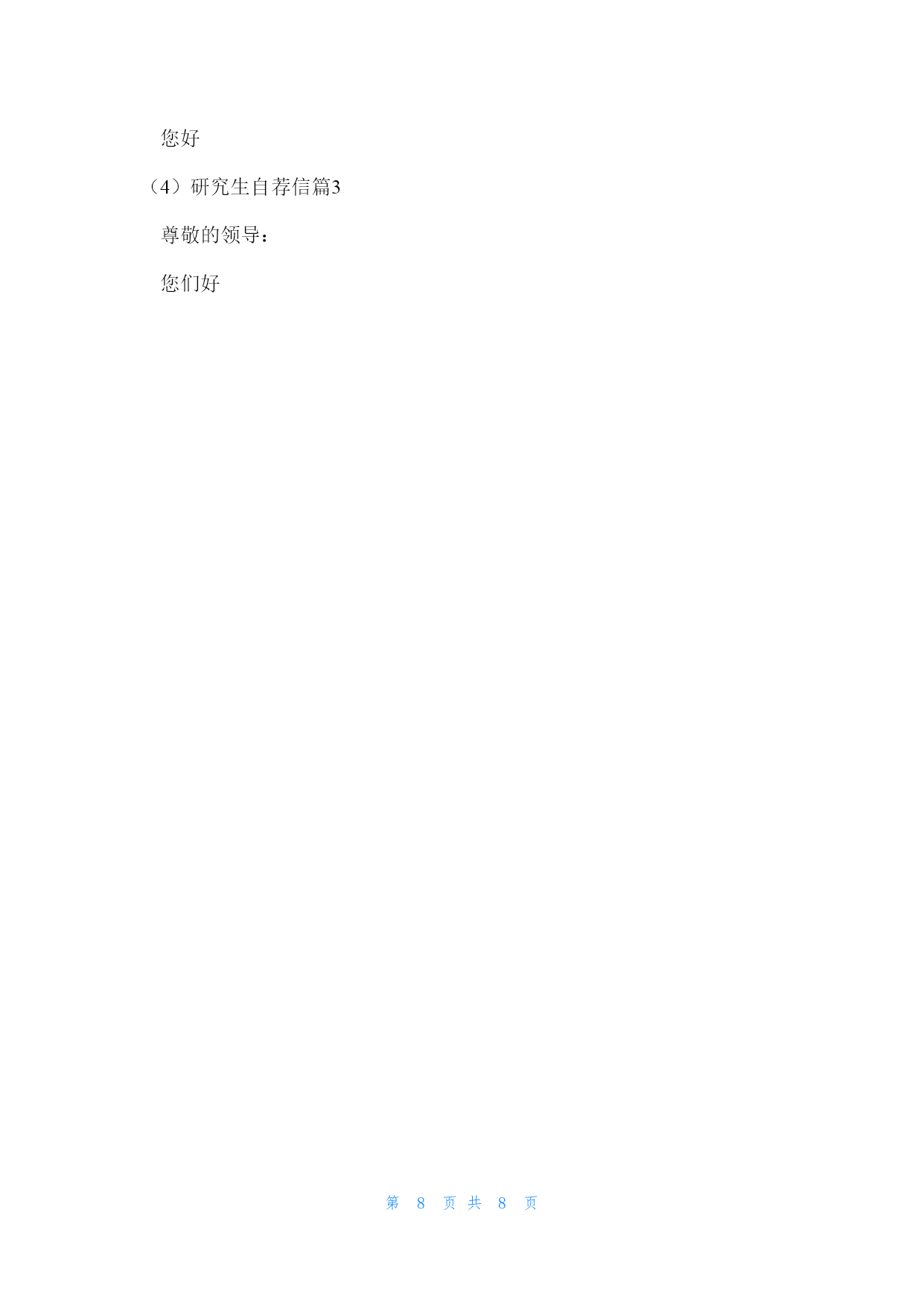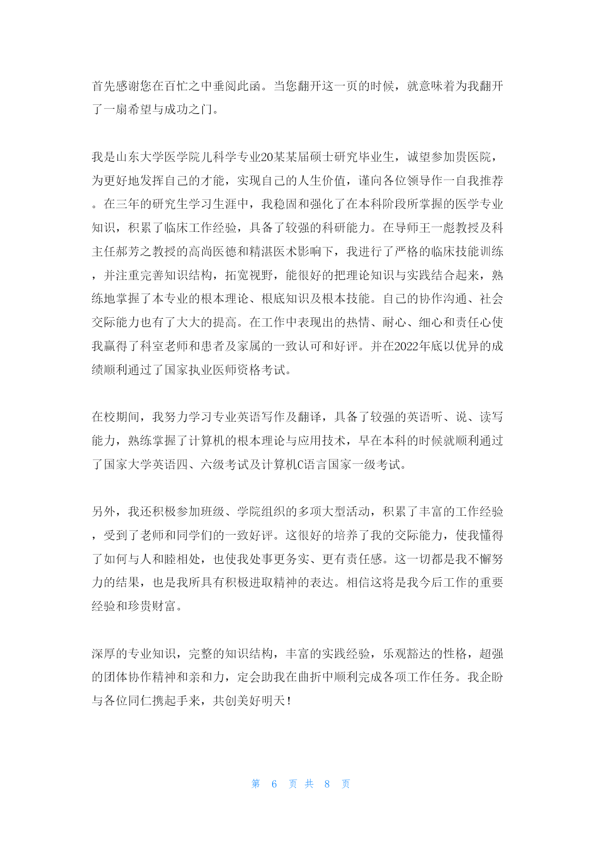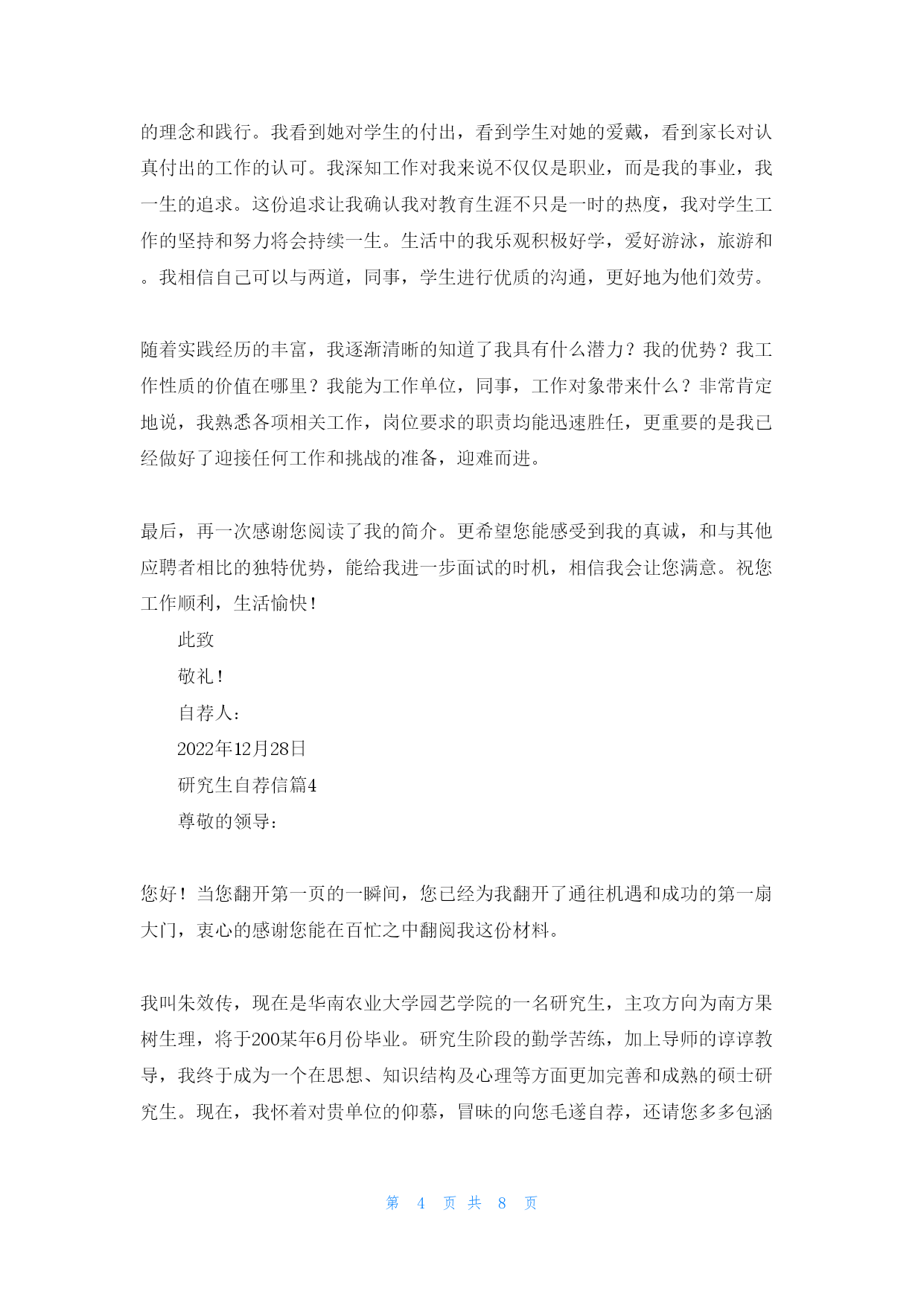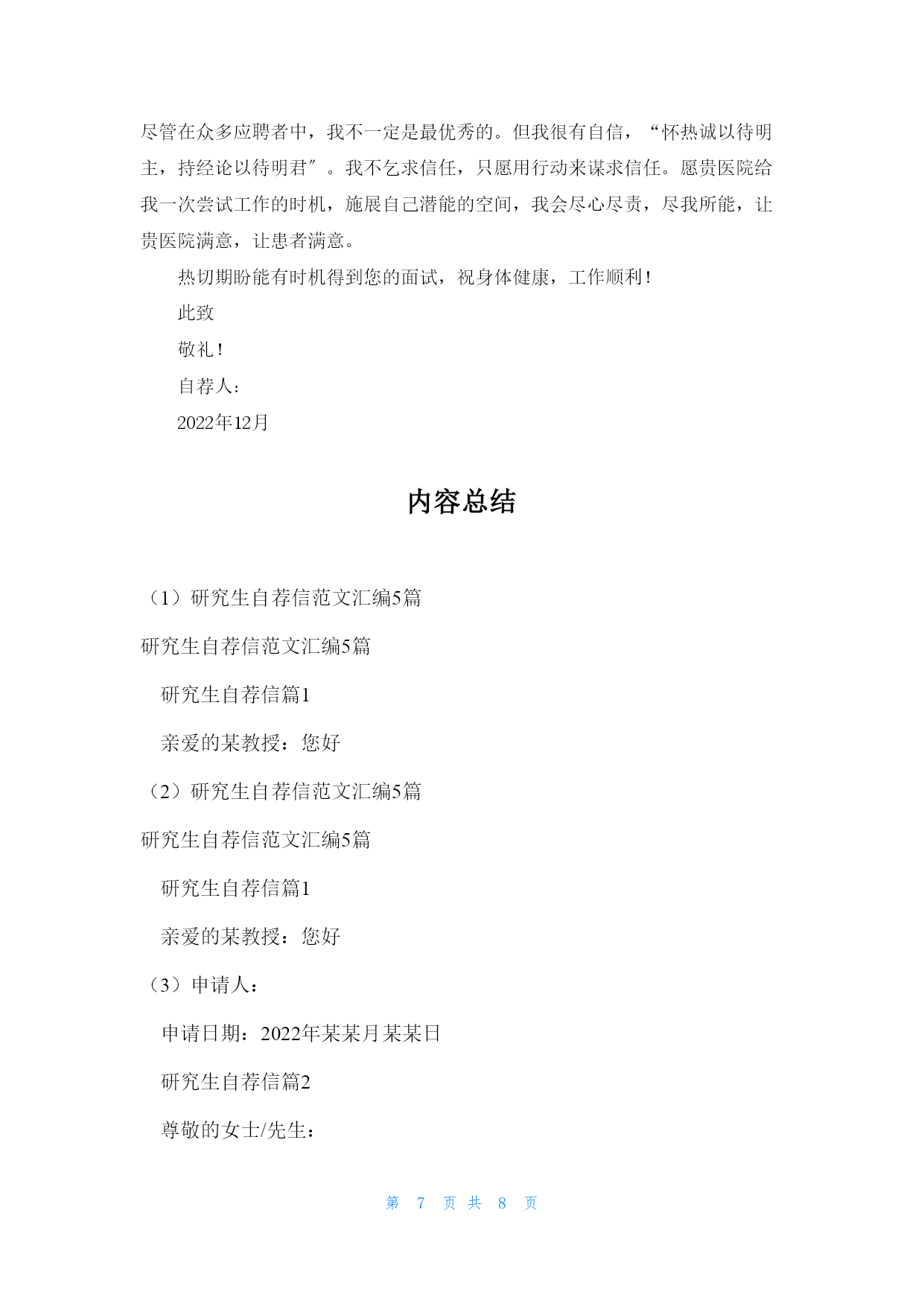 第PAGE8页共NUMPAGES8页研究生自荐信范文(fànwén)汇编5篇研究生自荐信范文(fànwén)汇编5篇研究生自荐信篇1亲爱(qīnài)的某教授(jiàoshòu):您好!我叫,男,人。就读(jiùdú)学院专业,本科学习期间,熟练掌握了相关知识技能〔附件中有本科成绩单〕,通过了全国英语四六级考试、计算机二级考试。今年报考了某某大学专业的学硕型研究生。初试总分356,机械设计:124,数学一:102,英语:64,政治:66。经您的学生推荐以及网上对您的了解,对您所研究的专业方向非常感兴趣。非常期望能跟随您读研究生!如果有幸能得到您的认可,我定不负所望,在读研期间认真跟随导师做研究,做工程,学知识,提高自己的学识水平。感谢您在百忙之中看我的信件,冒昧致信、还望海涵。祝老师工作顺利,万事如意,身体健康。此致敬礼!申请人:申请日期:2022年某某月某某日研究生自荐信篇2尊敬的女士/先生:您好!真诚地感谢您在百忙之中查阅我的求职信。我是电子科技大学自动化工程学院20某某级硕士研究生,2022年某某月我将顺利从学校毕业并获得硕士学位。有幸得悉贵单位正在招聘新员工,我觉得自己开朗稳重、善于学习思考的性格和研究生及本科期间的学习工作情况,很适合贵单位的要求。请允许我简单介绍一下自己:在学习科研方面,自2022年考入电子科技大学攻读工学学士学位以来,我一直积极进取,以认真、严谨的态度对待学习、生活,取得了优秀的成绩,每学年都获得了奖学金。在2022年,由于本科学习期间获得了优异的成绩,我被保送入本校自动化工程学院继续攻读硕士学位。第一学年的课程学习期间获得了优异的成绩。2022年某某月进入教研室以后,开始学习、研究V某I任意波形发生器。半年的时间里,完成了软面板和波形编辑器软件的开发完善和测试。2022年2月,我来到北京经纬纺机新技术,参与国家二级攻关工程自动络筒机的电气控制研发,主要负责通讯软件和逻辑控制局部。通过近一年的时间,使得软、硬件控制单锭动作均能到达用户要求,受到领导的好评。本科阶段曾担任校公寓管理委员会生活部部长,和其他干部一起带着会员出色的完成公管会的各项工作,被评为优秀干部。通过公管会的管理,增强了自己的组织能力,锻炼了自己与人沟通的本领。性格积极活泼,能和别人很融洽的相处。我真诚地希望加盟贵单位,我定会以饱满的热情和坚韧的性格勤奋工作,与同事精诚合作,为贵单位的开展尽自己的绵薄之力。随信附上我的简历,我相信在面试中您会更加全面地了解我。谢谢!此致敬礼!研究生自荐信篇3尊敬的领导:您们好!感谢您阅览我的自荐材料!我叫,是大学教育学专业的20某某届硕士毕业生。我怀着一颗充满着工作热情和追求的心情,从五个方面向您客观地真诚地推介自己。一、专业方面:我学习教育学已近七年。大学四年身处人才济济的教育大省,选择了省重点建设大学,教育学专业。身边不乏优秀的同学和德才兼备的老师,与他们相处让我学会了如何更加高效的学习和工作。我曾在全系人的期末考试中,教育学考得第某名,教育心理学考得第某名的优异成绩;同时也拿到了英语6级、计算机2级、教师资格证等证书。毕业那年,被学校推举为校级优秀毕业生。进入研究生阶段,我开始重视科研能力的锻炼,积极参与导师的课题工程,参编3本书籍与2门课程教案,有针对性的参加《》《》《》等学术会议并积极参与实践研究工作。我的专业能力和授课能力均有较大的优势,也因此获得了两次奖学金。二、组织及工作能力:自大学以来,我便参加了羽毛球协会和教师技能协会,从一名普通的干事慢慢成长为有着200名会员的协会骨干。在协会工作的3年中,我的工作能力逐渐得到大家的认可。研究生阶段,我积极地完成对本科生的.课程教授任务,我的教学能力和专业素养一直有得以进步的时机。三、文字表达能力及筹划能力:自高中起,我的作文就经常以范文的形式与班级同学分享,进入大学之后,我通过选聘参加了校报编辑部。在校报编辑的一年多里,我承当了审稿,组稿,排版的工作,让我的文字和表达能力得到了发挥和提高。研究生阶段,我一直参与课题组的申报,科研报告的写作,以及教案的编排工作,写作能力和思维锻炼一直没有间断过。四、学生工作和教务能力:自研一至今的2年里,我一直在院系学生会工作,由于表现突出被选聘成为校内辅导员参与学生管理工作,积累了丰富的学生工作经验和学校辅导的经验。五、对教育工作的期待和追求:我的父母都是教师,从小我耳濡目染她对教育的理念和践行。我看到她对学生的付出,看到学生对她的爱戴,看到家长对认真付出的工作的认可。我深知工作对我来说不仅仅是职业,而是我的事业,我一生的追求。这份追求让我确认我对教育生涯不只是一时的热度,我对学生工作的坚持和努力将会持续一生。生活中的我乐观积极好学,爱好游泳,旅游和。我相信自己可以与两道,同