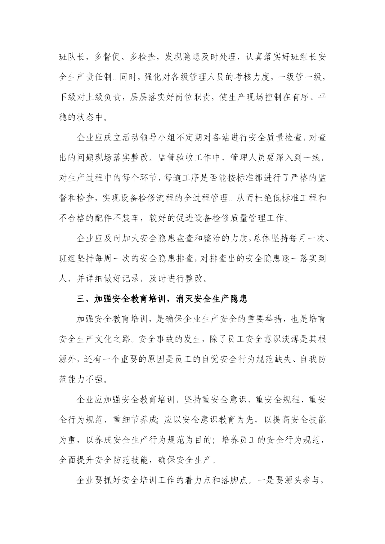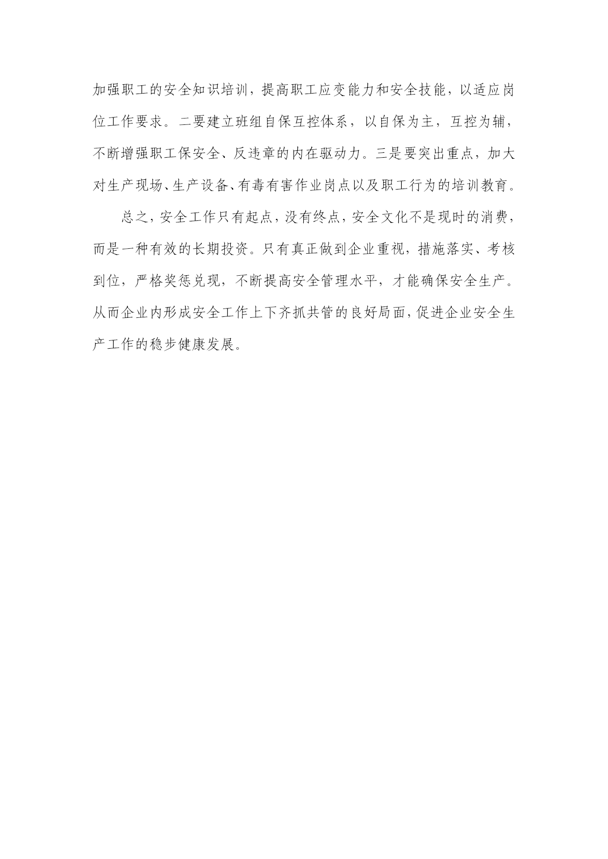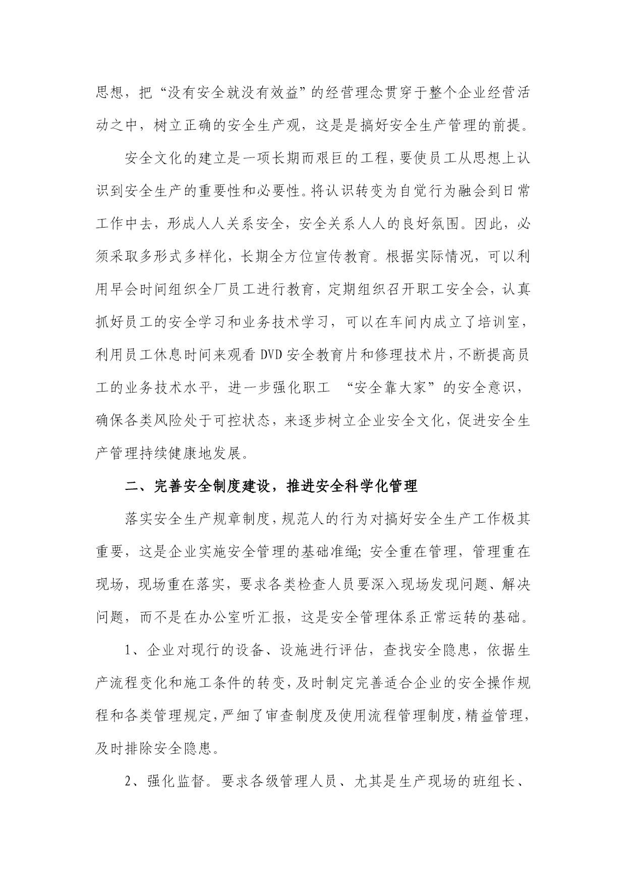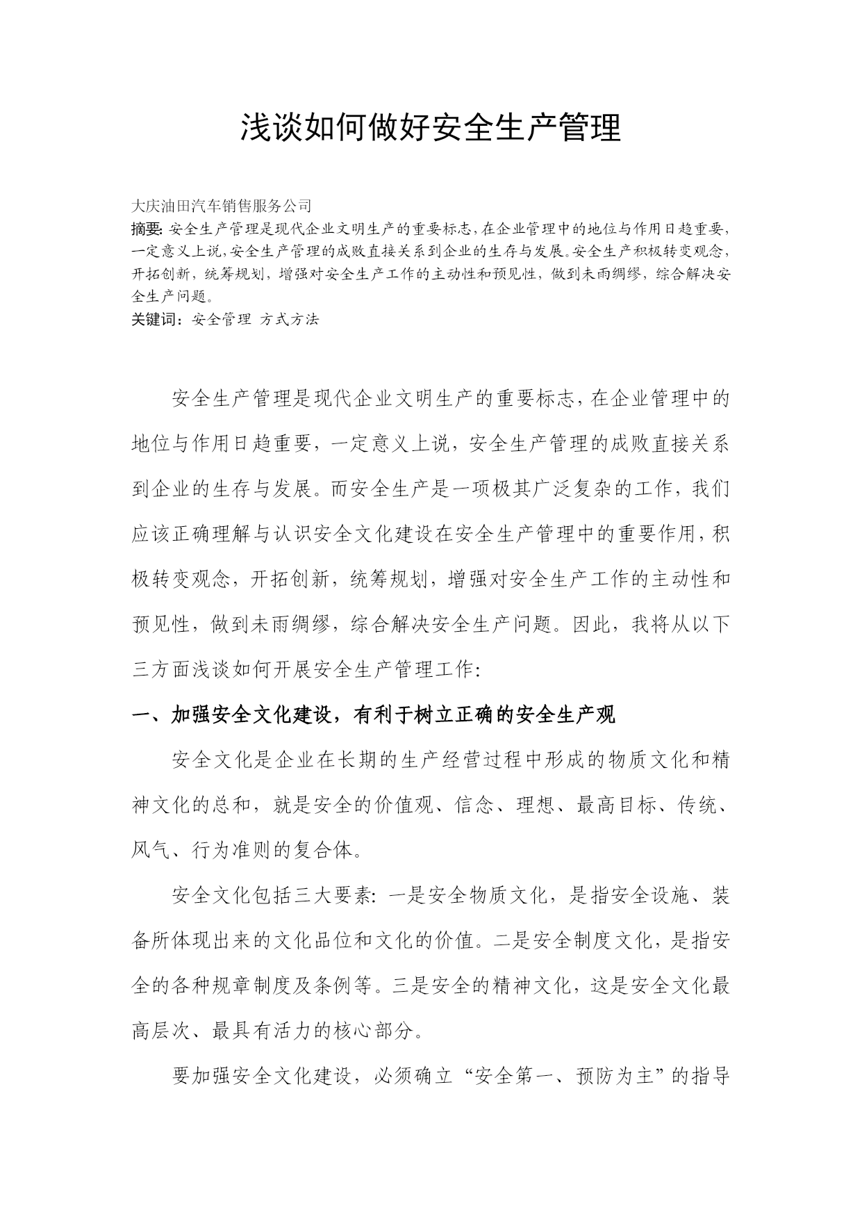 浅谈如何做好安全生产管理浅谈如何做好安全生产管理大庆油田汽车销售服务公司摘要:安全生产管理是现代企业文明生产的重要标志,在企业管理中的地位与作用日趋重要,一定意义上说,安全生产管理的成败直接关系到企业的生存与发展。安全生产积极转变观念,开拓创新,统筹规划,增强对安全生产工作的主动性和预见性,做到未雨绸缪,综合解决安全生产问题。关键词:安全管理方式方法安全生产管理是现代企业文明生产的重要标志,在企业管理中的地位与作用日趋重要,一定意义上说,安全生产管理的成败直接关系到企业的生存与发展。而安全生产是一项极其广泛复杂的工作,我们应该正确理解与认识安全文化建设在安全生产管理中的重要作用,积极转变观念,开拓创新,统筹规划,增强对安全生产工作的主动性和预见性,做到未雨绸缪,综合解决安全生产问题。因此,我将从以下三方面浅谈如何开展安全生产管理工作:一、加强安全文化建设,有利于树立正确的安全生产观安全文化是企业在长期的生产经营过程中形成的物质文化和精神文化的总和,就是安全的价值观、信念、理想、最高目标、传统、风气、行为准则的复合体。安全文化包括三大要素:一是安全物质文化,是指安全设施、装备所体现出来的文化品位和文化的价值。二是安全制度文化,是指安全的各种规章制度及条例等。三是安全的精神文化,这是安全文化最高层次、最具有活力的核心部分。要加强安全文化建设,必须确立“安全第一、预防为主”的指导思想,把“没有安全就没有效益”的经营理念贯穿于整个企业经营活动之中,树立正确的安全生产观,这是是搞好安全生产管理的前提。安全文化的建立是一项长期而艰巨的工程,要使员工从思想上认识到安全生产的重要性和必要性。将认识转变为自觉行为融会到日常工作中去,形成人人关系安全,安全关系人人的良好氛围。因此,必须采取多形式多样化,长期全方位宣传教育。根据实际情况,可以利用早会时间组织全厂员工进行教育,定期组织召开职工安全会,认真抓好员工的安全学习和业务技术学习,可以在车间内成立了培训室,利用员工休息时间来观看DVD安全教育片和修理技术片,不断提高员工的业务技术水平,进一步强化职工“安全靠大家”的安全意识,确保各类风险处于可控状态,来逐步树立企业安全文化,促进安全生产管理持续健康地发展。二、完善安全制度建设,推进安全科学化管理落实安全生产规章制度,规范人的行为对搞好安全生产工作极其重要,这是企业实施安全管理的基础准绳;安全重在管理,管理重在现场,现场重在落实,要求各类检查人员要深入现场发现问题、解决问题,而不是在办公室听汇报,这是安全管理体系正常运转的基础。1、企业对现行的设备、设施进行评估,查找安全隐患,依据生产流程变化和施工条件的转变,及时制定完善适合企业的安全操作规程和各类管理规定,严细了审查制度及使用流程管理制度,精益管理,及时排除安全隐患。2、强化监督。要求各级管理人员、尤其是生产现场的班组长、班队长,多督促、多检查,发现隐患及时处理,认真落实好班组长安全生产责任制。同时,强化对各级管理人员的考核力度,一级管一级,下级对上级负责,层层落实好岗位职责,使生产现场控制在有序、平稳的状态中。企业应成立活动领导小组不定期对各站进行安全质量检查,对查出的问题现场落实整改。监管验收工作中,管理人员要深入到一线,对生产过程中的每个环节,每道工序是否能按标准都进行了严格的监督和检查,实现设备检修流程的全过程管理。从而杜绝低标准工程和不合格的配件不装车,较好的促进设备检修质量管理工作。企业应及时加大安全隐患盘查和整治的力度,总体坚持每月一次、班组坚持每周一次的安全隐患排查,对排查出的安全隐患逐一落实到人,并详细做好记录,及时进行整改。三、加强安全教育培训,消灭安全生产隐患加强安全教育培训,是确保企业生产安全的重要举措,也是培育安全生产文化之路。安全事故的发生,除了员工安全意识淡薄是其根源外,还有一个重要的原因是员工的自觉安全行为规范缺失、自我防范能力不强。企业应加强安全教育培训,坚持重安全意识、重安全规程、重安全行为规范、重细节养成;应以安全意识教育为先,以提高安全技能为重,以养成安全生产行为规范为目的;培养员工的安全行为规范,全面提升安全防范技能,确保安全生产。企业要抓好安全培训工作的着力点和落脚点。一是要源头参与,加强职工的安全知识培训,提高职工应变能力和安全技能,以适应岗位工作要求。二要建立班组自保互控体系,以自保为主,互控为辅,不断增强职工保安全、反违章的内在驱动力。三是要突出重点,加大对生产现场、生产设备、有毒有害作业岗点以及职工行为的培训教育。总之,安全工作只有起点,没有终点,安全文化不是现时的消费,而是一种有效的长期投资。只有真正做到企业重视,措施落实、考核到位,严格奖惩兑