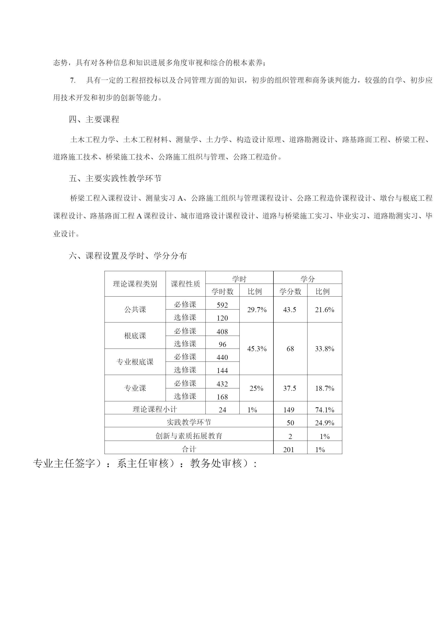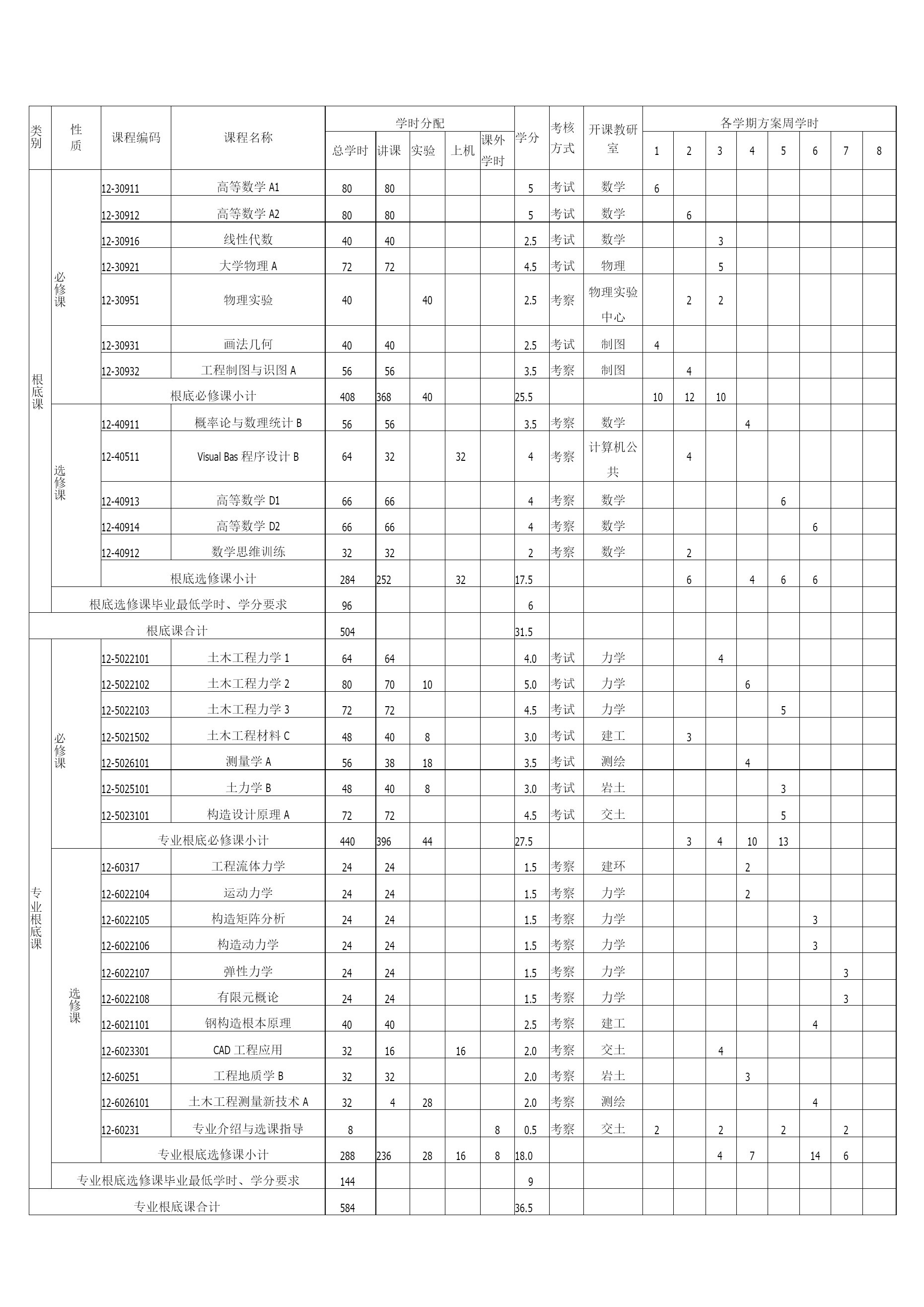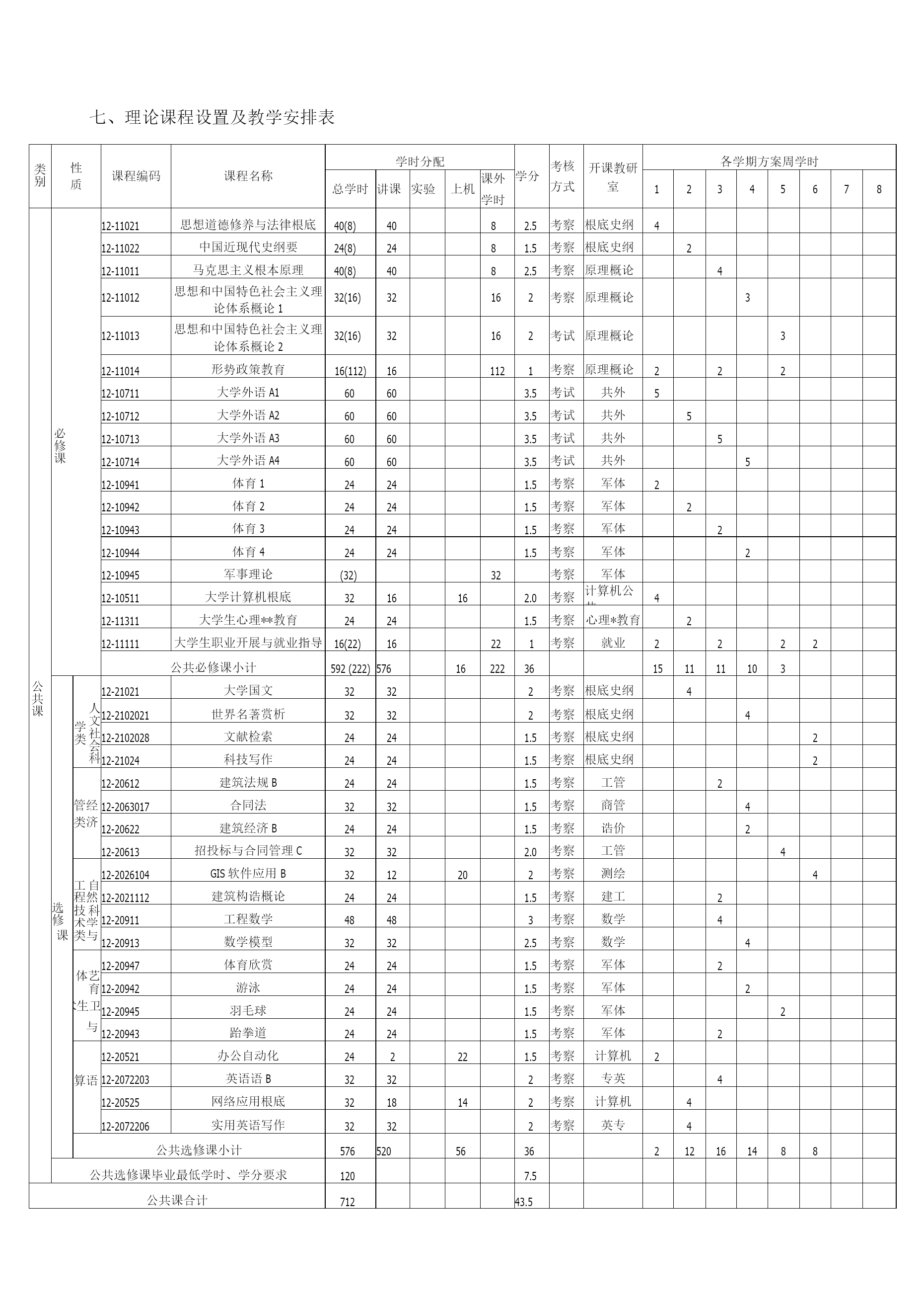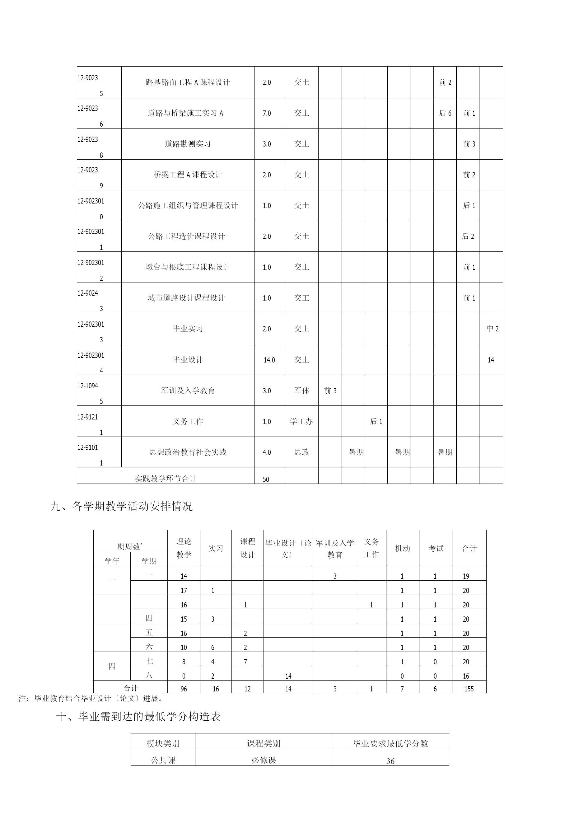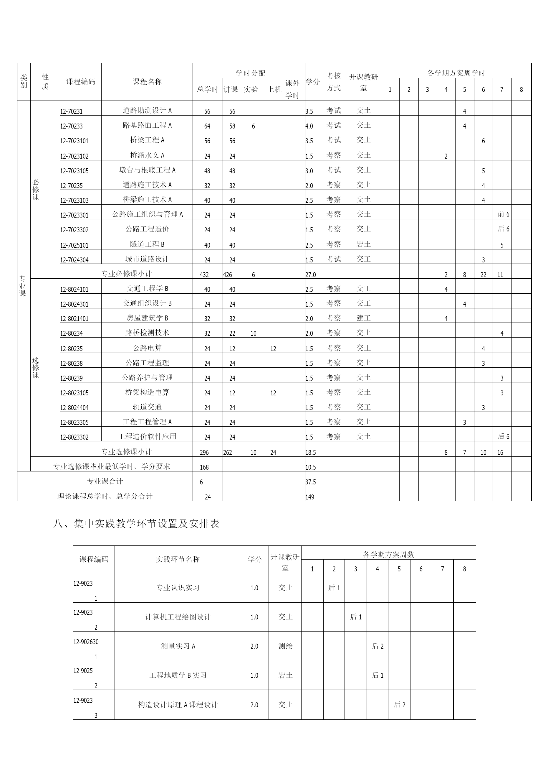 土木工程专业〔交通土建方向〕人才培养方案一、根本信息学科门类:工学专业类:土建类专业代码:080703修业年限:根本学制为四年,学习年限为四〜六年授予学位:工学学士二、人才培养目标本专业培养适应社会主义现代化建立需要的德、智、体、美全面开展,适应社会经济和交通开展需要,掌握土木工程交通土建方向的根本原理和根本知识,能胜任道路、桥梁、隧道等各类土木工程的技术与管理工作,具有扎实的根底理论、宽广的专业知识、较强的工程实践能力和创新能力以及一定的国际视野,能面向未来的高级专门人才。三、业务培养要求本专业毕业生主要学习力学、构造、施工、工程工程管理与经济等方面的根本理论和根本知识,承受力学分析、构造设计、施工技术与工程管理、文字图纸表达等方面的根本训练,掌握在交通土建工程工程勘察、设计、施工、管理、教育、投资和开发、金融与保险等部门从事技术或管理工作的根本能力。毕业生应获得以下几个方面的知识、能力和素质:具有较为扎实的与本专业相关的数学、物理等自然科学的根底知识。熟悉哲学、政治学、经济学、法学等方面的根本知识;较系统地掌握本专业领域的根底理论和根底知识,主要包括土木工程力学、测量学、土木工程材料、土力学等根底知识;掌握本专业道路构造设计,桥梁构造设计、路桥施工技术、路桥施工组织与管理和路桥工程造价控制的专业知识;具有土木工程设计的初步能力和一定的施工管理能力;具有本专业必需的制图、计算、试验、测试、计算机辅助设计和工艺操作等根本技能以及较强的计算机应用能力;掌握道路与桥梁构造的选型、构造、计算原理和设计方法,掌握工程构造CAD和其他软件应用技术,掌握道路与桥梁施工的一般技术、过程、组织和管理以及工程检测和试验根本方法;具有文献检索和利用一门外语进展专业外文资料翻译的根本能力,了解土木工程领域的开展态势,具有对各种信息和知识进展多角度审视和综合的根本素养;具有一定的工程招投标以及合同管理方面的知识,初步的组织管理和商务谈判能力,较强的自学、初步应用技术开发和初步的创新等能力。四、主要课程土木工程力学、土木工程材料、测量学、土力学、构造设计原理、道路勘测设计、路基路面工程、桥梁工程、道路施工技术、桥梁施工技术、公路施工组织与管理、公路工程造价。五、主要实践性教学环节桥梁工程入课程设计、测量实习A、公路施工组织与管理课程设计、公路工程造价课程设计、墩台与根底工程课程设计、路基路面工程A课程设计、城市道路设计课程设计、道路与桥梁施工实习、毕业实习、道路勘测实习、毕业设计。六、课程设置及学时、学分分布理论课程类别课程性质学时学分学时数比例学分数比例公共课必修课59229.7%43.521.6%选修课120根底课必修课40845.3%6833.8%选修课96专业根底课必修课440选修课144专业课必修课43225%37.518.7%选修课168理论课程小计241%14974.1%实践教学环节5024.9%创新与素质拓展教育21%合计2011%专业主任签字):系主任审核):教务处审核):七、理论课程设置及教学安排表类别性质课程编码课程名称学时分配学分考核方式开课教研室各学期方案周学时总学时讲课实验上机课外学时1234567812-11021思想道德修养与法律根底40(8)4082.5考察根底史纲412-11022中国近现代史纲要24(8)2481.5考察根底史纲212-11011马克思主义根本原理40(8)4082.5考察原理概论412-11012思想和中国特色社会主义理论体系概论132(16)32162考察原理概论312-11013思想和中国特色社会主义理论体系概论232(16)32162考试原理概论312-11014形势政策教育16(112)161121考察原理概论22212-10711大学外语A160603.5考试共外512-10712大学外语A260603.5考试共外5必修课12-10713大学外语A360603.5考试共外512-10714大学外语A460603.5考试共外512-10941体育124241.5考察军体212-10942体育224241.5考察军体212-10943体育324241.5考察军体212-10944体育424241.5考察军体212-10945军事理论(32)32考察军体12-10511大学计算机根底3216162.0考察计算机公共412-11311大学生心理**教育24241.5考察心理*教育212-11111大学生职业开展与就业指导16(22)16221考察就业2222公共必修课小计592(222)5761622236151111103公共课12-21021大学国文32322考察根底史纲4人文社会科学类12-2102021世界名著赏析32322考