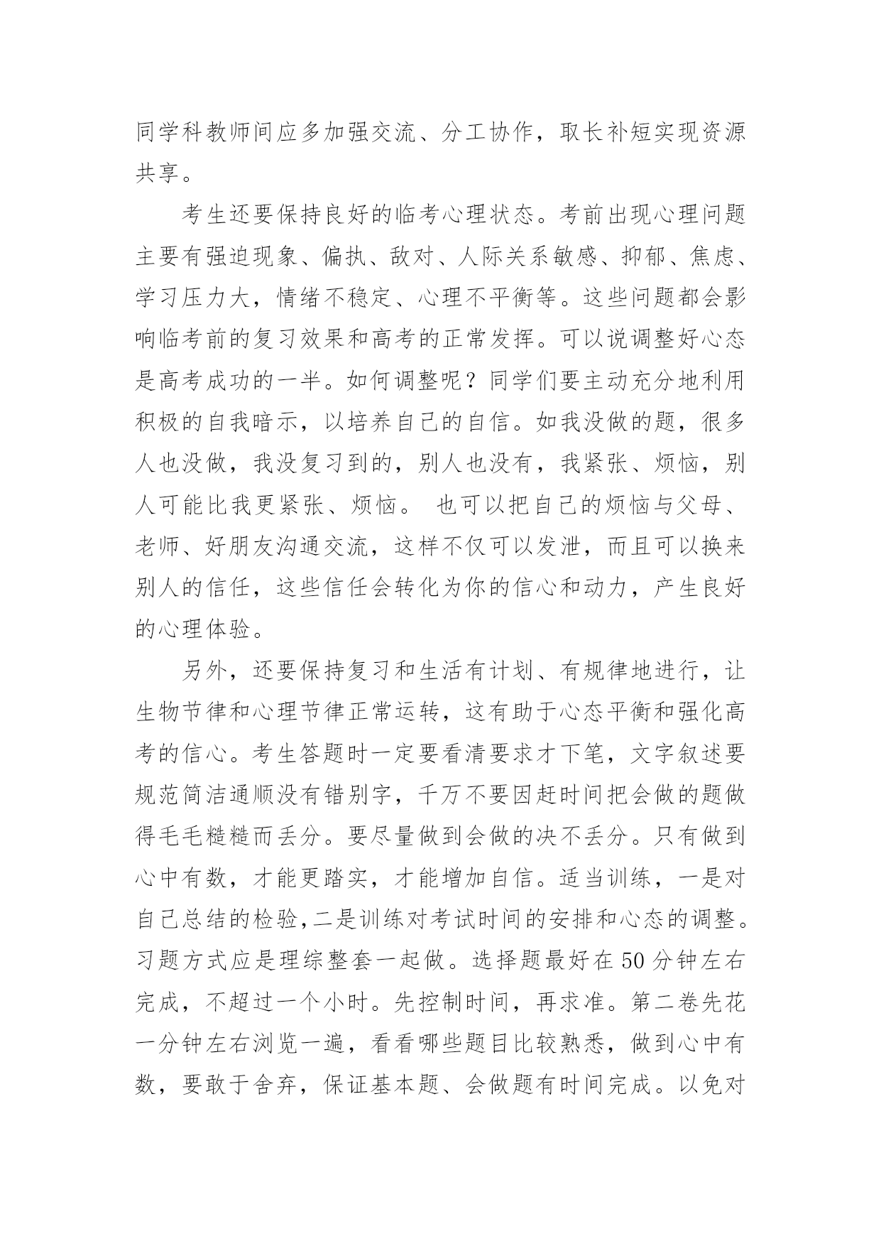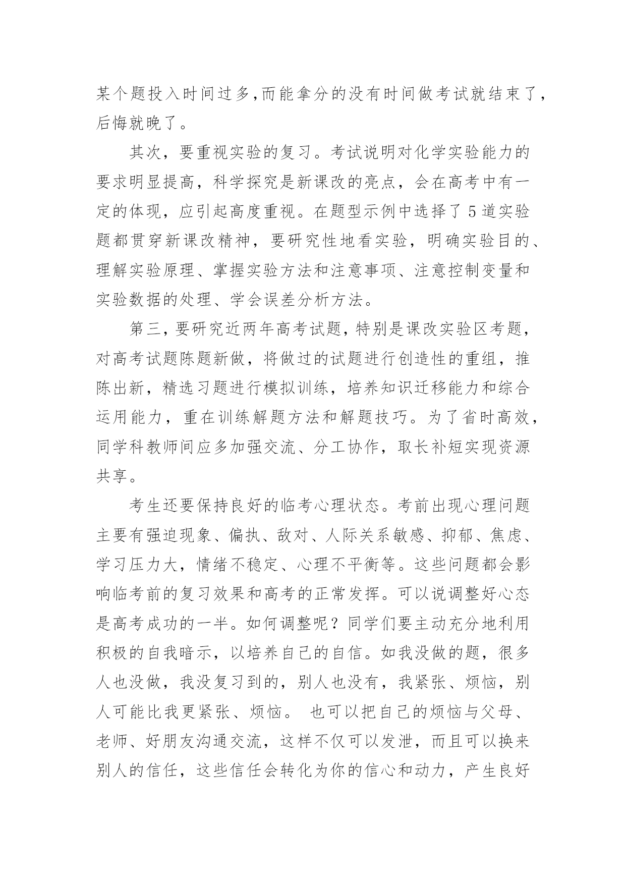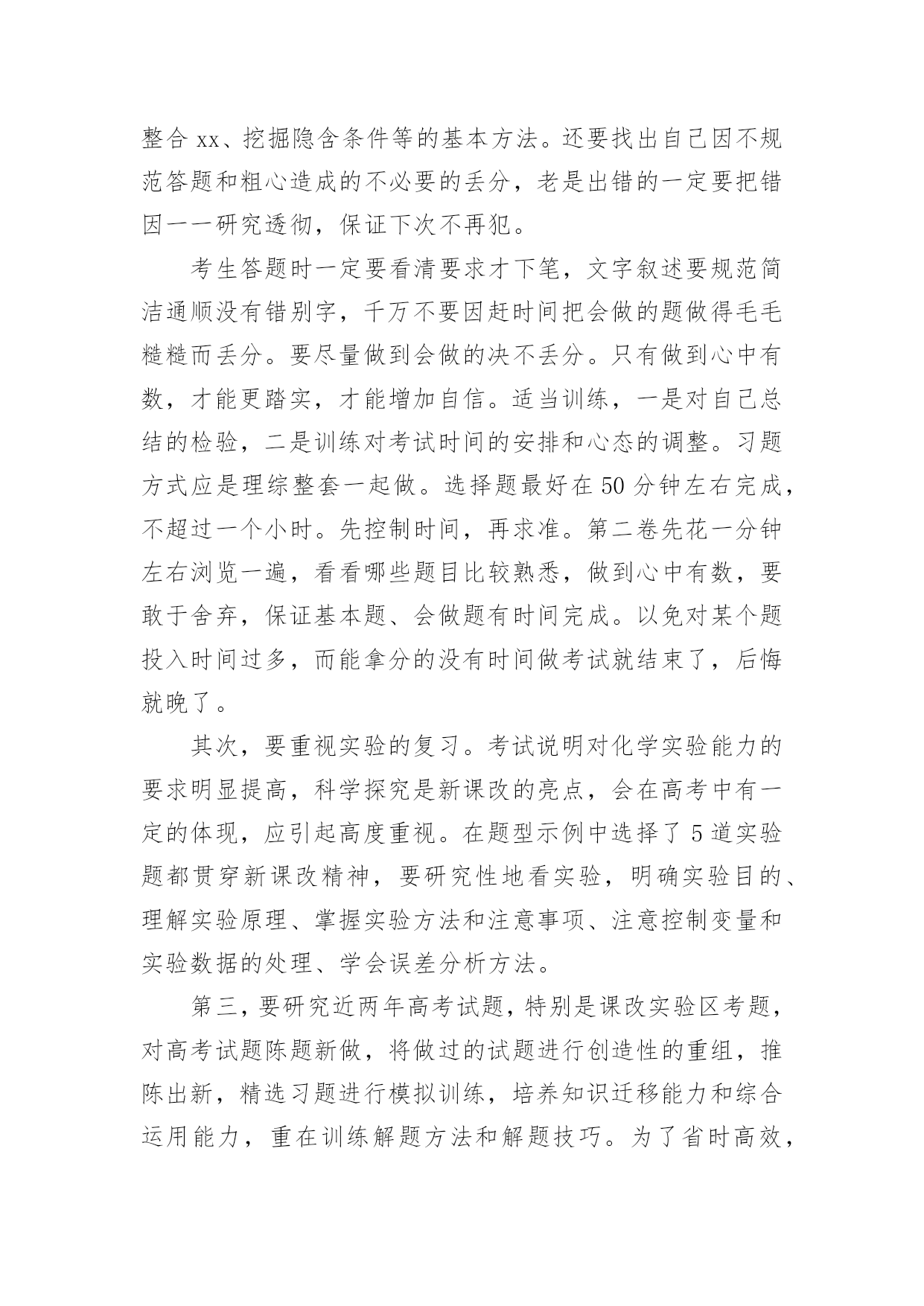 高考化学复习指导文章高考化学复习指导文章经过了两轮高考备考的最后复习阶段,考生们应该做些什么才对高考更有时效性和针对性?这是高三学生临考前普遍面临的问题。首先,要研究并落实考试说明中所涉及考点、做有针对性训练。一轮复习大多数学校在三月上旬结束,二轮复习很快开始。从近年课改实验区化学学科考题的特点来看,试题考查的知识点绝大多数是中学化学的主干知识和大学化学学习的关联知识,Ⅰ卷中试题多为基础、热点知识,Ⅱ卷重在知识的整合、理解和运用,试题涉及的知识点多,知识覆盖面大。要求我们教师要认真设计二轮复习方案,优化复习内容,重点梳理知识点,提高学生整合知识、分析问题的能力,提高复习教学的针对性和有效性。对于学生要回归教材、整理习题、适当训练。回归教材并不简单把课本浏览一遍,而是注意梳理化学知识点,使基础知识和内容网络化、系统化、立体化;消除知识盲点;注意加深基本概念、基本原理、基本规律、基本实验的理解,和这些知识点的前因后果、选用条件以及相关概念之间的联系与区别。整理习题,根据自己的实际情况,可以整理薄弱章节的,也可按高考7道选择题4道大题涉及到的热点、重点知识进行归类,反思自己掌握情况,进行针对性弥补。同时注重总结同类习题的解题思维模式以及审题、整合xx、挖掘隐含条件等的基本方法。还要找出自己因不规范答题和粗心造成的不必要的丢分,老是出错的一定要把错因一一研究透彻,保证下次不再犯。考生答题时一定要看清要求才下笔,文字叙述要规范简洁通顺没有错别字,千万不要因赶时间把会做的题做得毛毛糙糙而丢分。要尽量做到会做的决不丢分。只有做到心中有数,才能更踏实,才能增加自信。适当训练,一是对自己总结的检验,二是训练对考试时间的安排和心态的调整。习题方式应是理综整套一起做。选择题最好在50分钟左右完成,不超过一个小时。先控制时间,再求准。第二卷先花一分钟左右浏览一遍,看看哪些题目比较熟悉,做到心中有数,要敢于舍弃,保证基本题、会做题有时间完成。以免对某个题投入时间过多,而能拿分的没有时间做考试就结束了,后悔就晚了。其次,要重视实验的复习。考试说明对化学实验能力的要求明显提高,科学探究是新课改的亮点,会在高考中有一定的体现,应引起高度重视。在题型示例中选择了5道实验题都贯穿新课改精神,要研究性地看实验,明确实验目的、理解实验原理、掌握实验方法和注意事项、注意控制变量和实验数据的处理、学会误差分析方法。第三,要研究近两年高考试题,特别是课改实验区考题,对高考试题陈题新做,将做过的试题进行创造性的重组,推陈出新,精选习题进行模拟训练,培养知识迁移能力和综合运用能力,重在训练解题方法和解题技巧。为了省时高效,同学科教师间应多加强交流、分工协作,取长补短实现资源共享。考生还要保持良好的临考心理状态。考前出现心理问题主要有强迫现象、偏执、敌对、人际关系敏感、抑郁、焦虑、学习压力大,情绪不稳定、心理不平衡等。这些问题都会影响临考前的复习效果和高考的正常发挥。可以说调整好心态是高考成功的一半。如何调整呢?同学们要主动充分地利用积极的自我暗示,以培养自己的自信。如我没做的题,很多人也没做,我没复习到的,别人也没有,我紧张、烦恼,别人可能比我更紧张、烦恼。也可以把自己的烦恼与父母、老师、好朋友沟通交流,这样不仅可以发泄,而且可以换来别人的信任,这些信任会转化为你的信心和动力,产生良好的心理体验。另外,还要保持复习和生活有计划、有规律地进行,让生物节律和心理节律正常运转,这有助于心态平衡和强化高考的信心。考生答题时一定要看清要求才下笔,文字叙述要规范简洁通顺没有错别字,千万不要因赶时间把会做的题做得毛毛糙糙而丢分。要尽量做到会做的决不丢分。只有做到心中有数,才能更踏实,才能增加自信。适当训练,一是对自己总结的检验,二是训练对考试时间的安排和心态的调整。习题方式应是理综整套一起做。选择题最好在50分钟左右完成,不超过一个小时。先控制时间,再求准。第二卷先花一分钟左右浏览一遍,看看哪些题目比较熟悉,做到心中有数,要敢于舍弃,保证基本题、会做题有时间完成。以免对某个题投入时间过多,而能拿分的没有时间做考试就结束了,后悔就晚了。其次,要重视实验的复习。考试说明对化学实验能力的要求明显提高,科学探究是新课改的亮点,会在高考中有一定的体现,应引起高度重视。在题型示例中选择了5道实验题都贯穿新课改精神,要研究性地看实验,明确实验目的、理解实验原理、掌握实验方法和注意事项、注意控制变量和实验数据的处理、学会误差分析方法。第三,要研究近两年高考试题,特别是课改实验区考题,对高考试题陈题新做,将做过的试题进行创造性的重组,推陈出新,精选习题进行模拟训练,培养知识迁移能力和综合运用能力,重在训练解题方法和解题技巧。为了省时高效,同学科教师间应多加强交流、分工协作,取长补短实现资源共享。考生还要