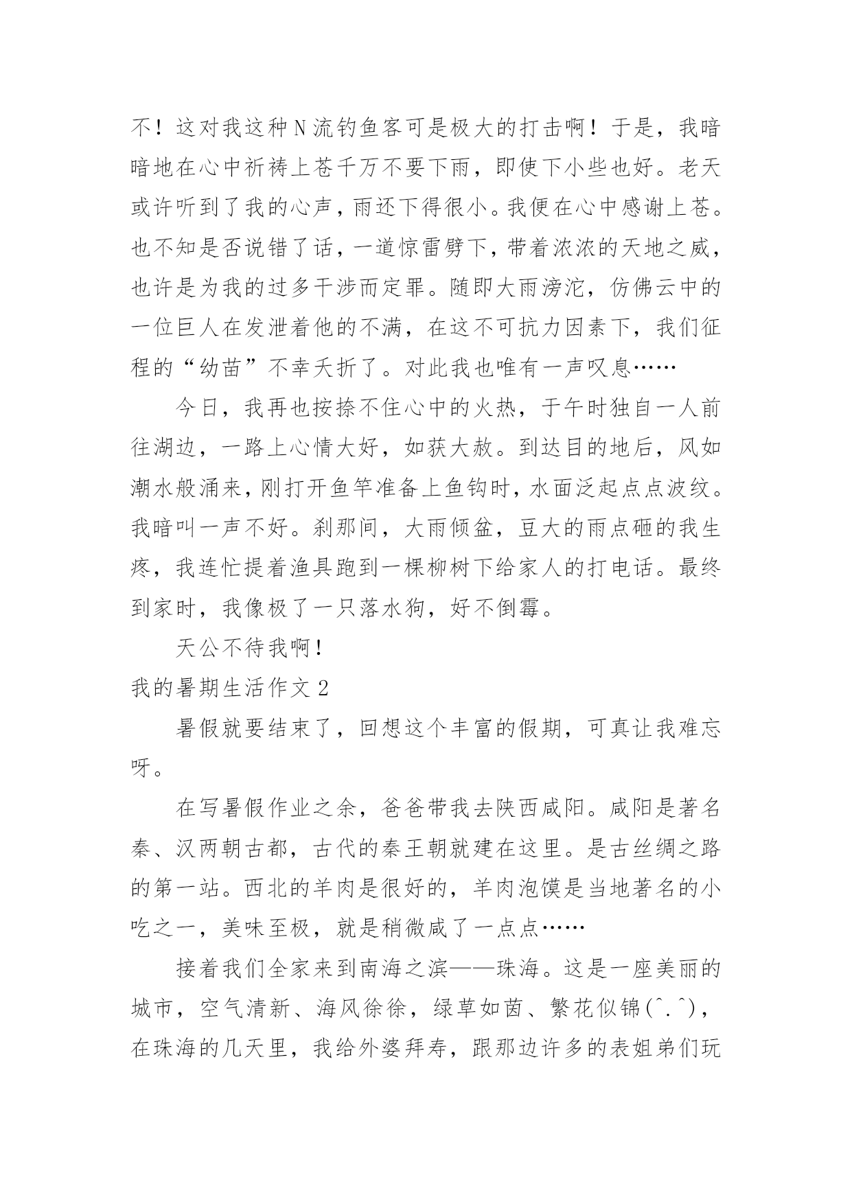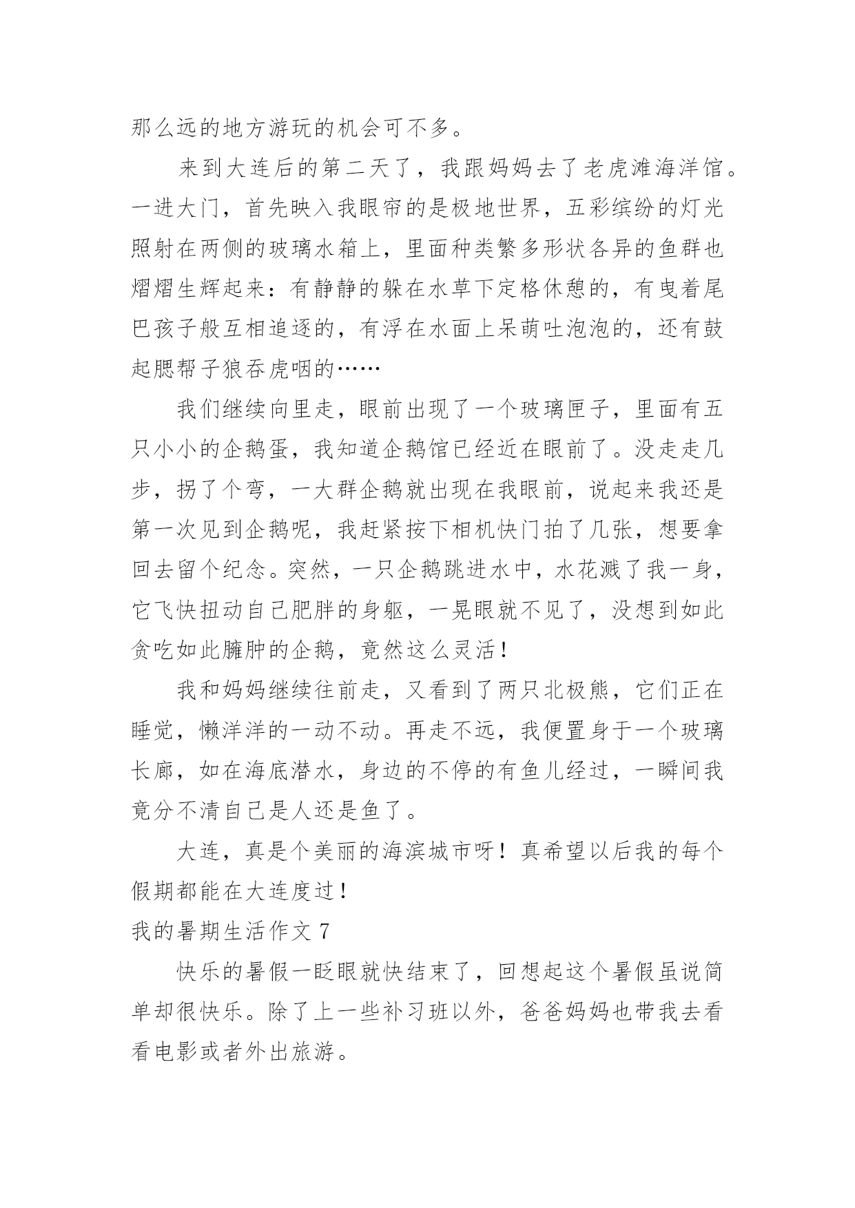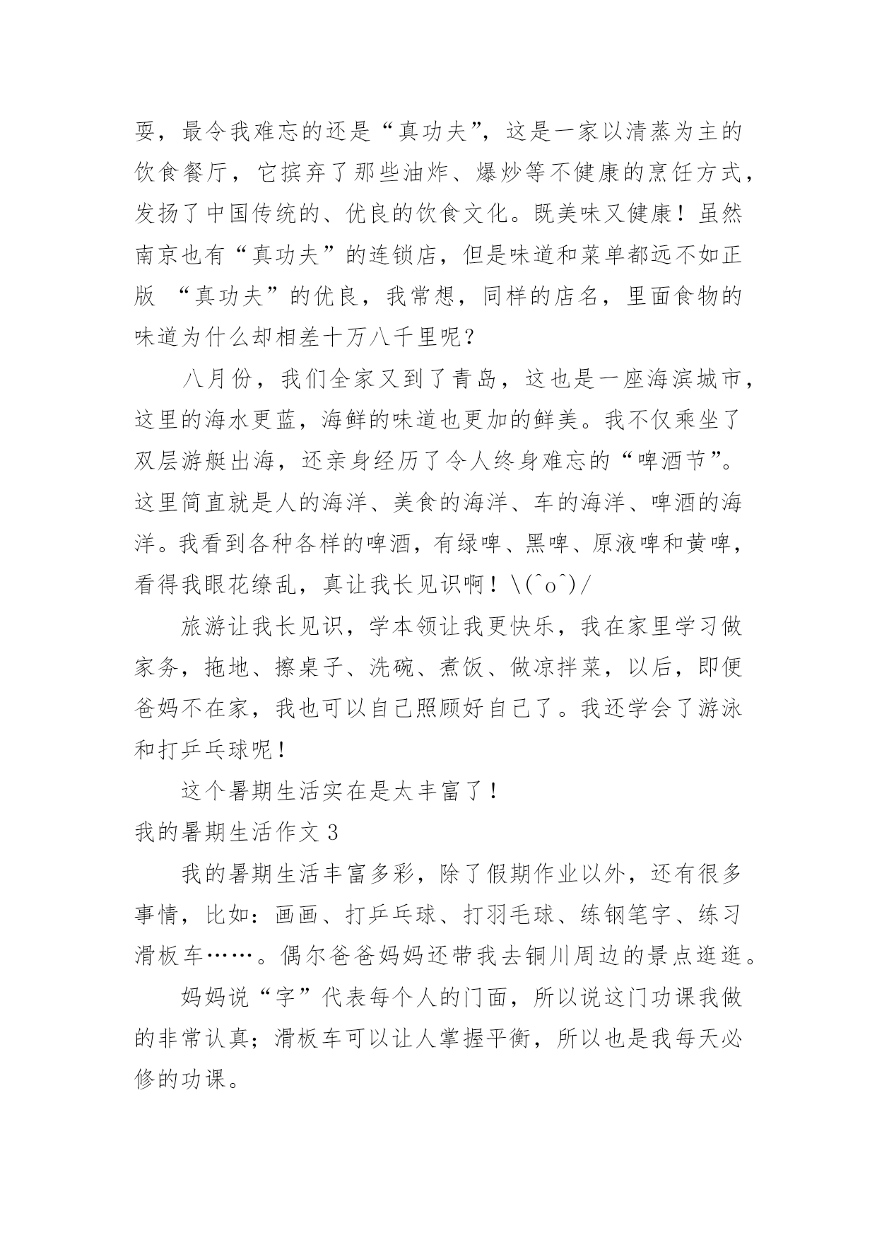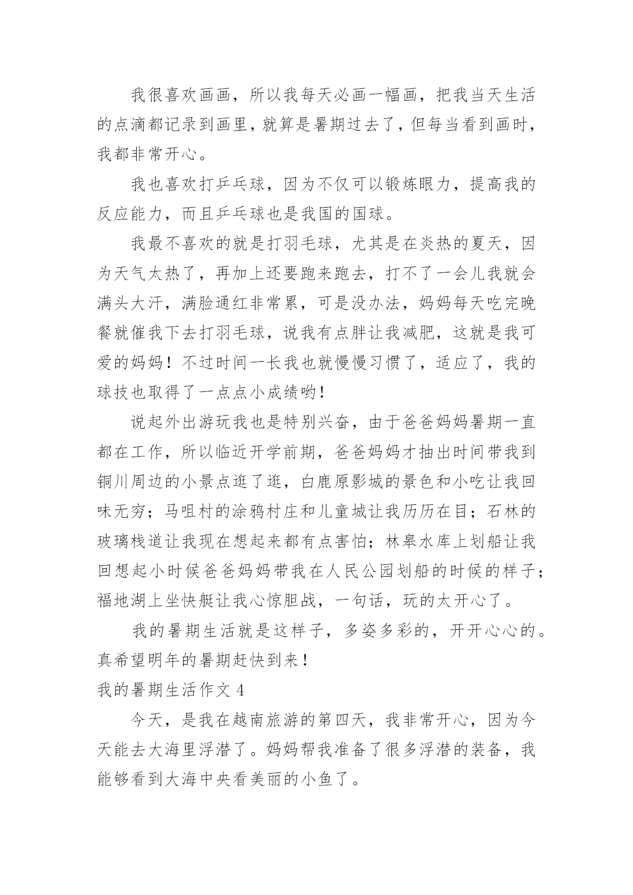 我的暑期生活作文我的暑期生活作文10篇在日常生活或是工作学习中,许多人都有过写作文的经历,对作文都不陌生吧,作文根据体裁的不同可以分为记叙文、说明文、应用文、议论文。相信许多人会觉得作文很难写吧,以下是小编收集整理的我的暑期生活作文,供大家参考借鉴,希望可以帮助到有需要的朋友。我的暑期生活作文1说实话,每一次的假期都是在等待新的“工作”,而等待往往是最漫长的,更何况本就漫长的暑假呢?幸运的是,我找到了可做之事——钓鱼。我会告诉你我钓鱼的过程吗?不,实际也并没有。我要说的是在它之前的过程。这天,我与父亲决定去钓鱼,但我的弟弟坚定地告诉我们,他也要去。如此一来,我的噩梦便开始了。我简单的列举下:早晨,热,弟弟不能去,我们也便作罢。中午,一觉醒来,拉开窗帘,匕首般的阳光刺痛了我的眼,火爆的太阳向世界发泄着它的不爽,却伤了我这钓鱼客的心,百般无奈下,我也只能忍住我“沉痛”的内心,合上双眼,在梦中结束这“残酷”的一天。次日,与往常一般,显得平平淡淡。却令我这个钓鱼客格外兴奋——阴天。于是我们两个大人带着一名小人踏上了征程。半路,天越来越暗,阴郁的仿佛要滴出水来。水?哦,不!这对我这种N流钓鱼客可是极大的打击啊!于是,我暗暗地在心中祈祷上苍千万不要下雨,即使下小些也好。老天或许听到了我的心声,雨还下得很小。我便在心中感谢上苍。也不知是否说错了话,一道惊雷劈下,带着浓浓的天地之威,也许是为我的过多干涉而定罪。随即大雨滂沱,仿佛云中的一位巨人在发泄着他的不满,在这不可抗力因素下,我们征程的“幼苗”不幸夭折了。对此我也唯有一声叹息……今日,我再也按捺不住心中的火热,于午时独自一人前往湖边,一路上心情大好,如获大赦。到达目的地后,风如潮水般涌来,刚打开鱼竿准备上鱼钩时,水面泛起点点波纹。我暗叫一声不好。刹那间,大雨倾盆,豆大的雨点砸的我生疼,我连忙提着渔具跑到一棵柳树下给家人的打电话。最终到家时,我像极了一只落水狗,好不倒霉。天公不待我啊!我的暑期生活作文2暑假就要结束了,回想这个丰富的假期,可真让我难忘呀。在写暑假作业之余,爸爸带我去陕西咸阳。咸阳是著名秦、汉两朝古都,古代的秦王朝就建在这里。是古丝绸之路的第一站。西北的羊肉是很好的,羊肉泡馍是当地著名的小吃之一,美味至极,就是稍微咸了一点点……接着我们全家来到南海之滨——珠海。这是一座美丽的城市,空气清新、海风徐徐,绿草如茵、繁花似锦(^.^),在珠海的几天里,我给外婆拜寿,跟那边许多的表姐弟们玩耍,最令我难忘的还是“真功夫”,这是一家以清蒸为主的饮食餐厅,它摈弃了那些油炸、爆炒等不健康的烹饪方式,发扬了中国传统的、优良的饮食文化。既美味又健康!虽然南京也有“真功夫”的连锁店,但是味道和菜单都远不如正版“真功夫”的优良,我常想,同样的店名,里面食物的味道为什么却相差十万八千里呢?八月份,我们全家又到了青岛,这也是一座海滨城市,这里的海水更蓝,海鲜的味道也更加的鲜美。我不仅乘坐了双层游艇出海,还亲身经历了令人终身难忘的“啤酒节”。这里简直就是人的海洋、美食的海洋、车的海洋、啤酒的海洋。我看到各种各样的啤酒,有绿啤、黑啤、原液啤和黄啤,看得我眼花缭乱,真让我长见识啊!\(^o^)/旅游让我长见识,学本领让我更快乐,我在家里学习做家务,拖地、擦桌子、洗碗、煮饭、做凉拌菜,以后,即便爸妈不在家,我也可以自己照顾好自己了。我还学会了游泳和打乒乓球呢!这个暑期生活实在是太丰富了!我的暑期生活作文3我的暑期生活丰富多彩,除了假期作业以外,还有很多事情,比如:画画、打乒乓球、打羽毛球、练钢笔字、练习滑板车……。偶尔爸爸妈妈还带我去铜川周边的景点逛逛。妈妈说“字”代表每个人的门面,所以说这门功课我做的非常认真;滑板车可以让人掌握平衡,所以也是我每天必修的功课。我很喜欢画画,所以我每天必画一幅画,把我当天生活的点滴都记录到画里,就算是暑期过去了,但每当看到画时,我都非常开心。我也喜欢打乒乓球,因为不仅可以锻炼眼力,提高我的反应能力,而且乒乓球也是我国的国球。我最不喜欢的就是打羽毛球,尤其是在炎热的夏天,因为天气太热了,再加上还要跑来跑去,打不了一会儿我就会满头大汗,满脸通红非常累,可是没办法,妈妈每天吃完晚餐就催我下去打羽毛球,说我有点胖让我减肥,这就是我可爱的妈妈!不过时间一长我也就慢慢习惯了,适应了,我的球技也取得了一点点小成绩哟!说起外出游玩我也是特别兴奋,由于爸爸妈妈暑期一直都在工作,所以临近开学前期,爸爸妈妈才抽出时间带我到铜川周边的小景点逛了逛,白鹿原影城的景色和小吃让我回味无穷;马咀村的涂鸦村庄和儿童城让我历历在目;石林的玻璃栈道让我现在想起来都有点害怕;林皋水库上划船让我回想起小时候爸爸妈妈带我在人民公园划船的时候的样子;福地湖上坐快艇让我心惊胆战,一句话,玩的太开心了。我的暑期生活就是这样子